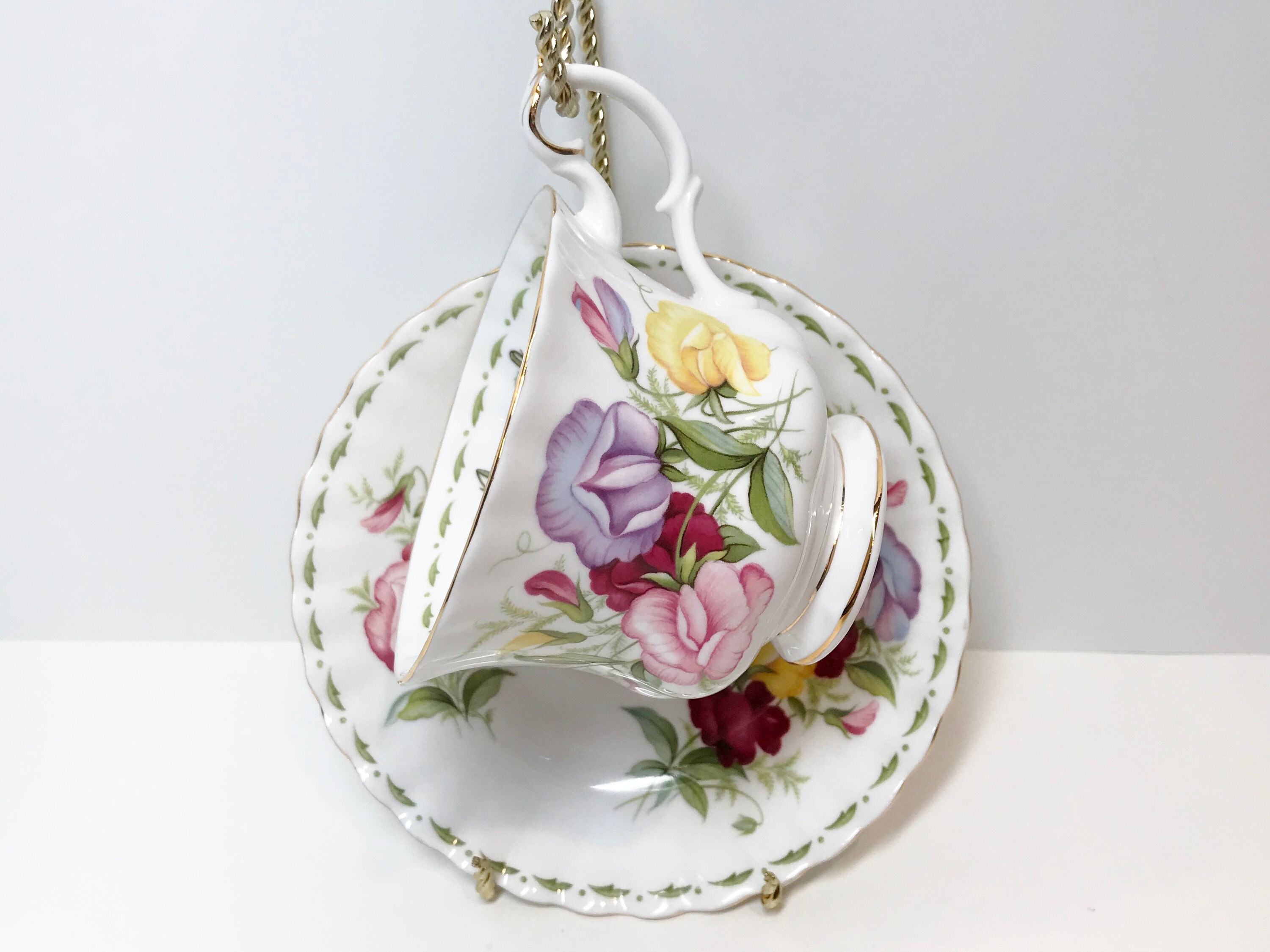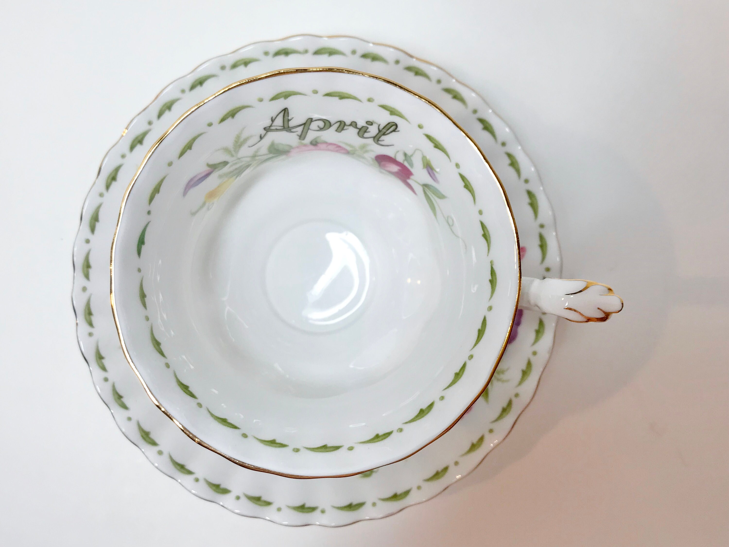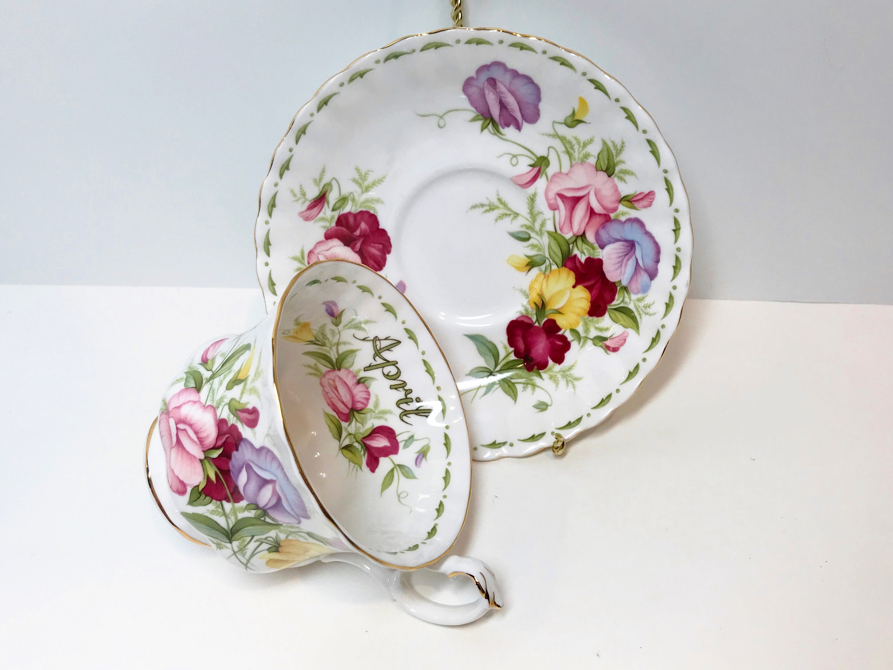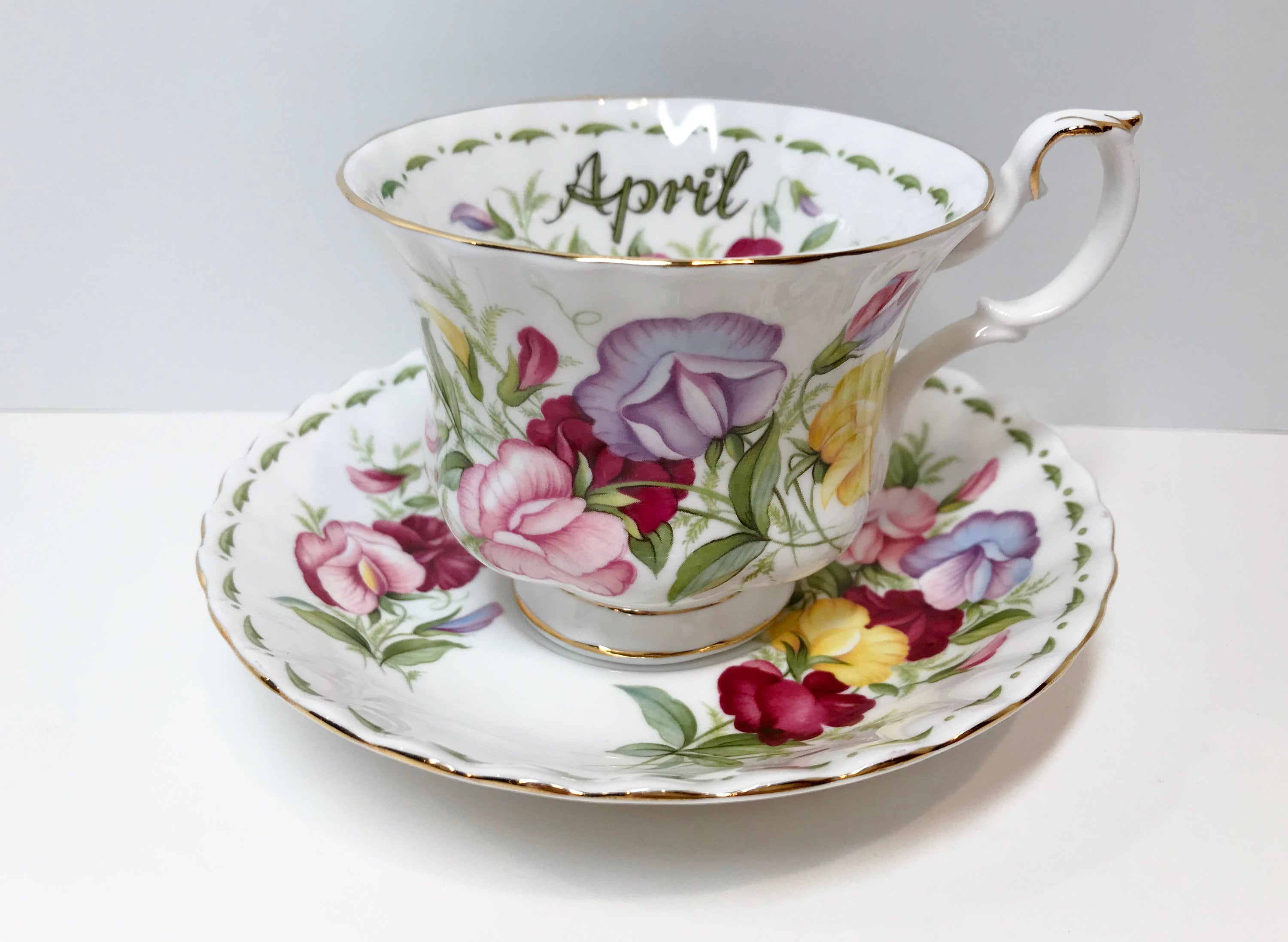 Colorful sweet peas cascade over the glossy white china on this birthday tea cup for the month of April. They are, of course, the birth flower for the spring birthday.