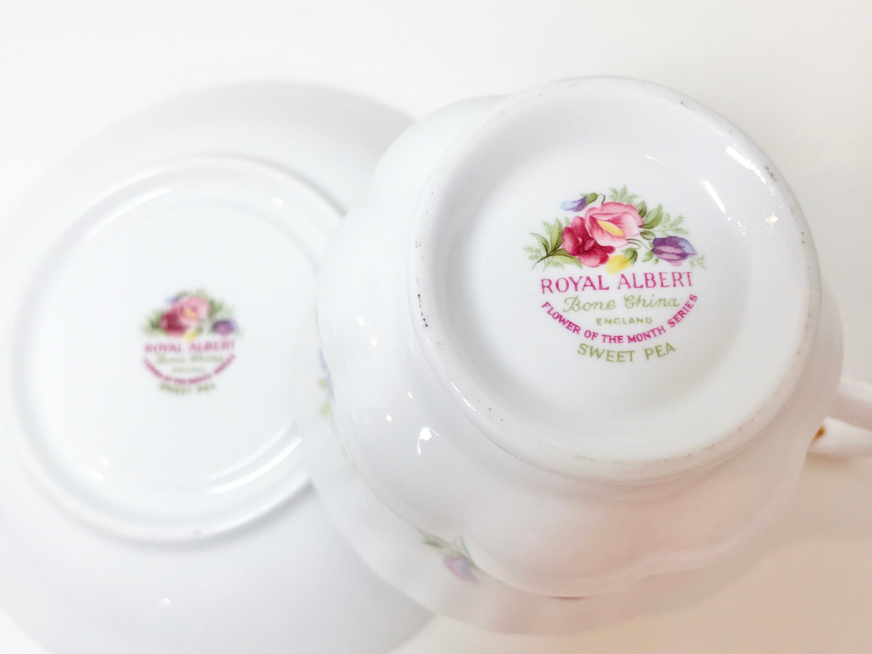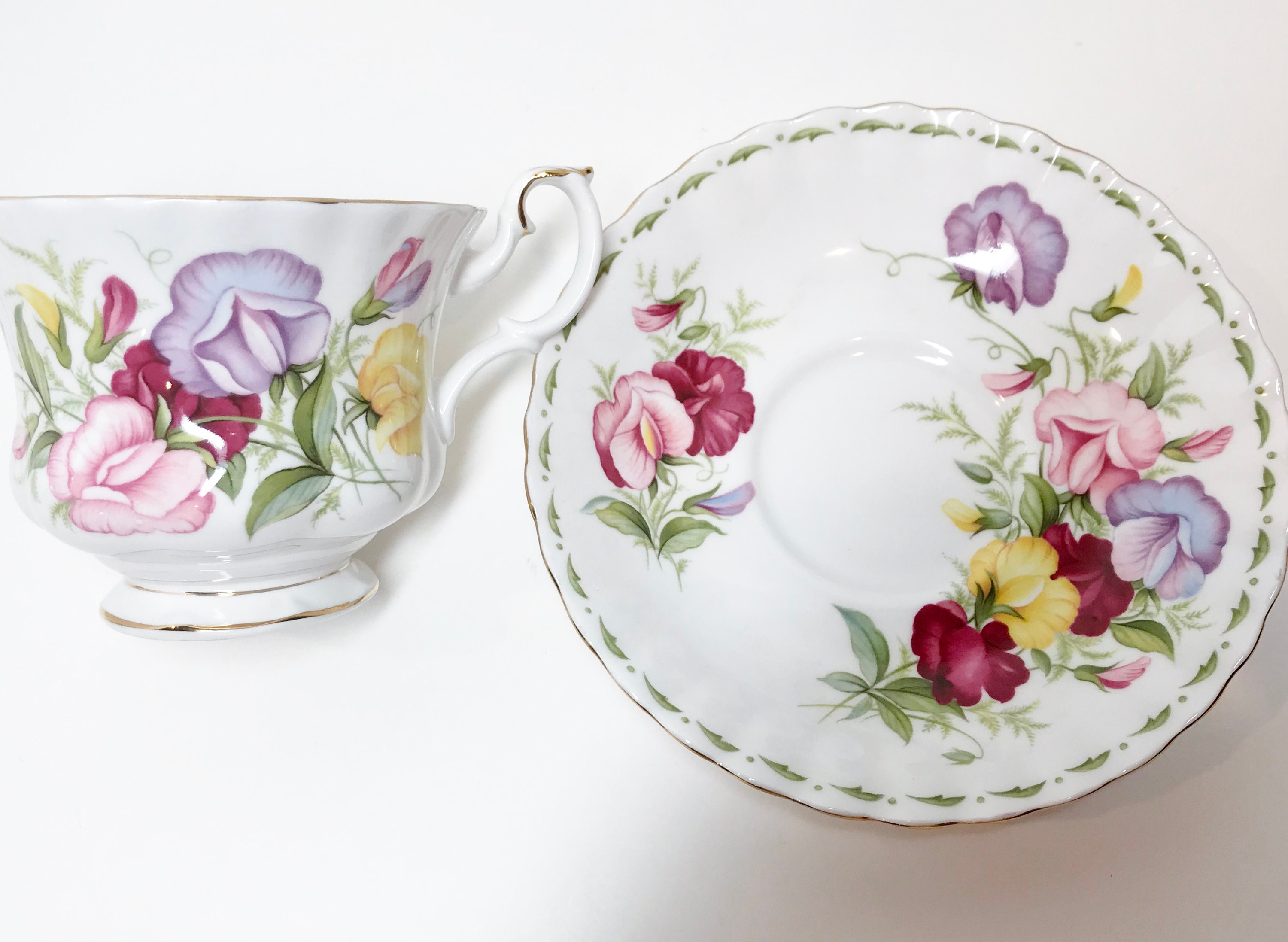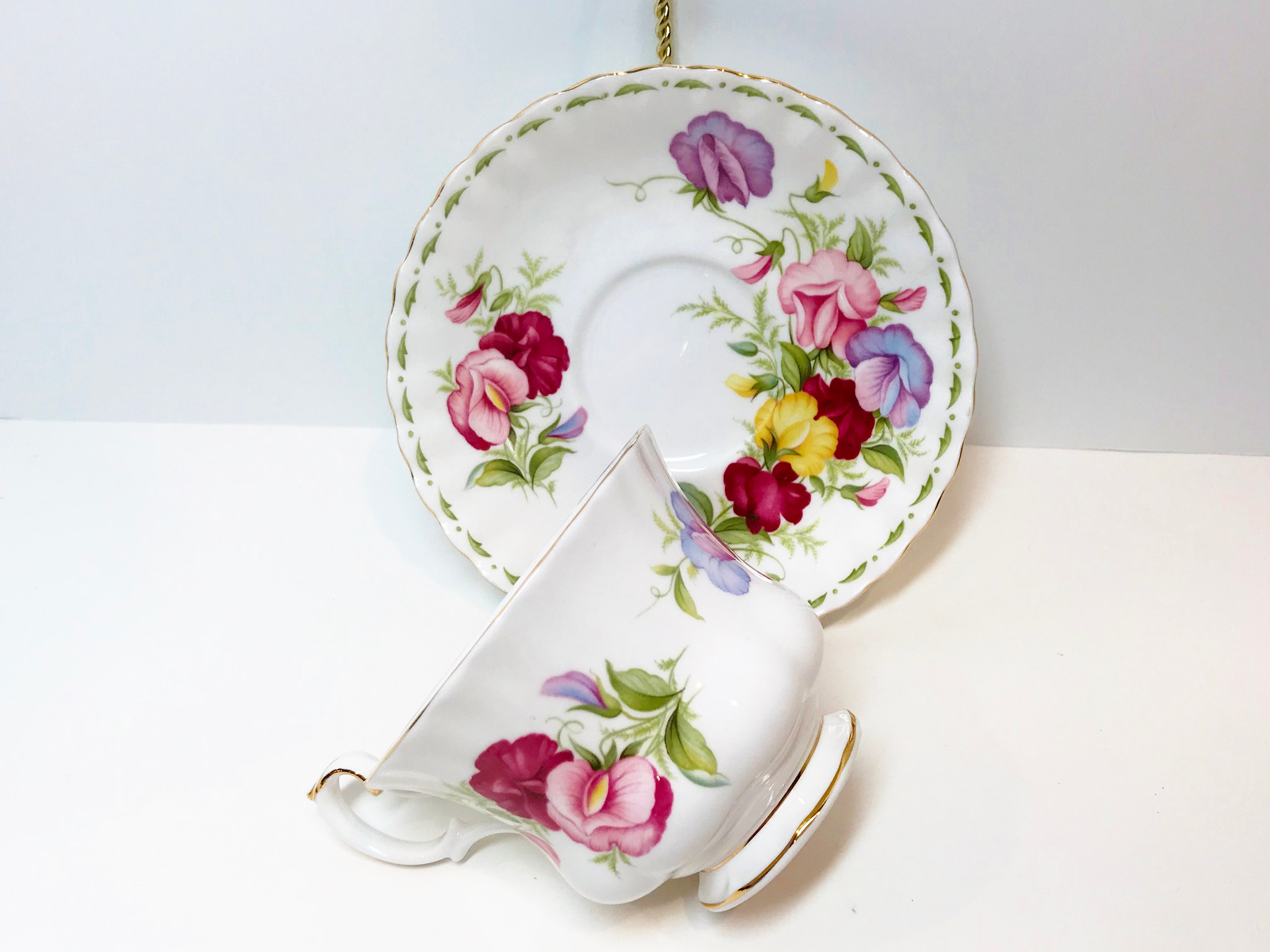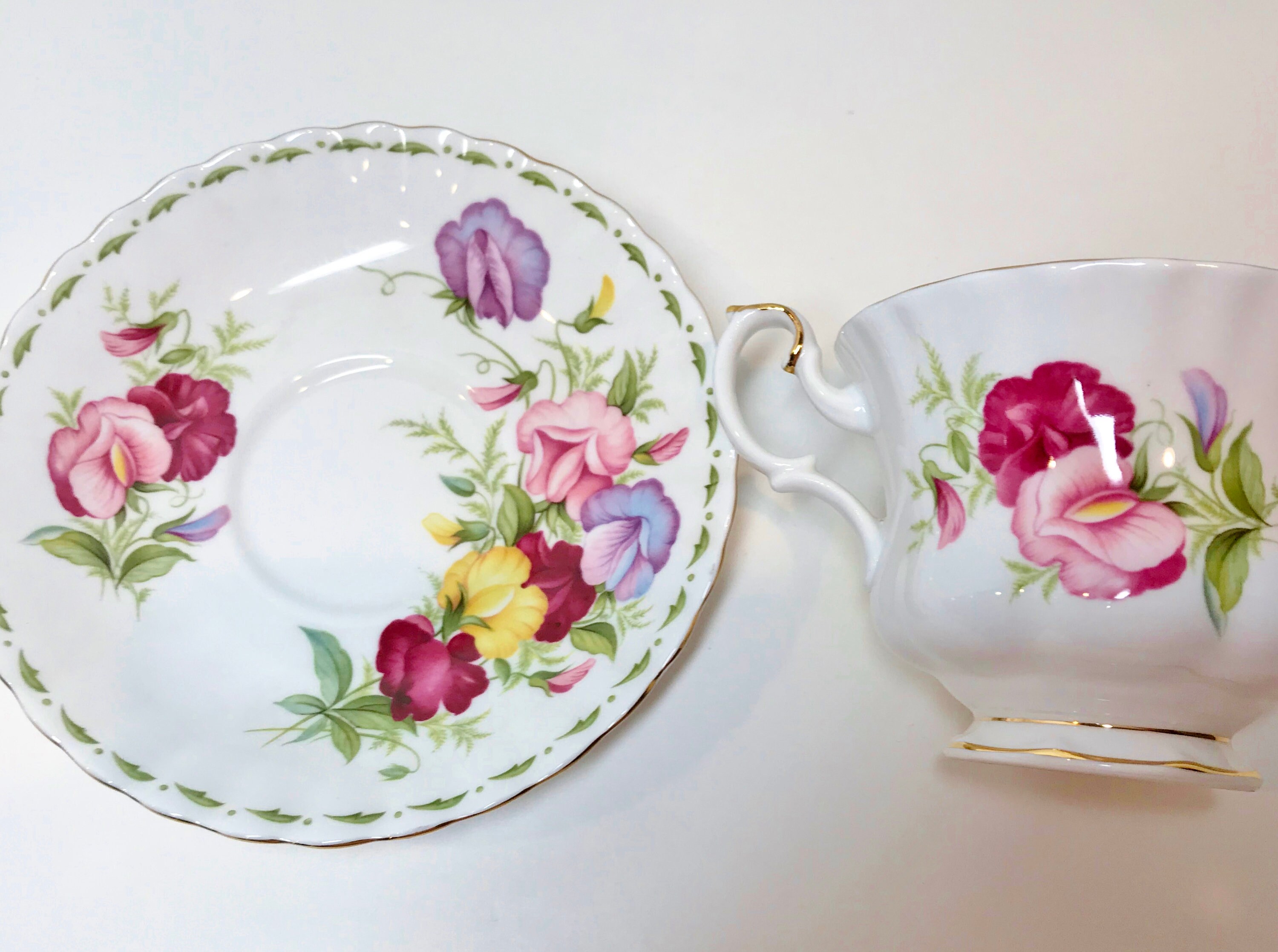 Colorful sweet peas cascade over the glossy white china on this birthday tea cup for the month of April. They are, of course, the birth flower for the spring birthday.