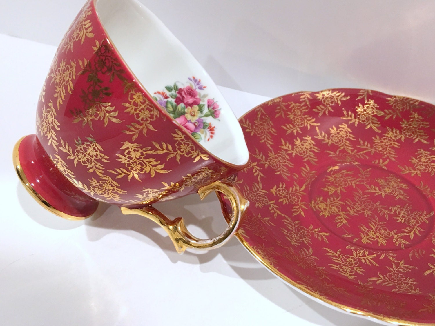 Royal Stuart Bone China of England created this stunning all over rich jewel toned teacup and saucer.
