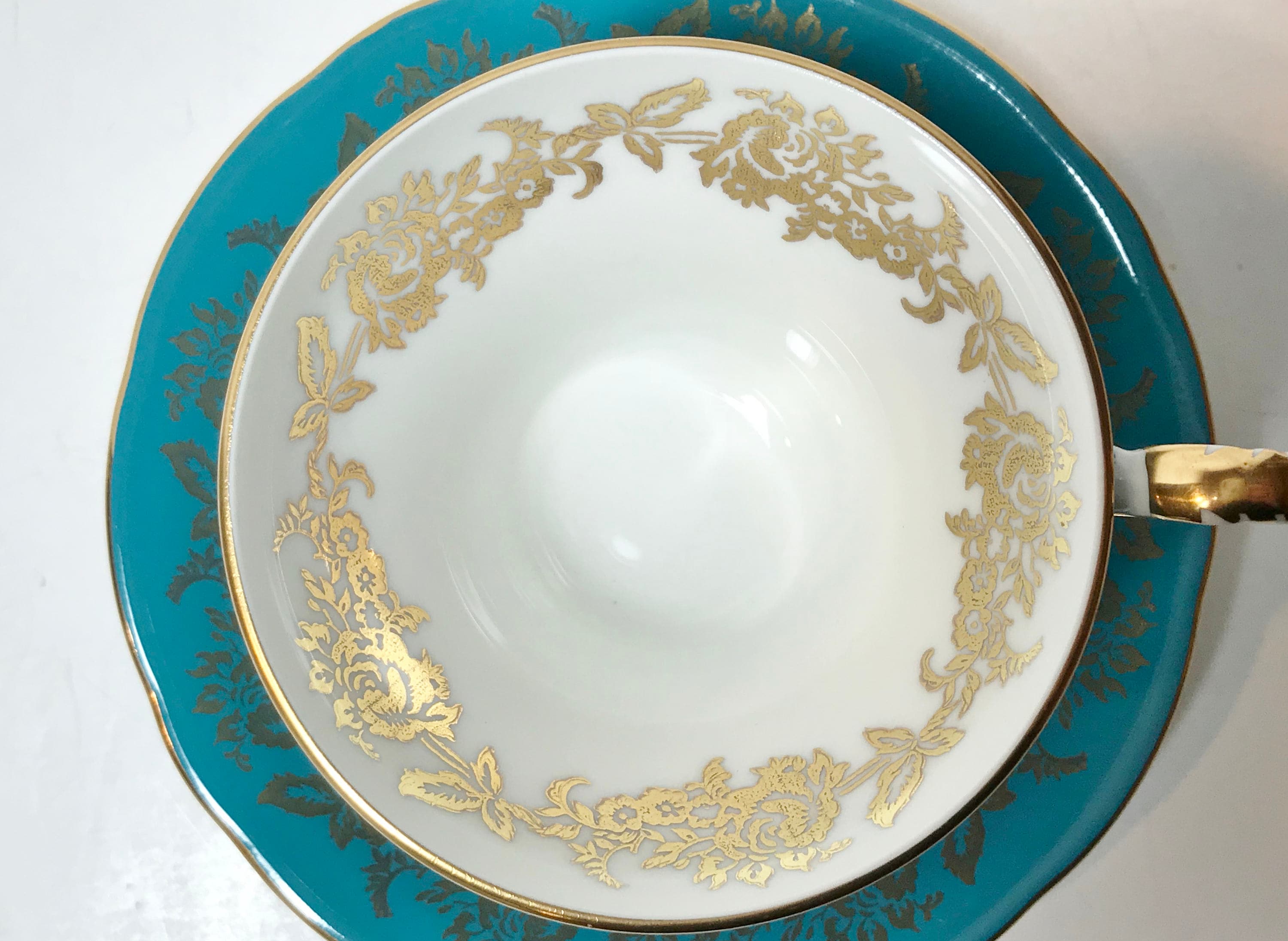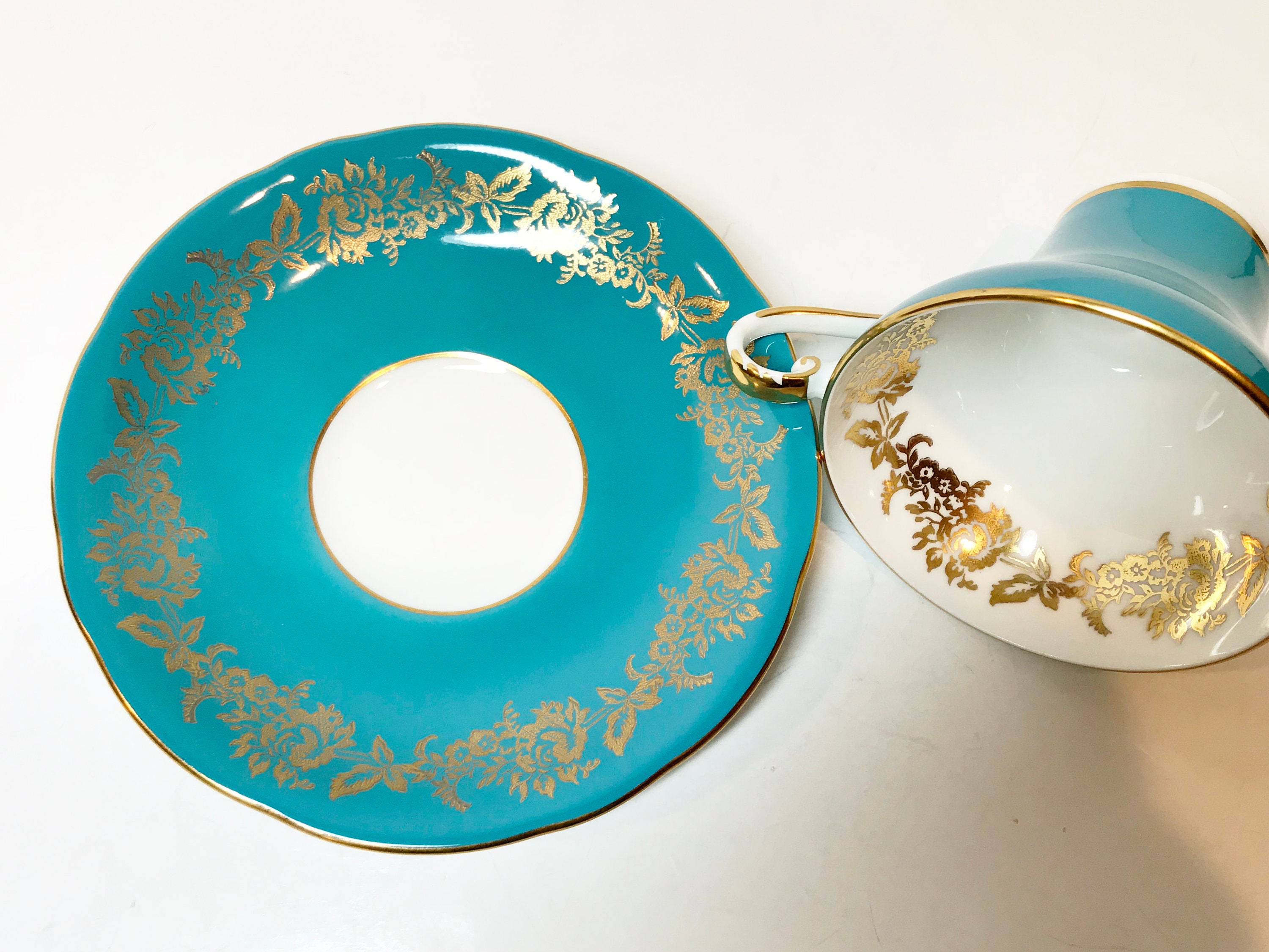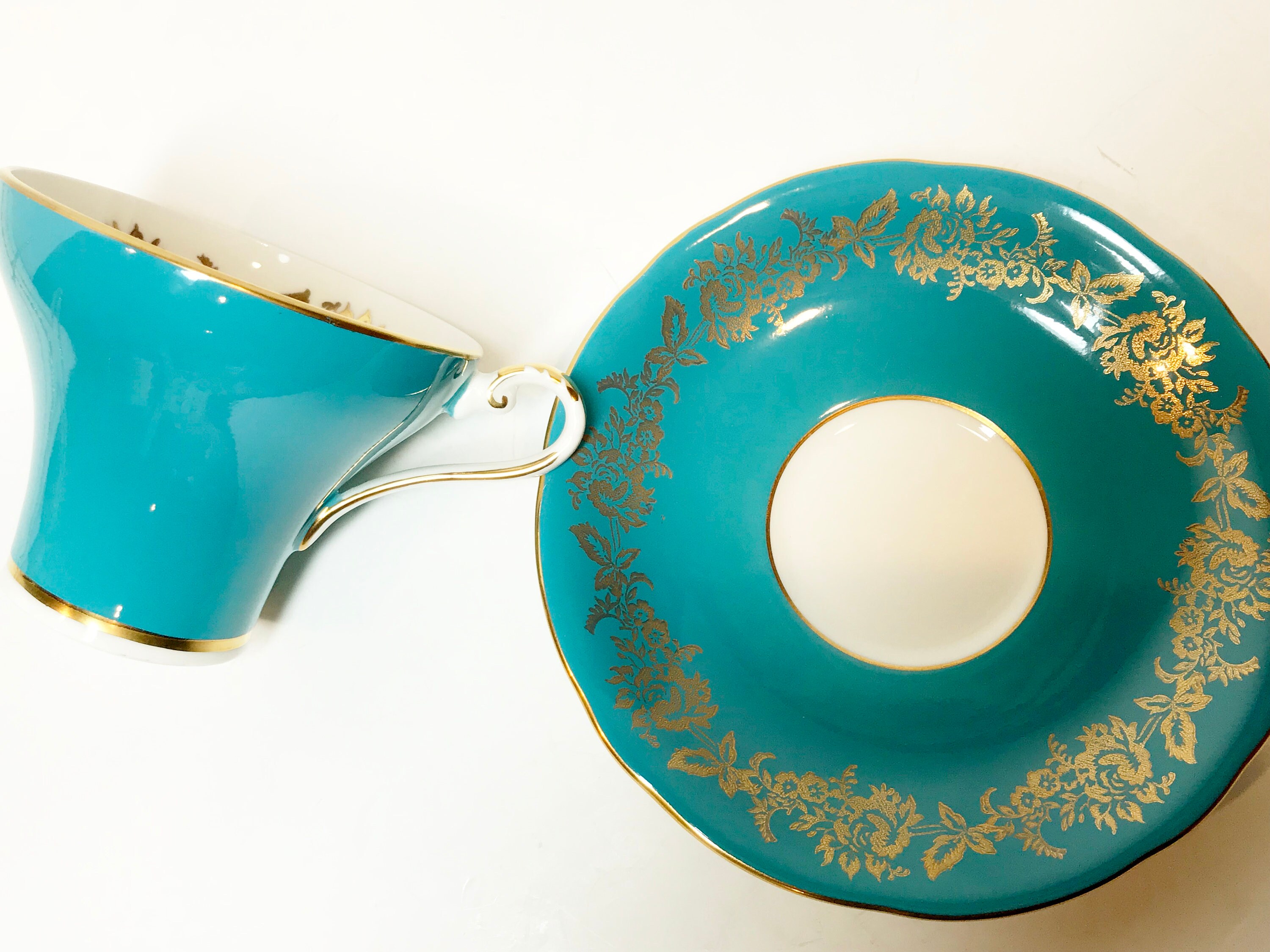 Garlands of gold decorate the creamy white interior and aqua exterior of this English teacup.