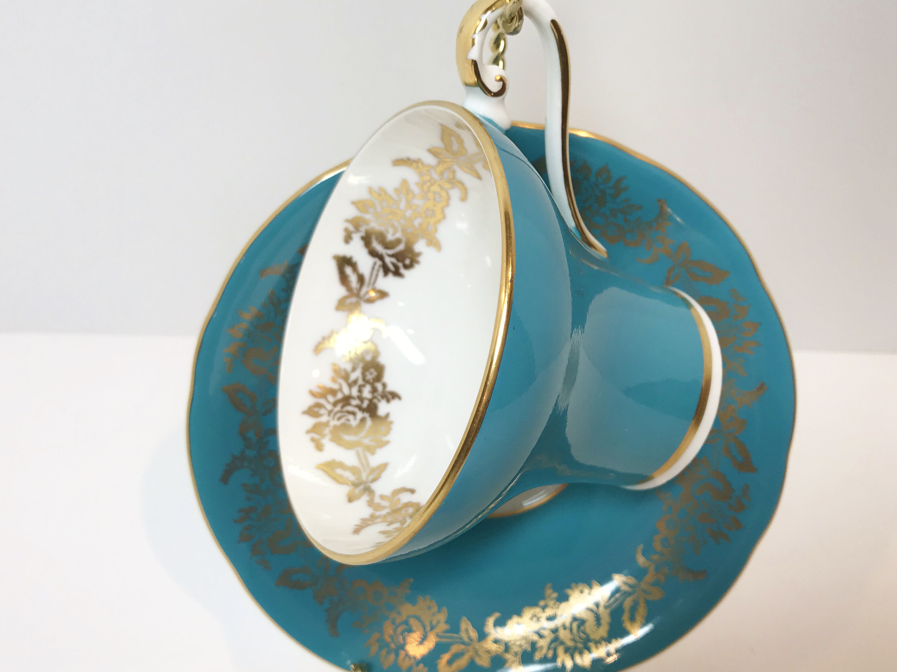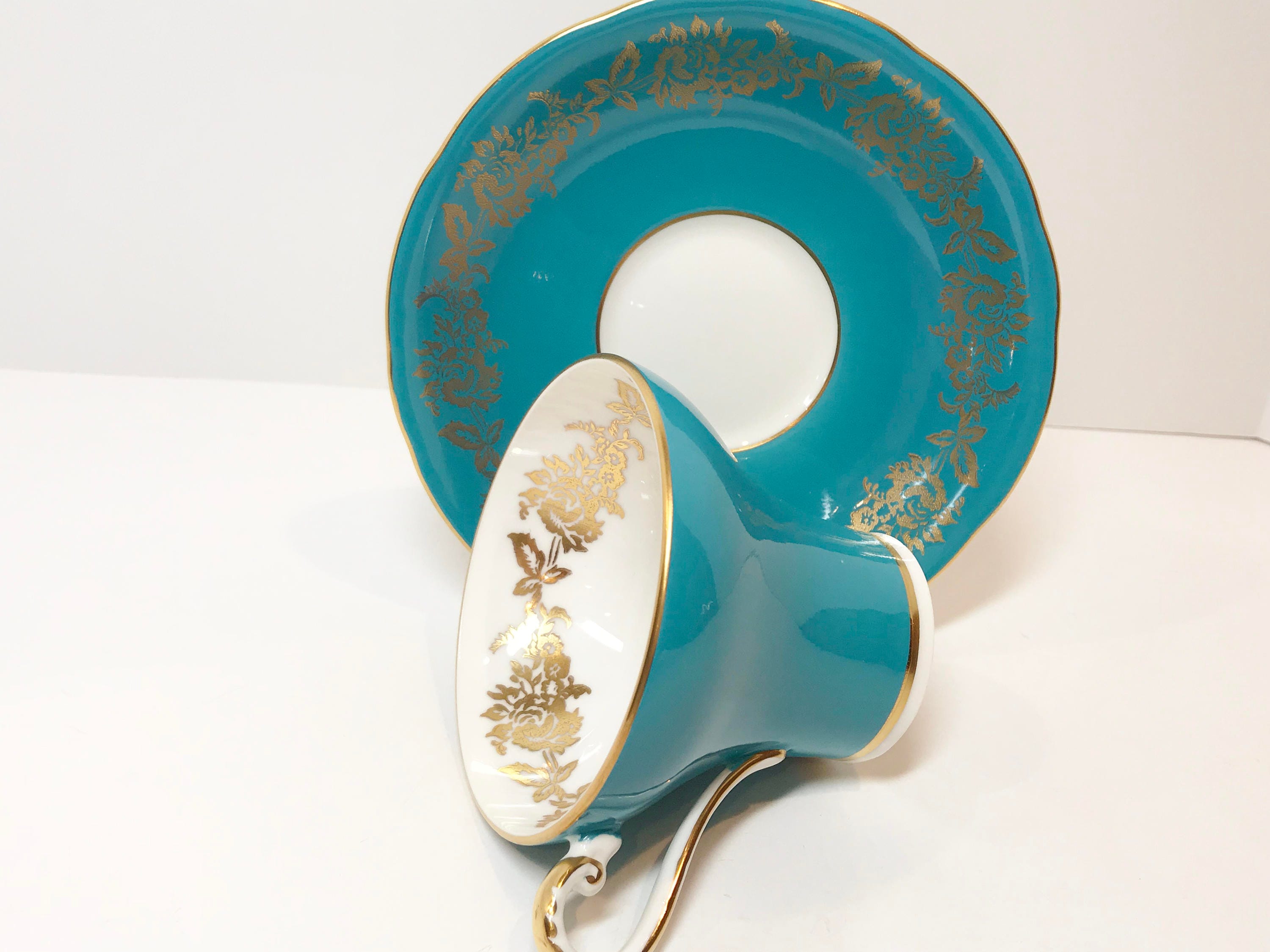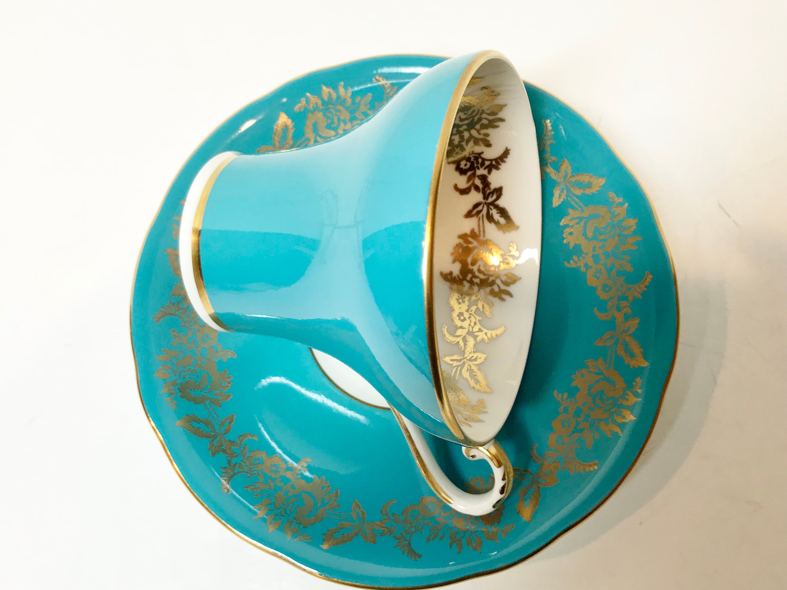 Garlands of gold decorate the creamy white interior and aqua exterior of this English teacup.