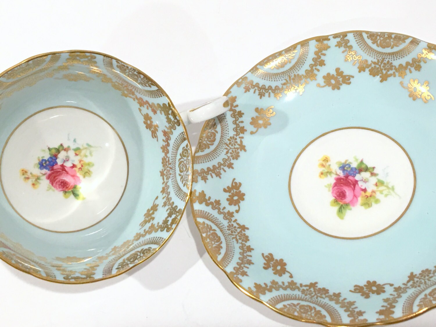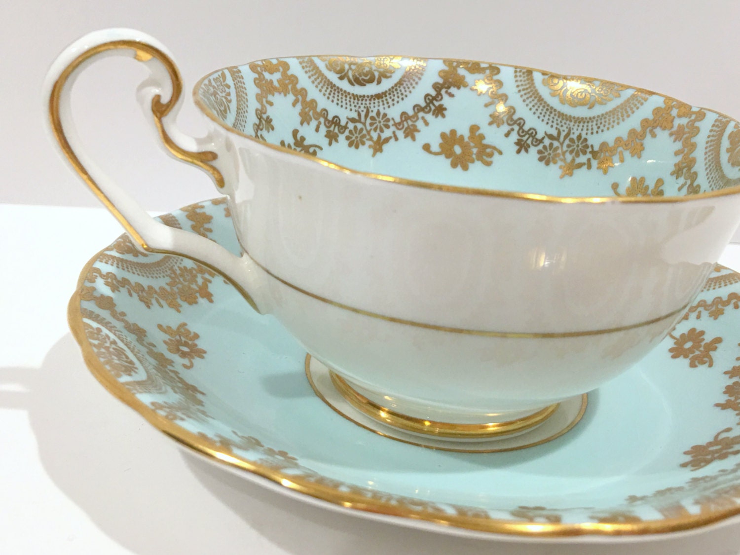 This antique tea cup glistens with golden borders, softly scalloped edges and lovely pale aqua interiors.