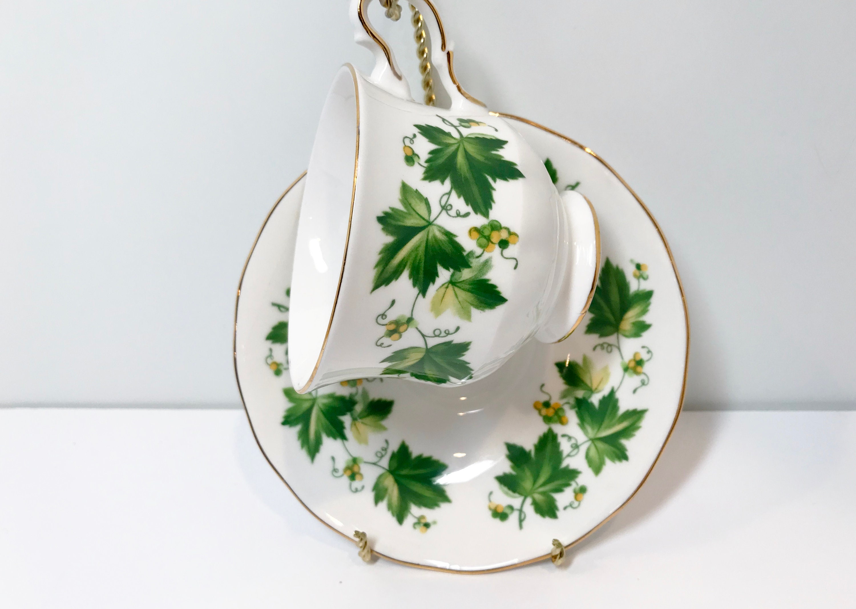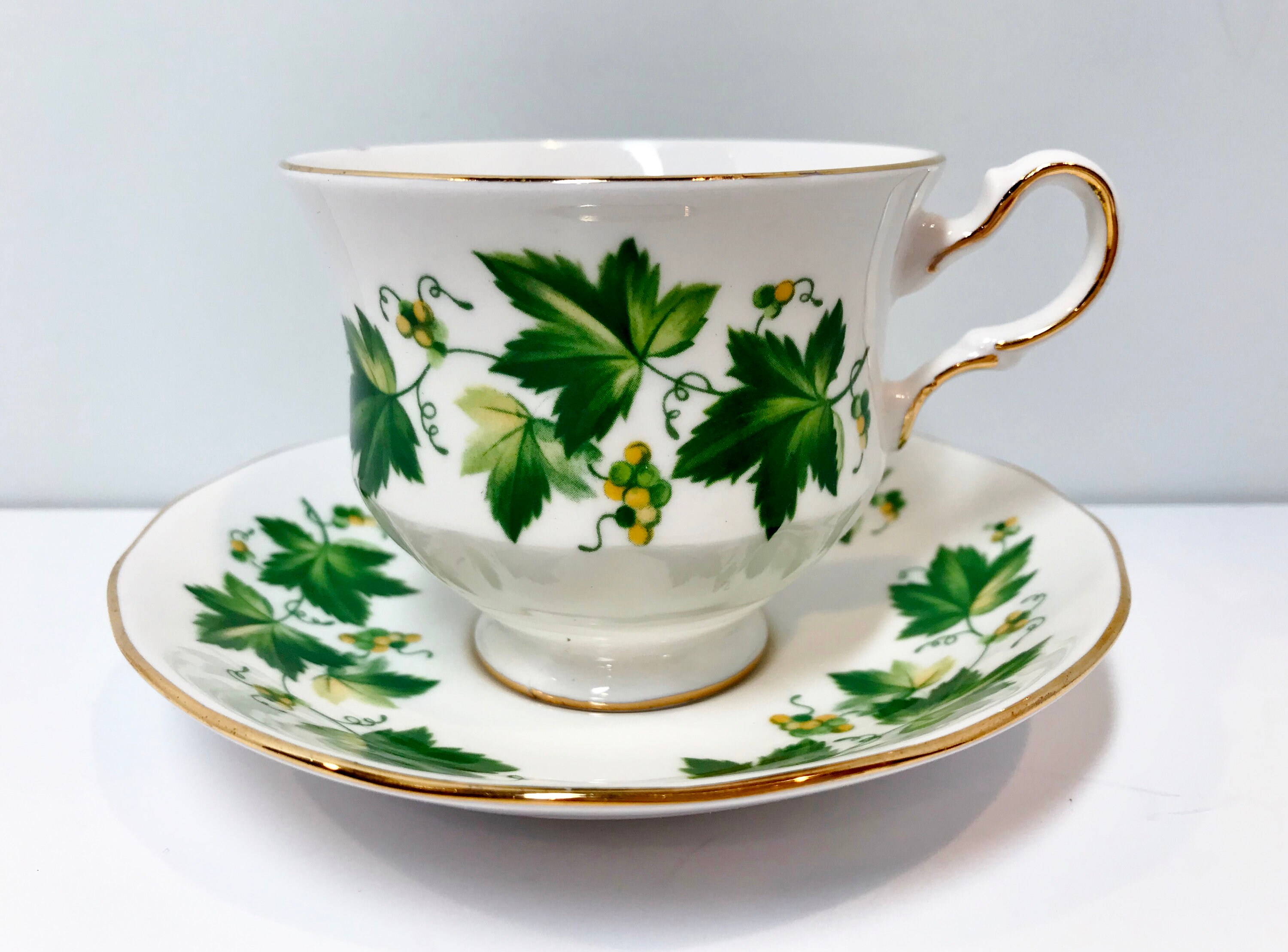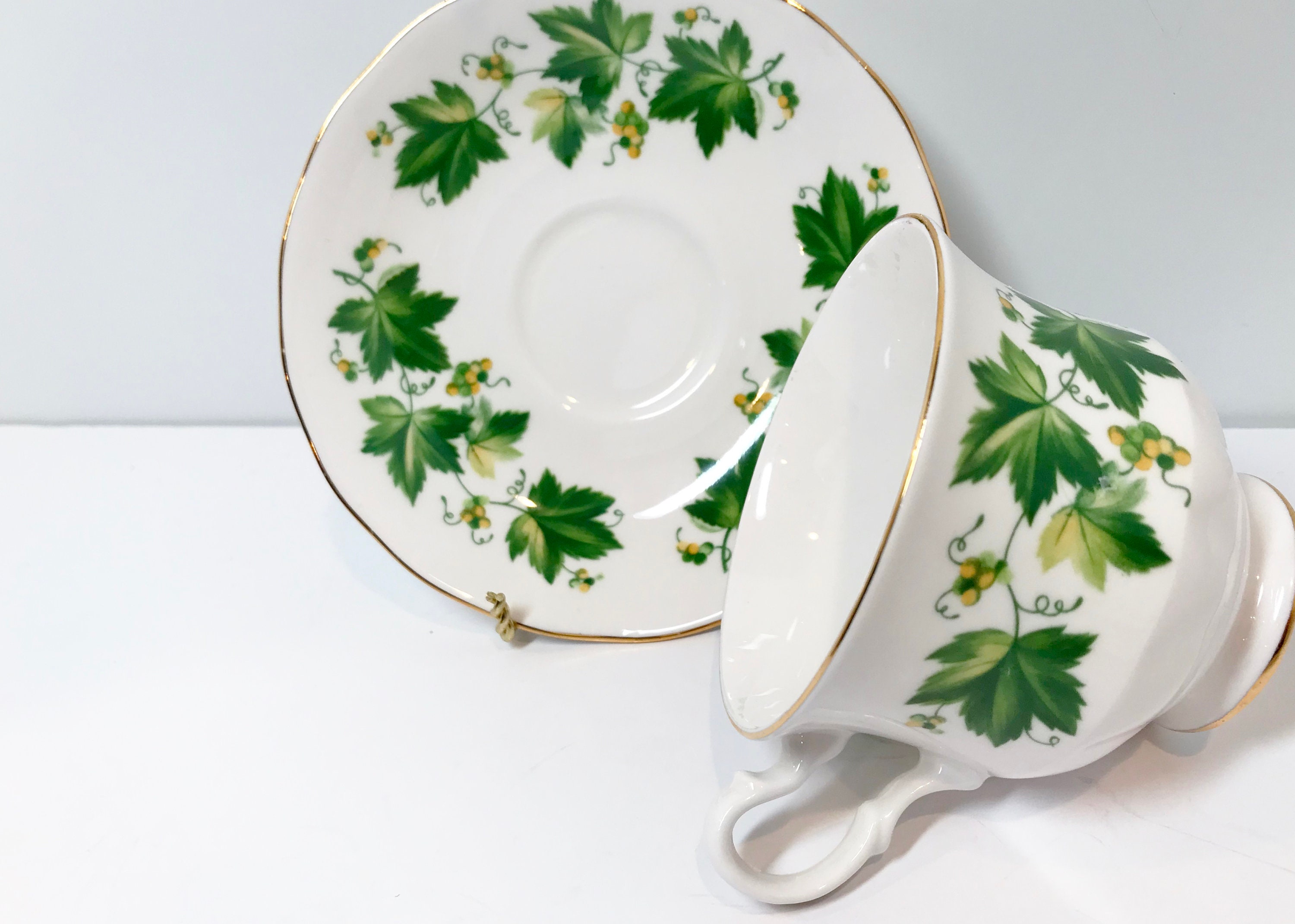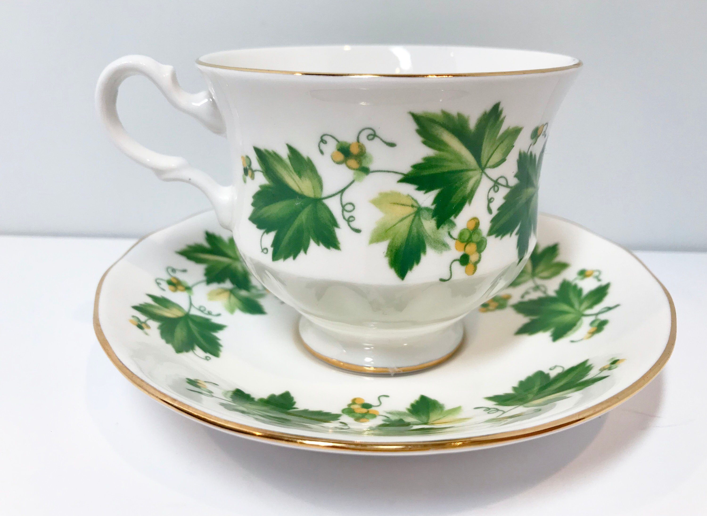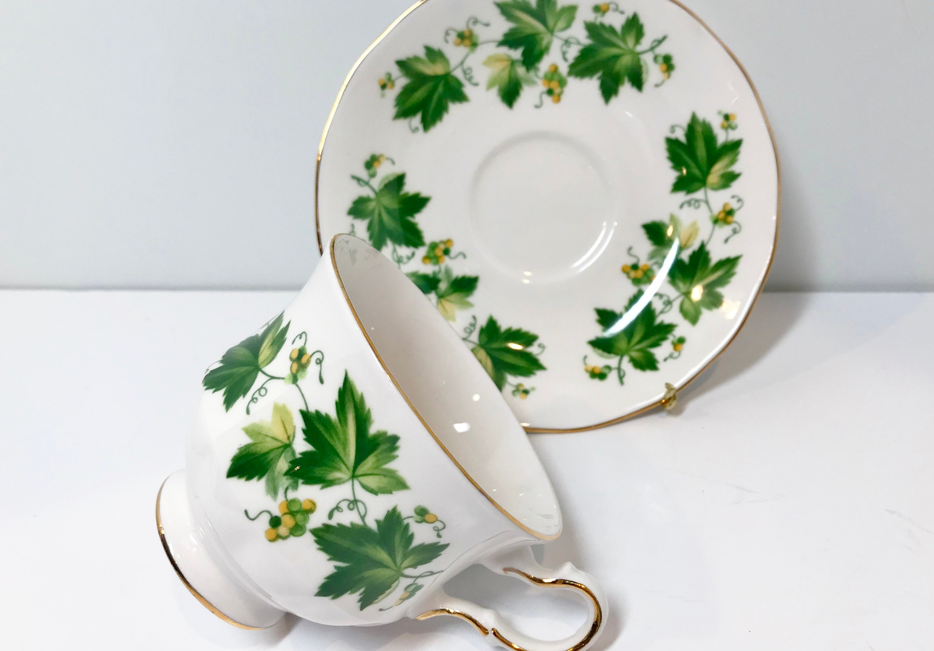 Queen Anne Teacup and Saucer, Green Vine Cup, Antique Teacups Vintage, Antique Tea Cups Vintage, Friendship Cup, English China Cups