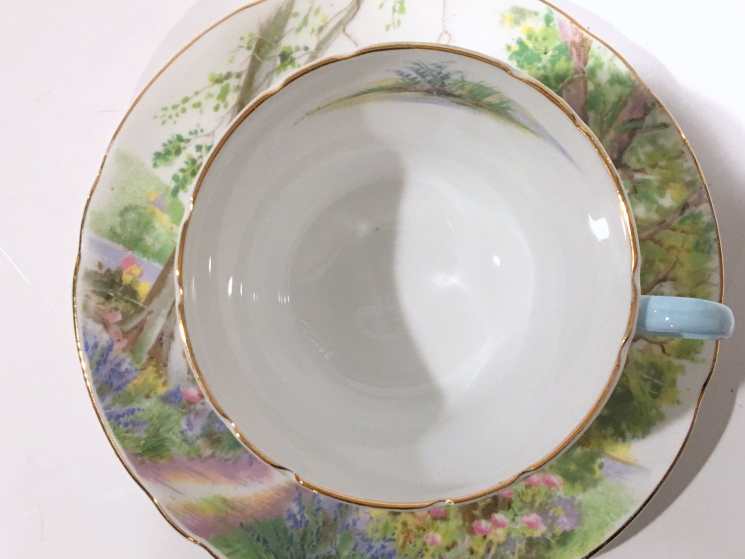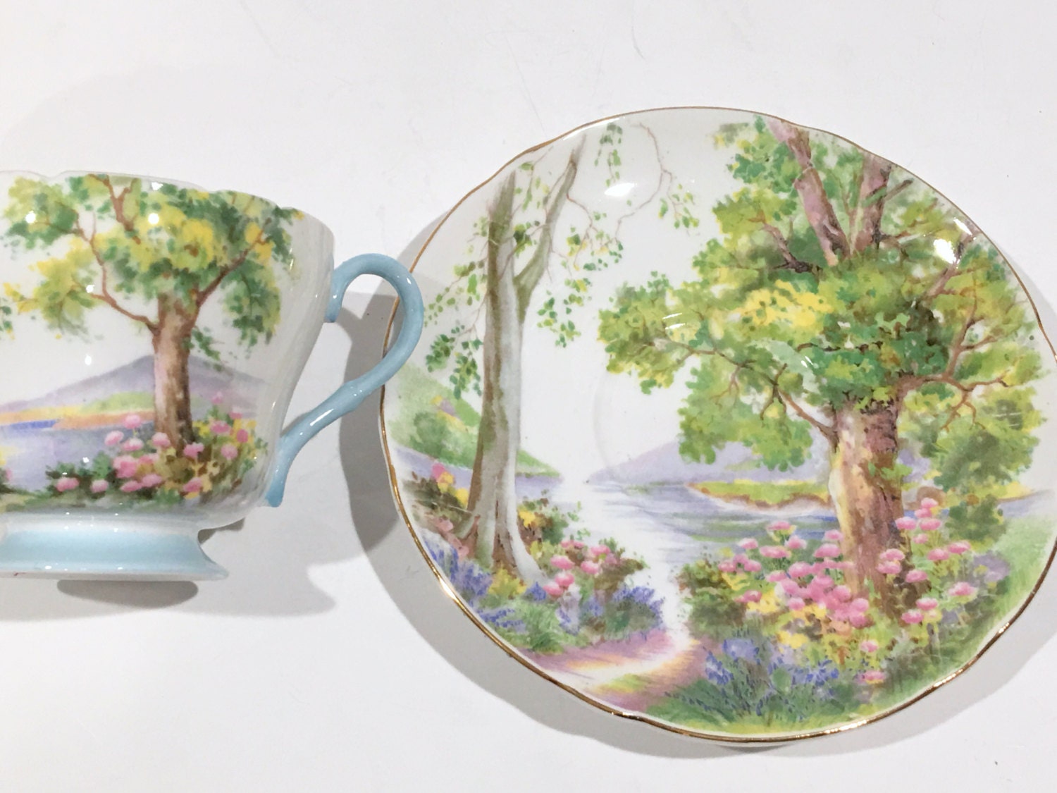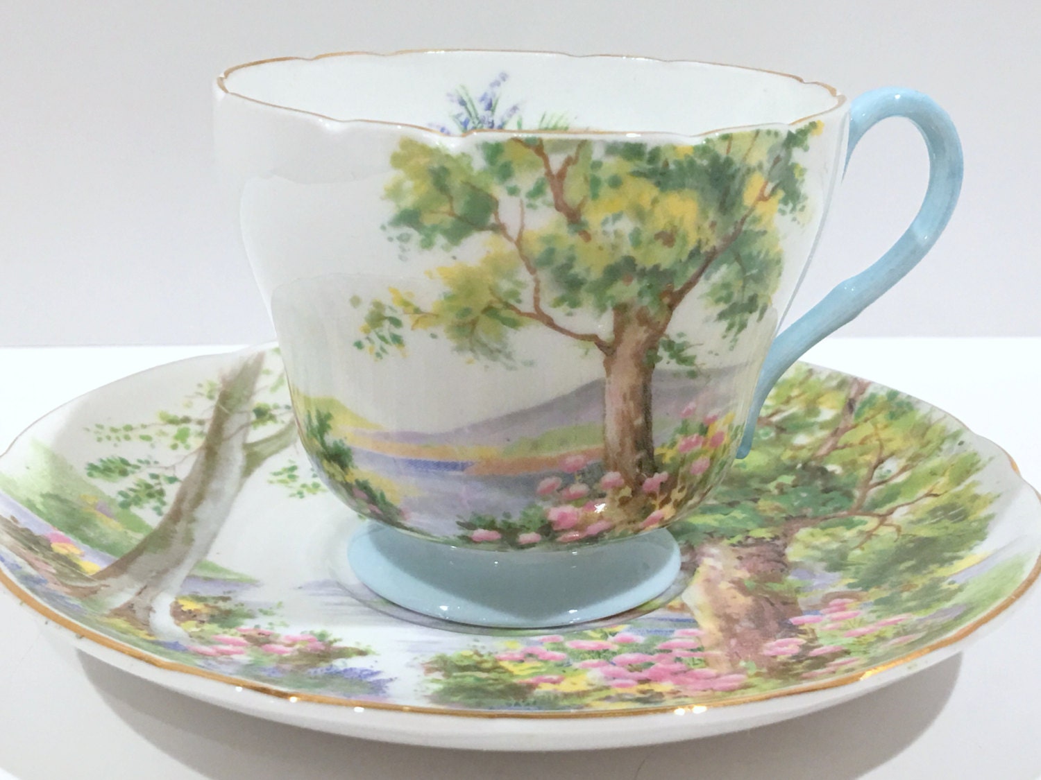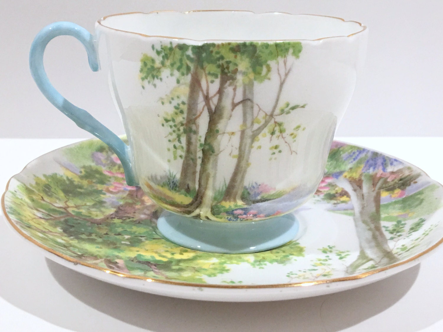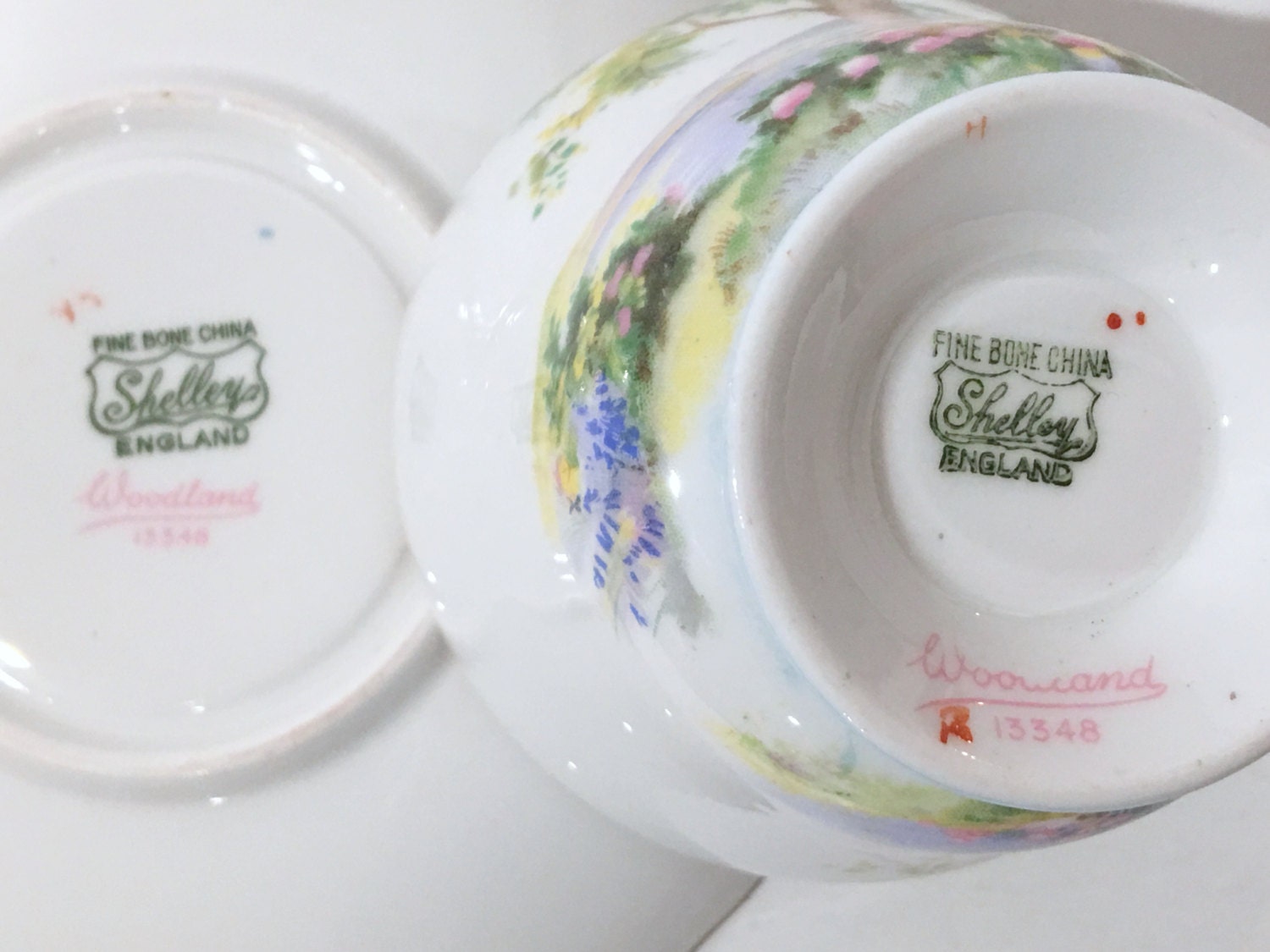 Shelley Fine Bone China of England crafted the enchanting teacup and saucer in the pattern Woodland, number 13348. It is in the Richmond style.