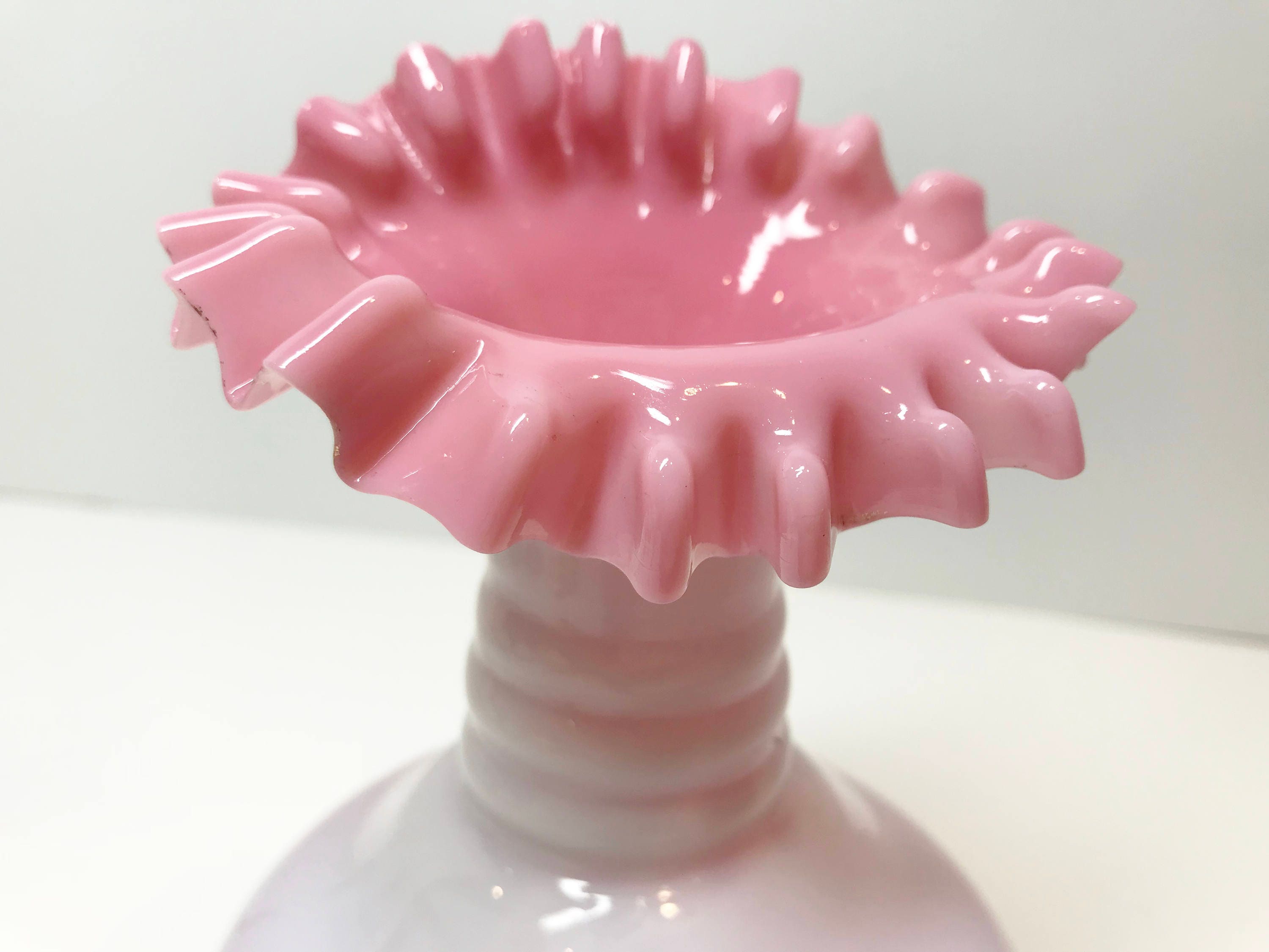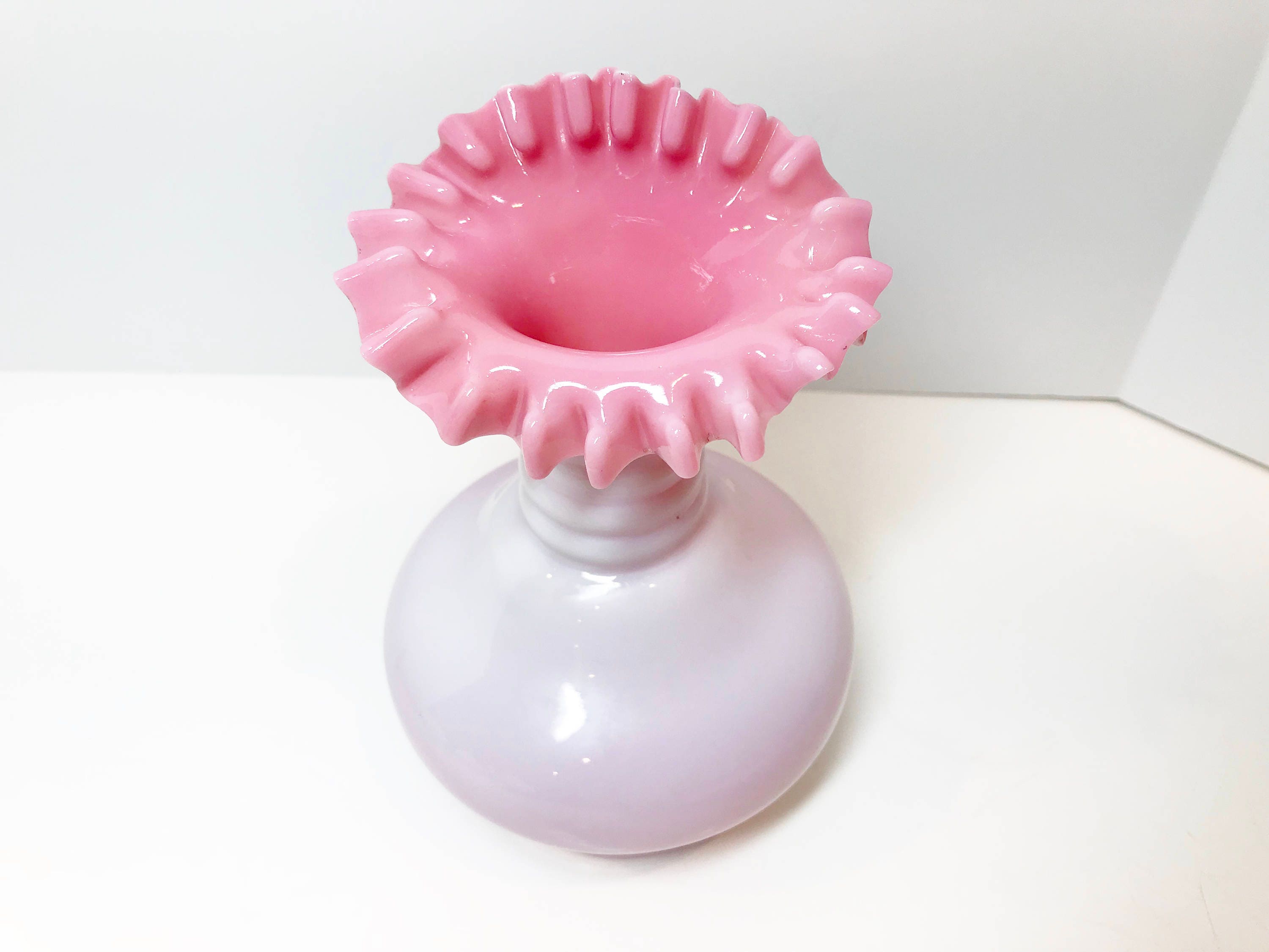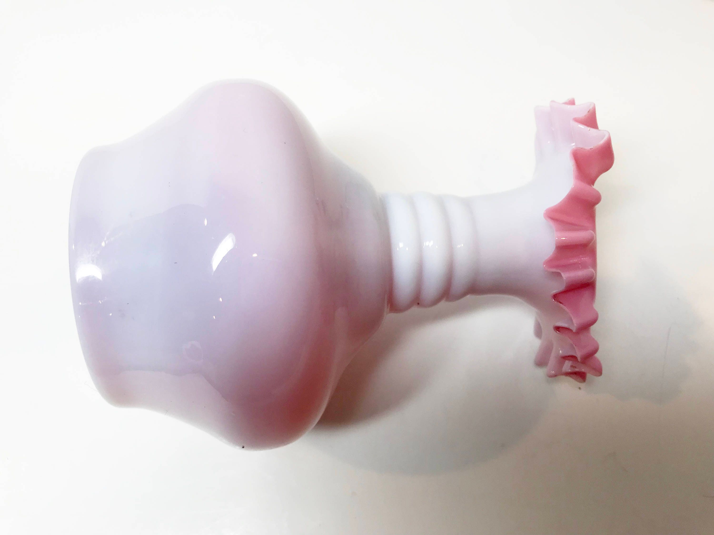 This gorgeous pink and white case glass vase is in the Jack in the Pulpit design. The pink glass is encased with the white milk glass. The ruffled effect on the bulbous base has made it a sought after piece. This is hand blown. One can see where the pontil was detached on the bottom.