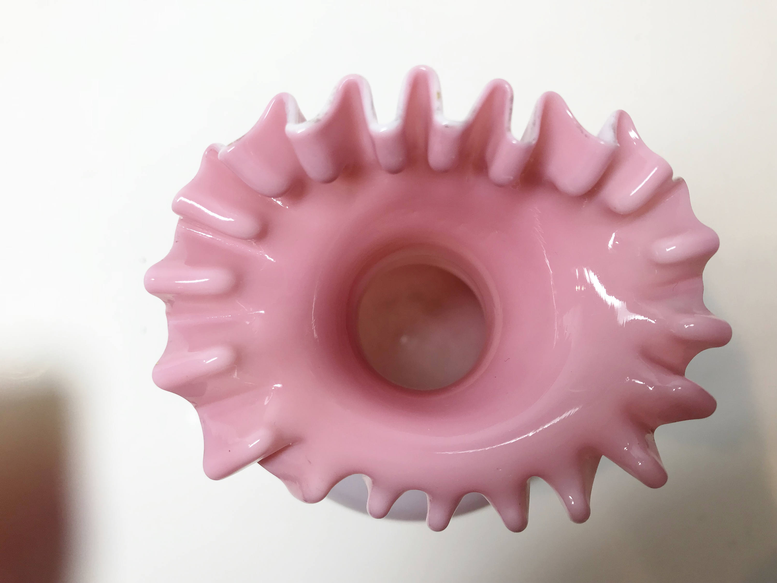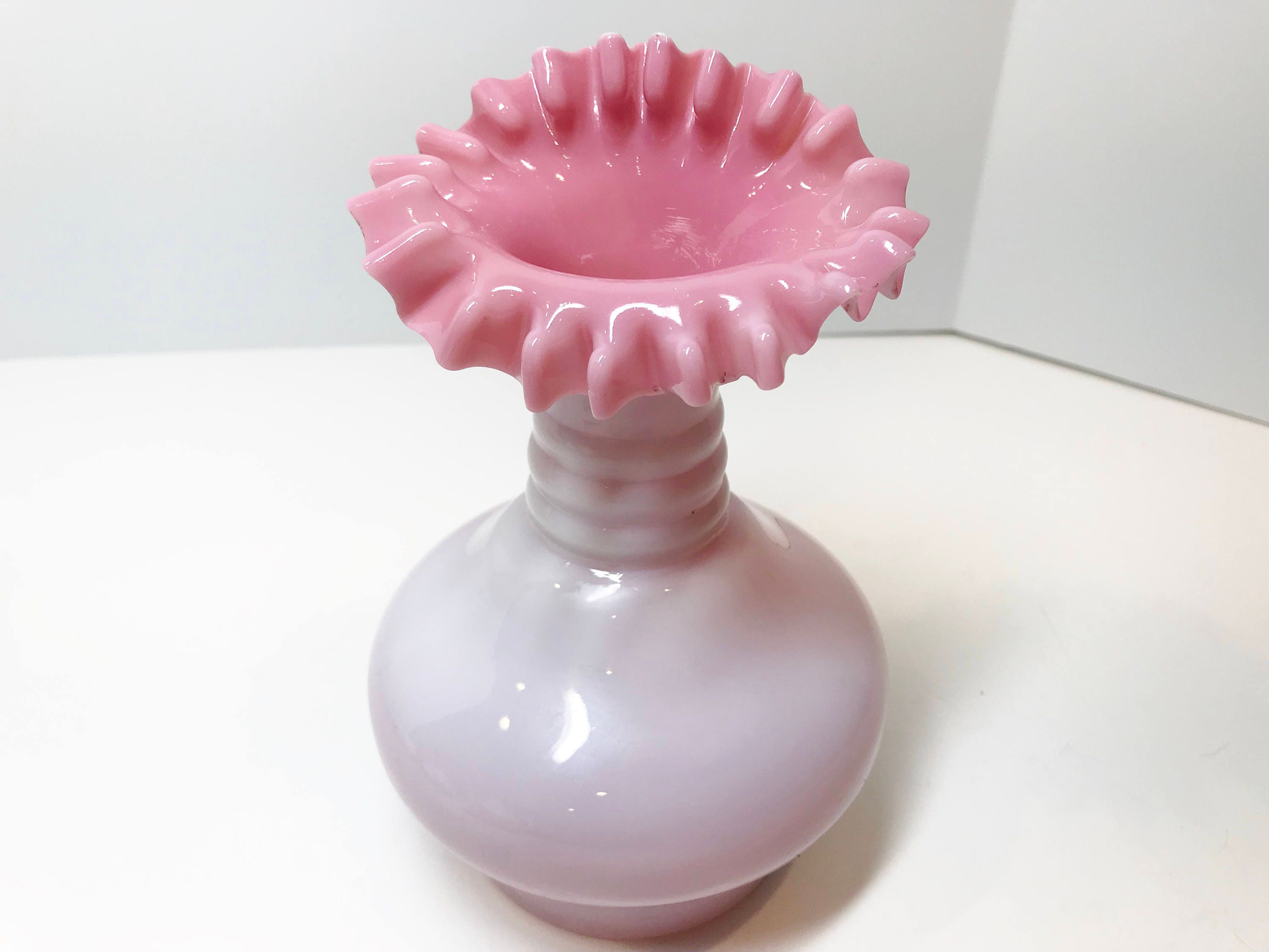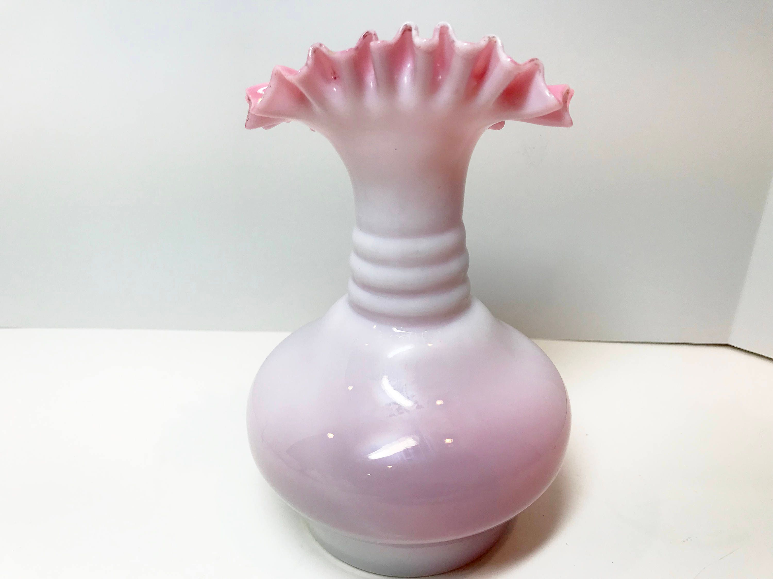 This gorgeous pink and white case glass vase is in the Jack in the Pulpit design. The pink glass is encased with the white milk glass. The ruffled effect on the bulbous base has made it a sought after piece. This is hand blown. One can see where the pontil was detached on the bottom.