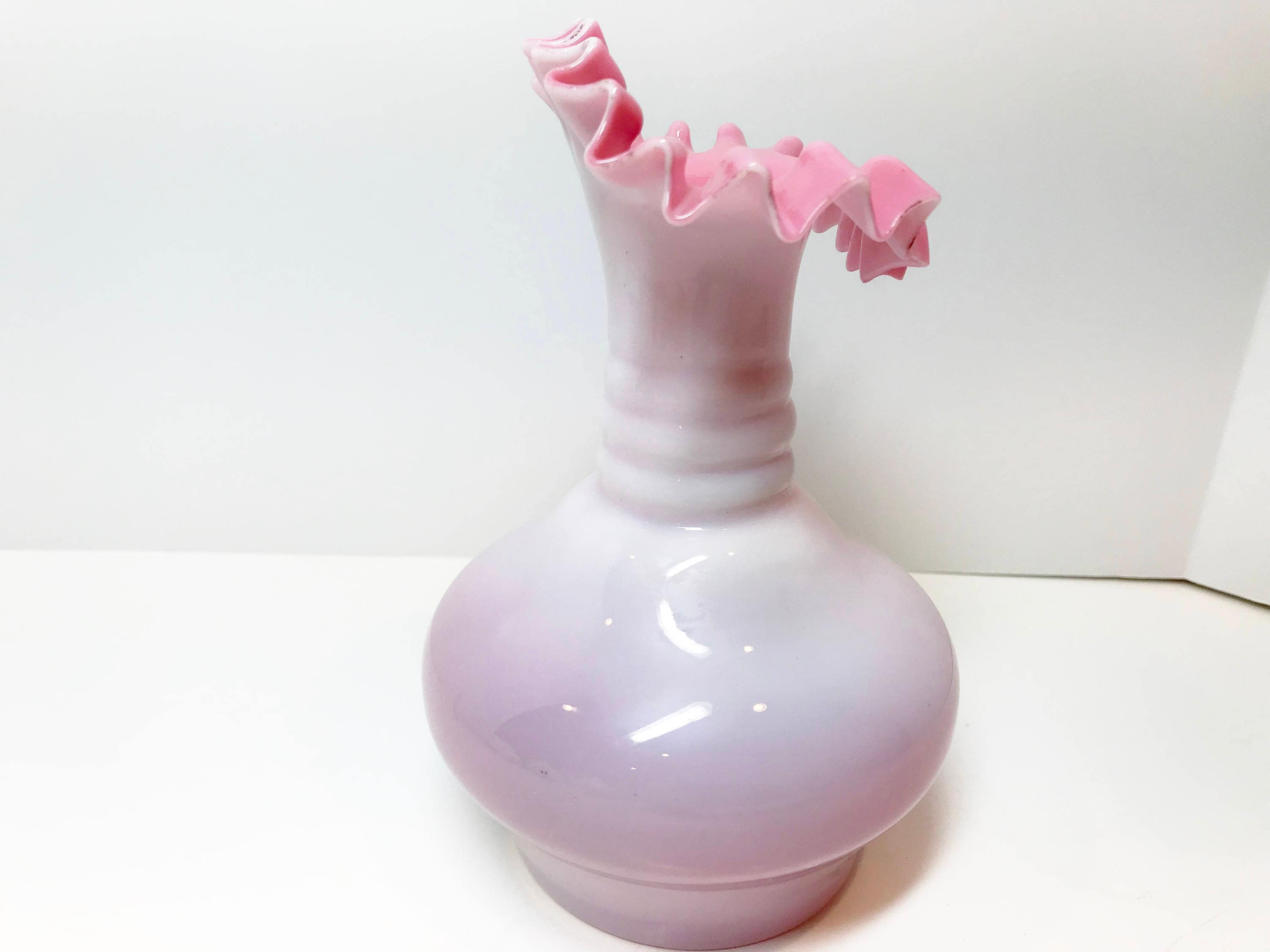 This hand made, ruffled, pulpit design is a showpiece. It appears much more white in person. It is lined in pink. The photos picked up the pink inside. It is very similar to the Fenton pink and white vases.