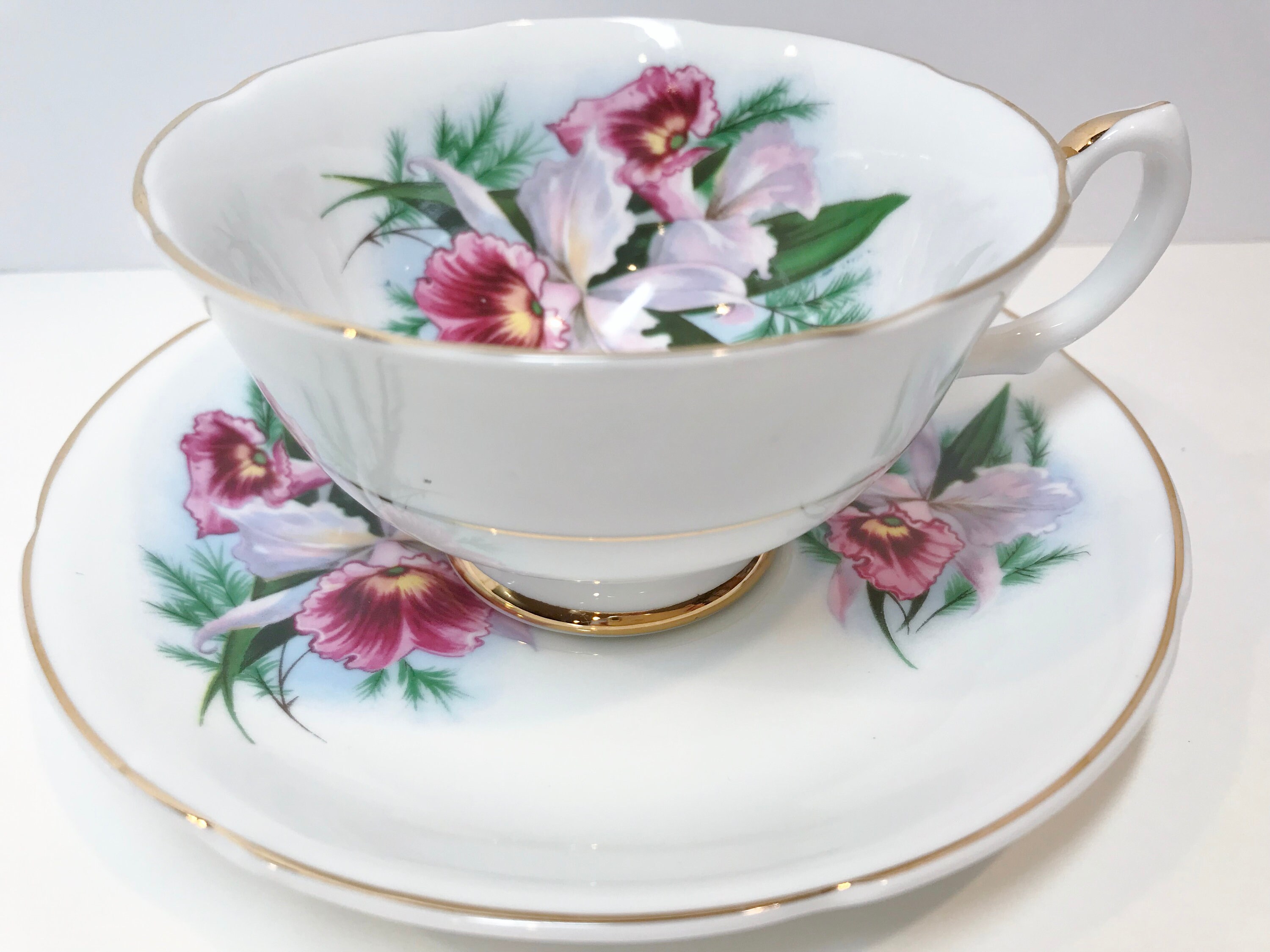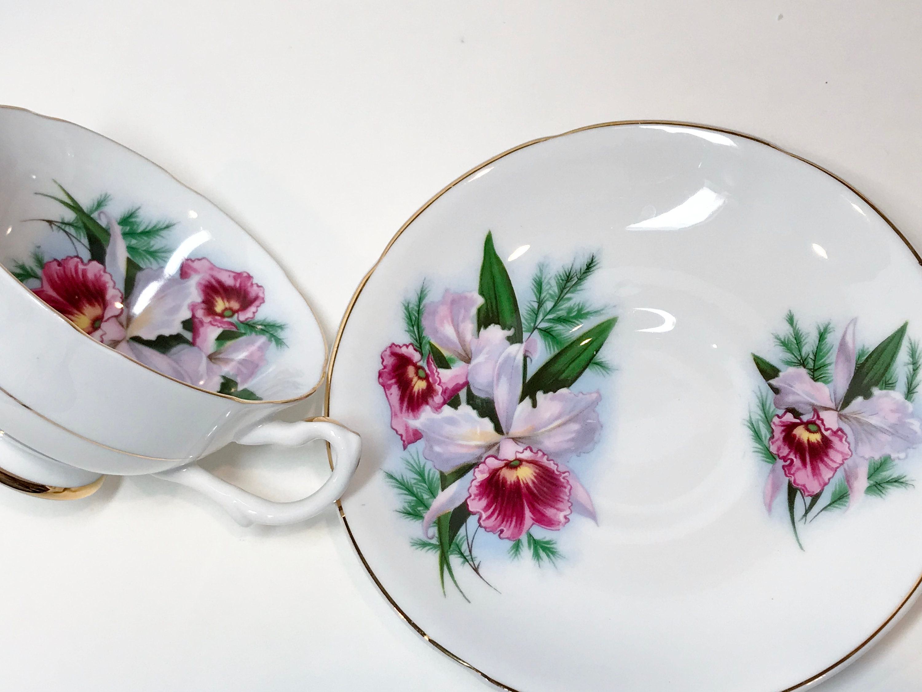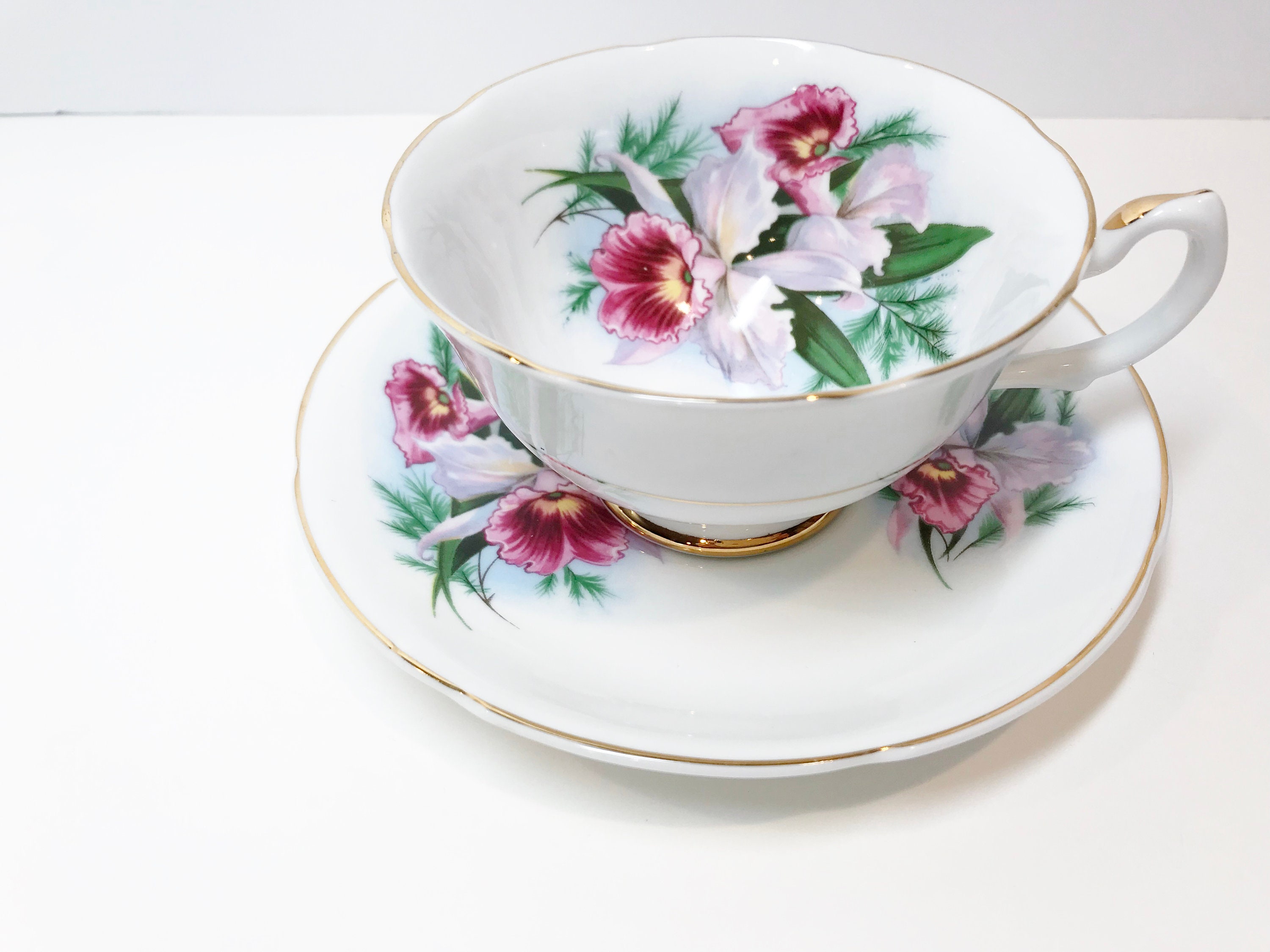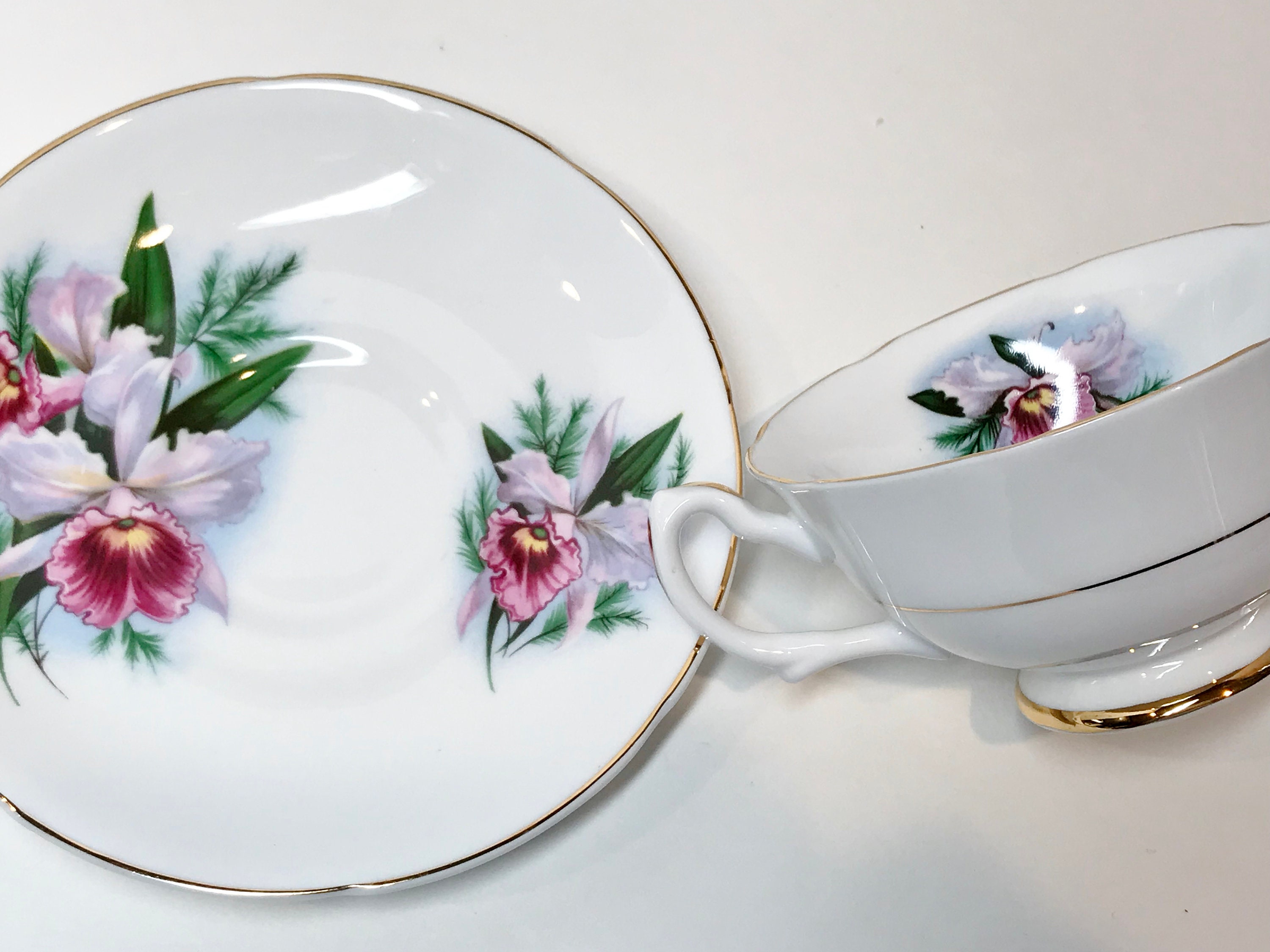Royal Grafton Fine Bone China crafted this romantic tea cup and saucer with lovely orchids, softly scalloped edges and an ornate handle. The gold trim accentuates the perfect highlights.
