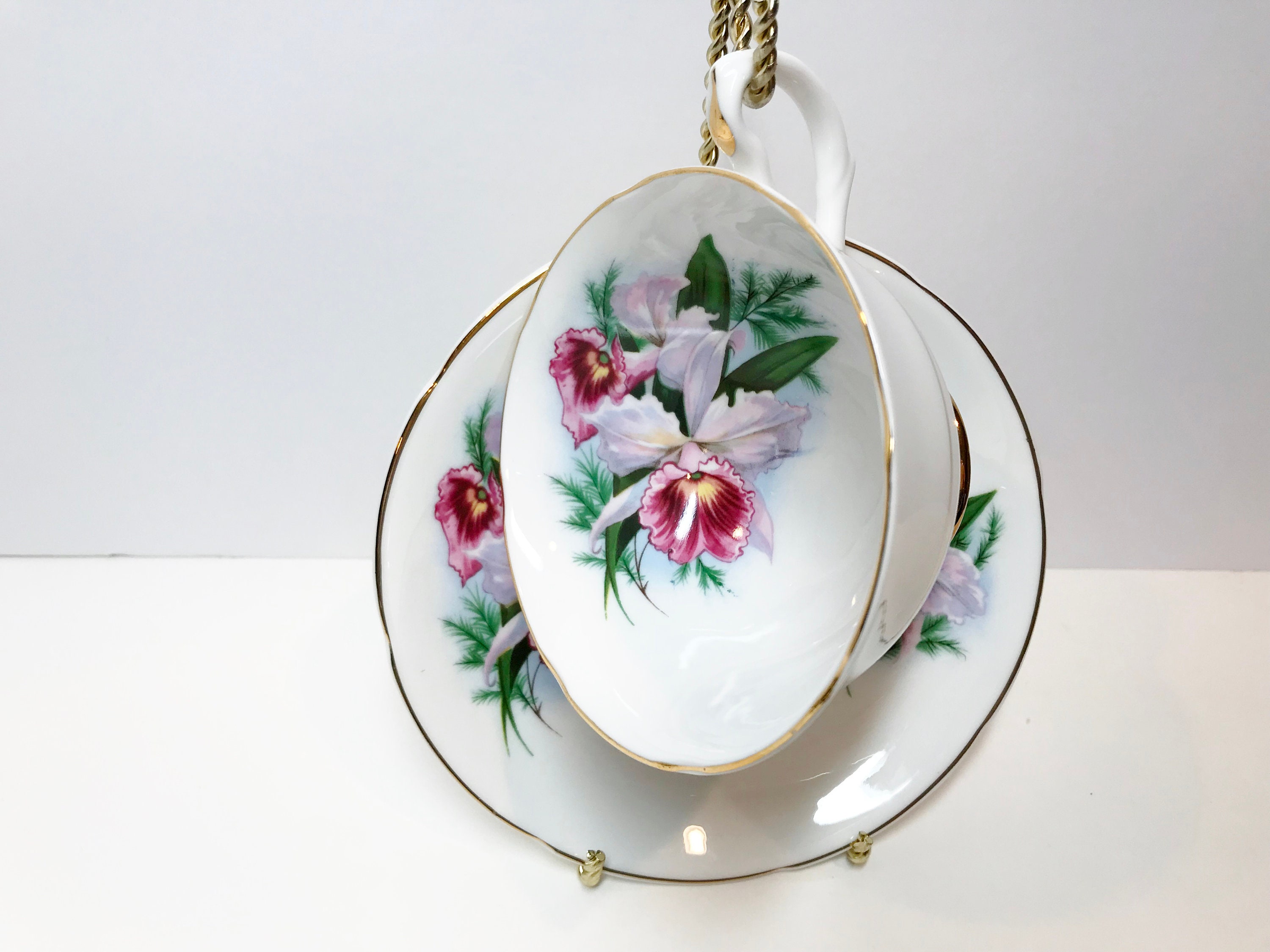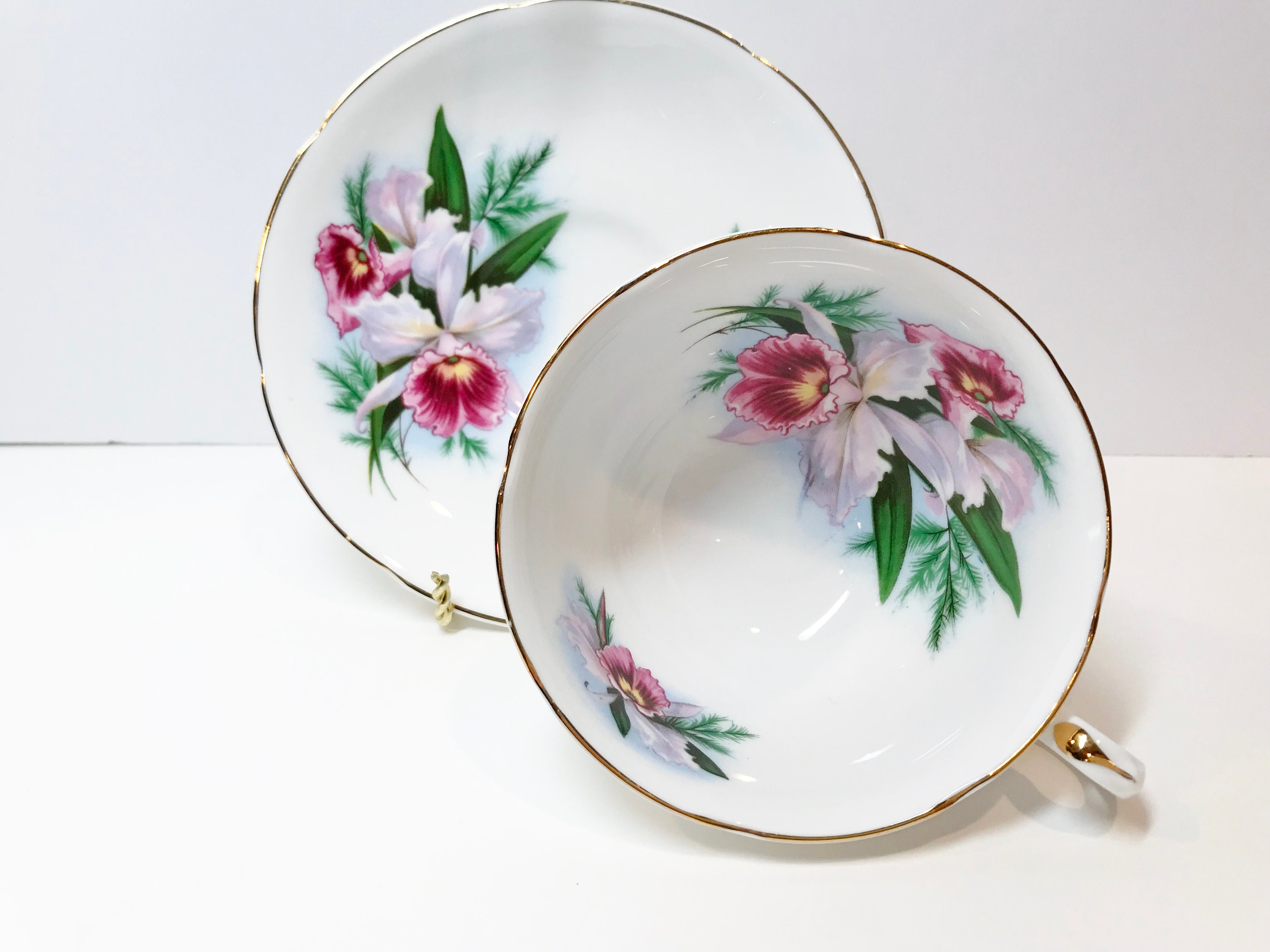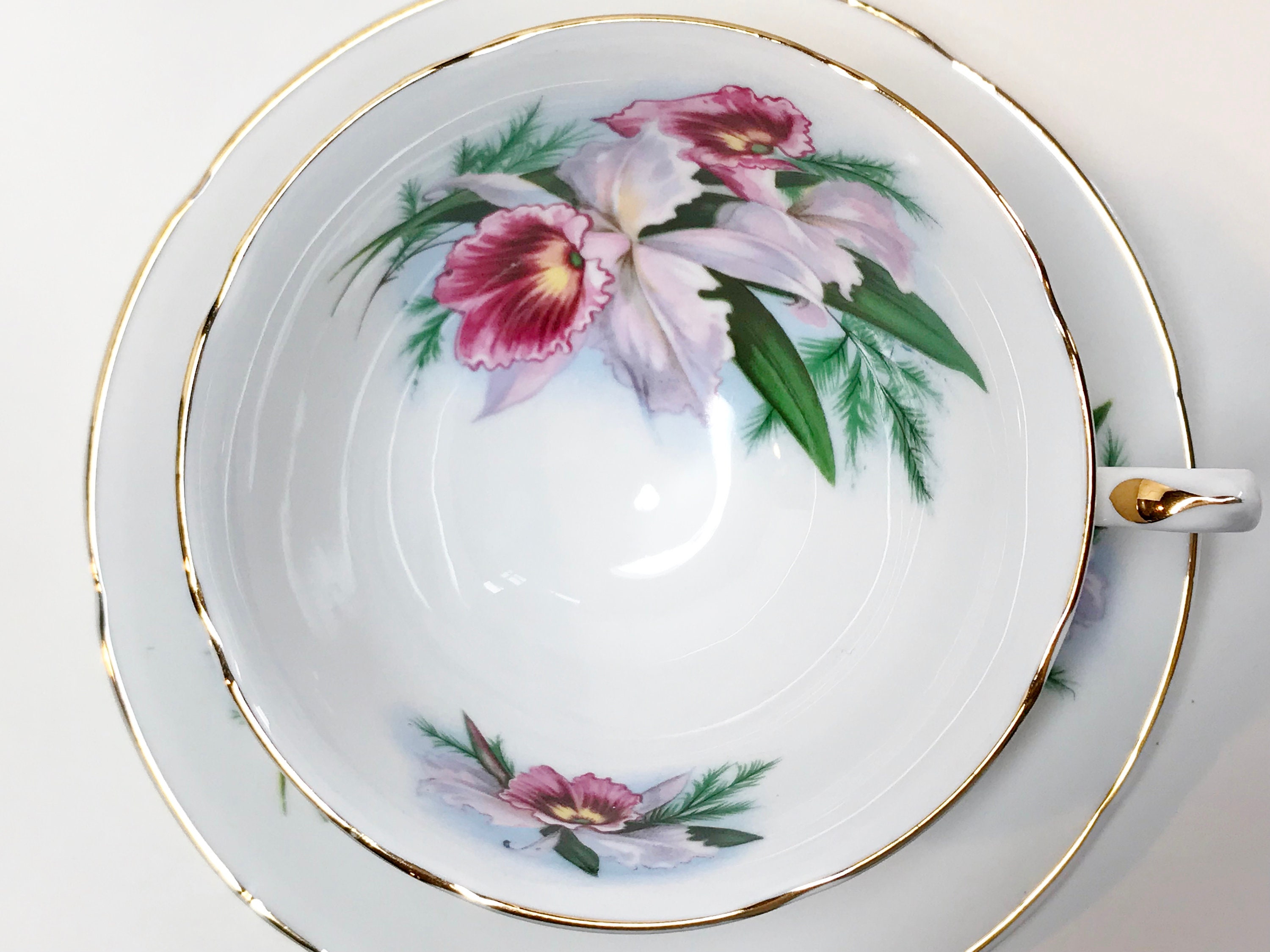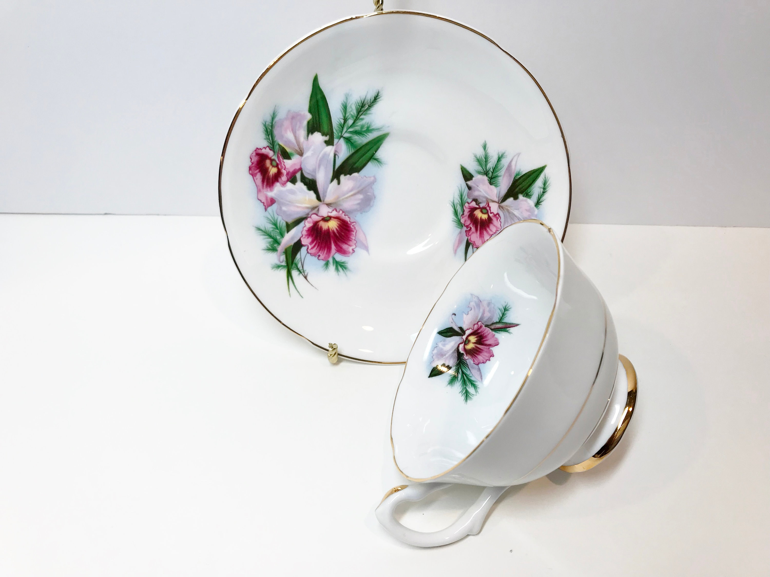 Royal Grafton Fine Bone China crafted this romantic tea cup and saucer with lovely orchids, softly scalloped edges and an ornate handle. The gold trim accentuates the perfect highlights.