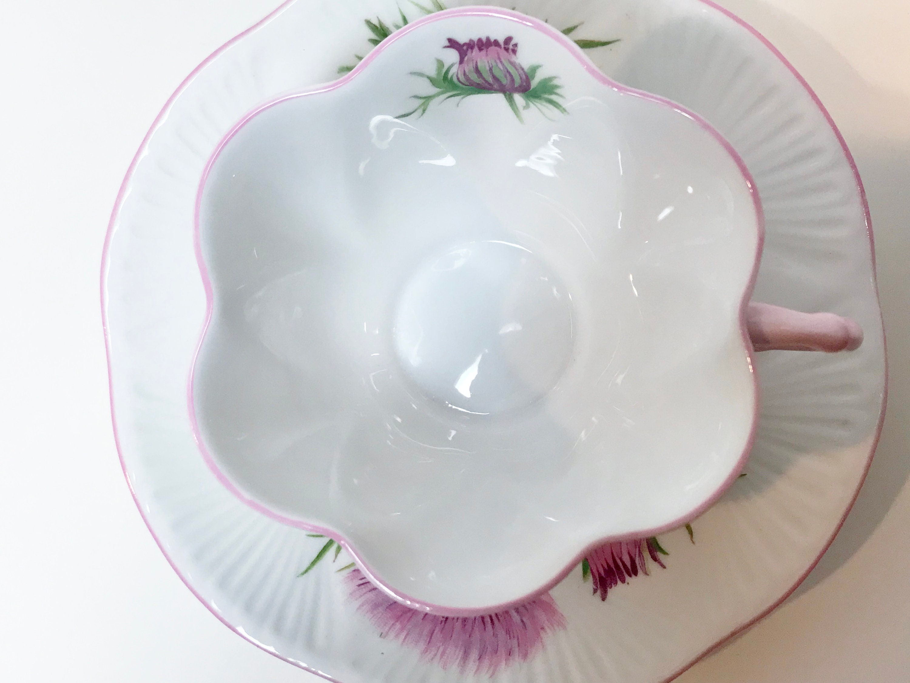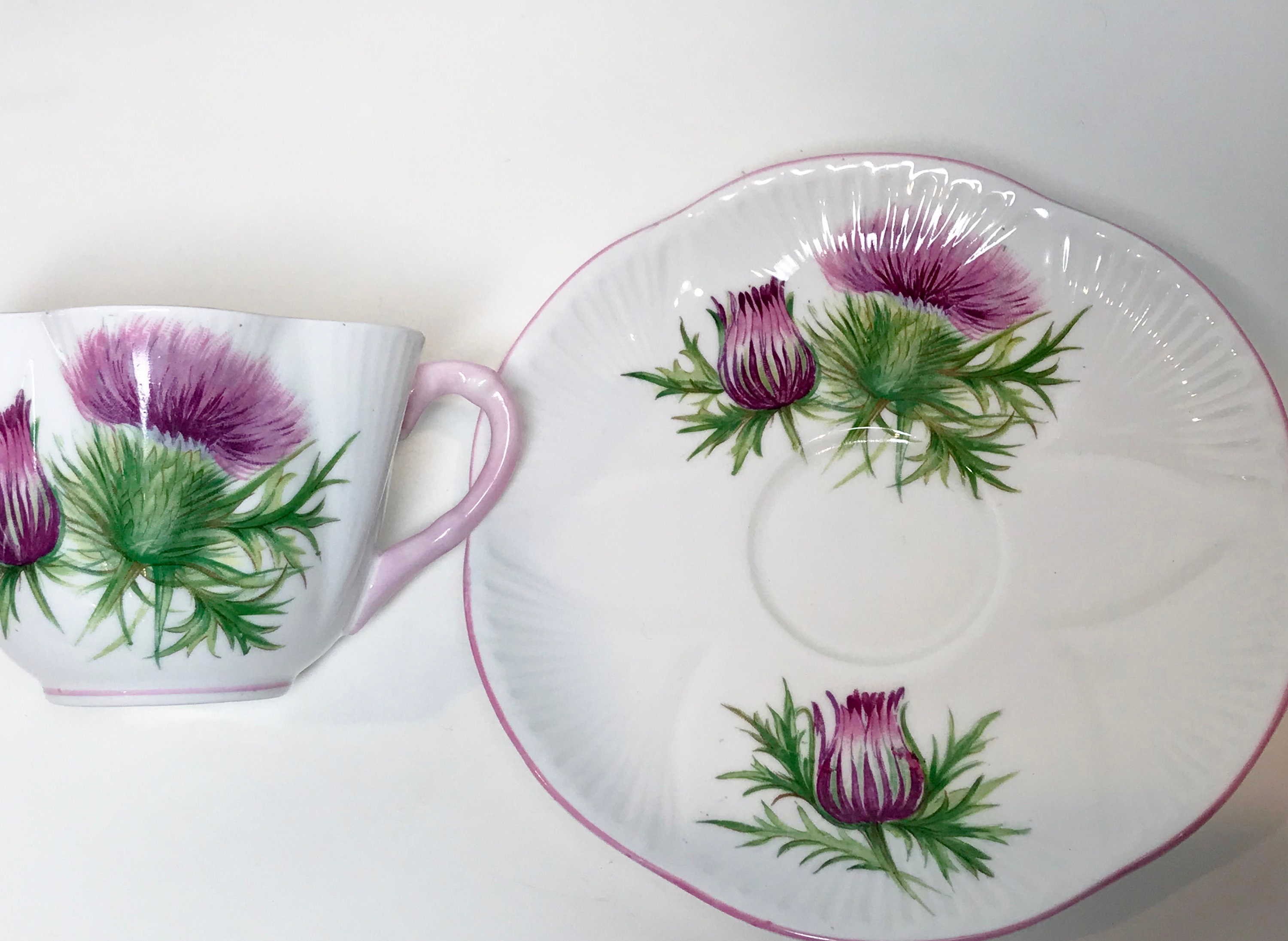 Shelley Fine Bone China of England crafted this Thistle pattern 13820 tea cup and saucer in their dainty shape.