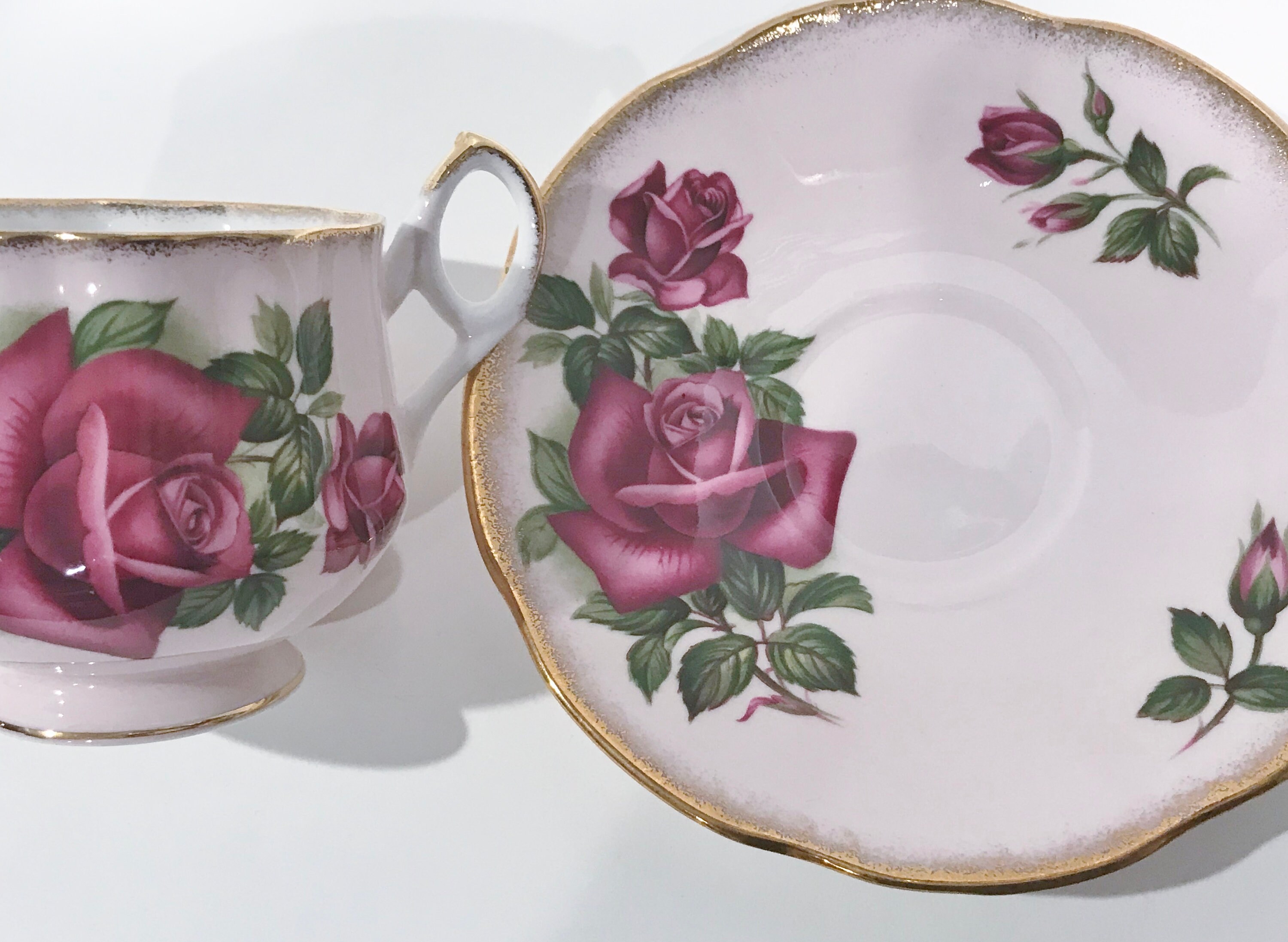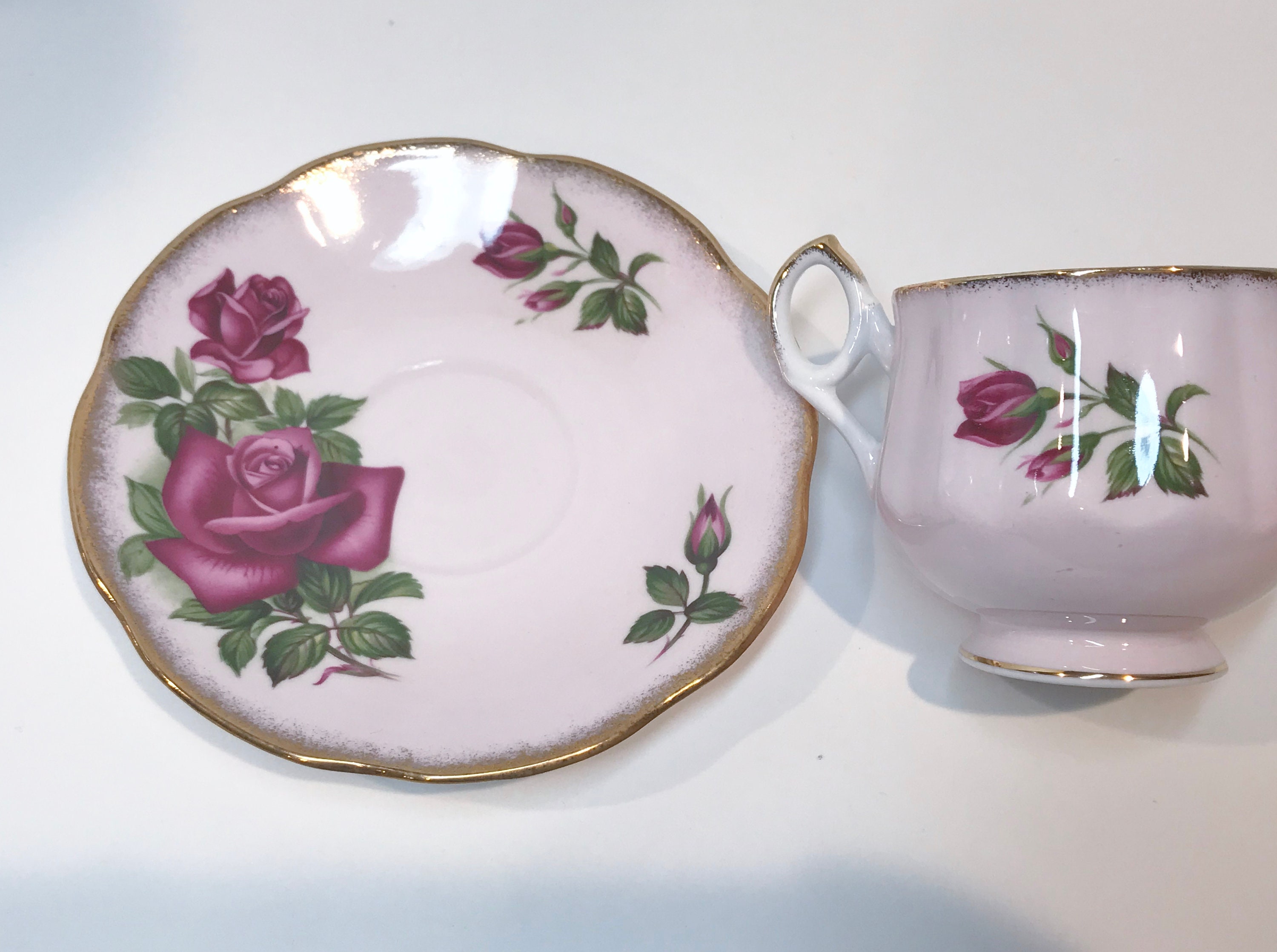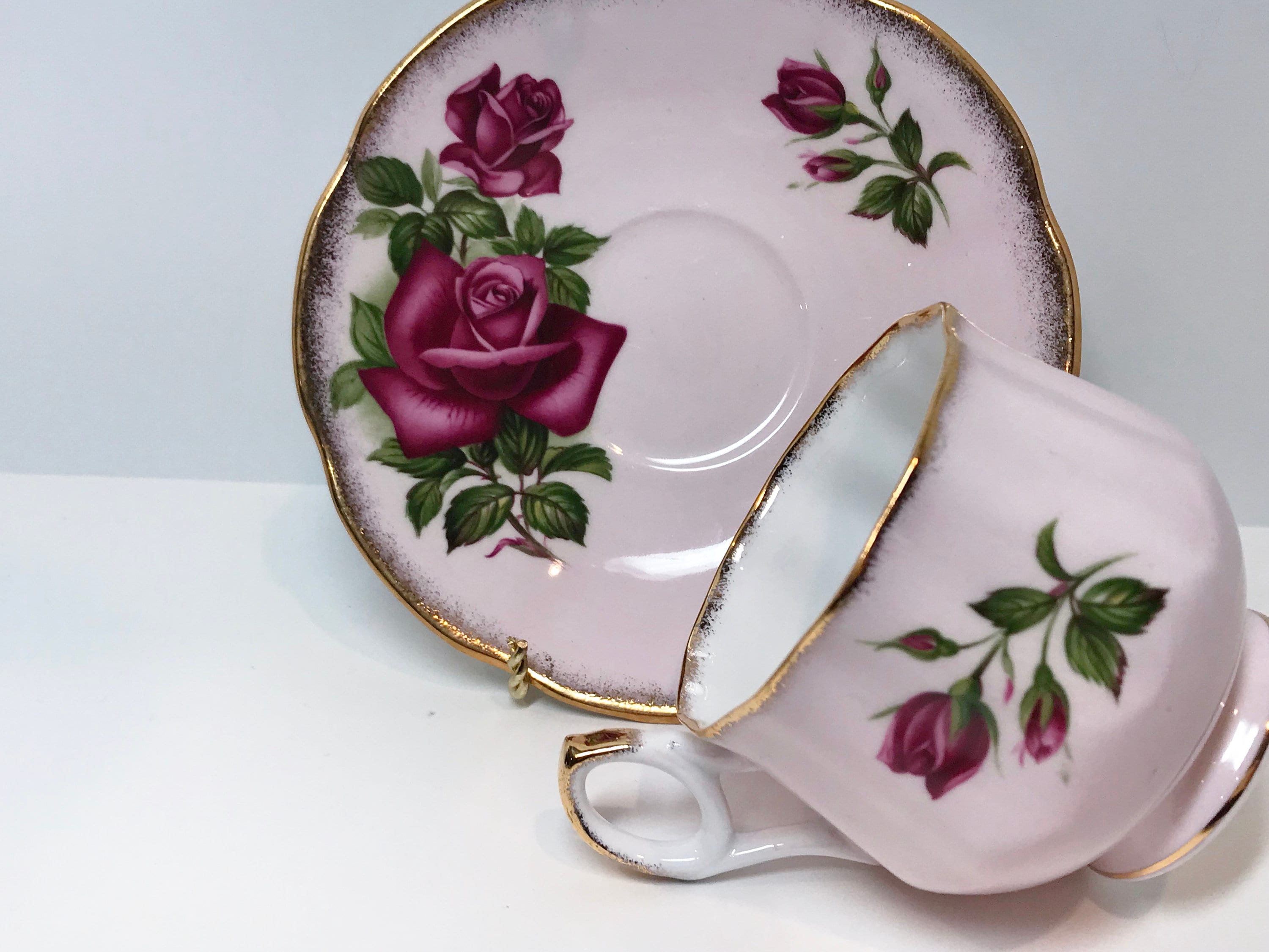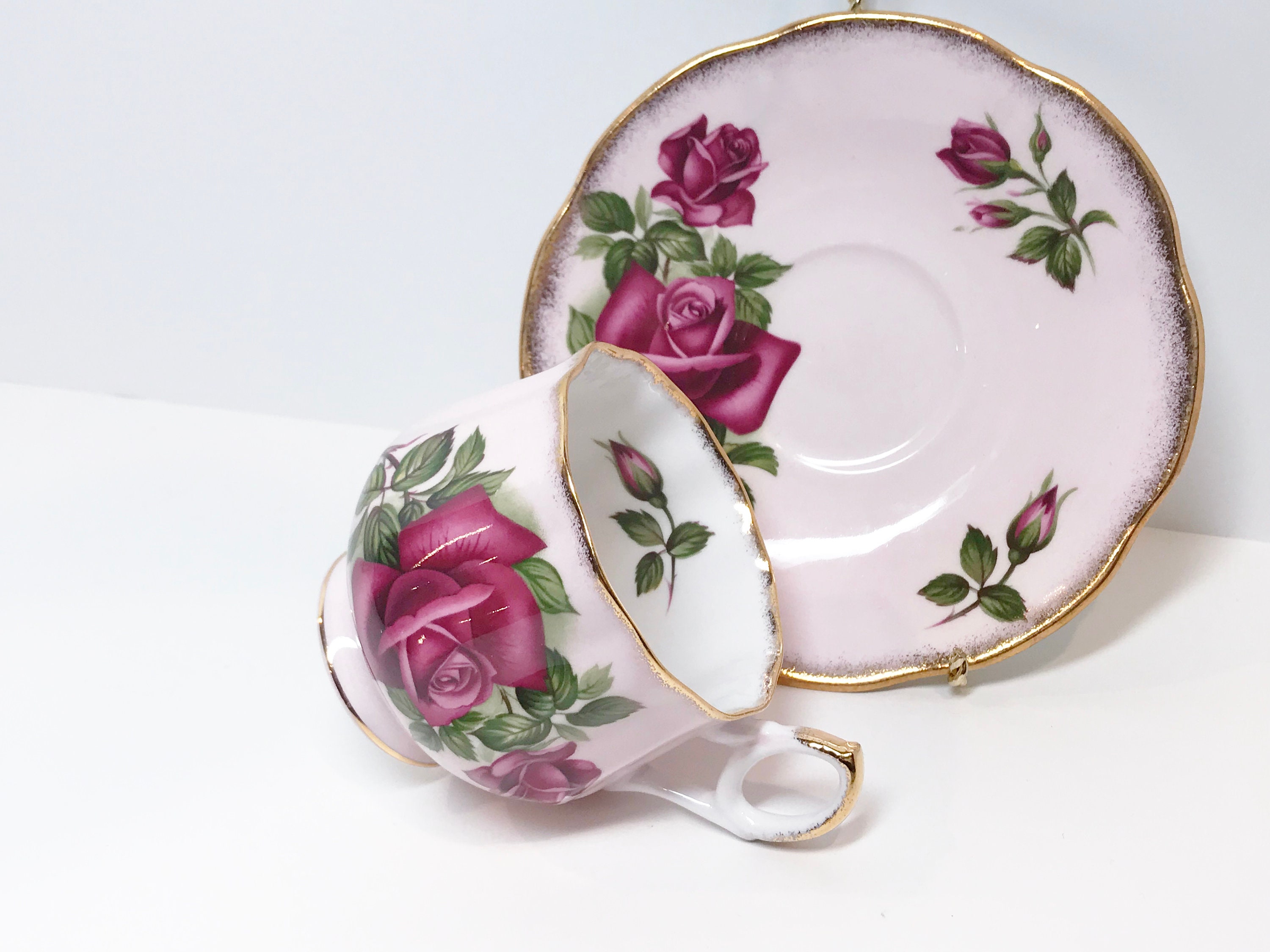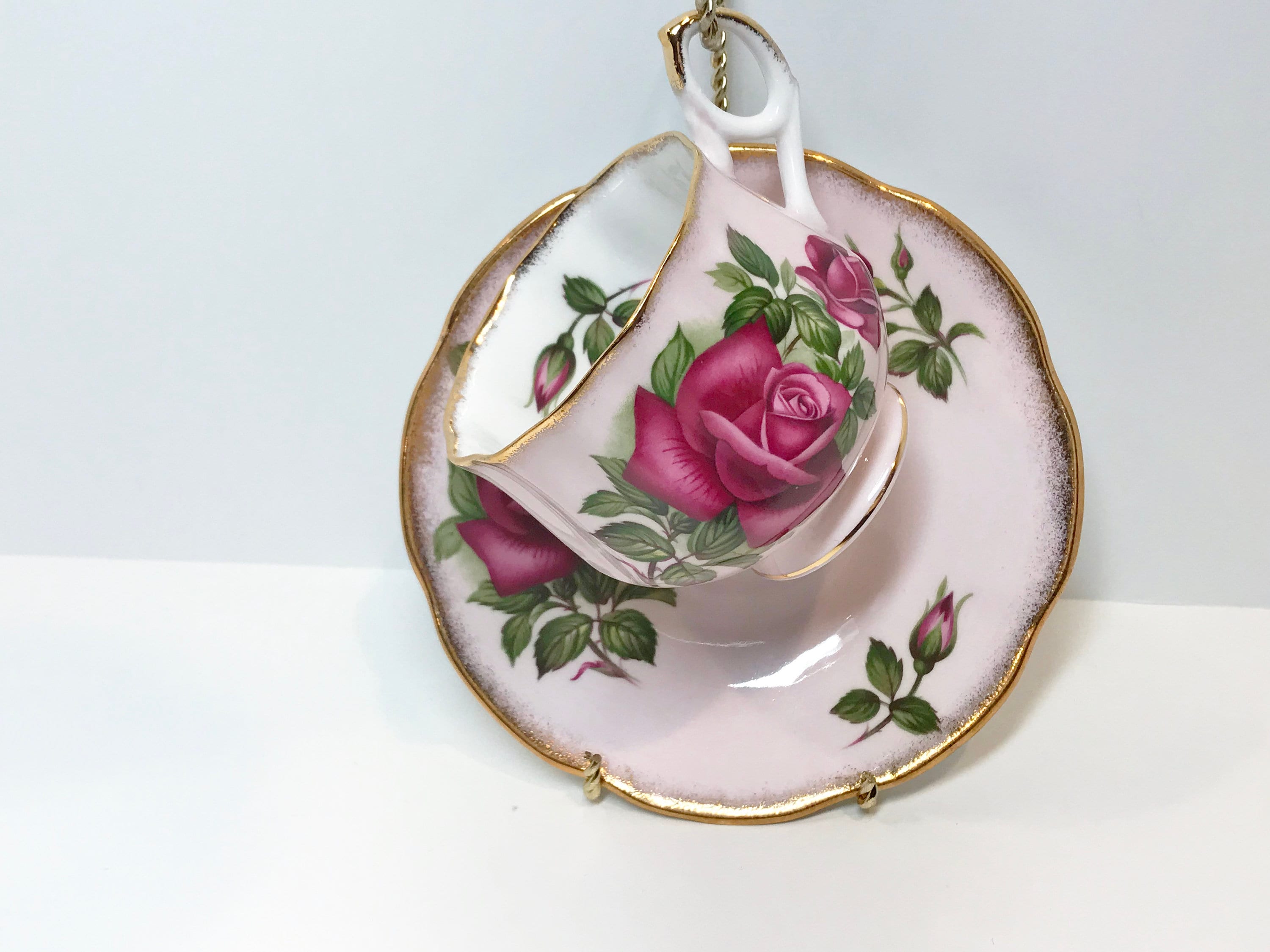 A stunning large rose carries the holder into a romantic setting. The inside has a large rosebud and the pieces are trimmed in gold. Think pink, from the footed cup to the beautiful saucer.