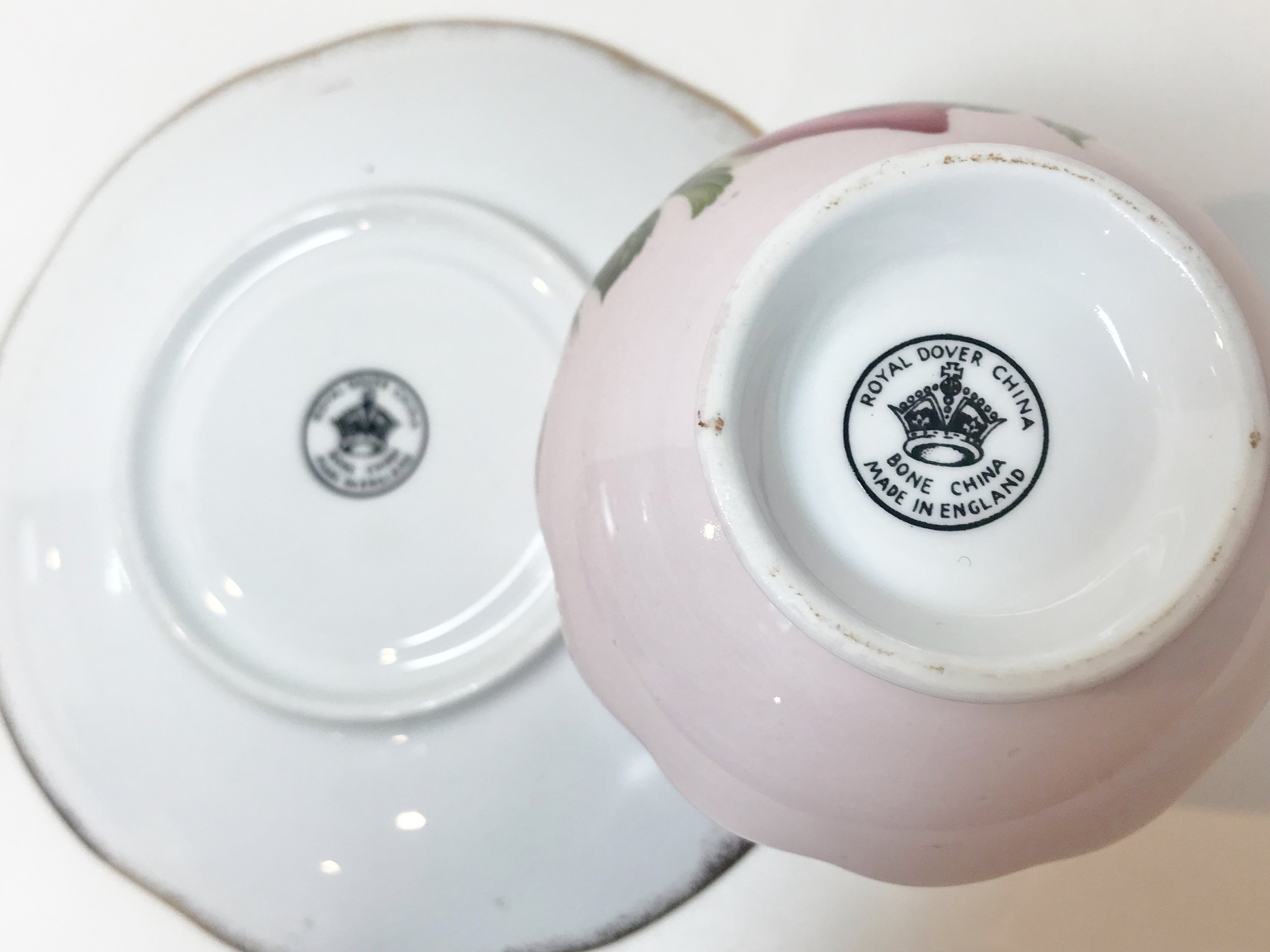 The charming teacup and saucer was produced by Royal Dover Fine Bone China of England. Little is known about its history other than it was producing during the 1950s.