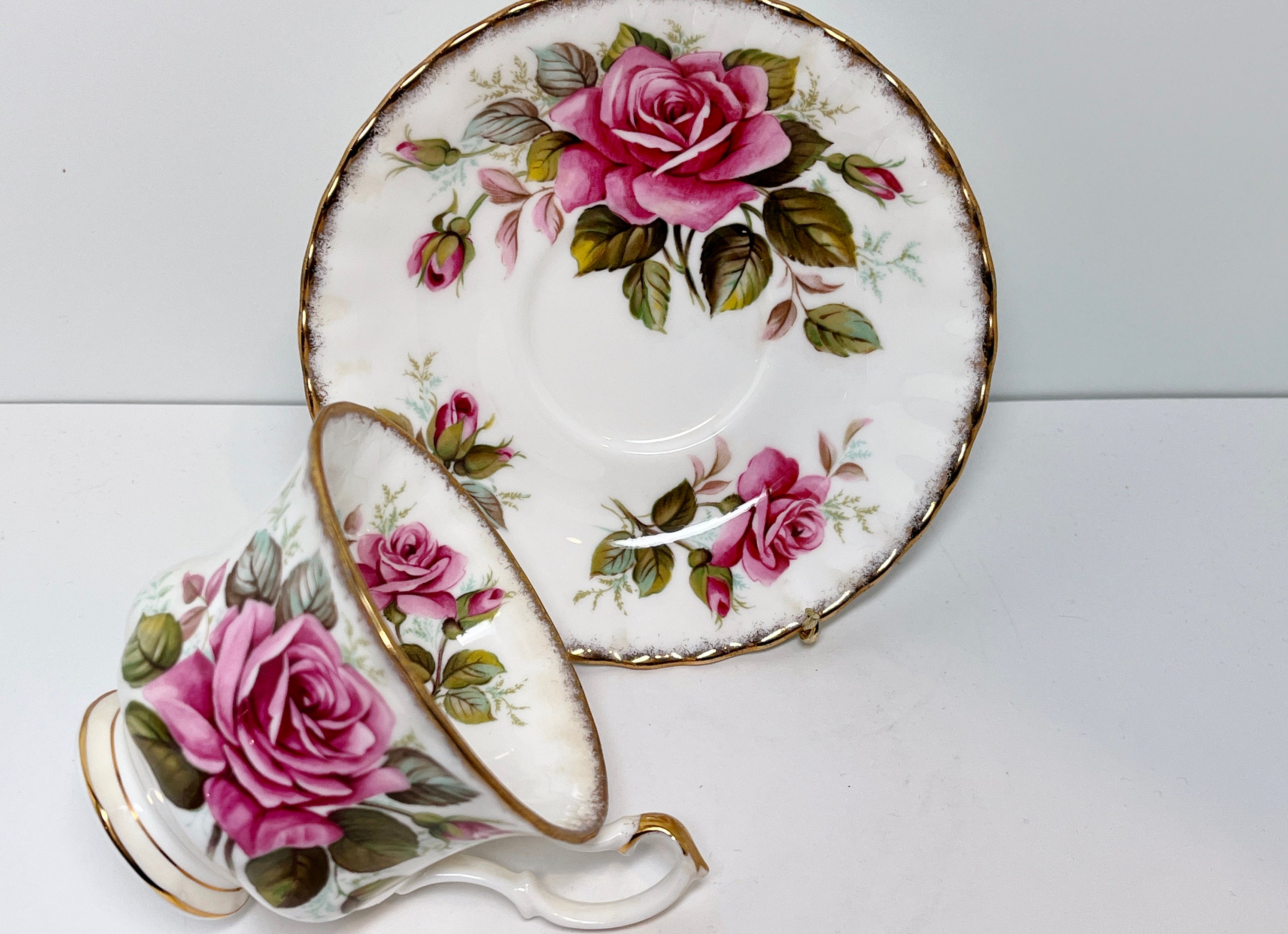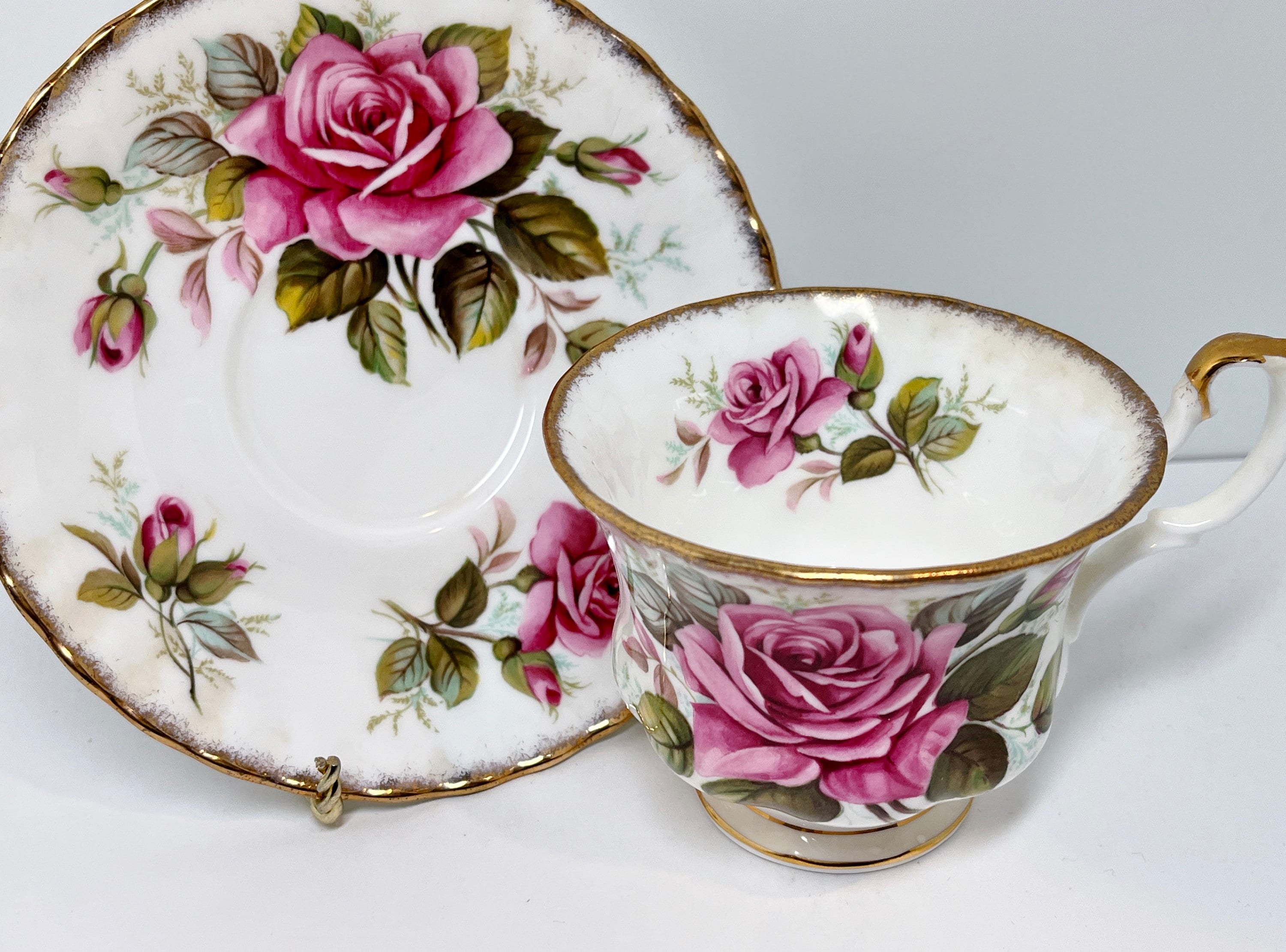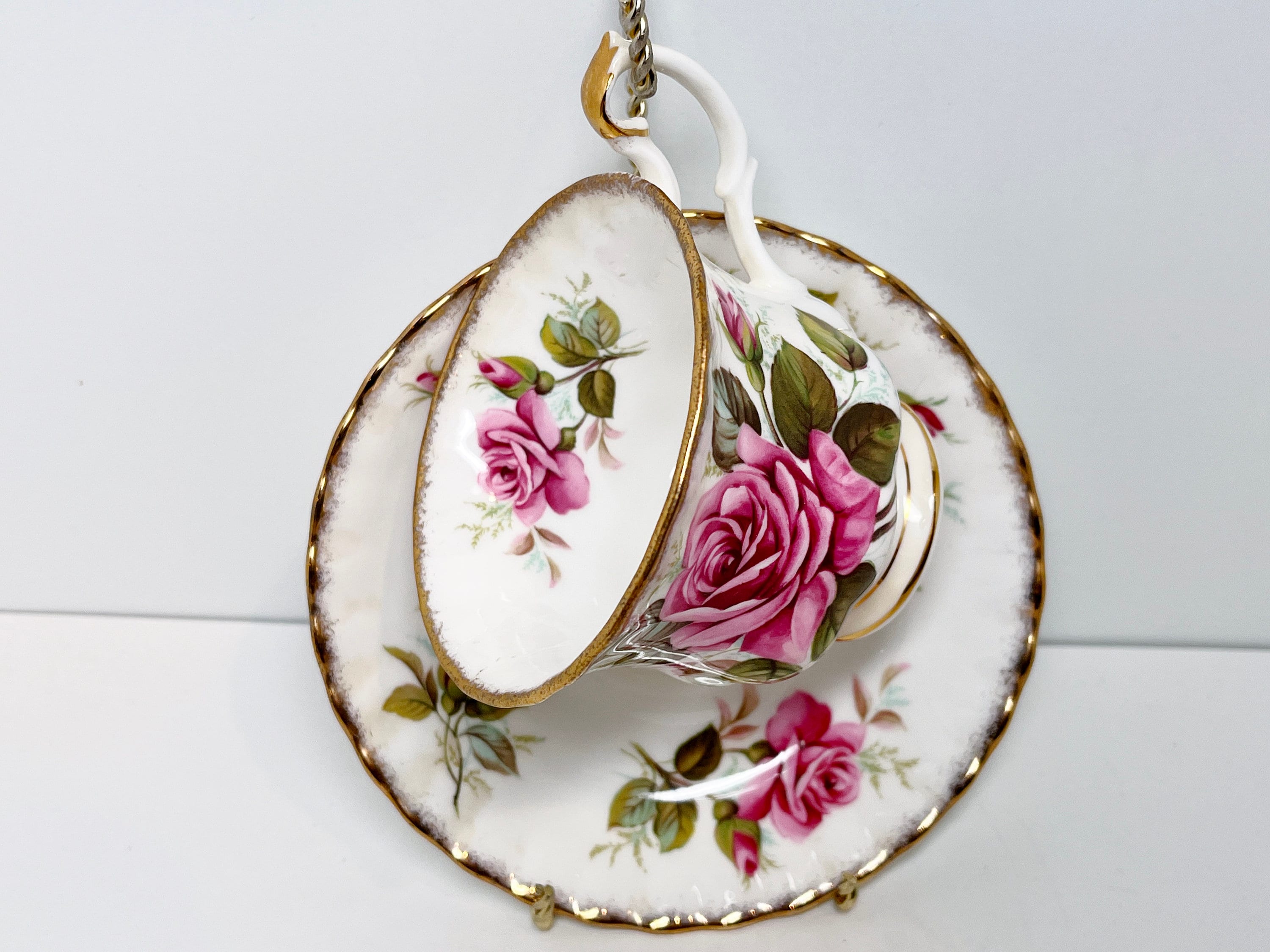 Large pink roses grace this pedestal tea cup. The pattern is called Margaret.