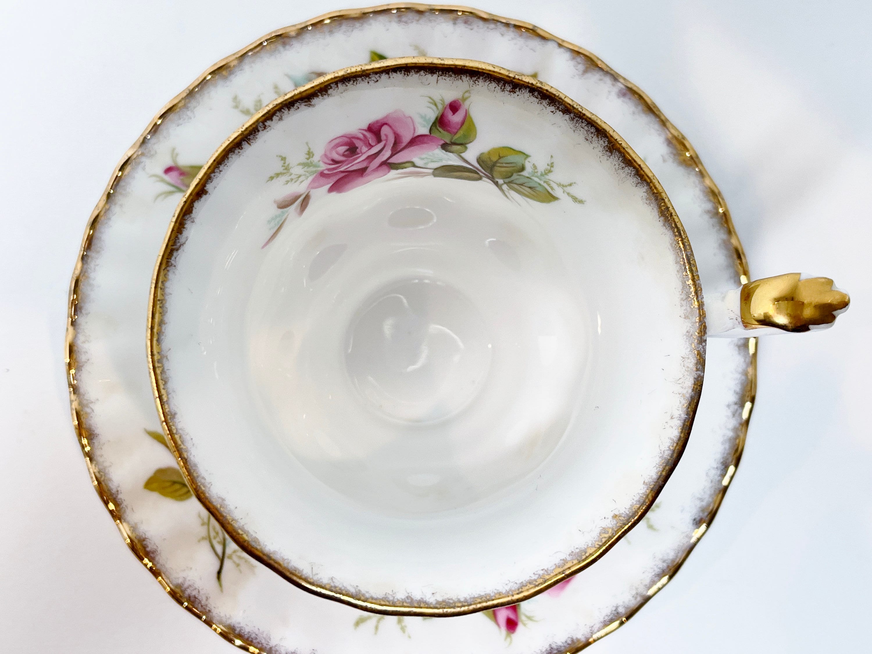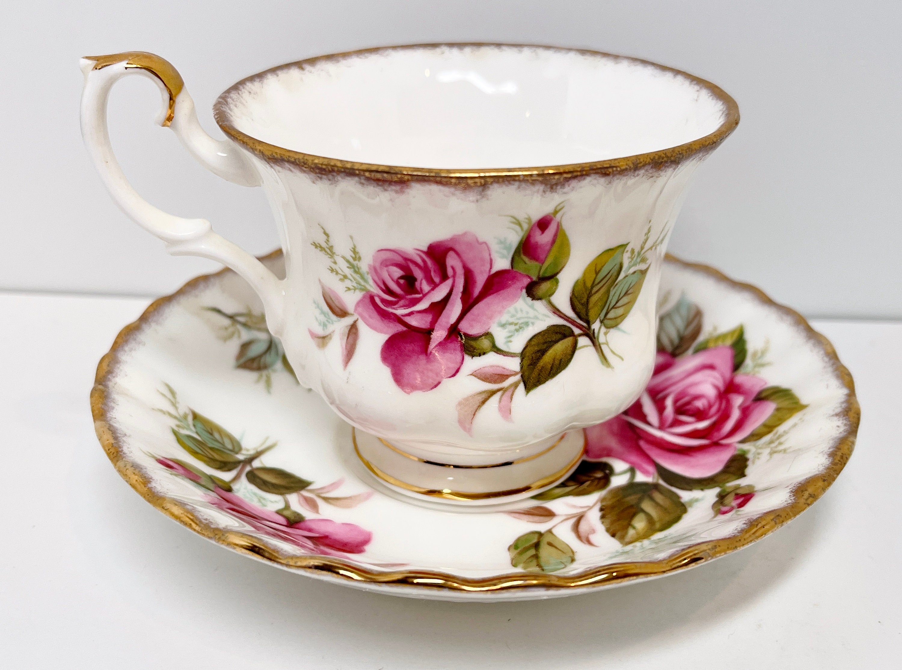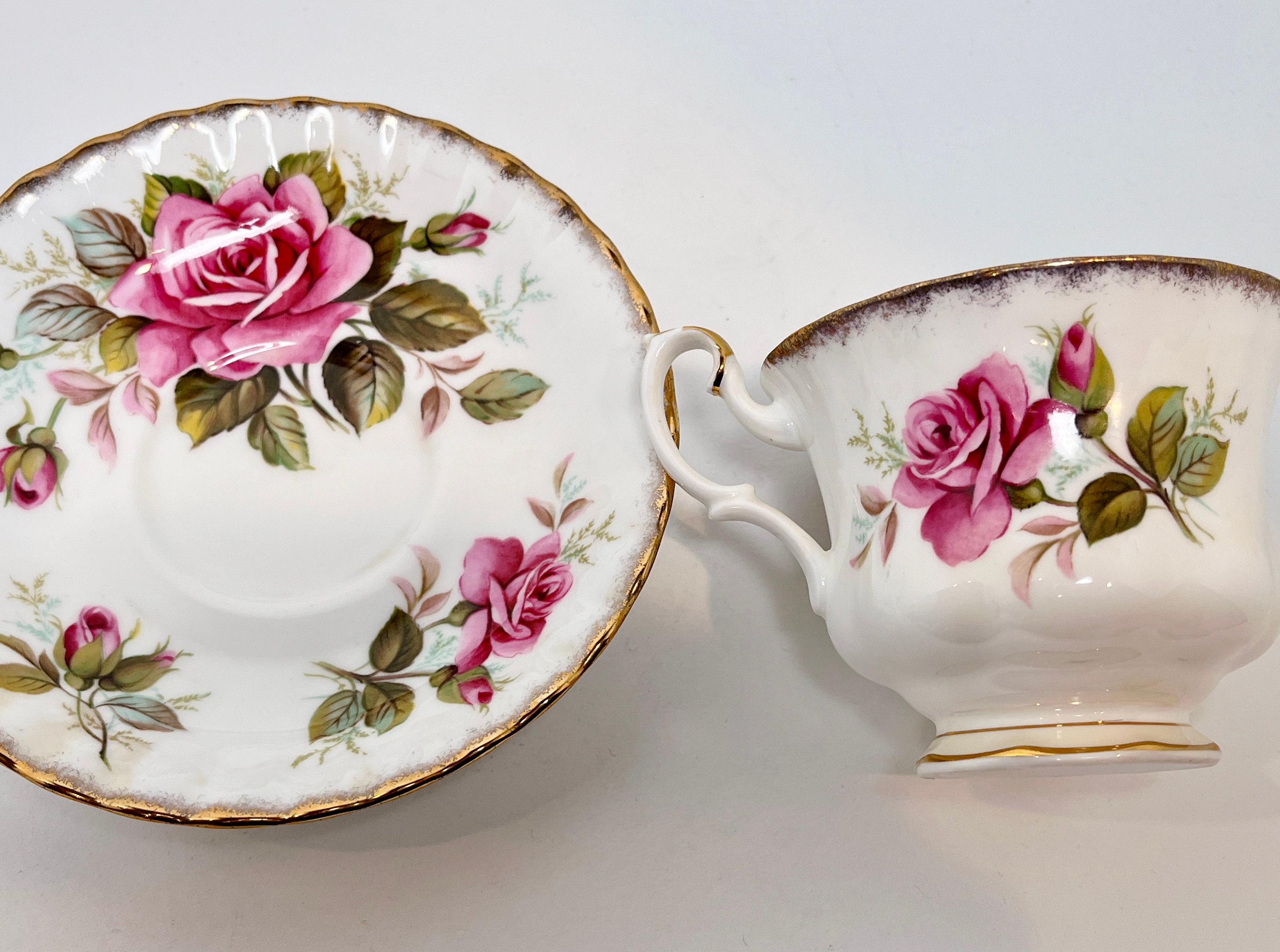 Large pink roses grace this pedestal tea cup. The pattern is called Margaret.