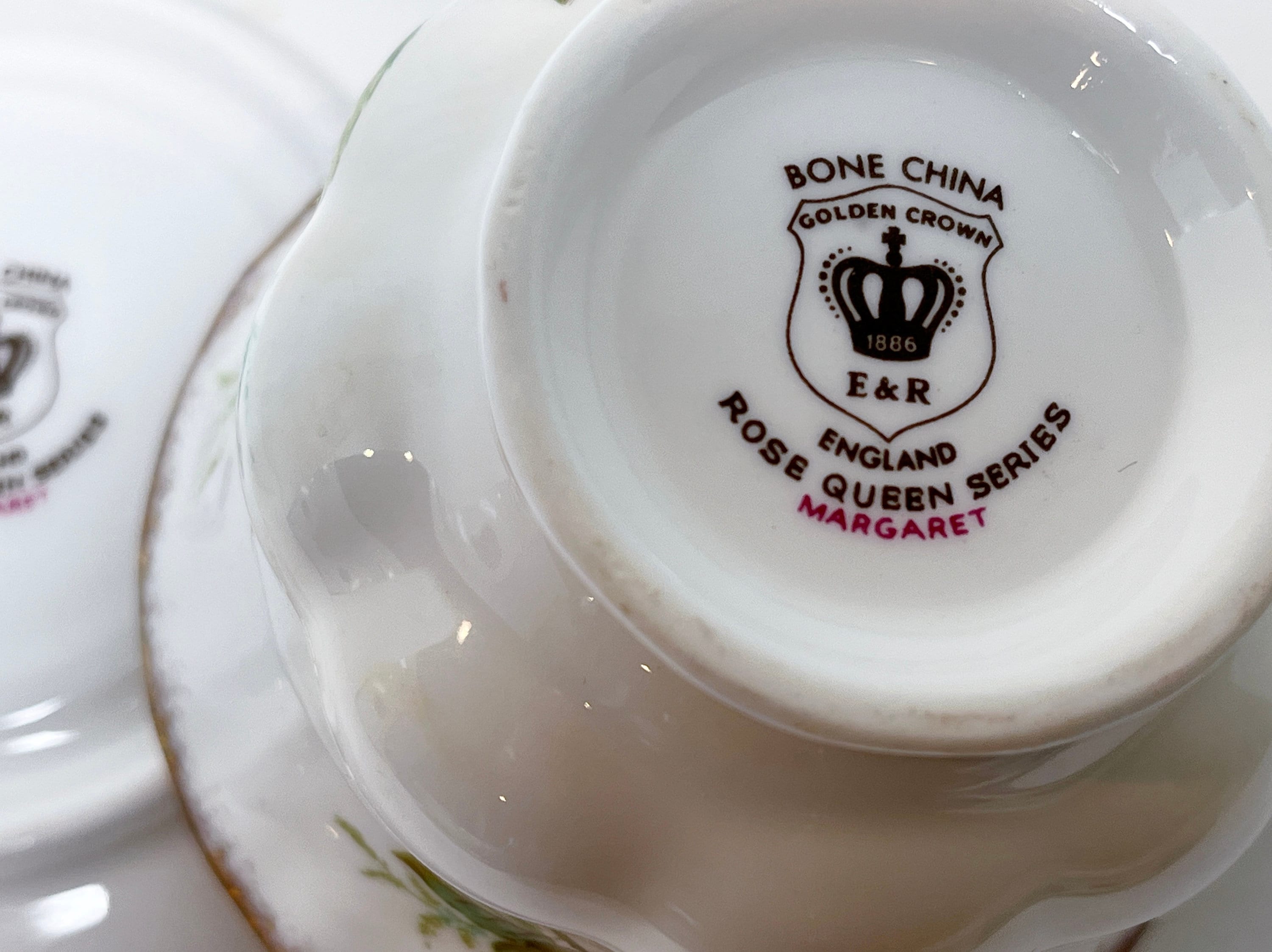 Golden Crown Bone China of England produced this colorful, elegant teacup and saucer as part of their Rose Queen Series. These teacups represent royalty, beauty and love.