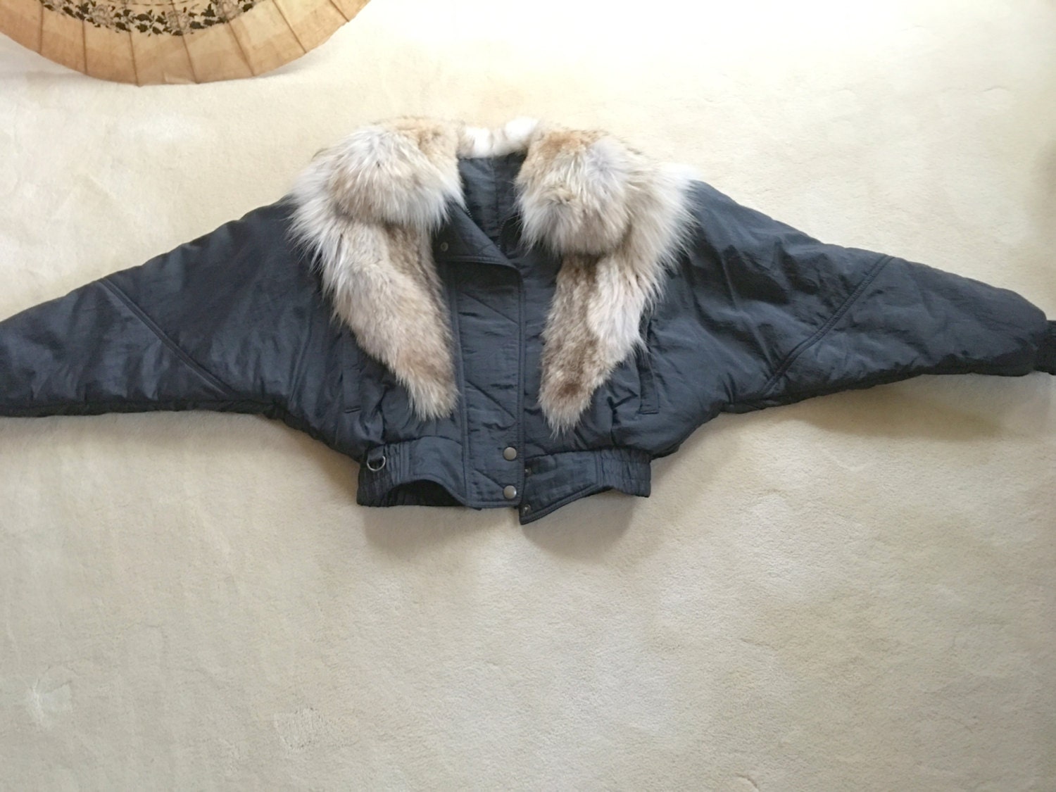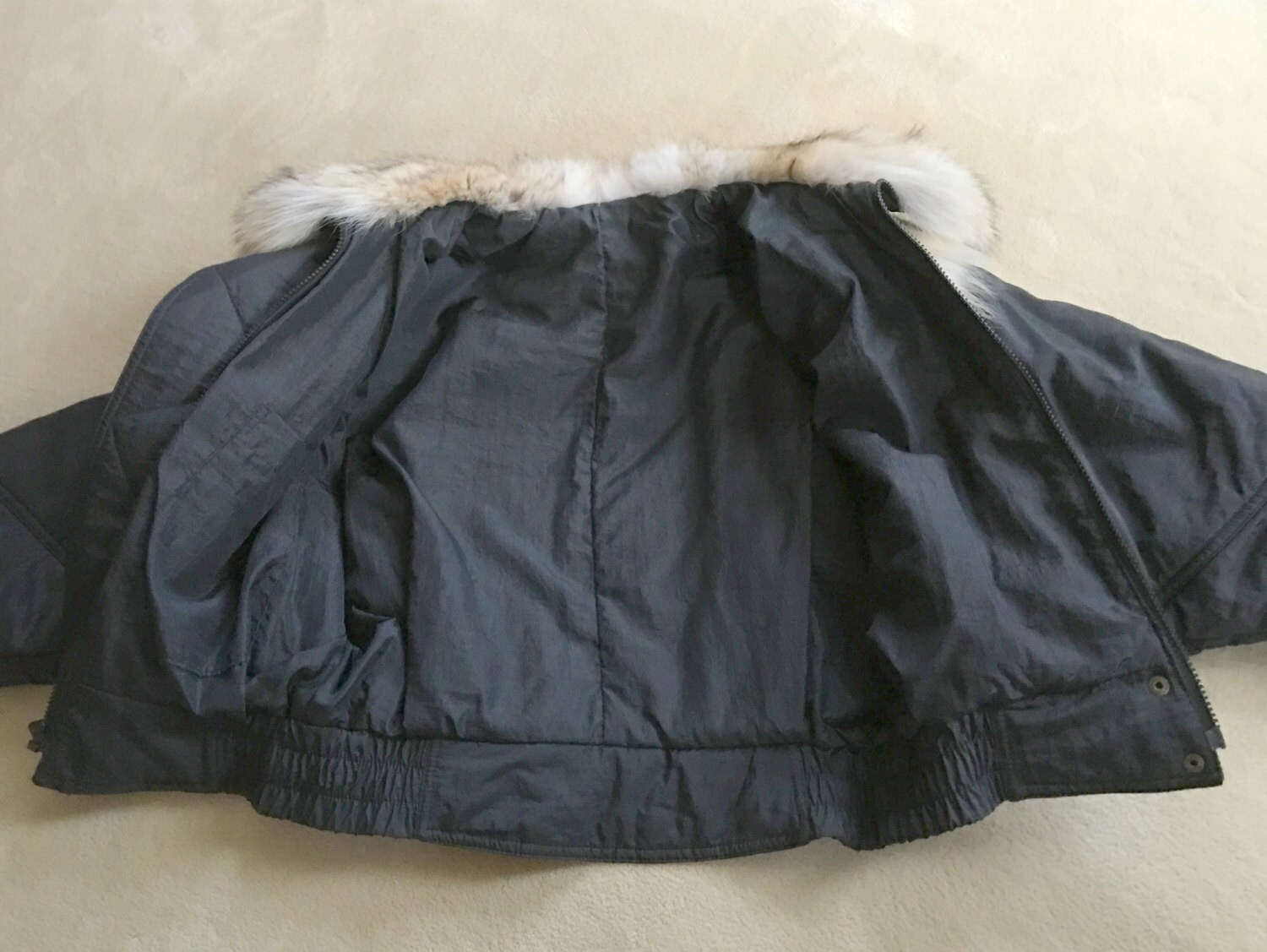 This wonderful black winter parka has authentic coyote on the shoulders and collar. The fur is thick and in excellent condition.