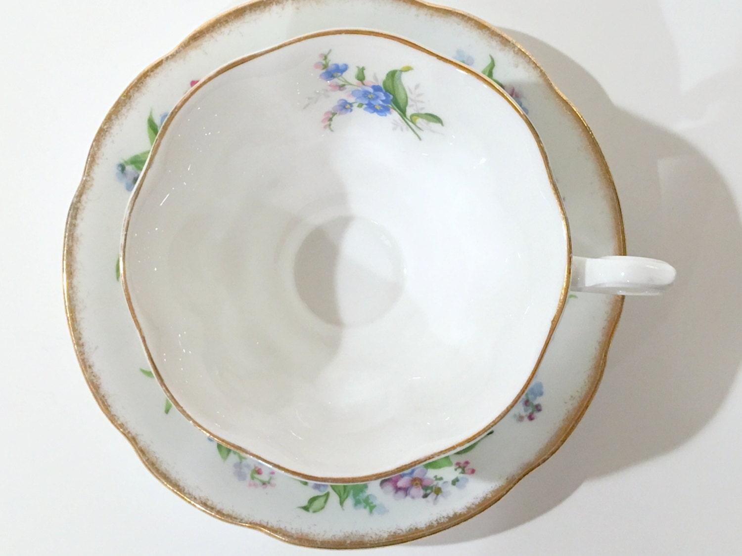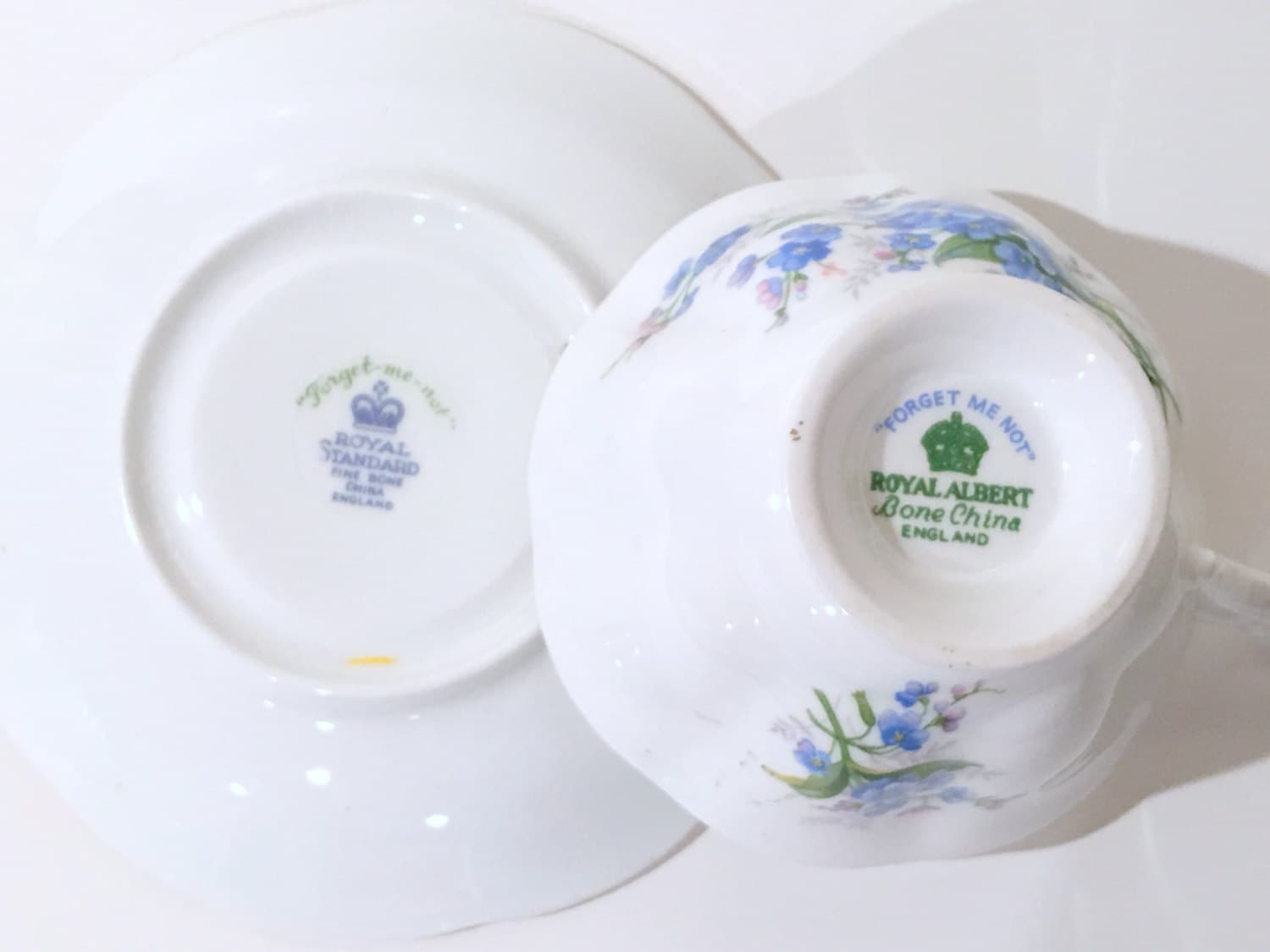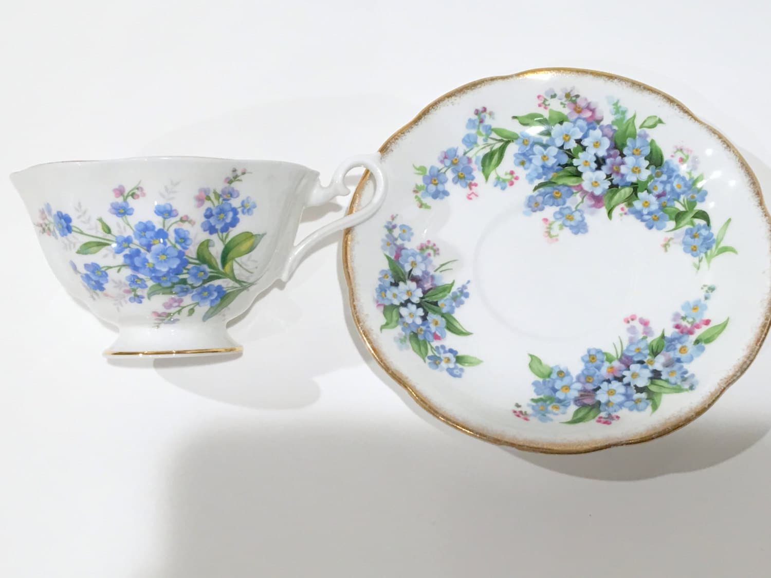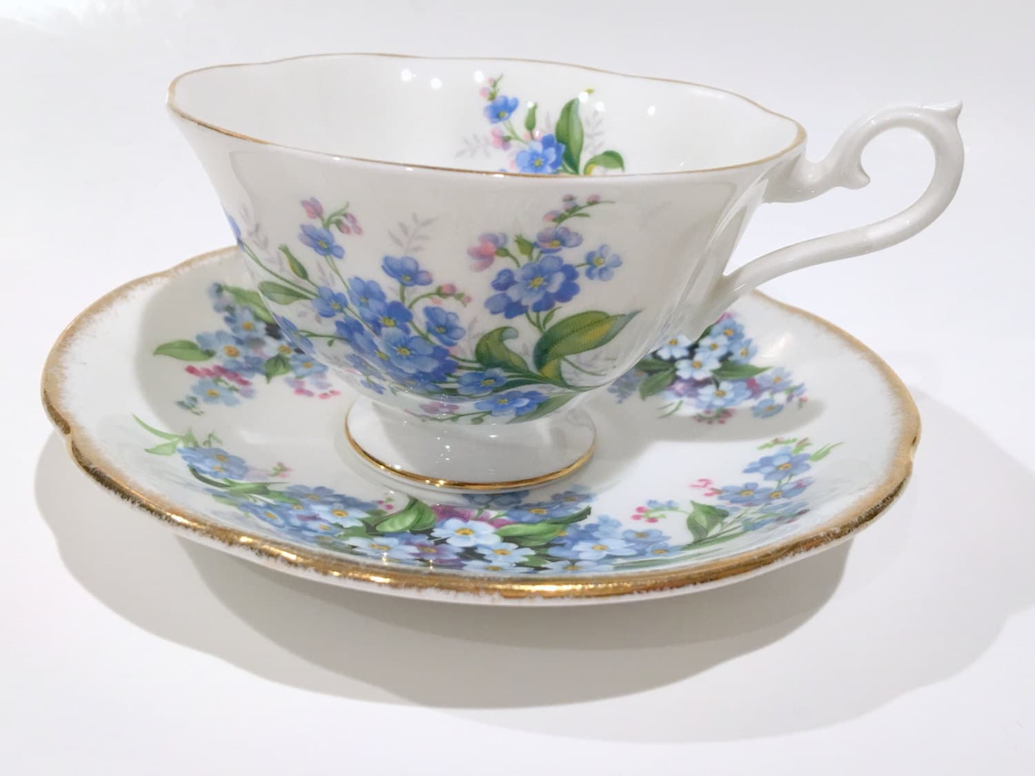 Royal Albert Bone China of England crafted this wide mouthed, pedestal tea set and called it Forget Me Not.