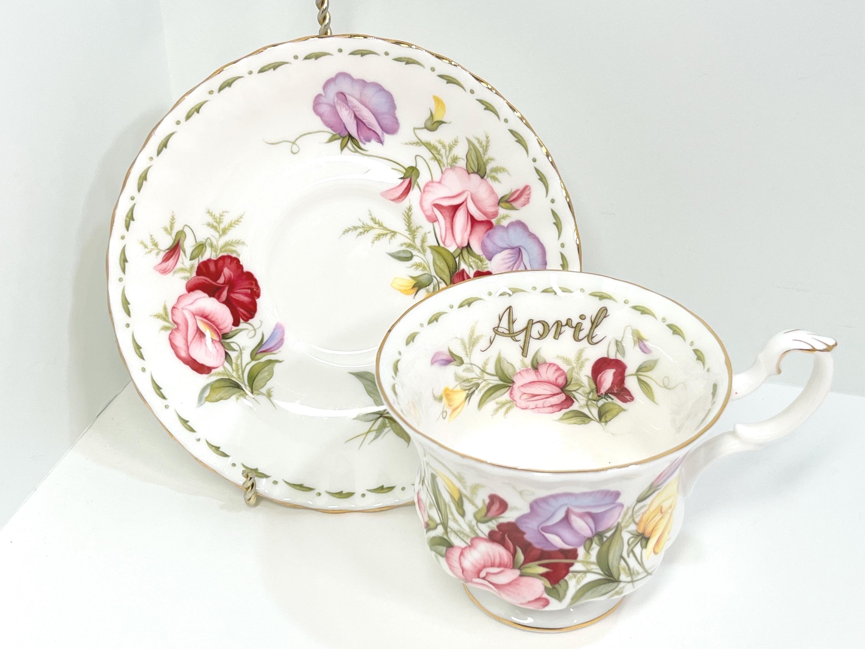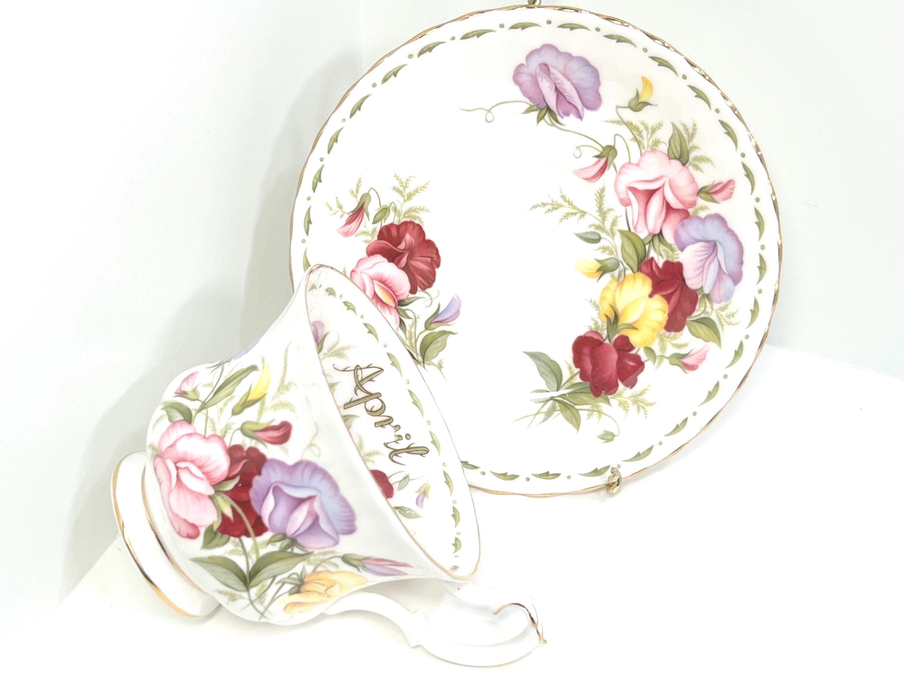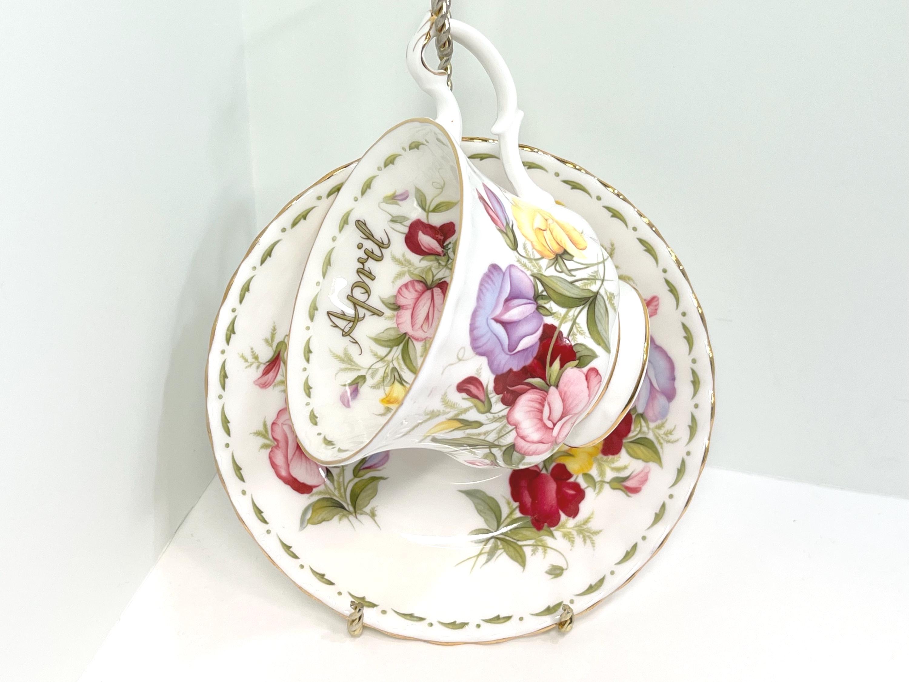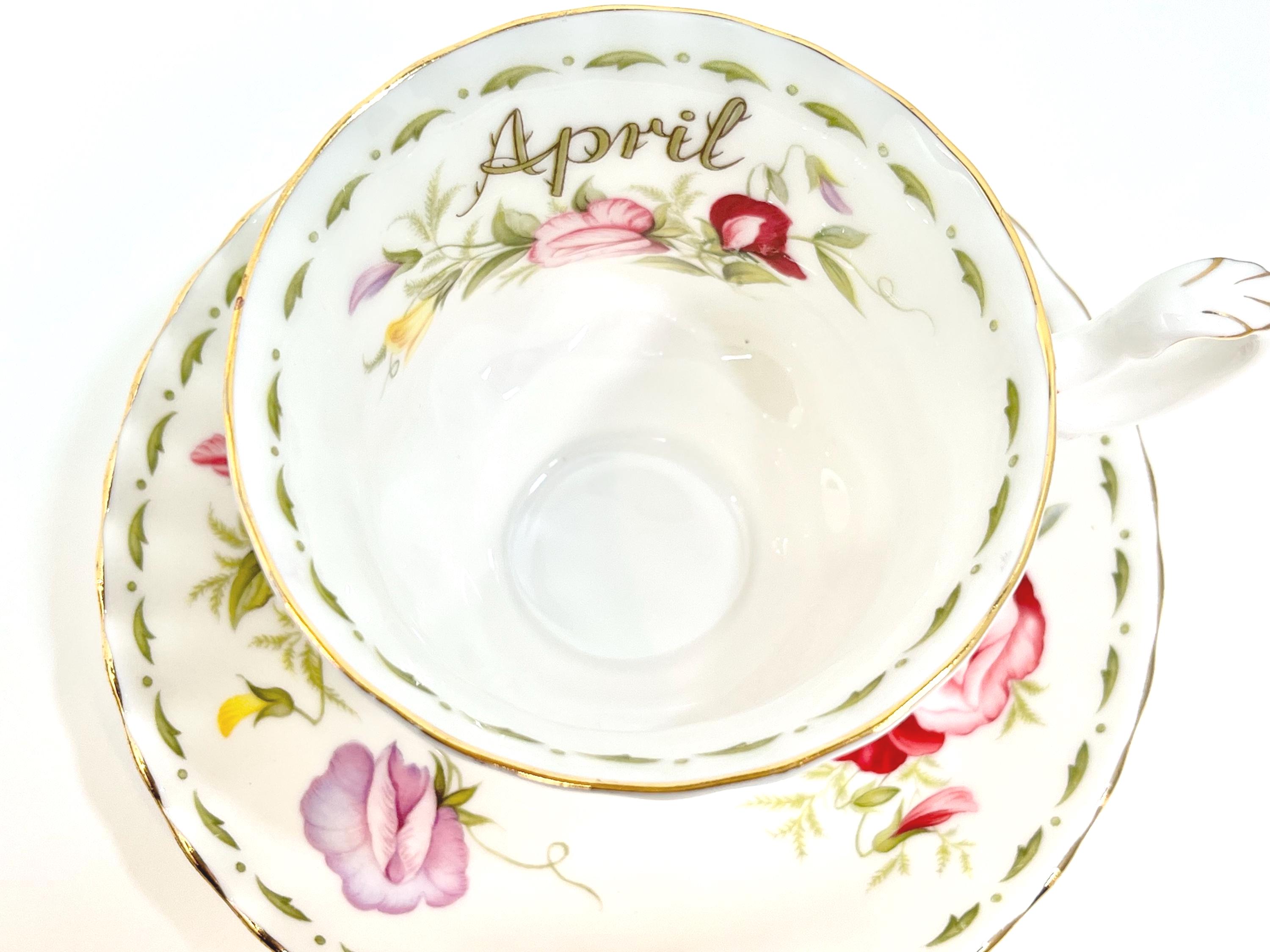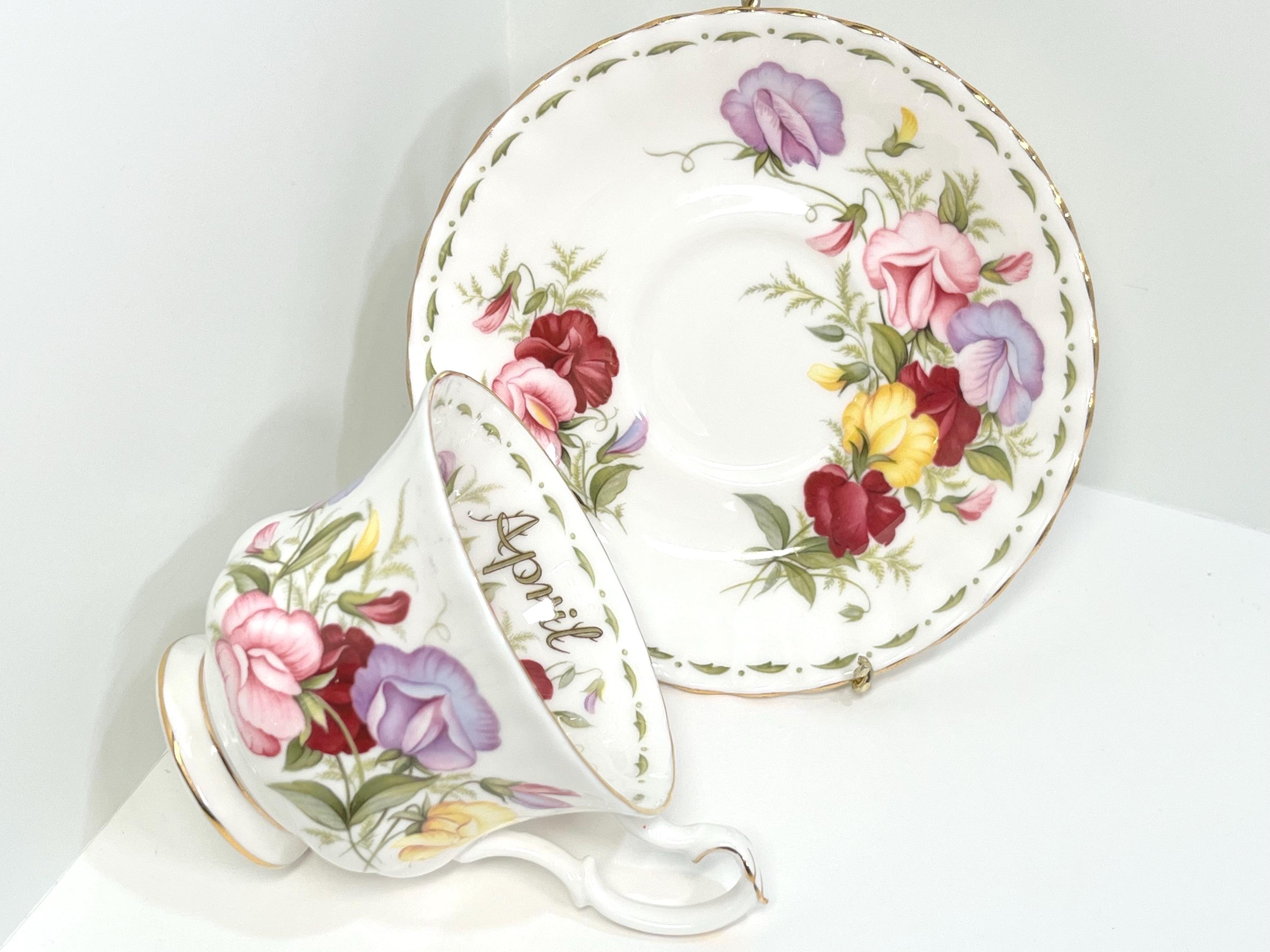 Colorful flowers cascade over the glossy white china on this birthday teacup for the month of April. They are, of course, the birth flower for April, sweet peas.