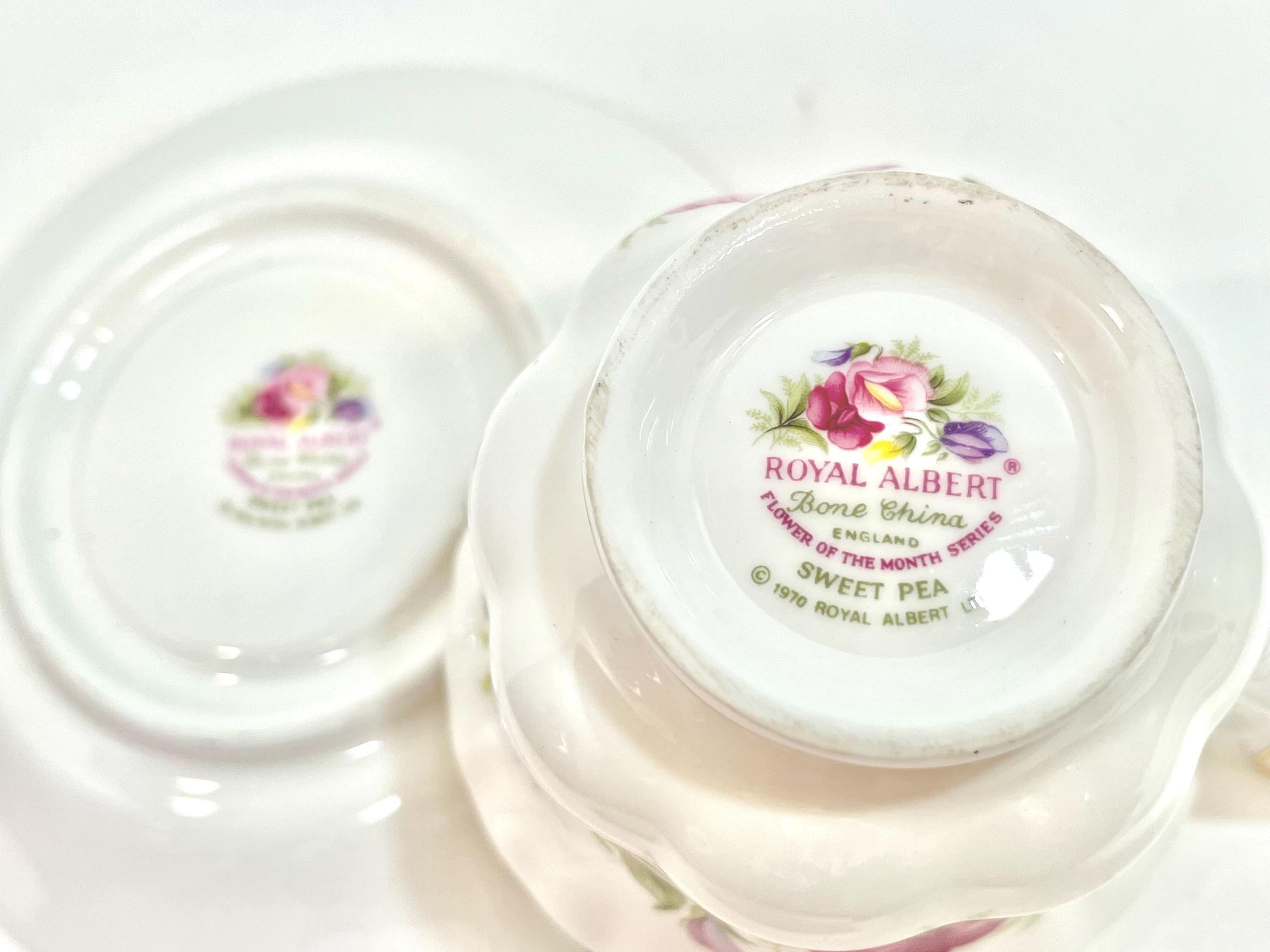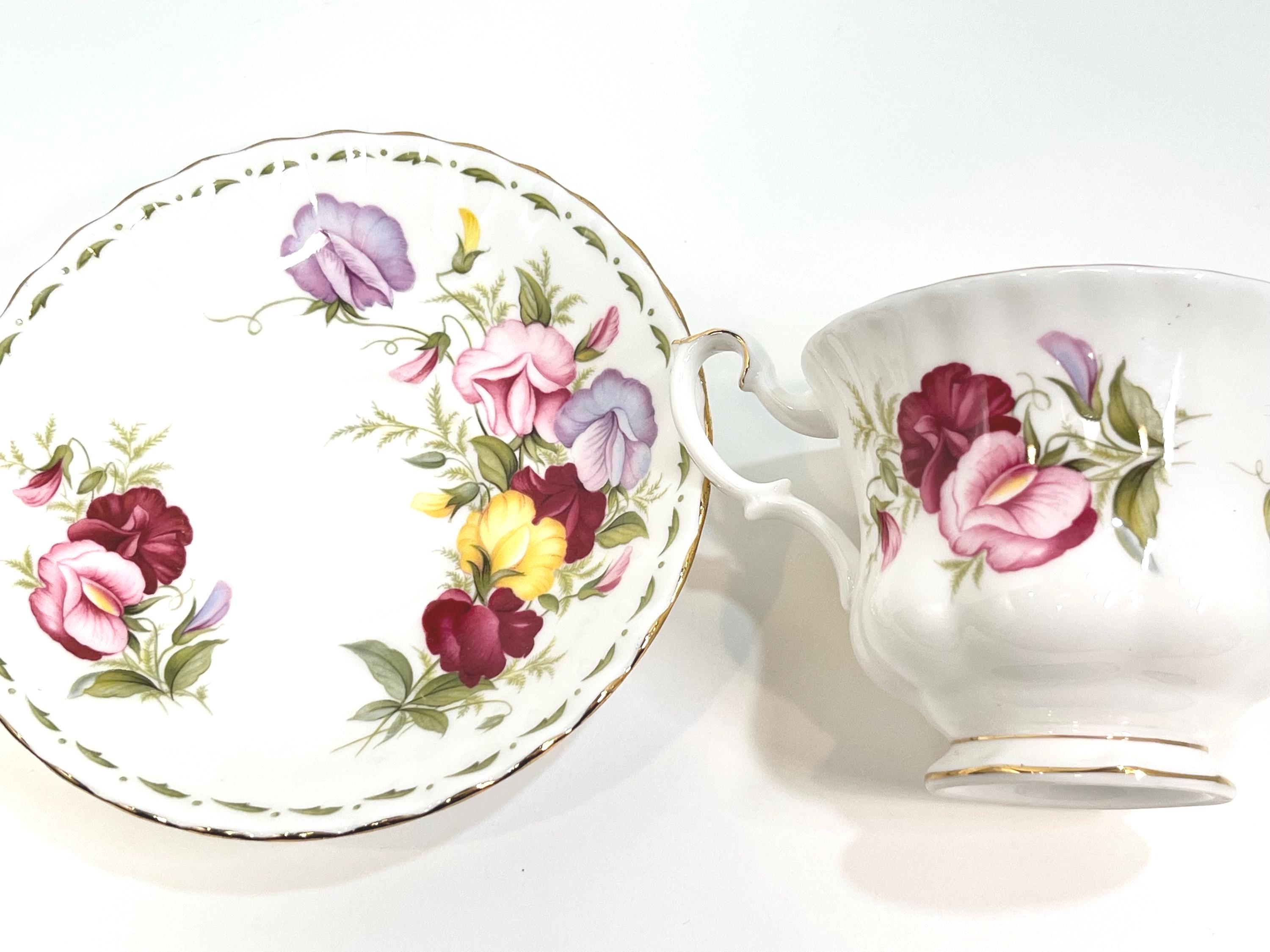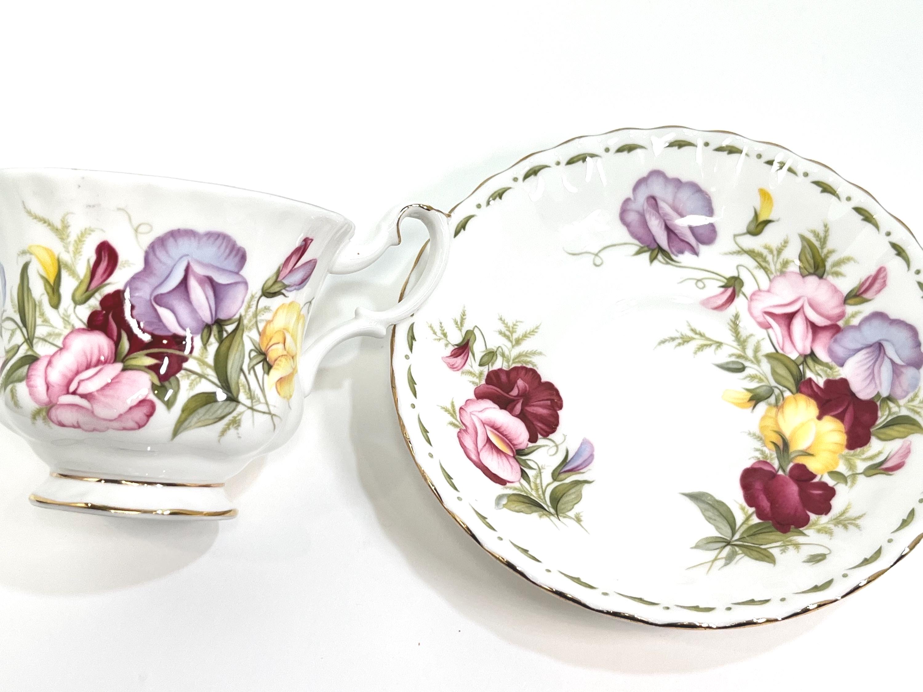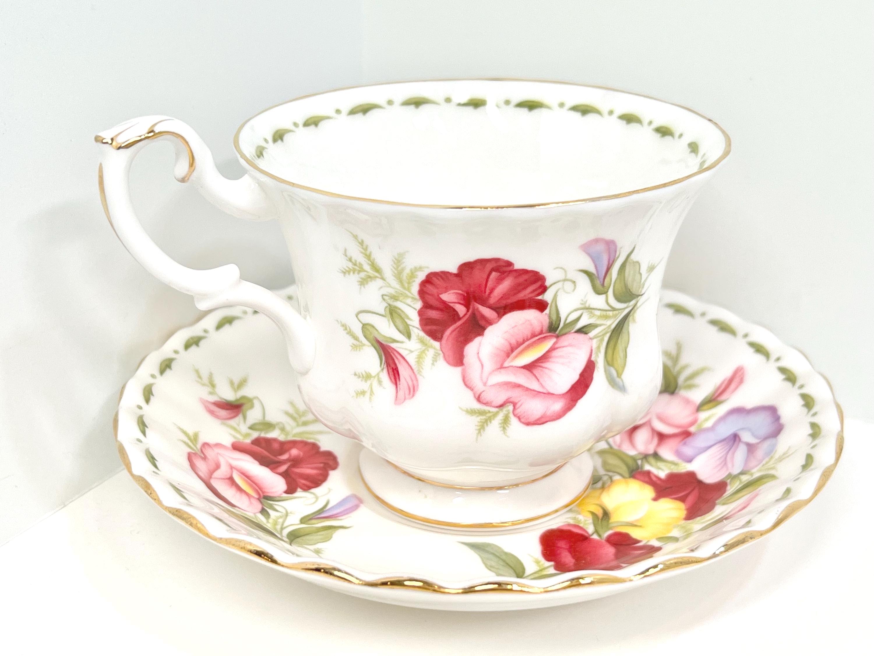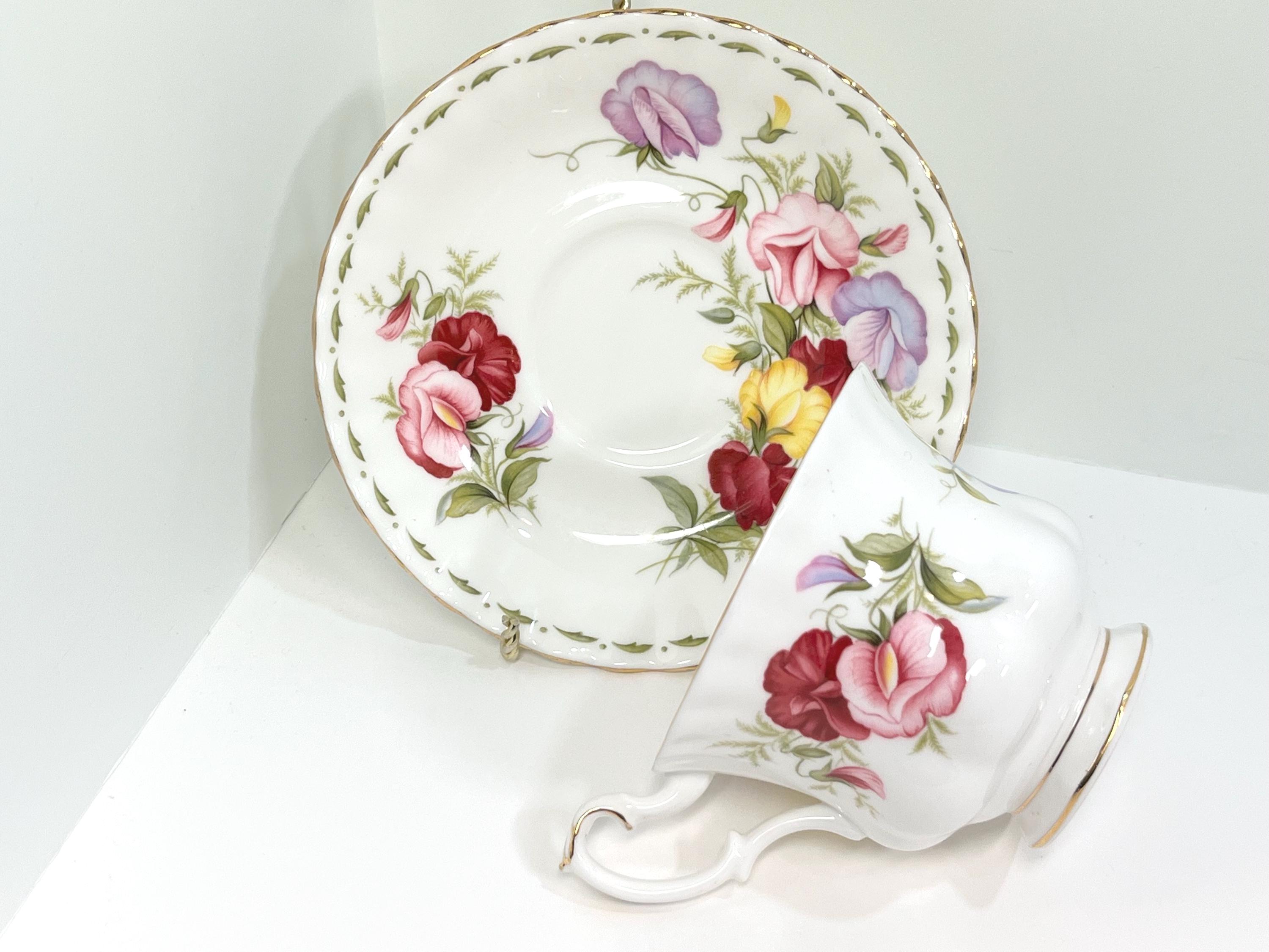 Colorful flowers cascade over the glossy white china on this birthday teacup for the month of April. They are, of course, the birth flower for April, sweet peas.