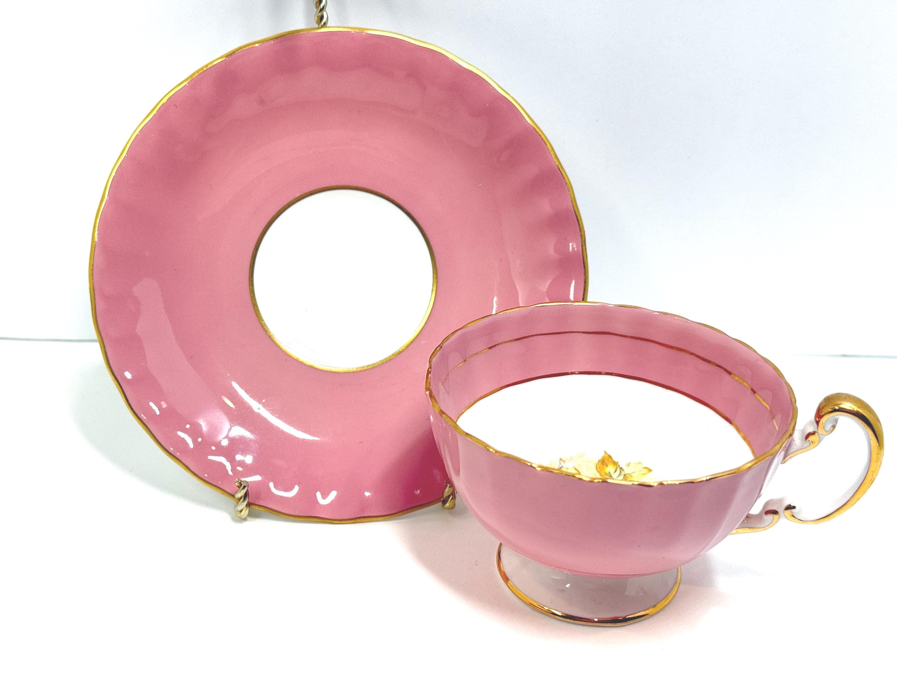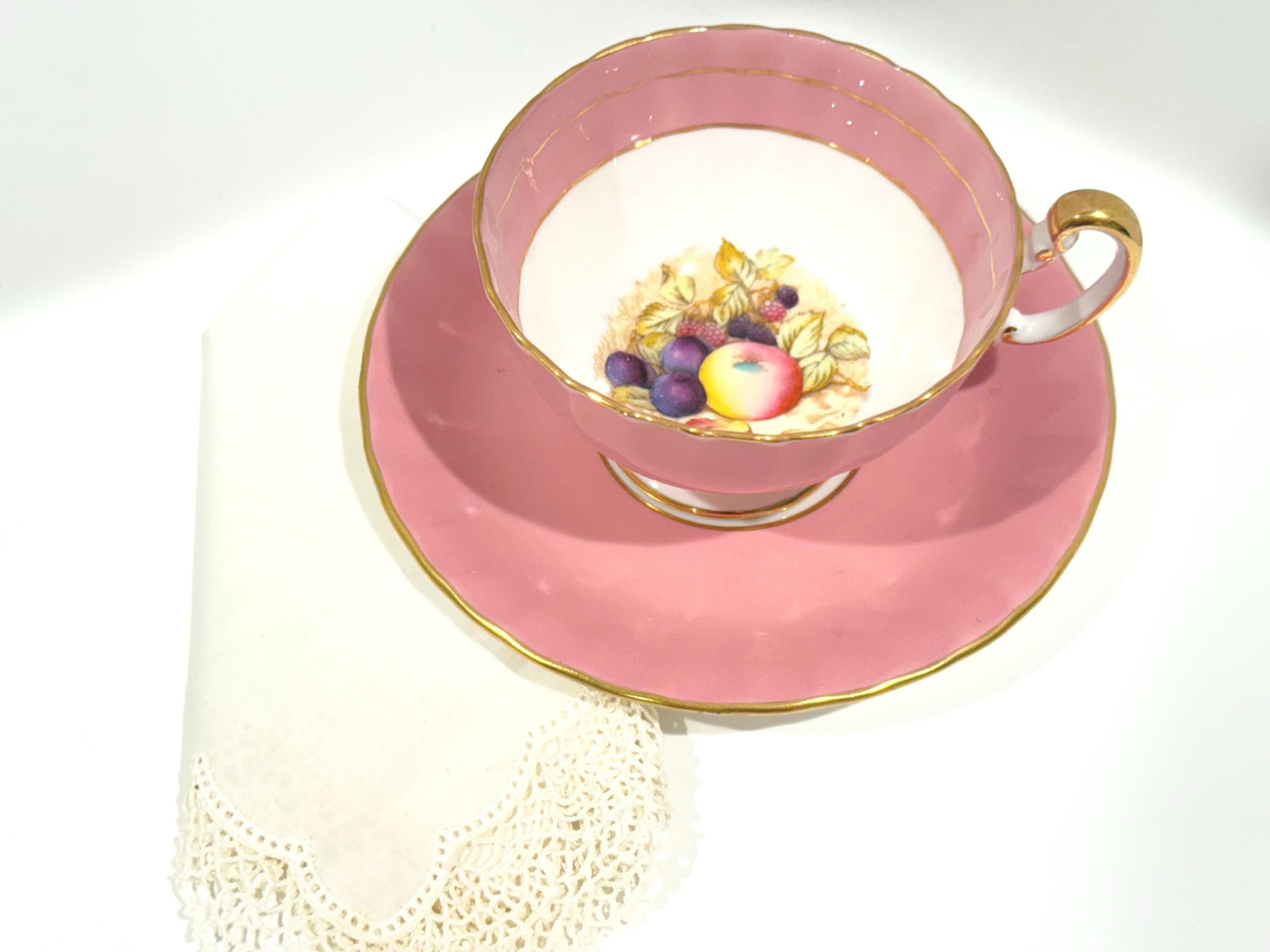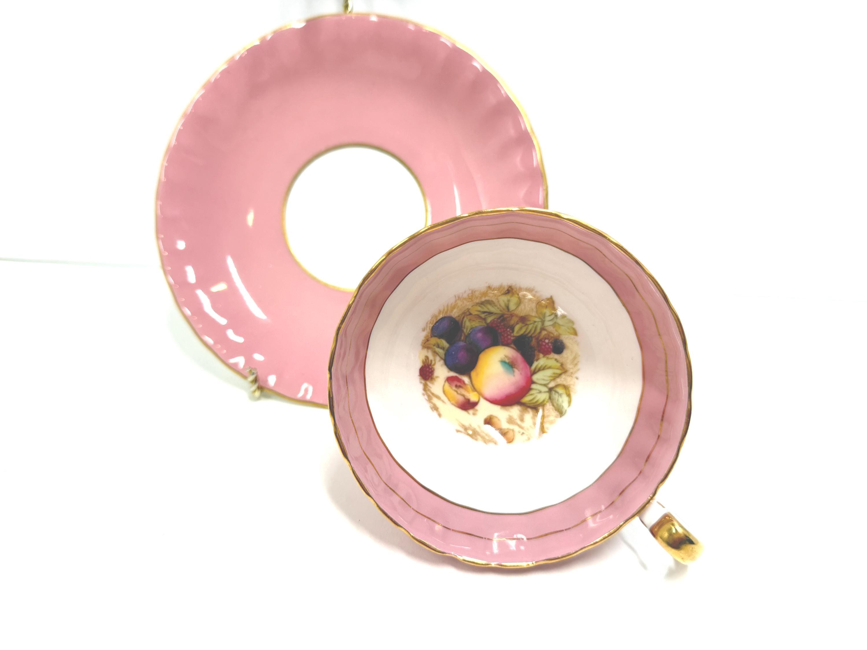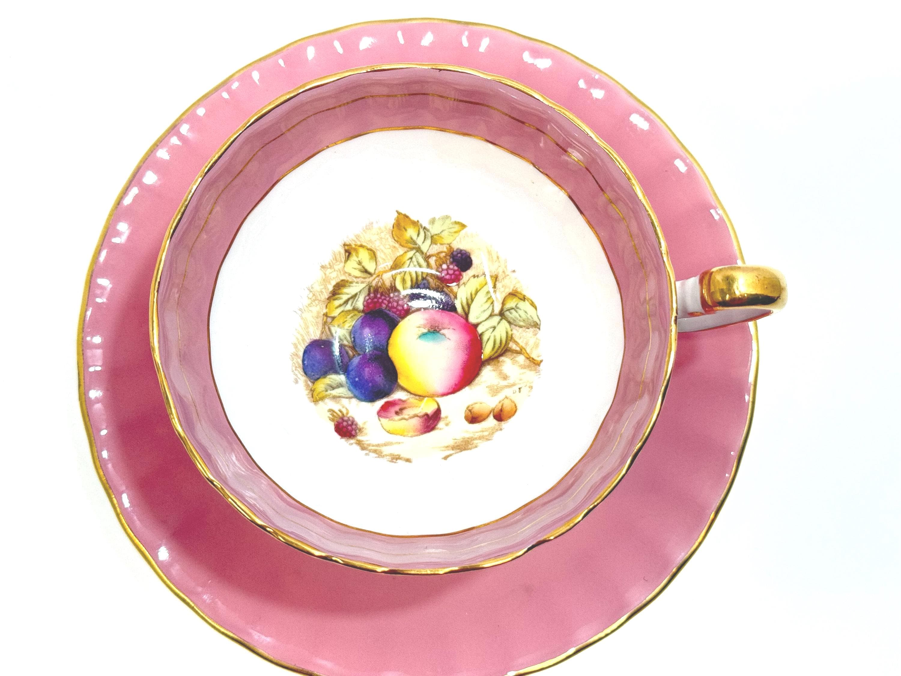 Aynsley Bone China of England is renowned for its intricate fruit designs. This stunning cornucopia of fruit, crafted by D. Jones, is hand-painted, though unsigned. The dusty pink cup with its vibrant interior and elegant gold trim adds a perfect touch.