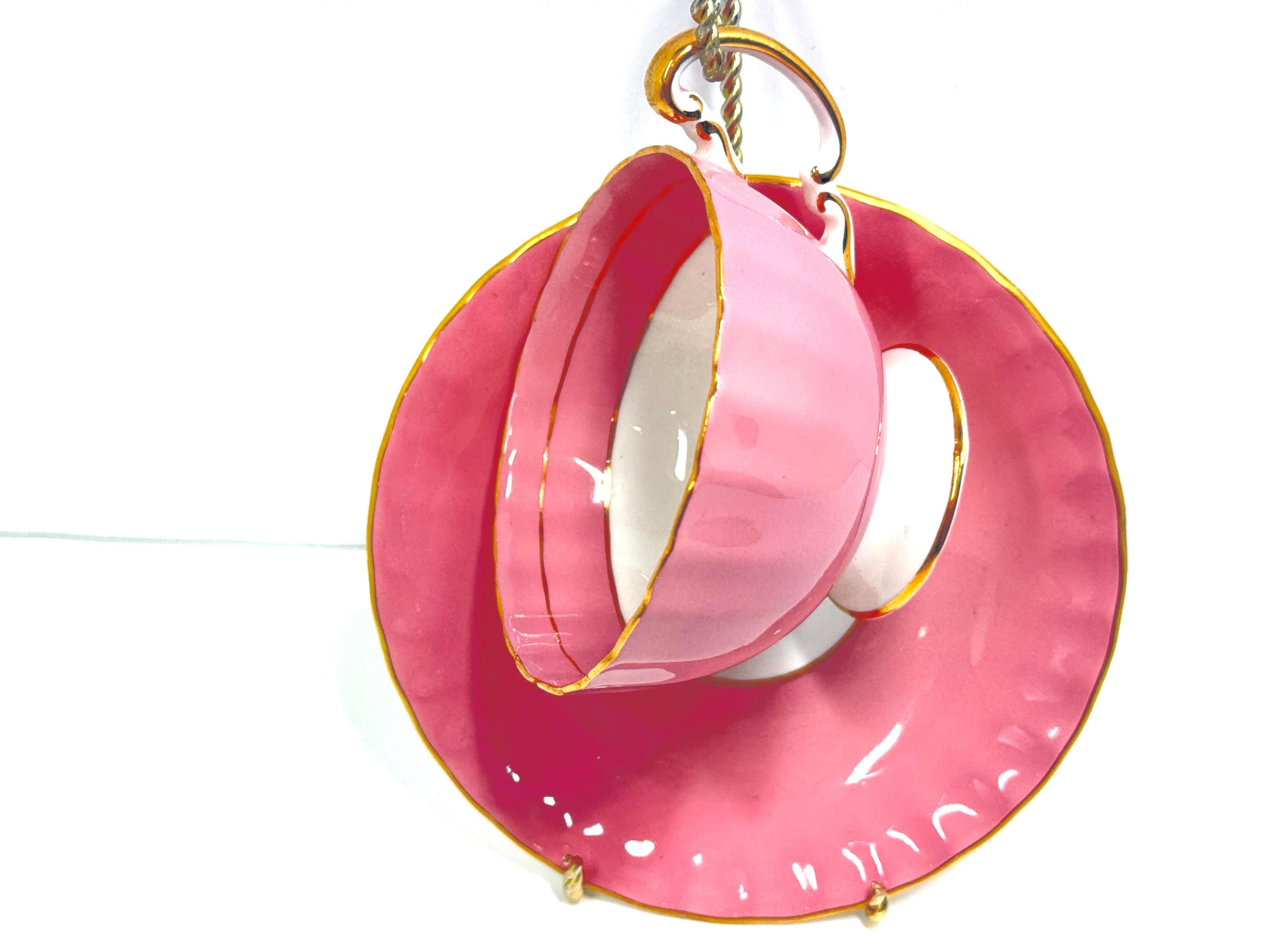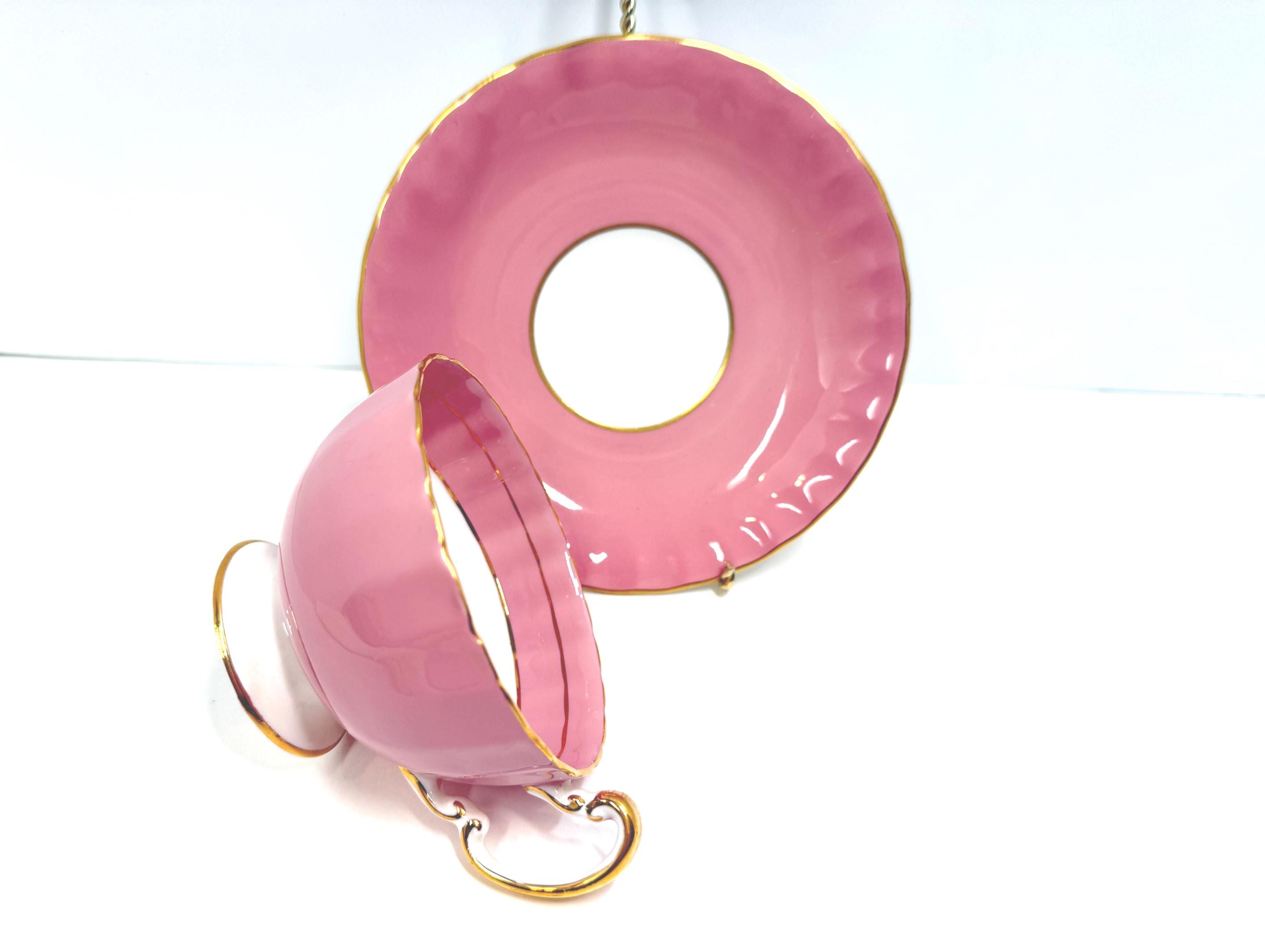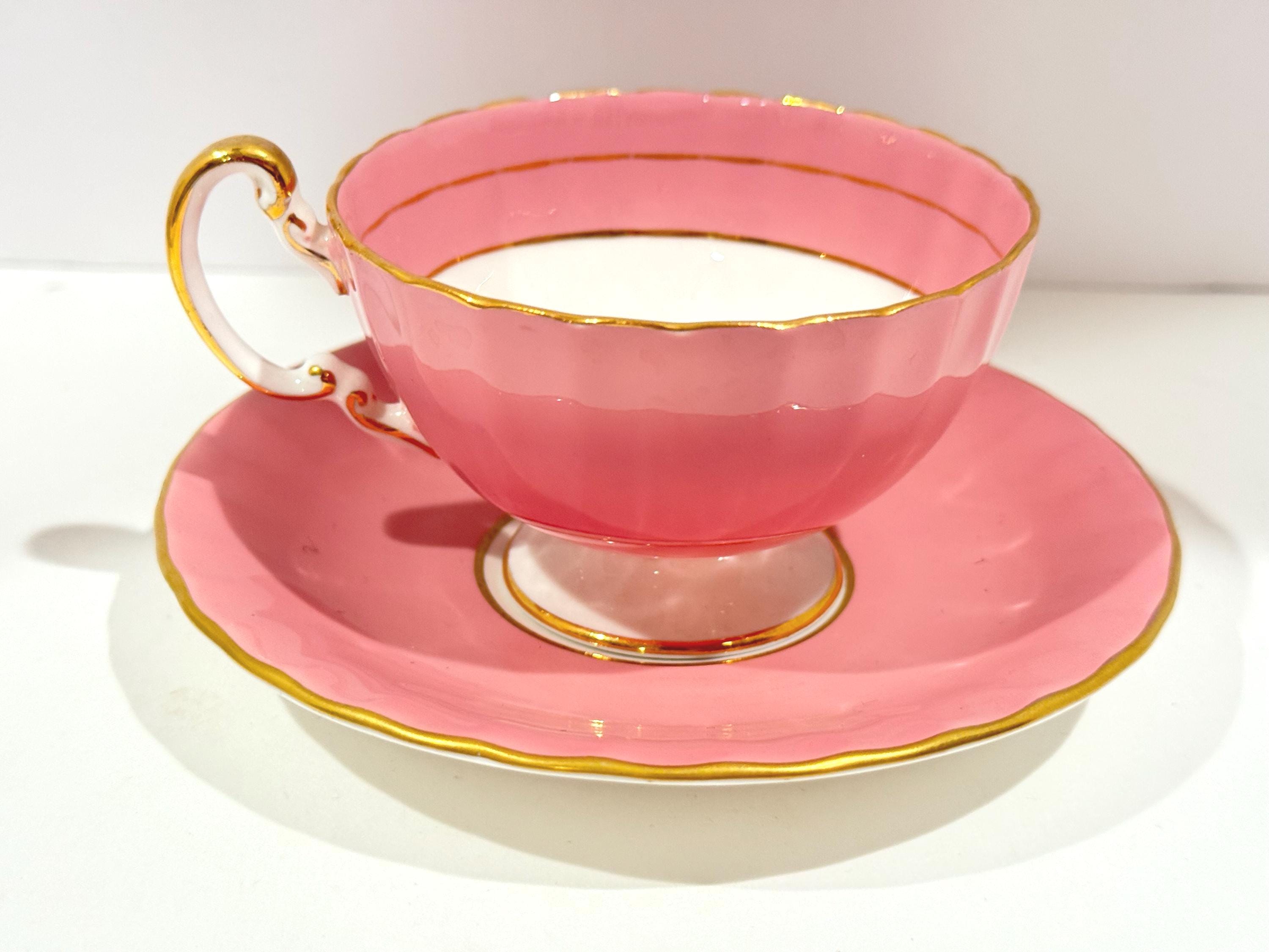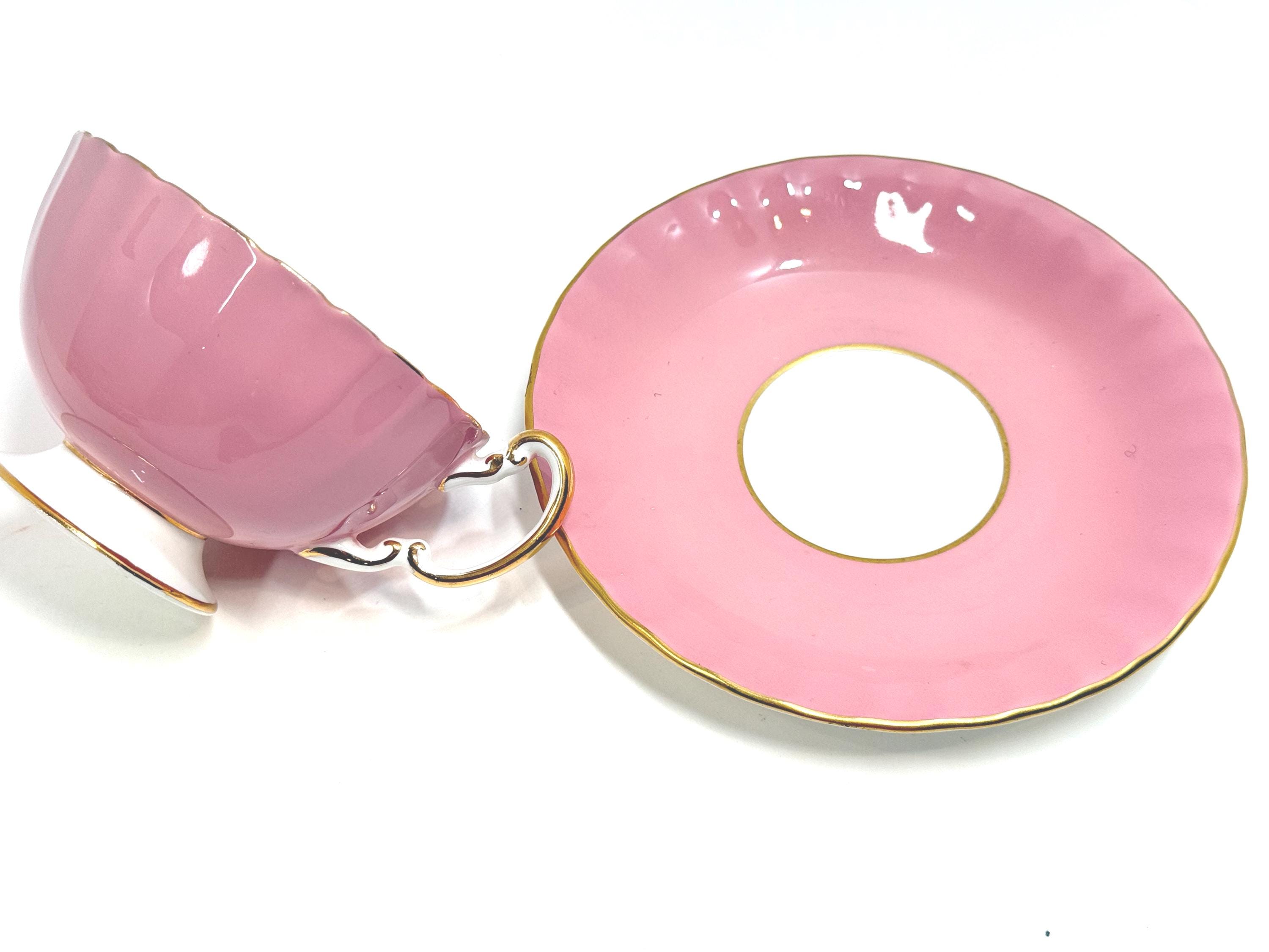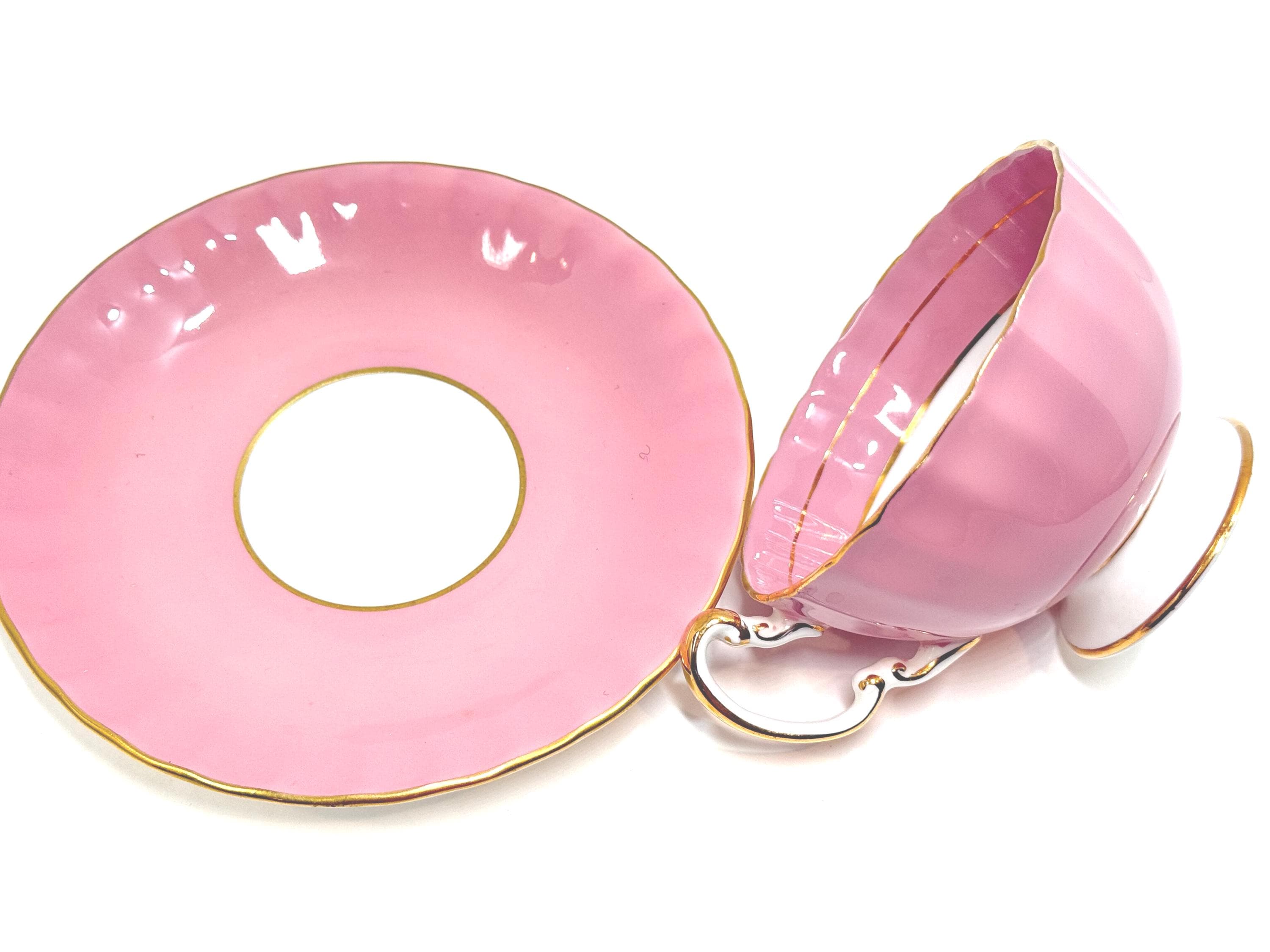 Aynsley Bone China of England is renowned for its intricate fruit designs. This stunning cornucopia of fruit, crafted by D. Jones, is hand-painted, though unsigned. The dusty pink cup with its vibrant interior and elegant gold trim adds a perfect touch.