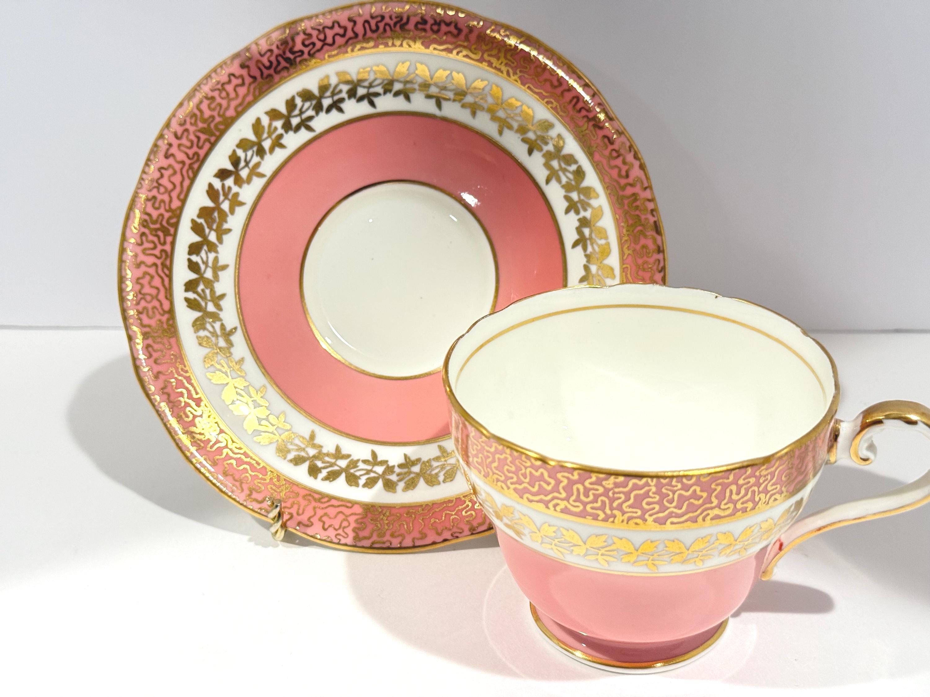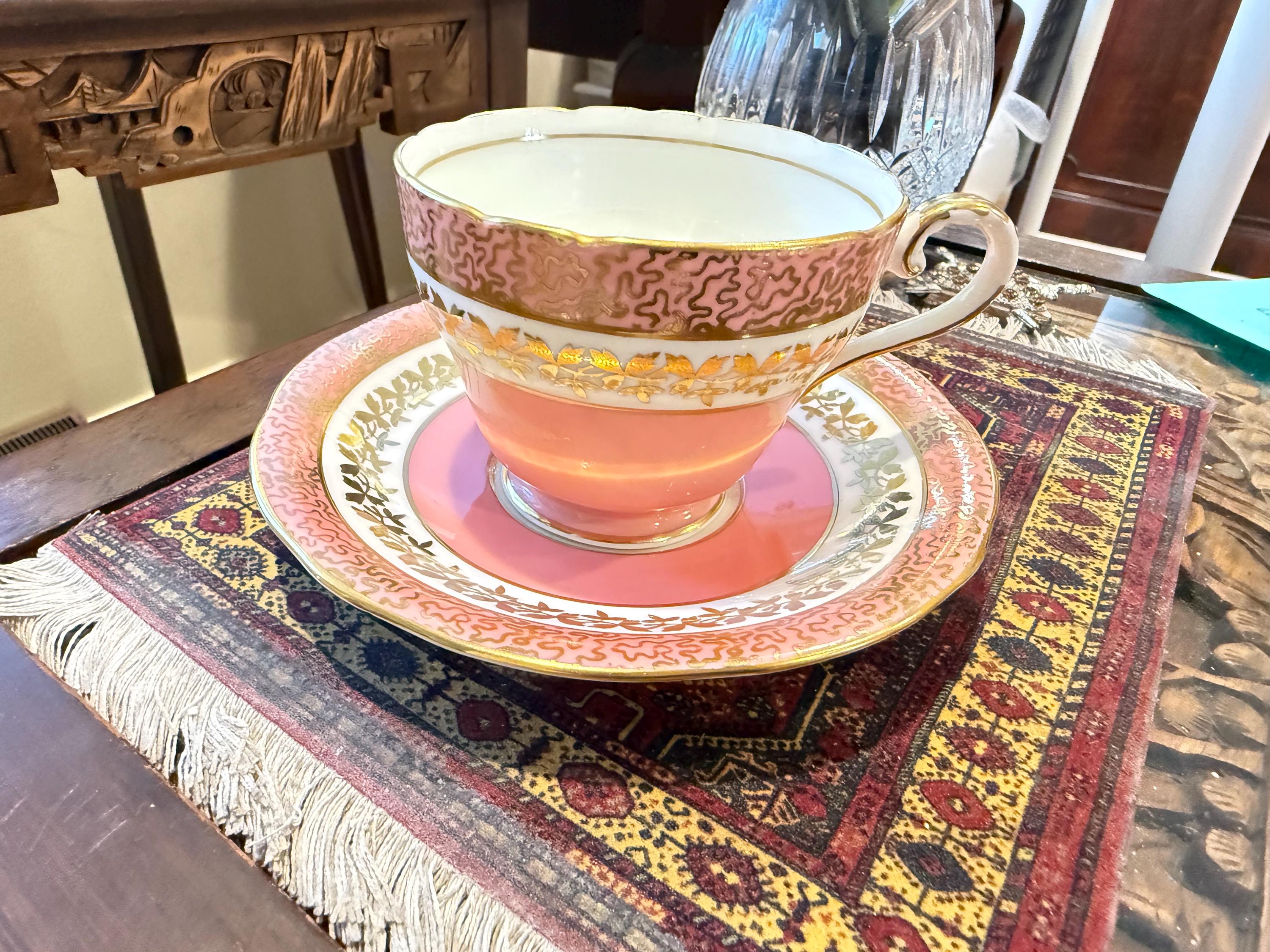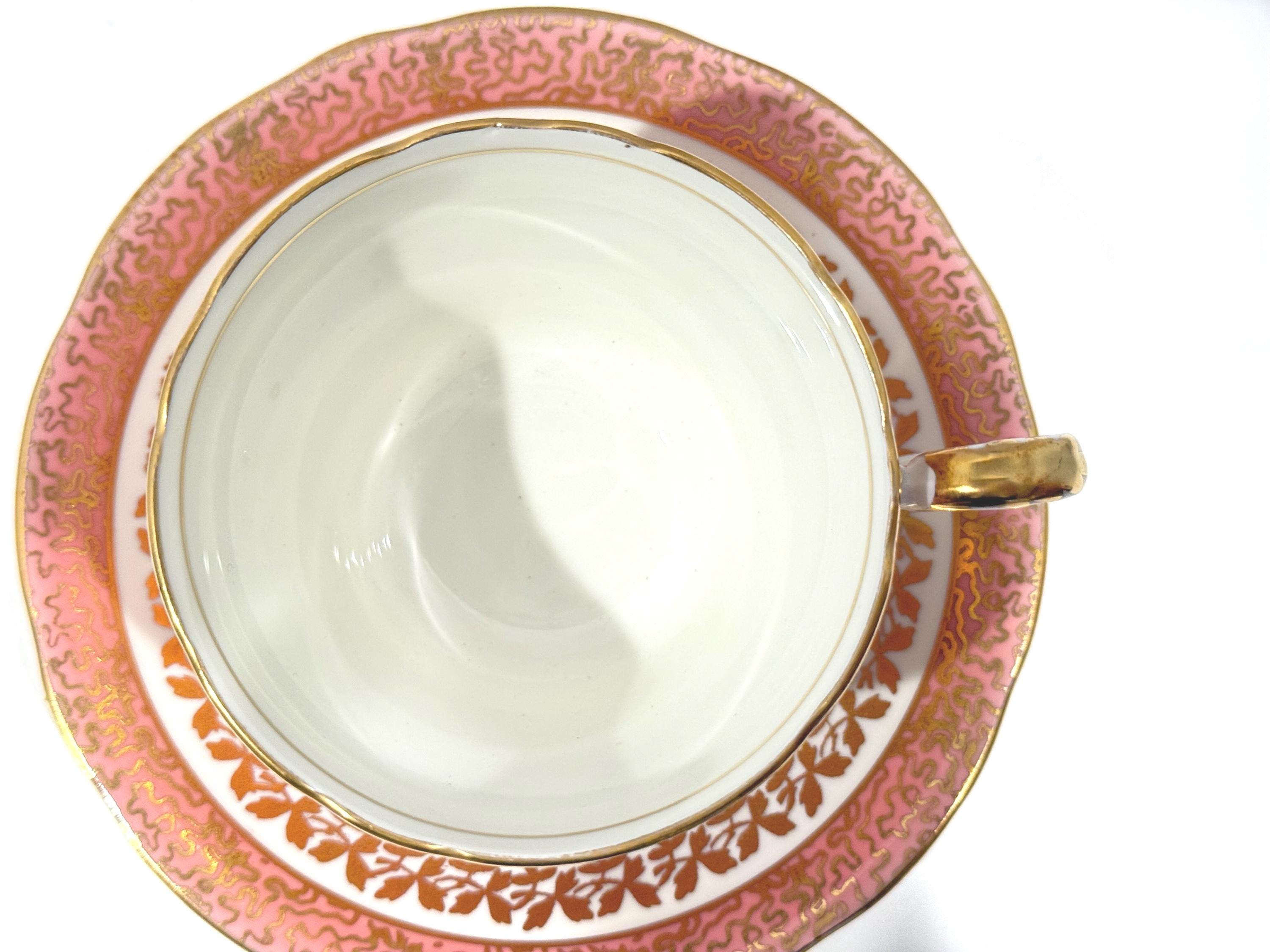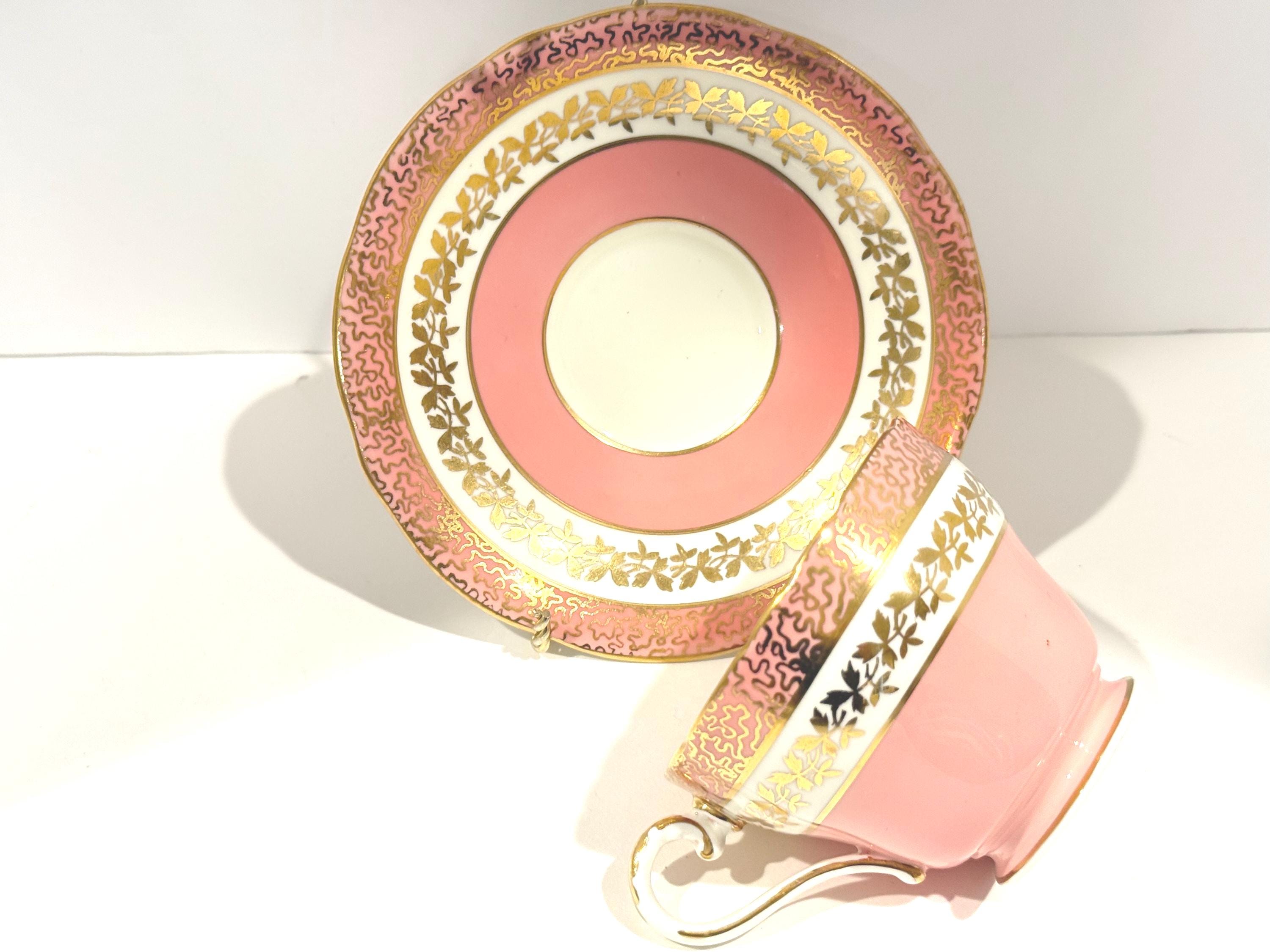 Measurements: The saucer is 5.5" in diameter. The cup is 3.25" from rim to rim and sits 2.5" high upon an elegant pedestal base. These pieces are definitely pink. There is no orange cast to them. We had some difficulty with the lighting and want to make it clear. The pictures without a white background are accurate colors.