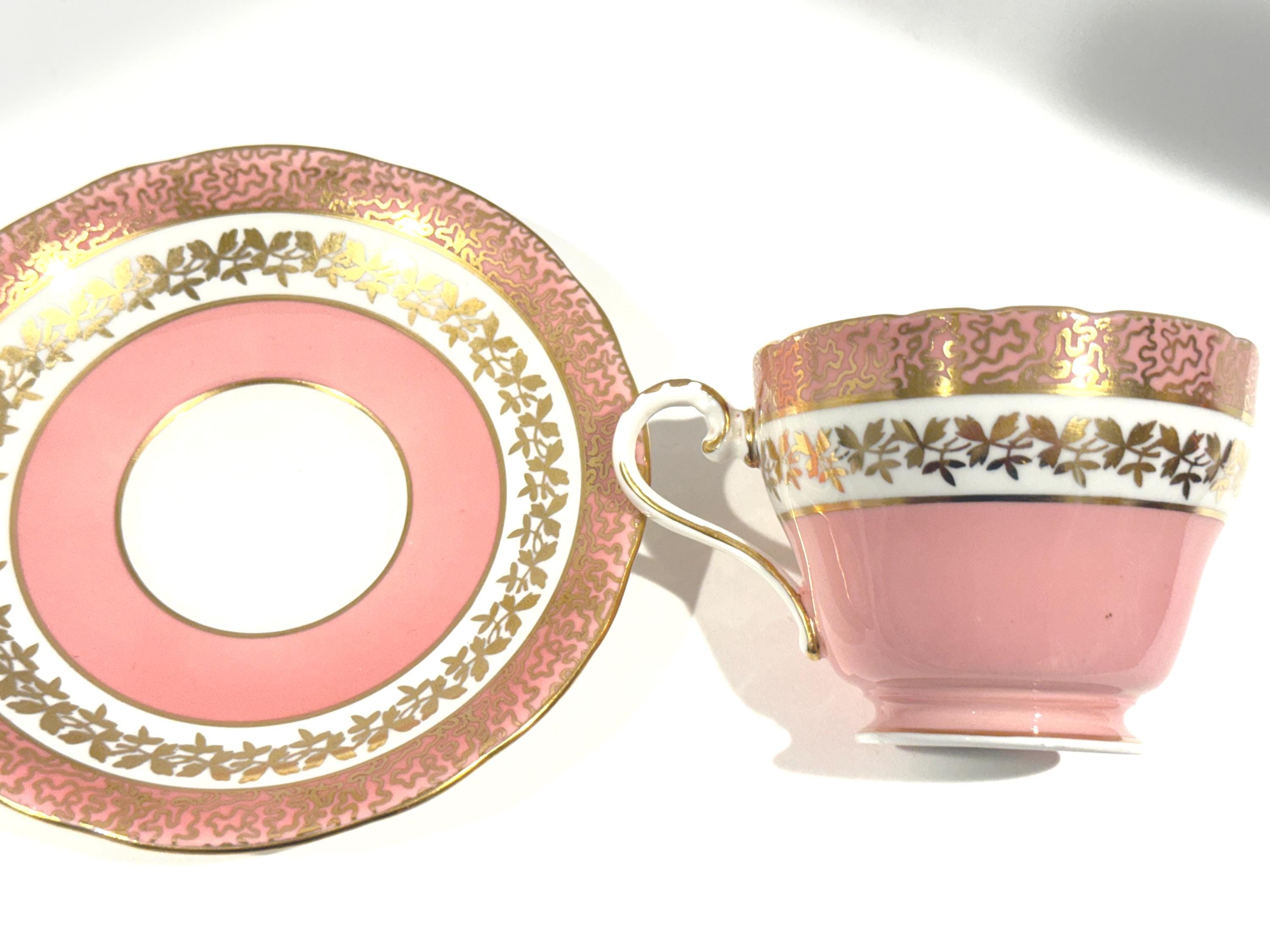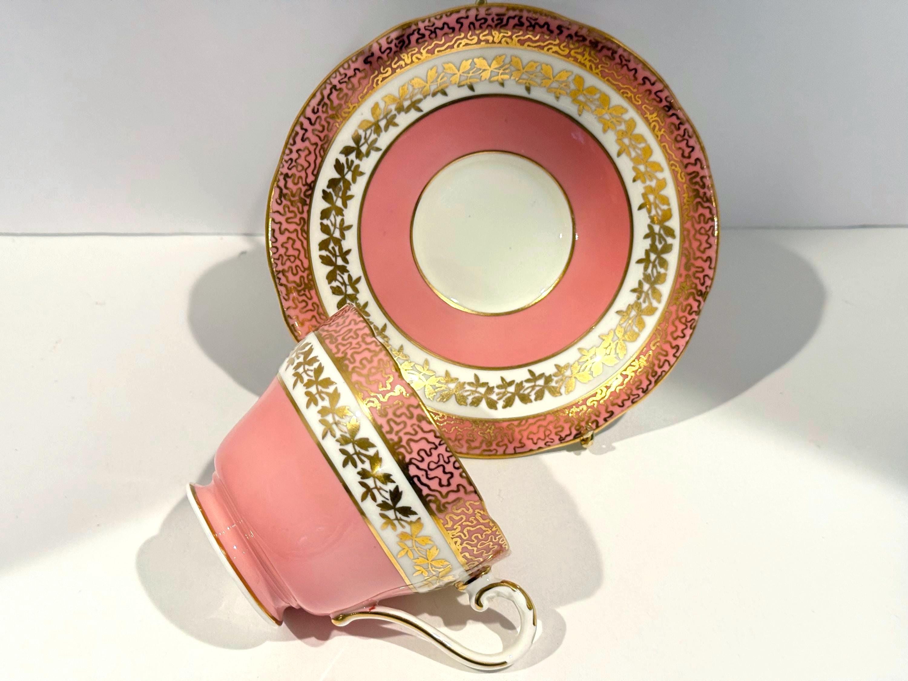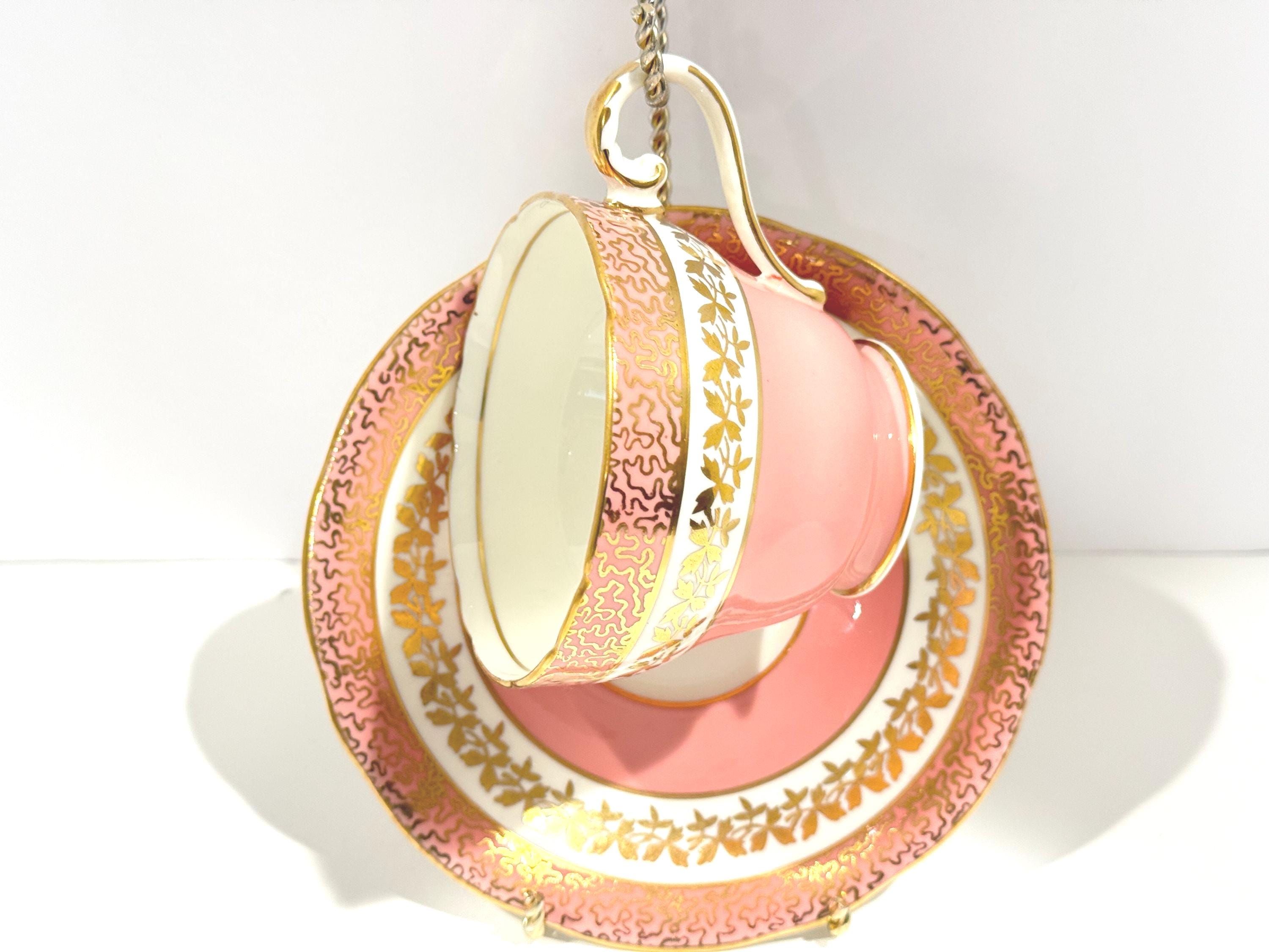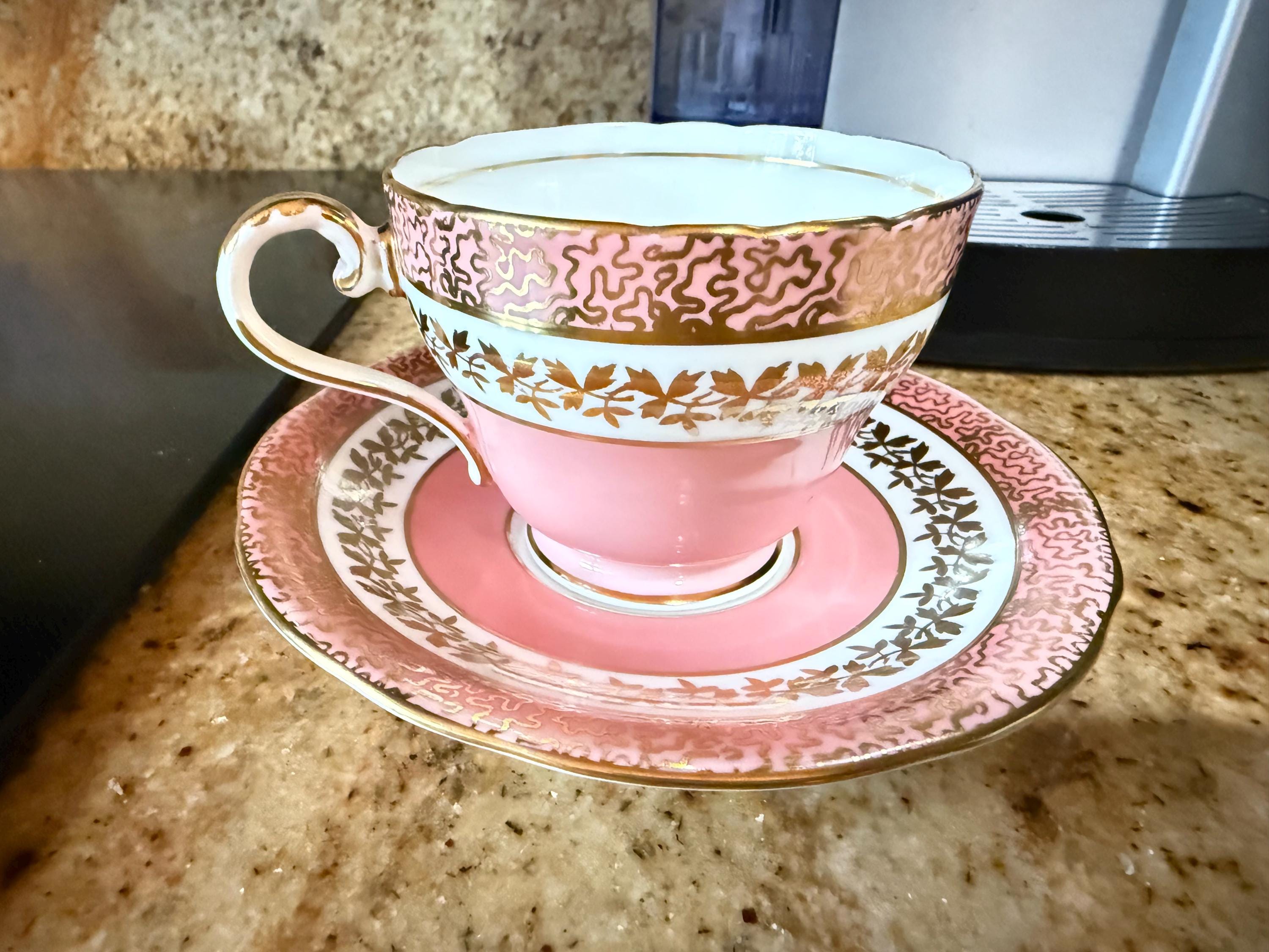 Measurements: The saucer is 5.5" in diameter. The cup is 3.25" from rim to rim and sits 2.5" high upon an elegant pedestal base. These pieces are definitely pink. There is no orange cast to them. We had some difficulty with the lighting and want to make it clear. The pictures without a white background are accurate colors.