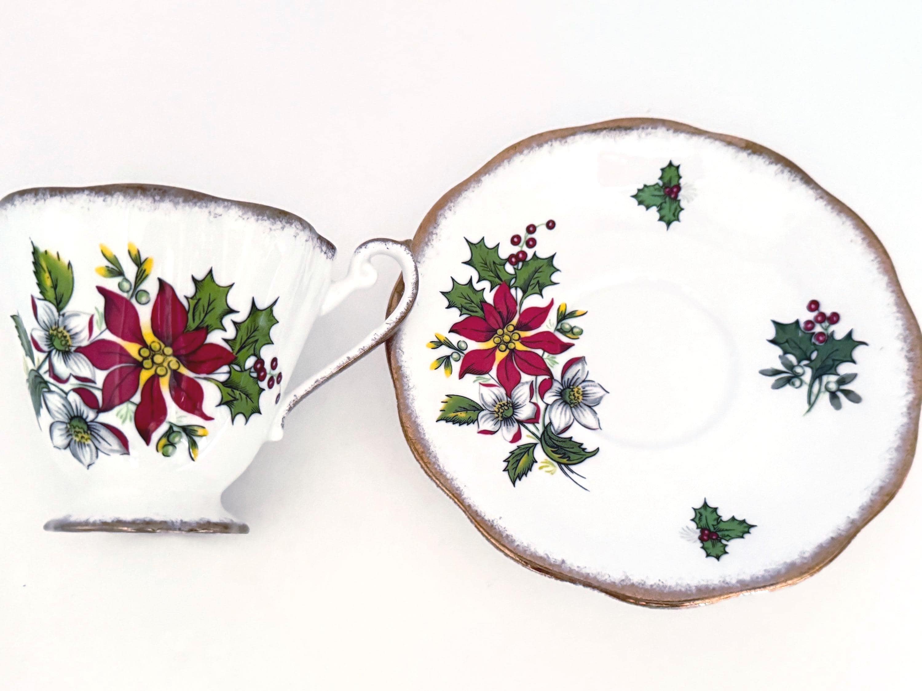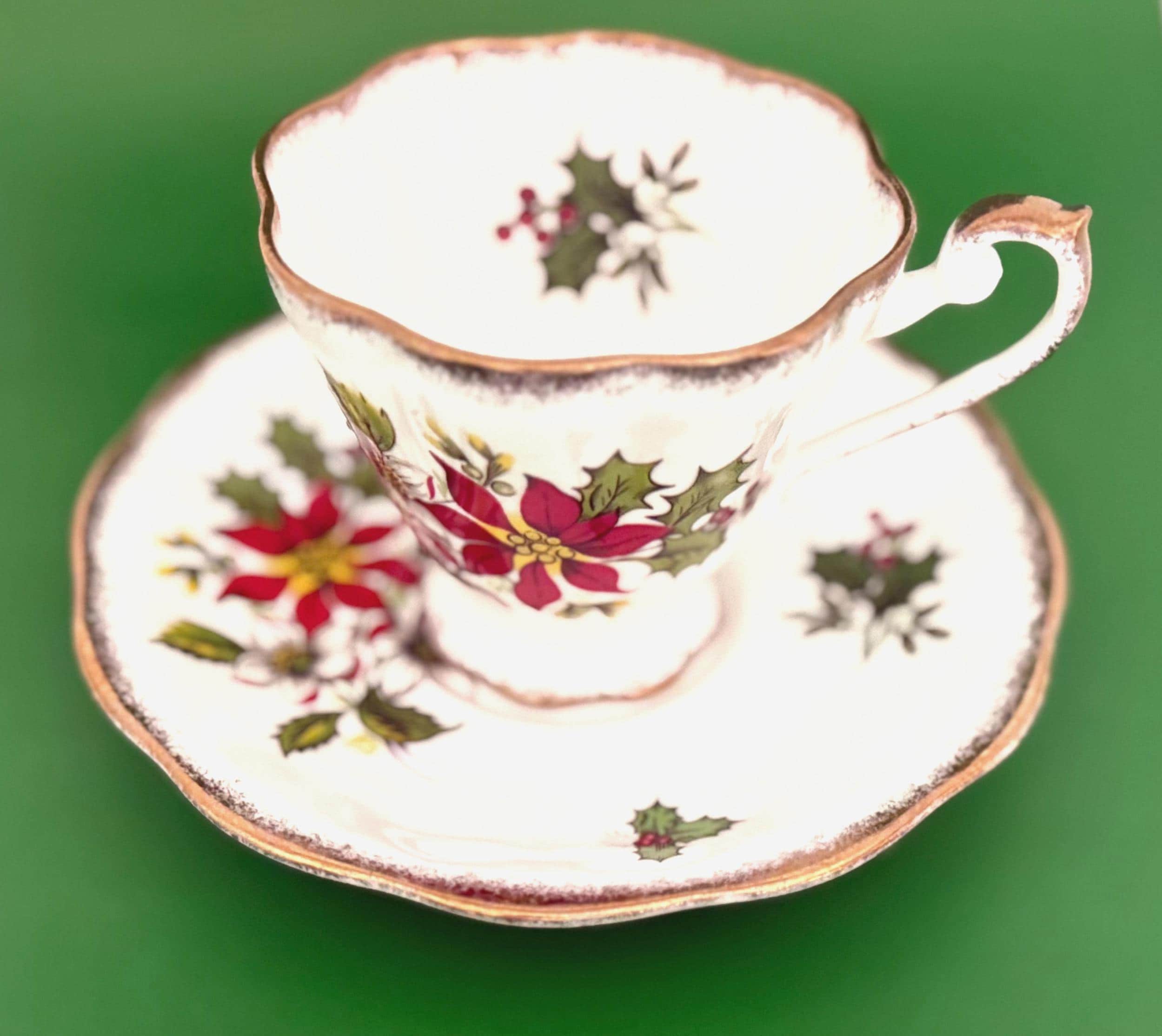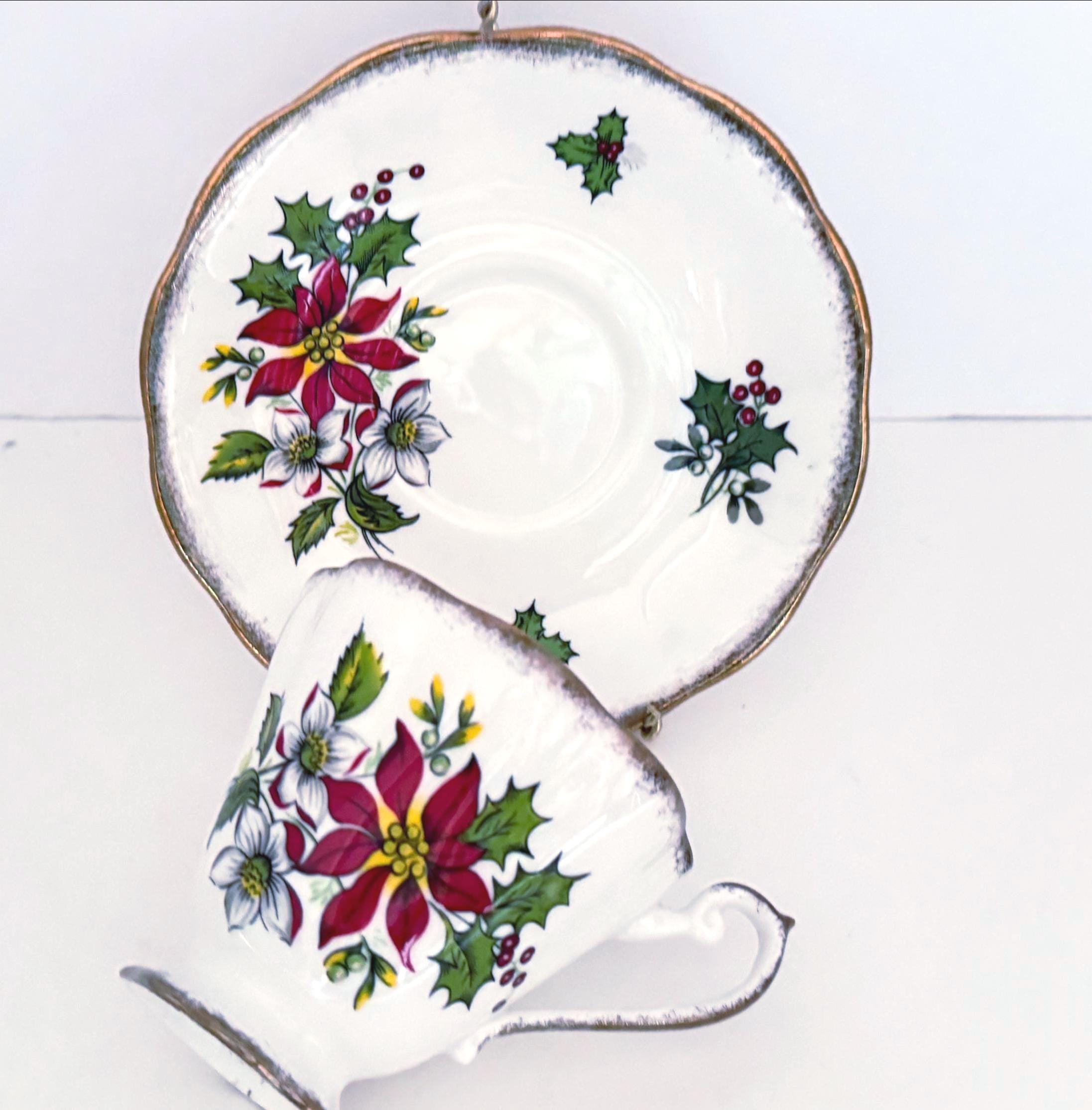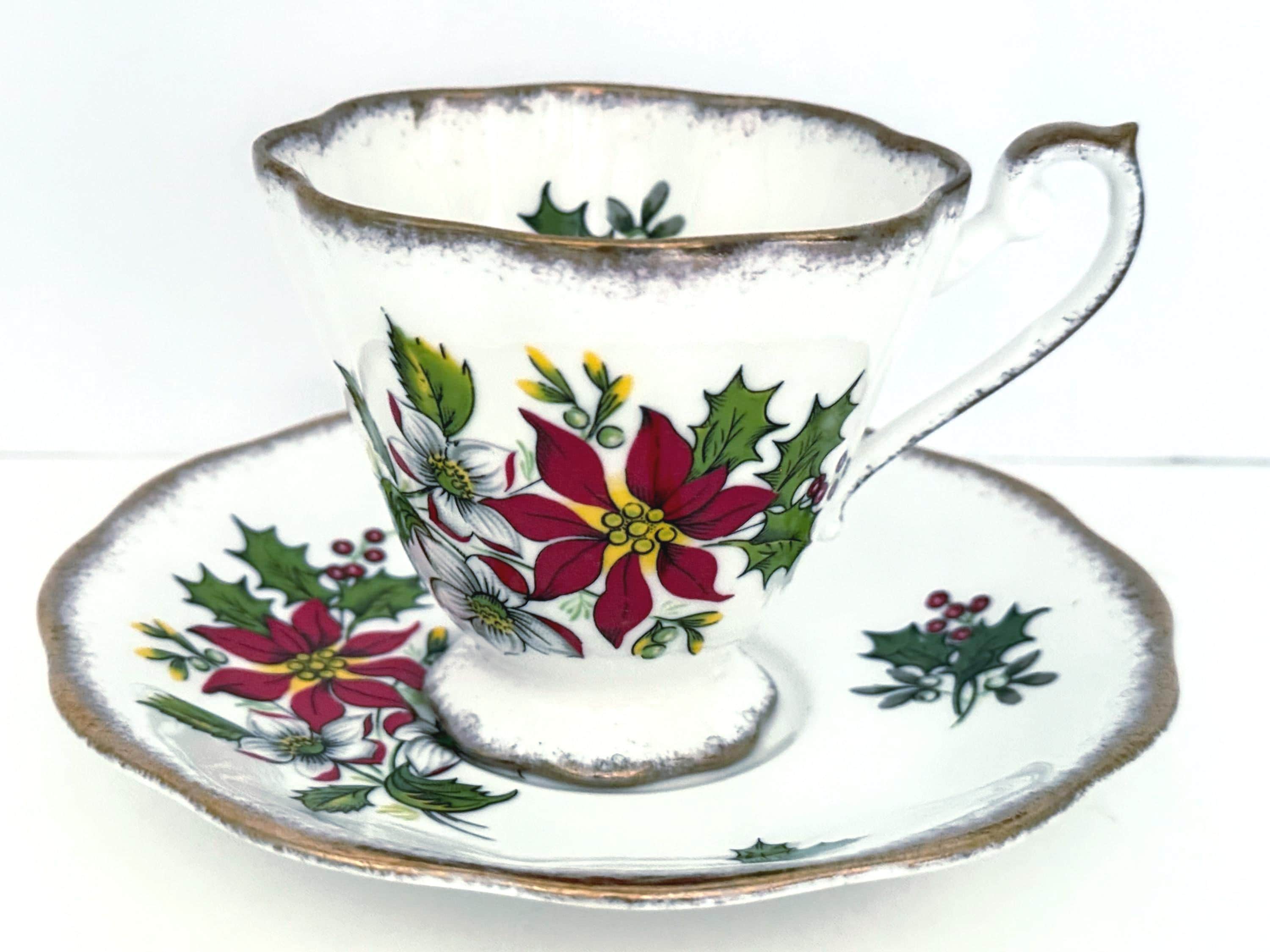 Royal Standard Fine Bone China of England crafted this beautiful teacup and saucer, featuring a large poinsettia symbolizing joy and hope. Giving one as a gift expresses wishes for happiness and success. Royal Standard, a division of Chapmans Longton Ltd, was established in 1916. This specific design, pattern number 2859, was made at the Albert Works in Longton, England, as part of the famous Staffordshire Potteries.
