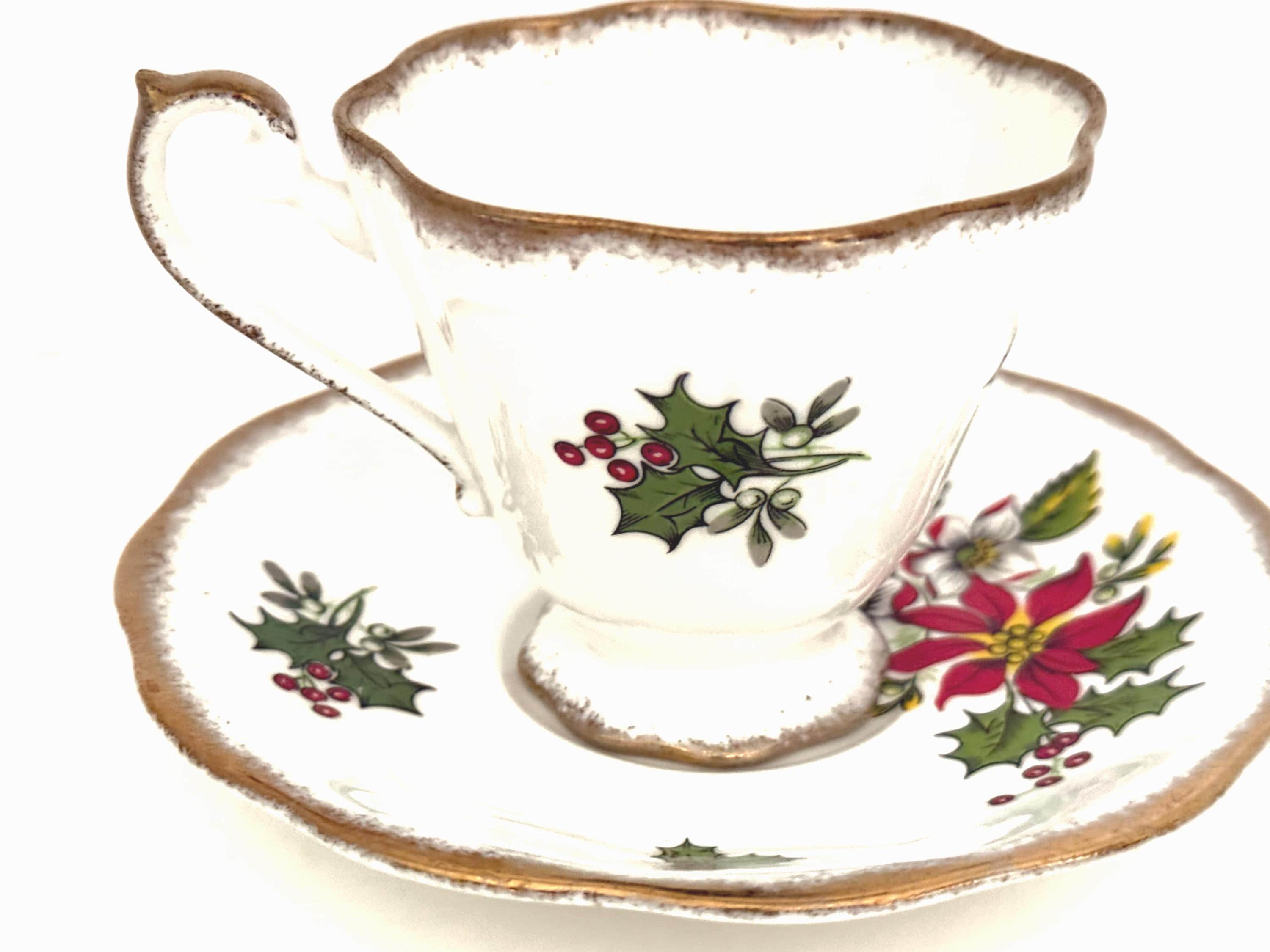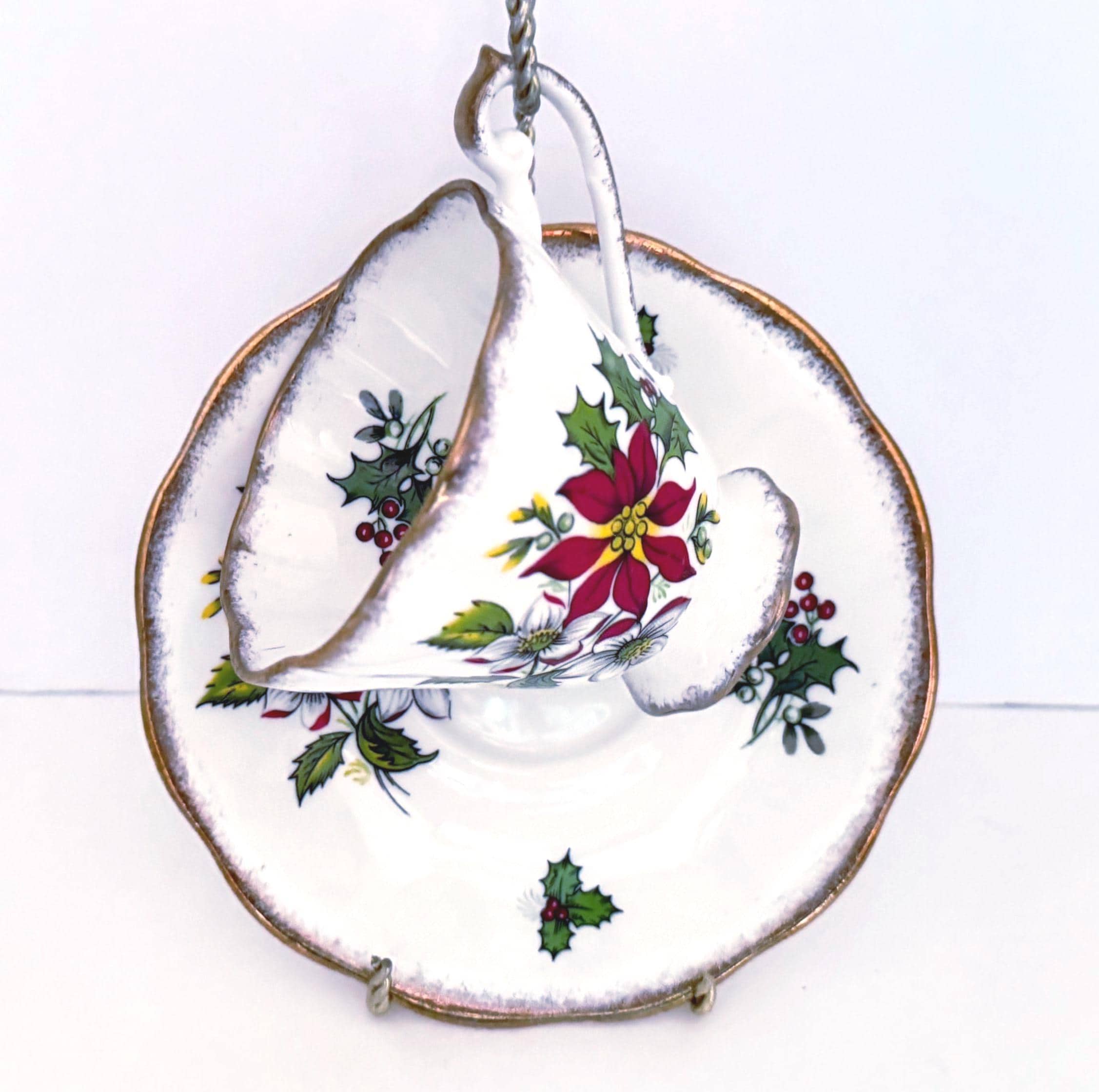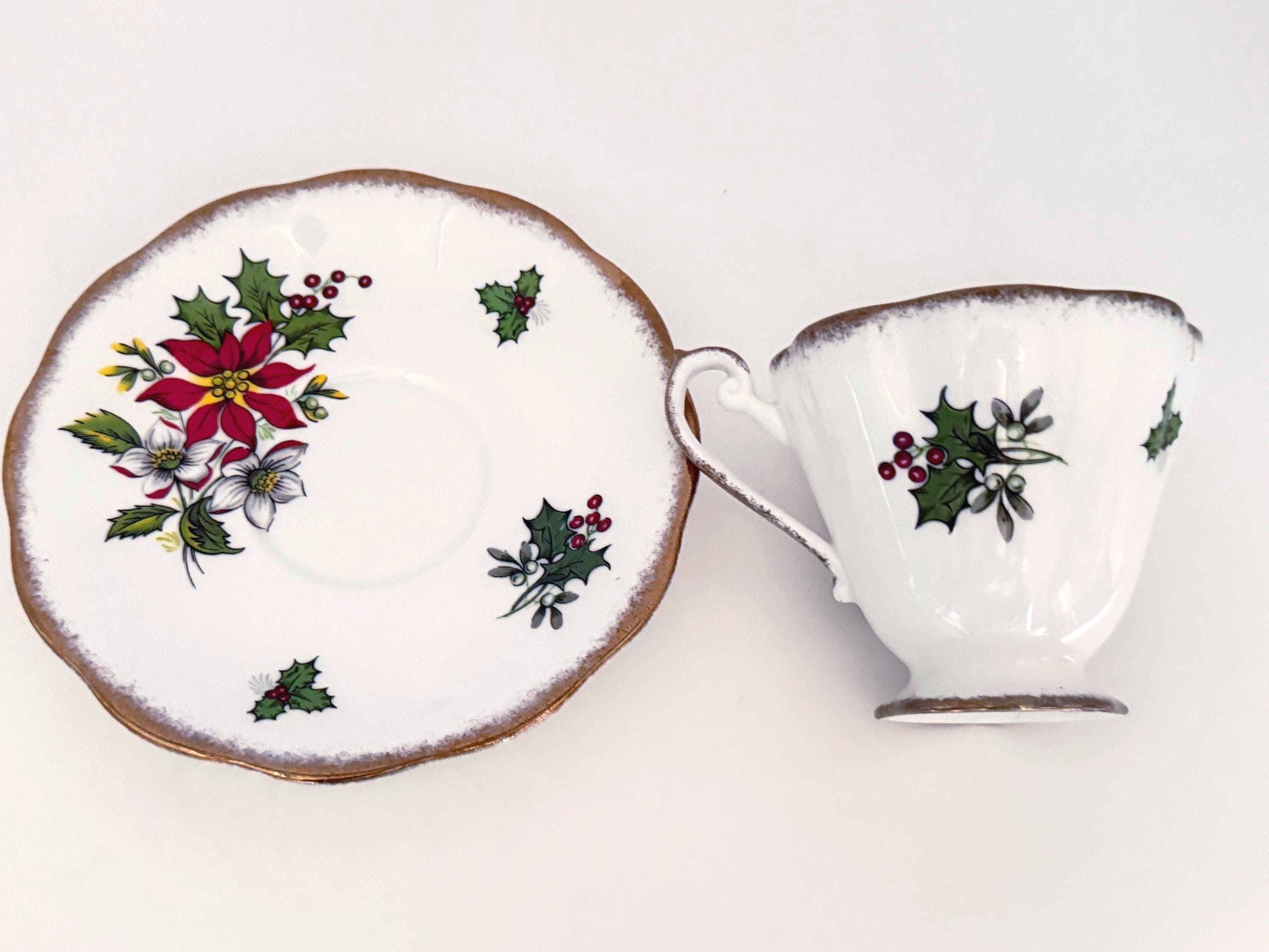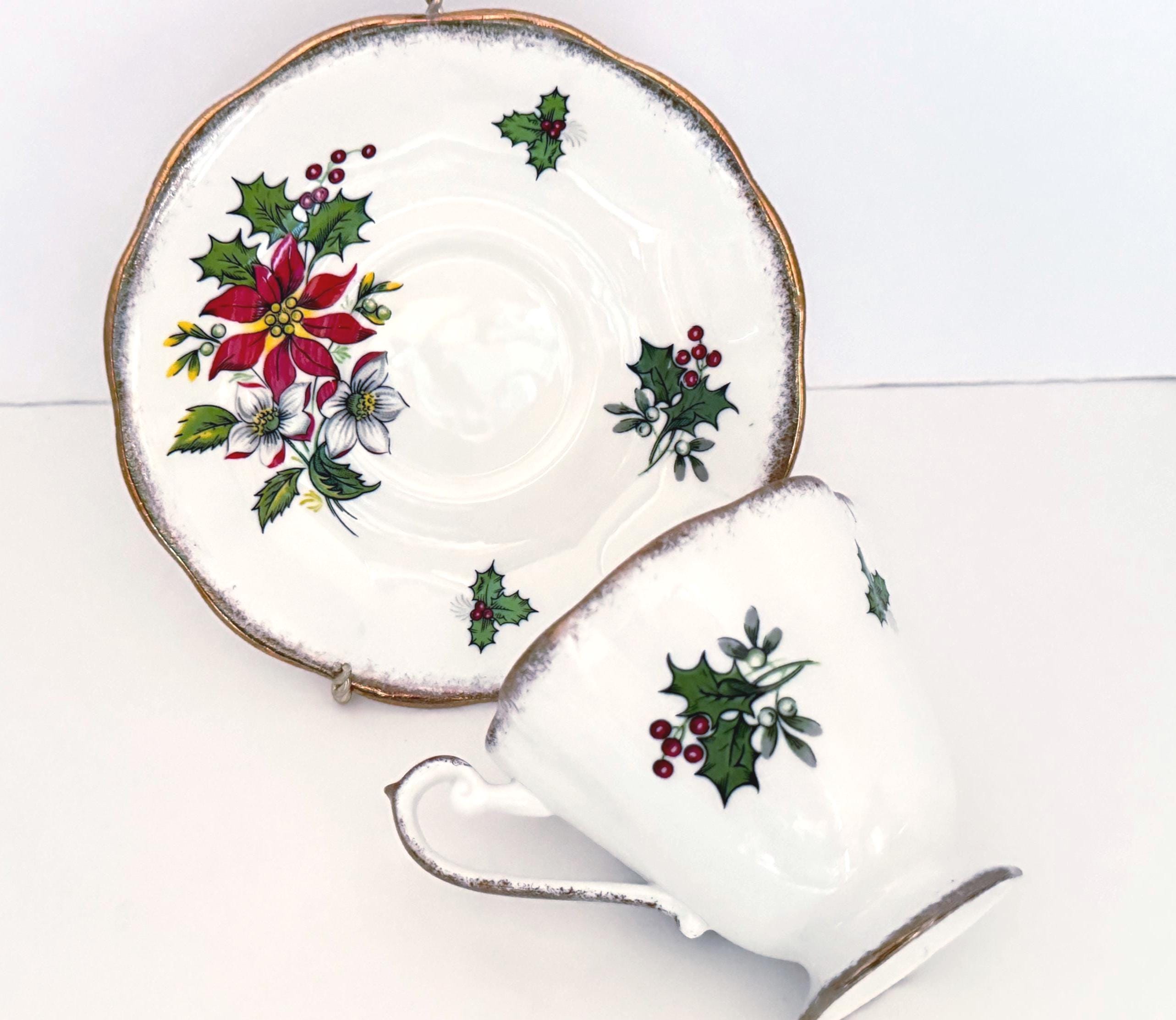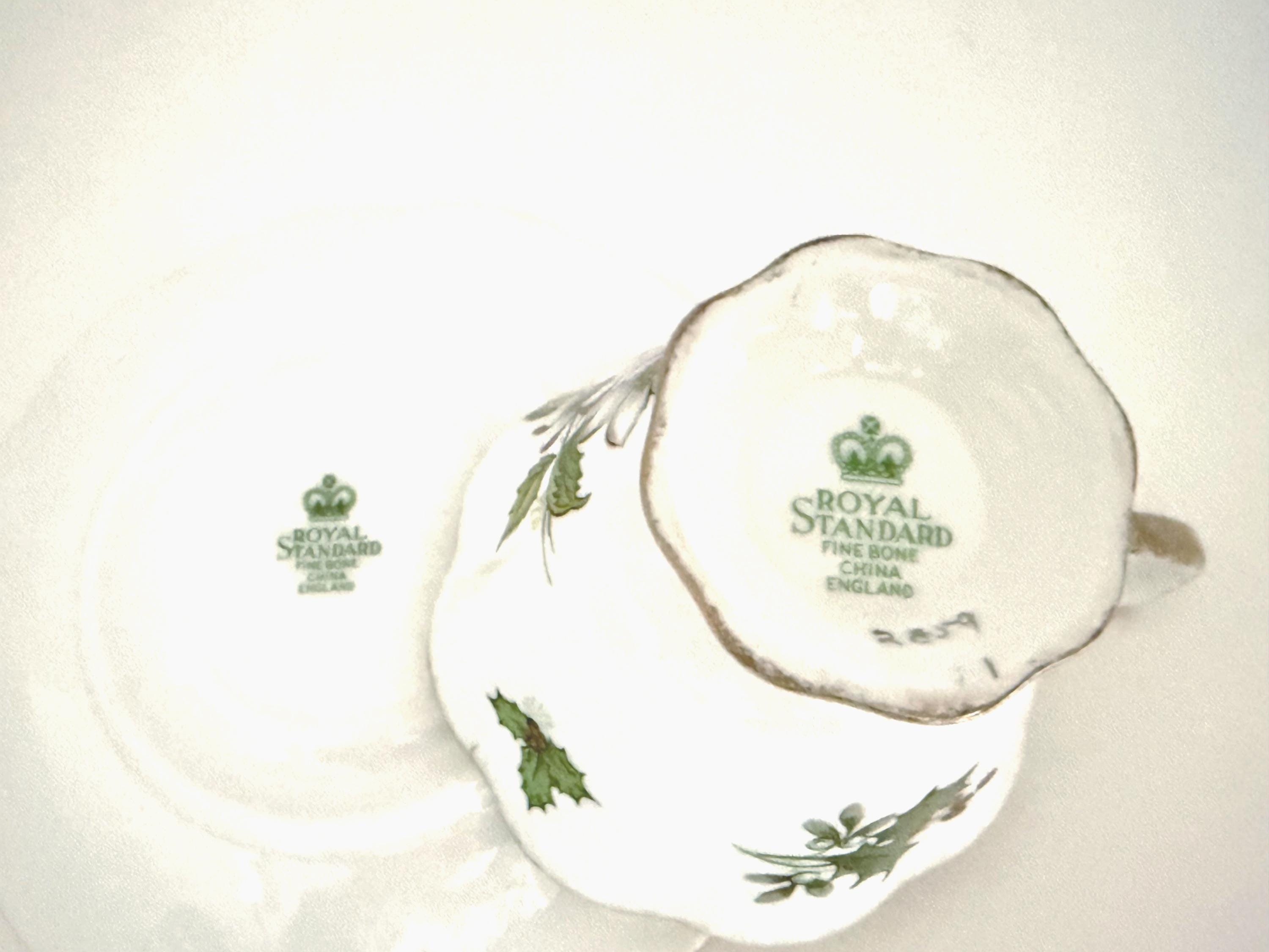 Royal Standard Fine Bone China of England crafted this beautiful teacup and saucer, featuring a large poinsettia symbolizing joy and hope. Giving one as a gift expresses wishes for happiness and success. Royal Standard, a division of Chapmans Longton Ltd, was established in 1916. This specific design, pattern number 2859, was made at the Albert Works in Longton, England, as part of the famous Staffordshire Potteries.