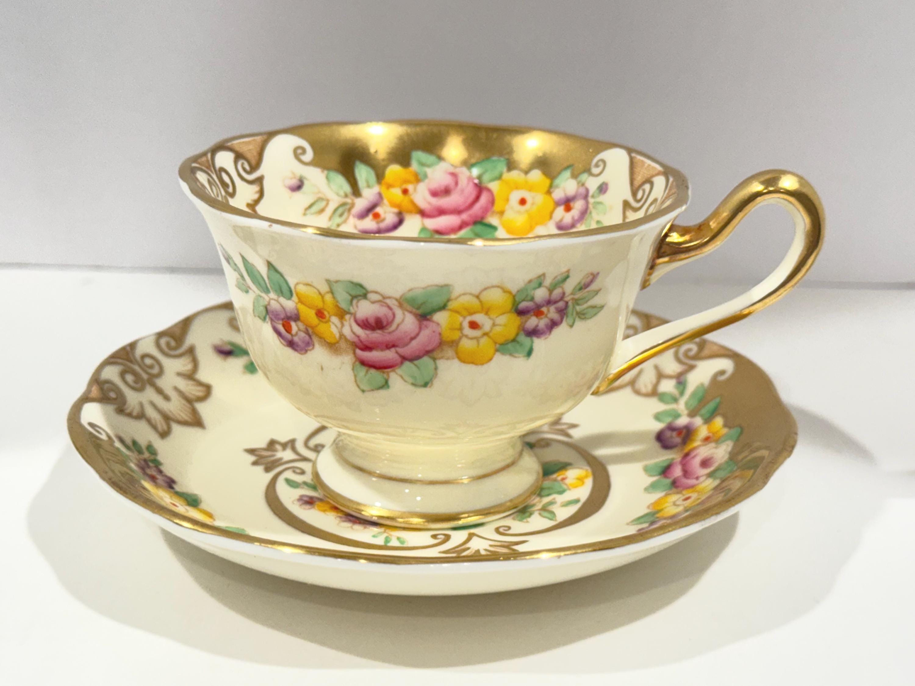 Royal Albert of England designed this teacup and saucer with a pedestal-based cup, heavy gold accents, and delicate scalloped edges. The elegant curves are beautifully complemented by the gold handle. This style is known as the Avon shape and was created in the early 1950s. Royal Albert was the premium brand of the Thomas C. Wild and Sons company, based at St. Mary's Works in Longton, England, producing exquisite bone china since 1917.