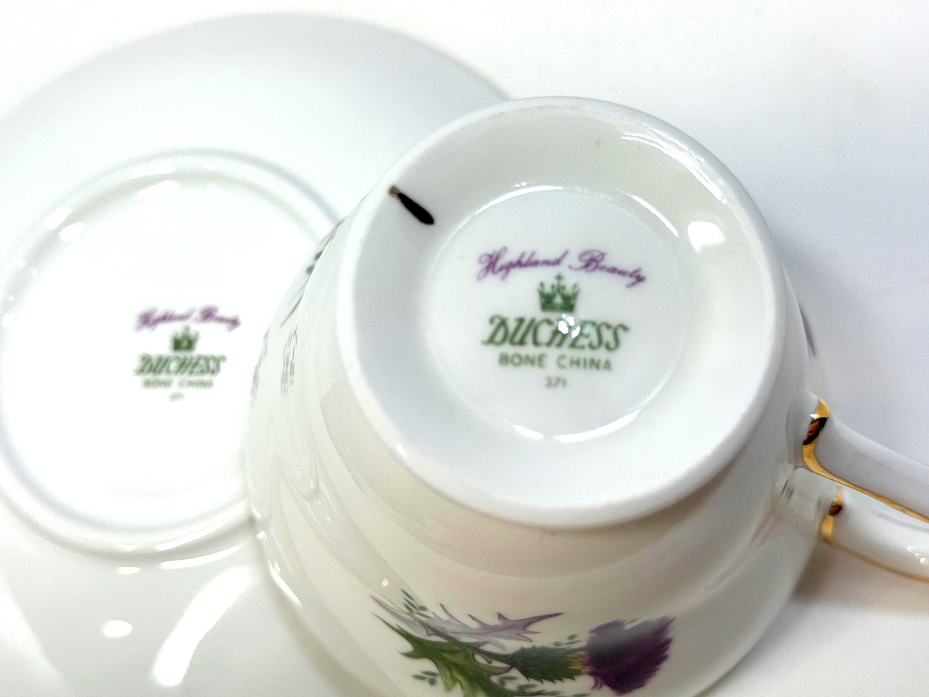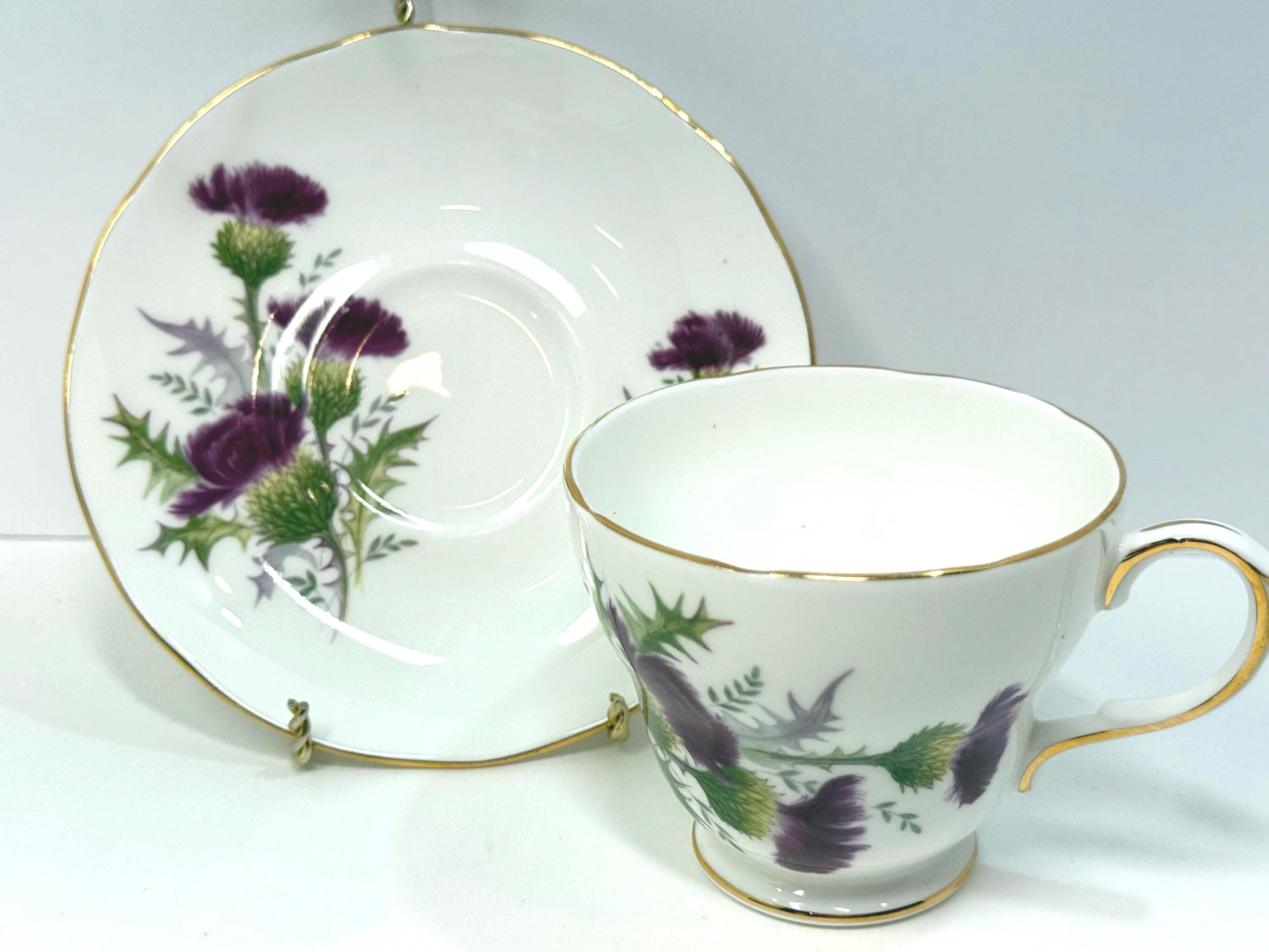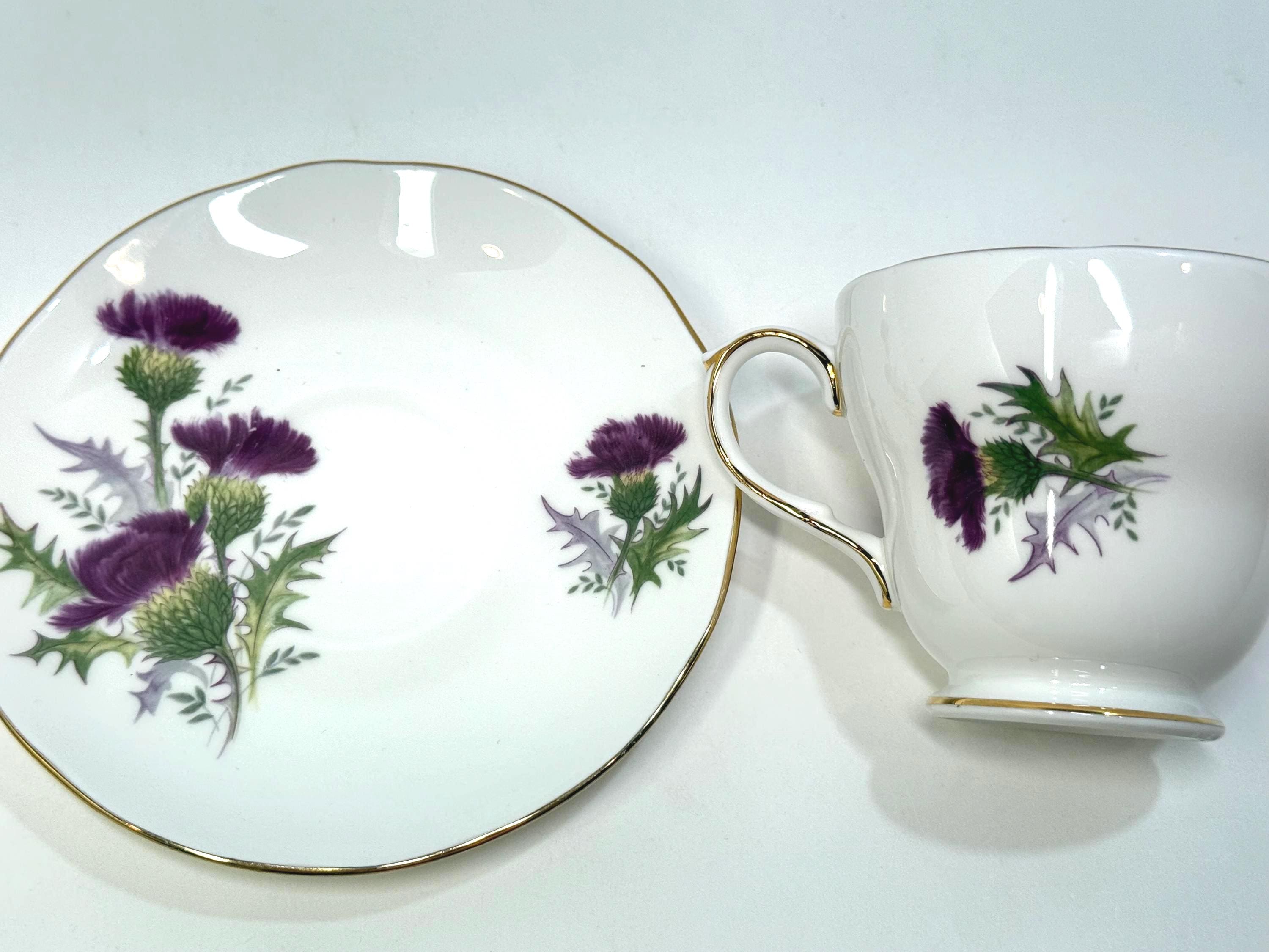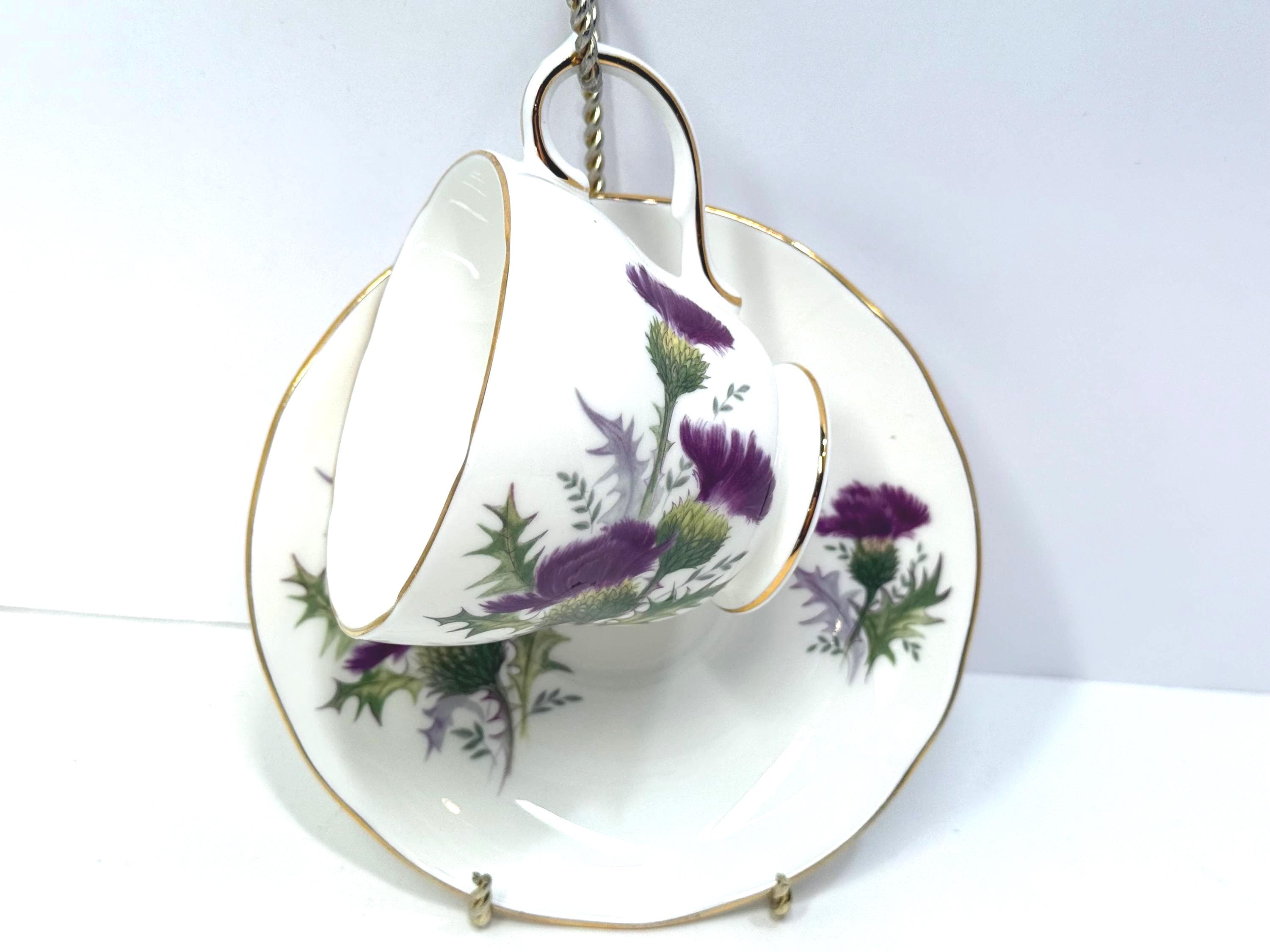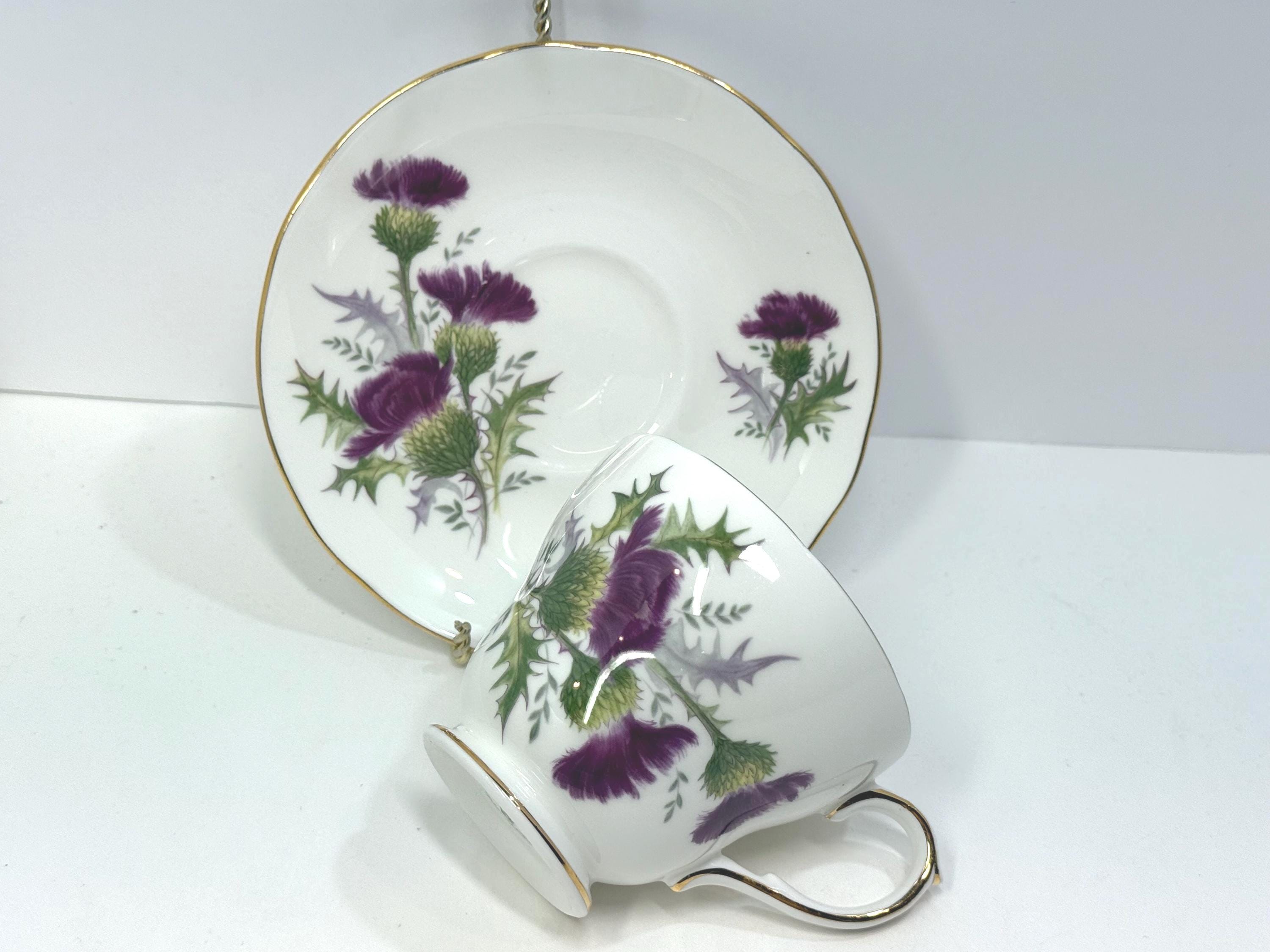 Shimmering royal purple thistles stand out beautifully against a tall, glossy white teacup and saucer. This fresh, vibrant design, called Highland Beauty, comes from Duchess Bone China of England. It’s a charming way to honor Scotland’s national flower as you sip your tea.