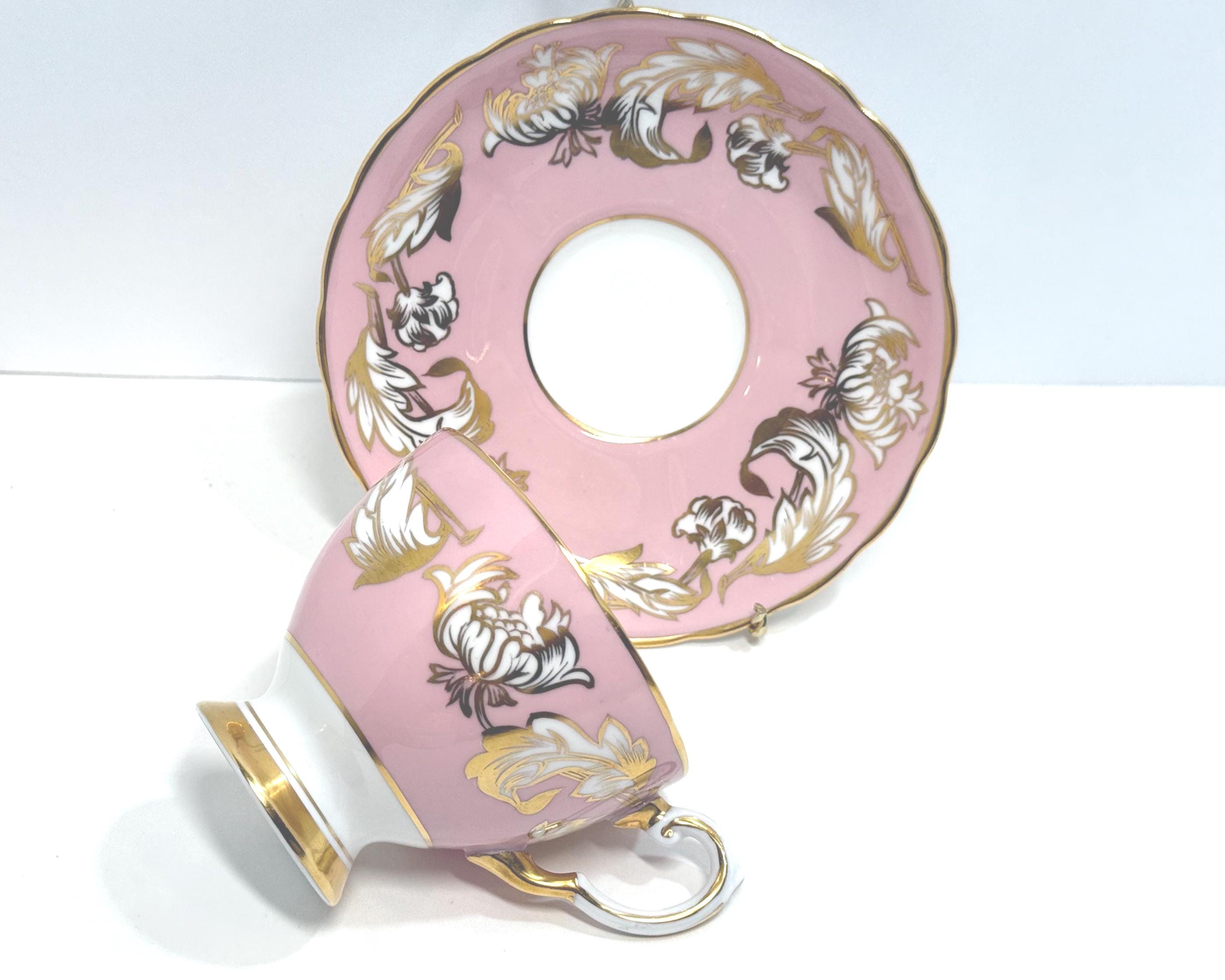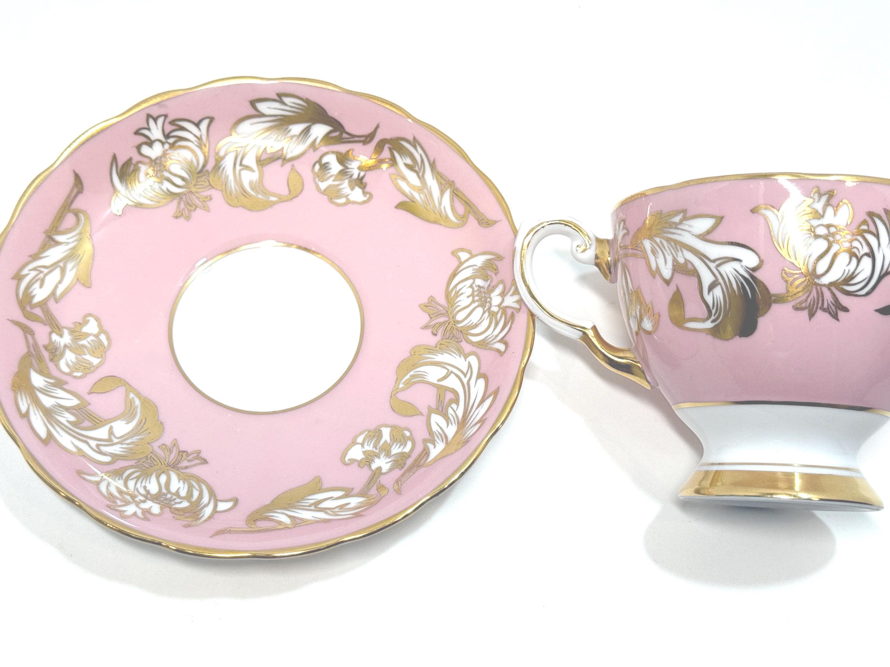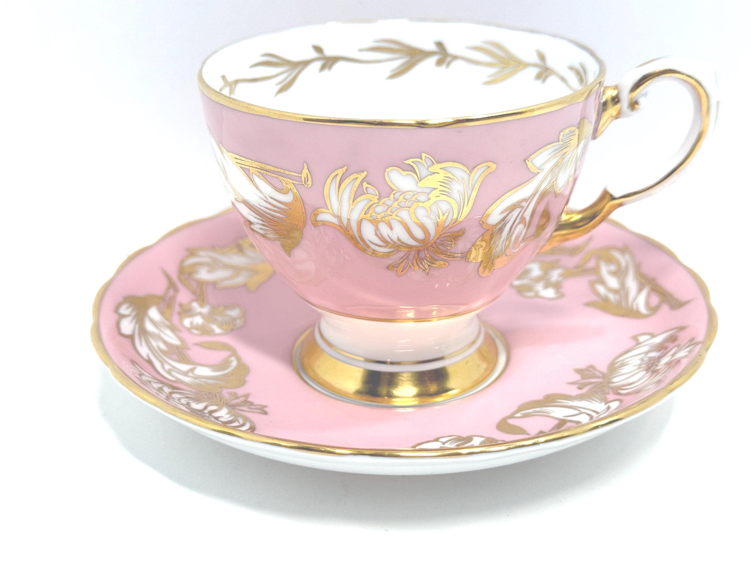 This Tuscan fine bone china teacup and saucer by Wedgwood is a delight to use. Partially hand-painted, this vintage set was crafted in the 1960s and features the iconic pink hue that made Tuscan renowned, along with a lovely border inside the cup. Founded in 1898, Tuscan became one of the top companies in its field, with its production facility based in Longton, England.