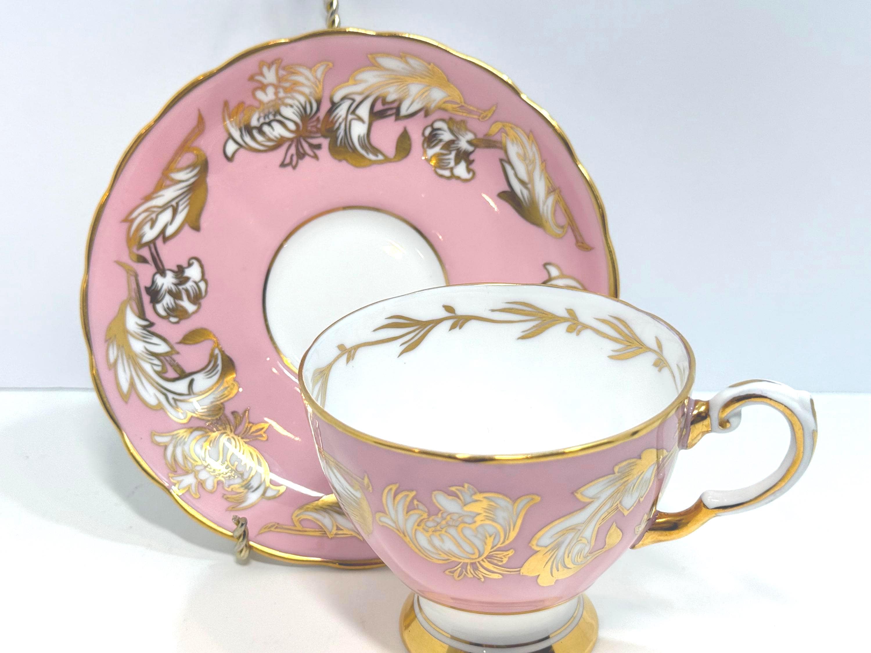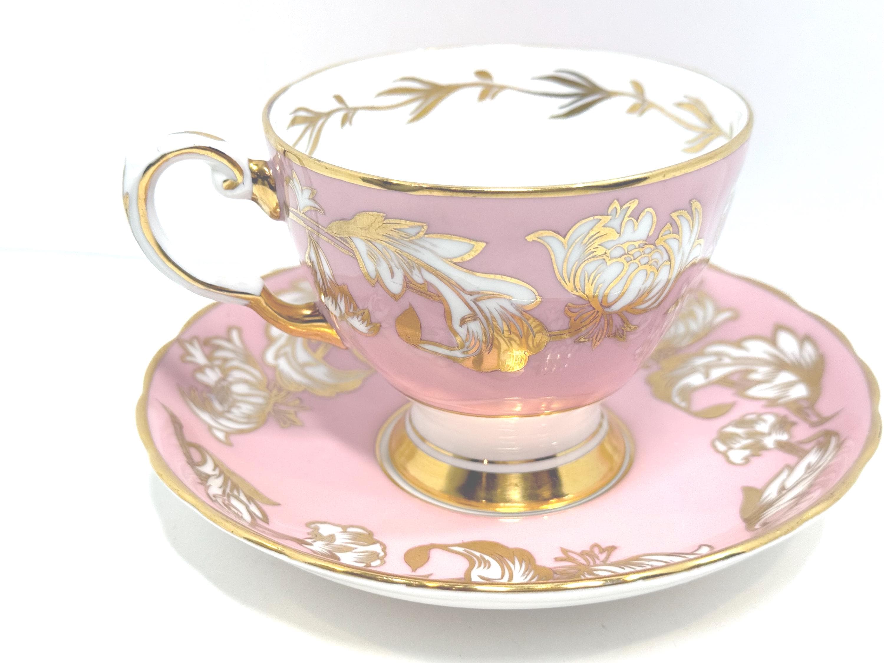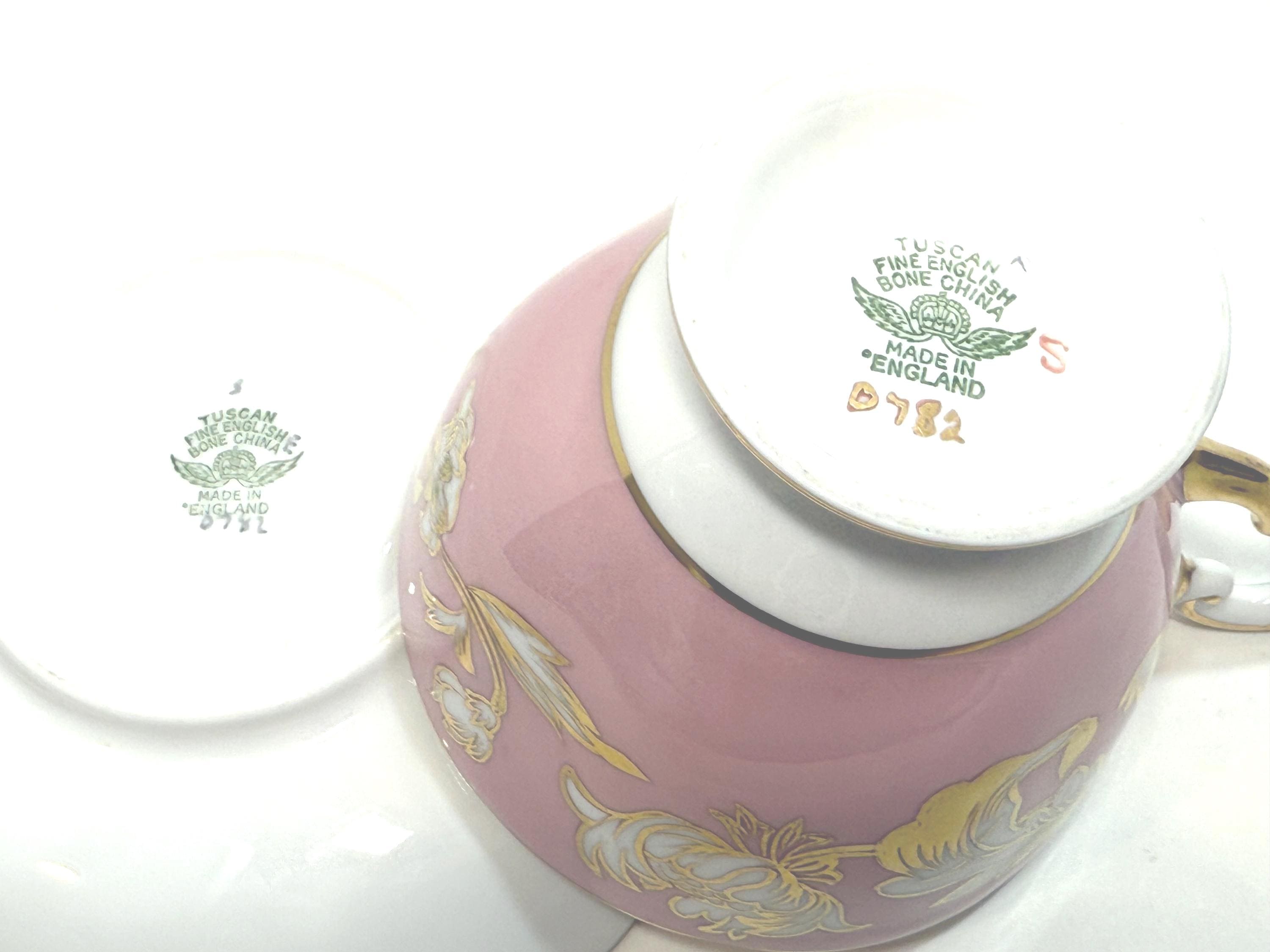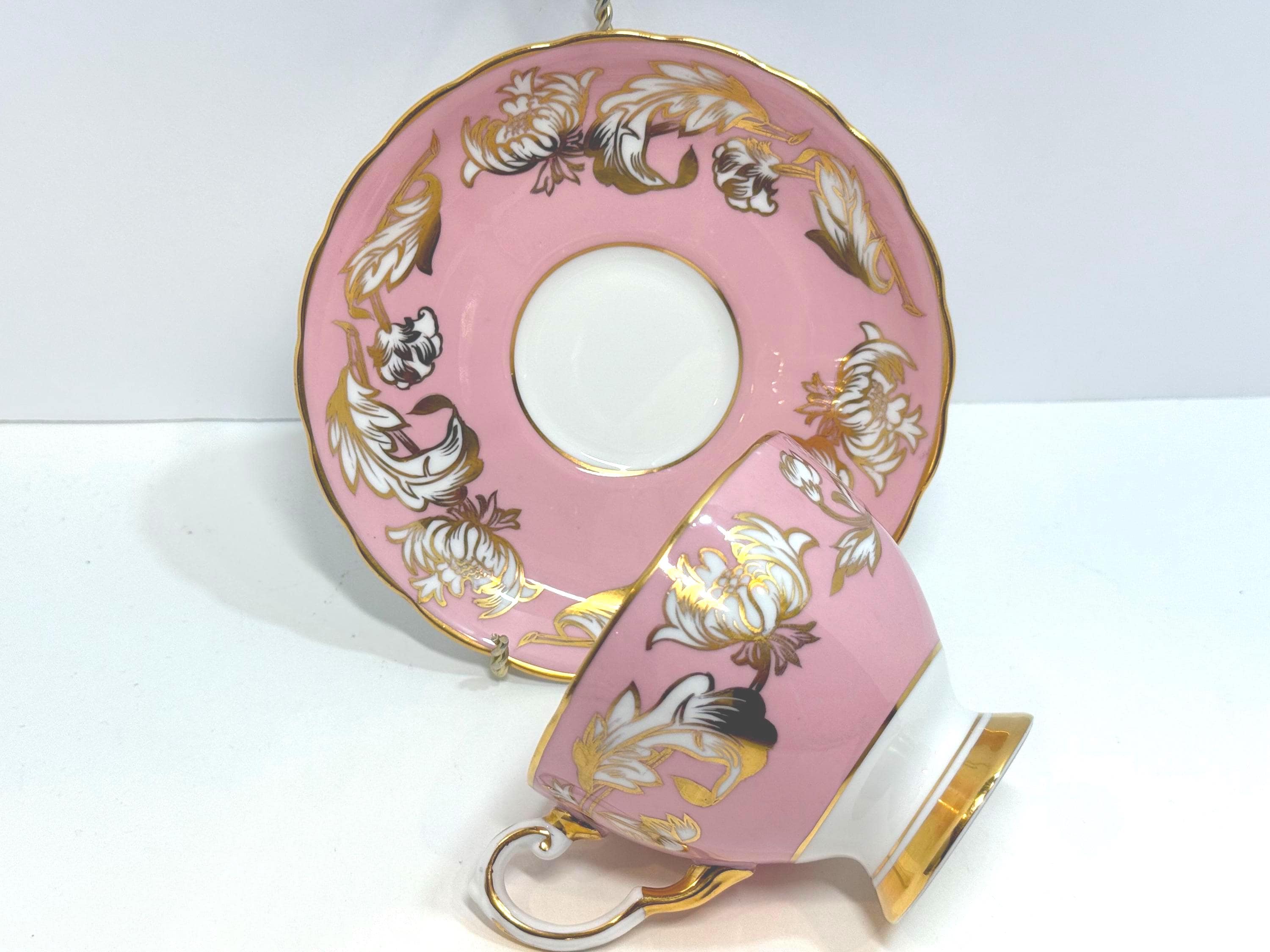 This Tuscan fine bone china teacup and saucer by Wedgwood is a delight to use. Partially hand-painted, this vintage set was crafted in the 1960s and features the iconic pink hue that made Tuscan renowned, along with a lovely border inside the cup. Founded in 1898, Tuscan became one of the top companies in its field, with its production facility based in Longton, England.