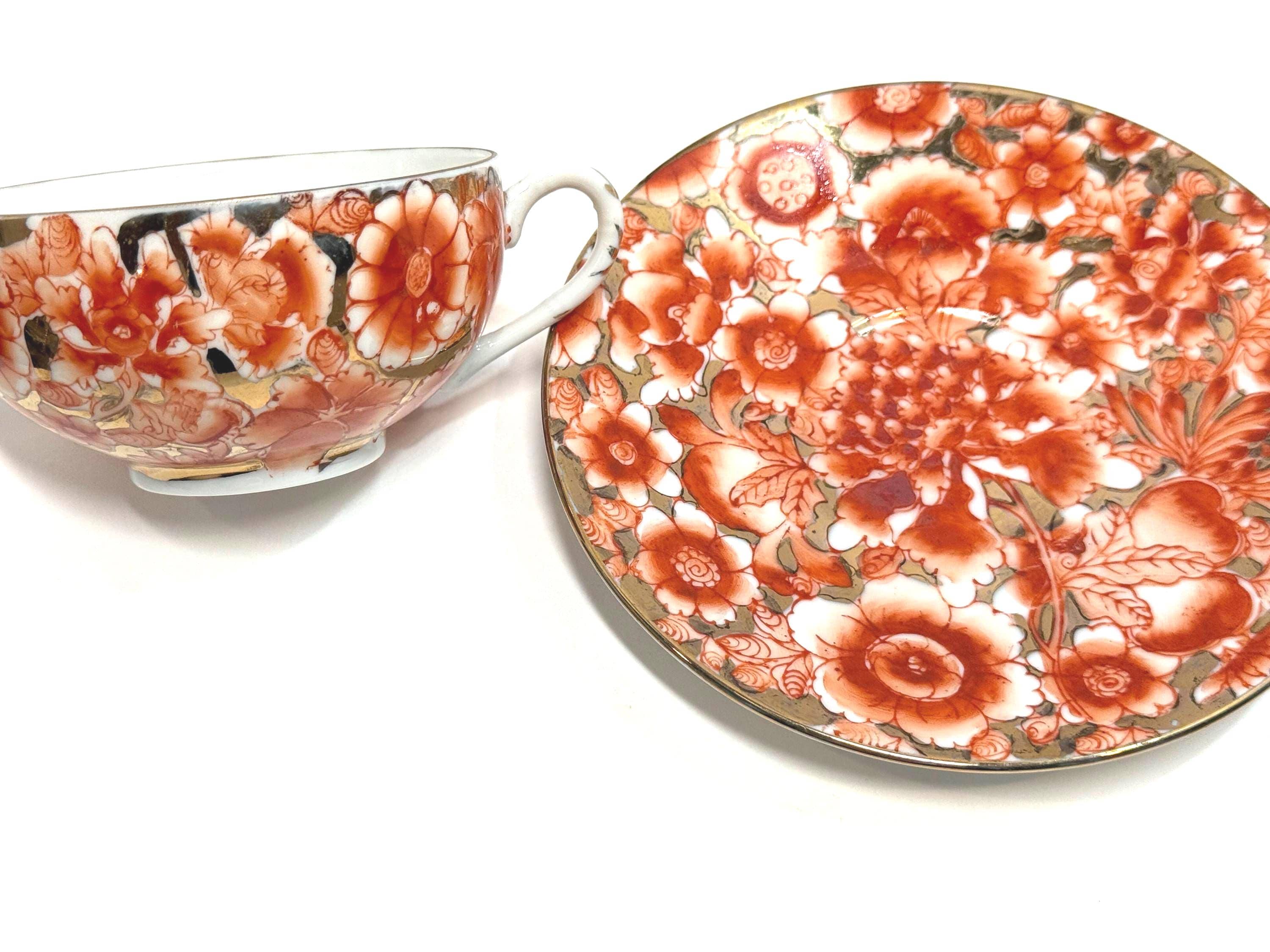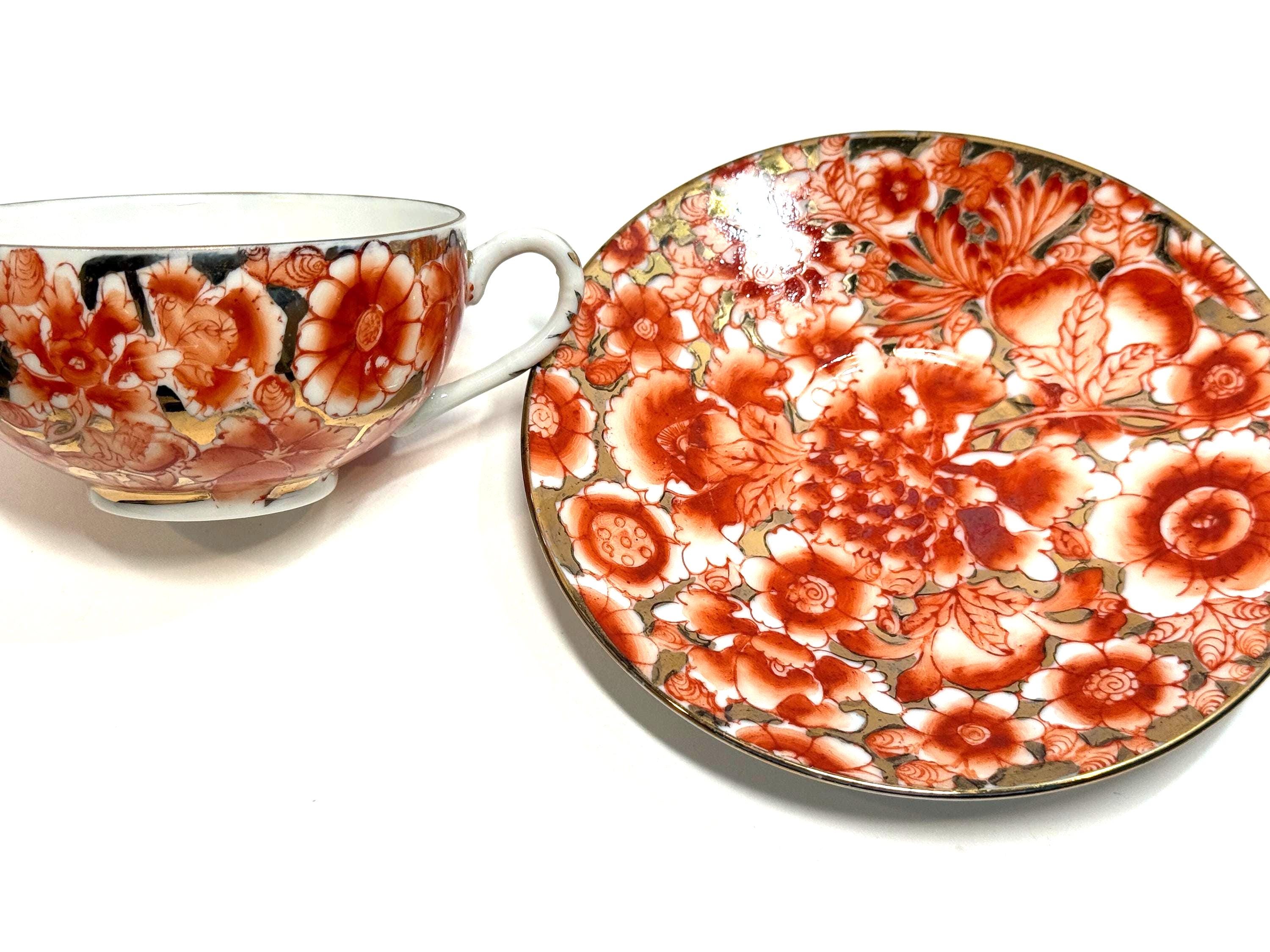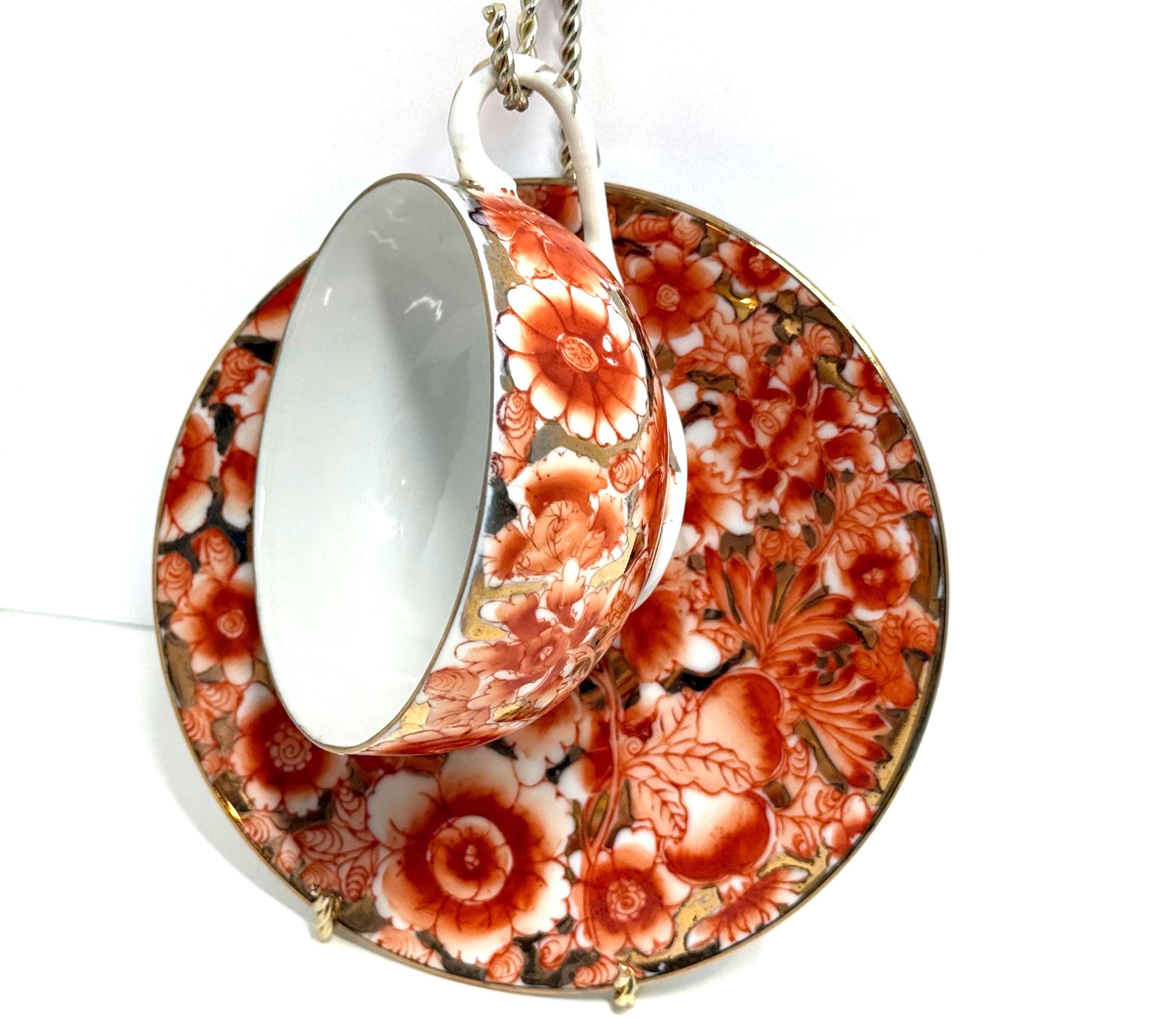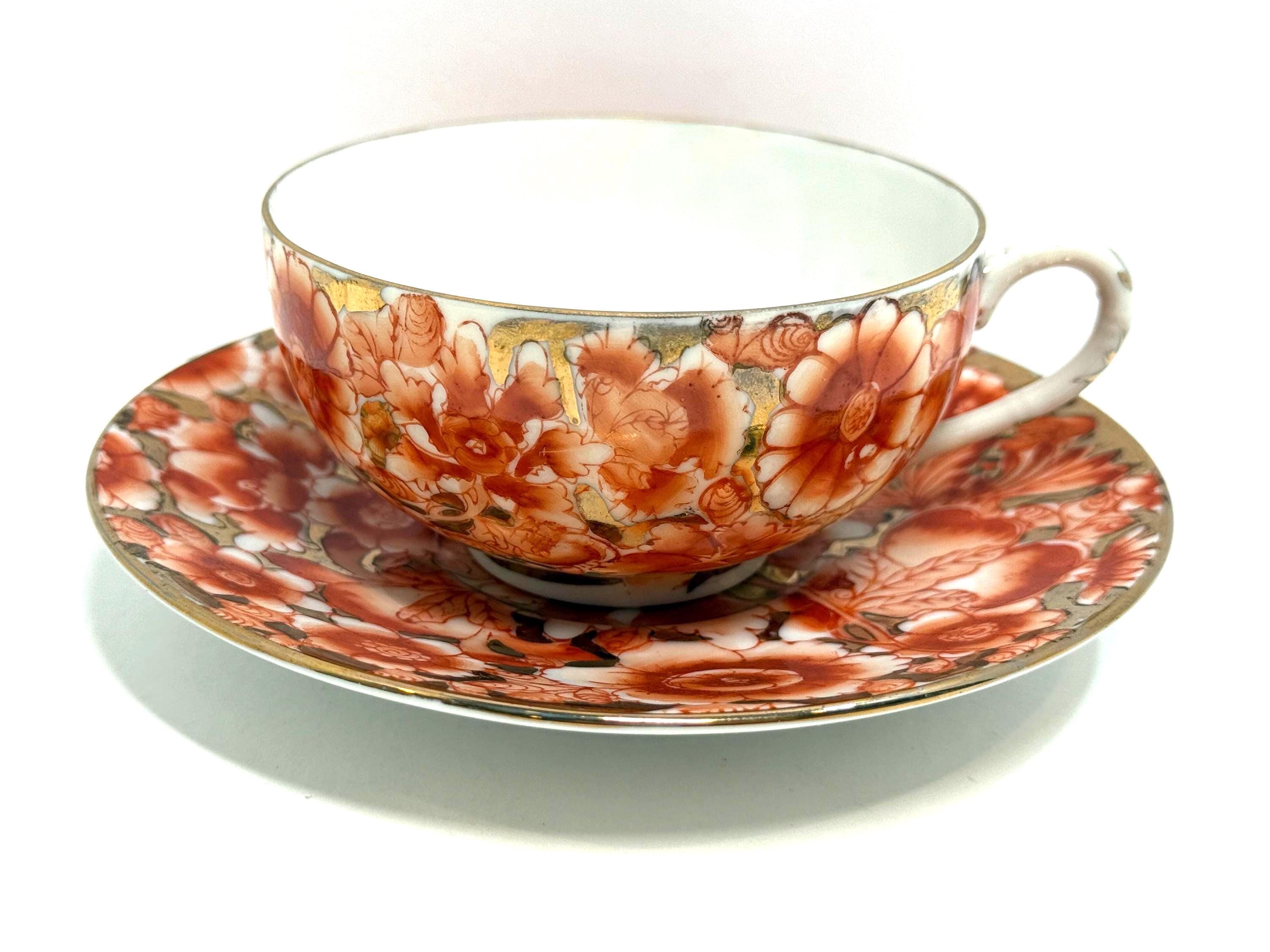 This wide-mouthed teacup and saucer, adorned in orange and gold, is beautifully hand-painted. Rare, highly collectible, and undeniably charming, it’s the perfect find.