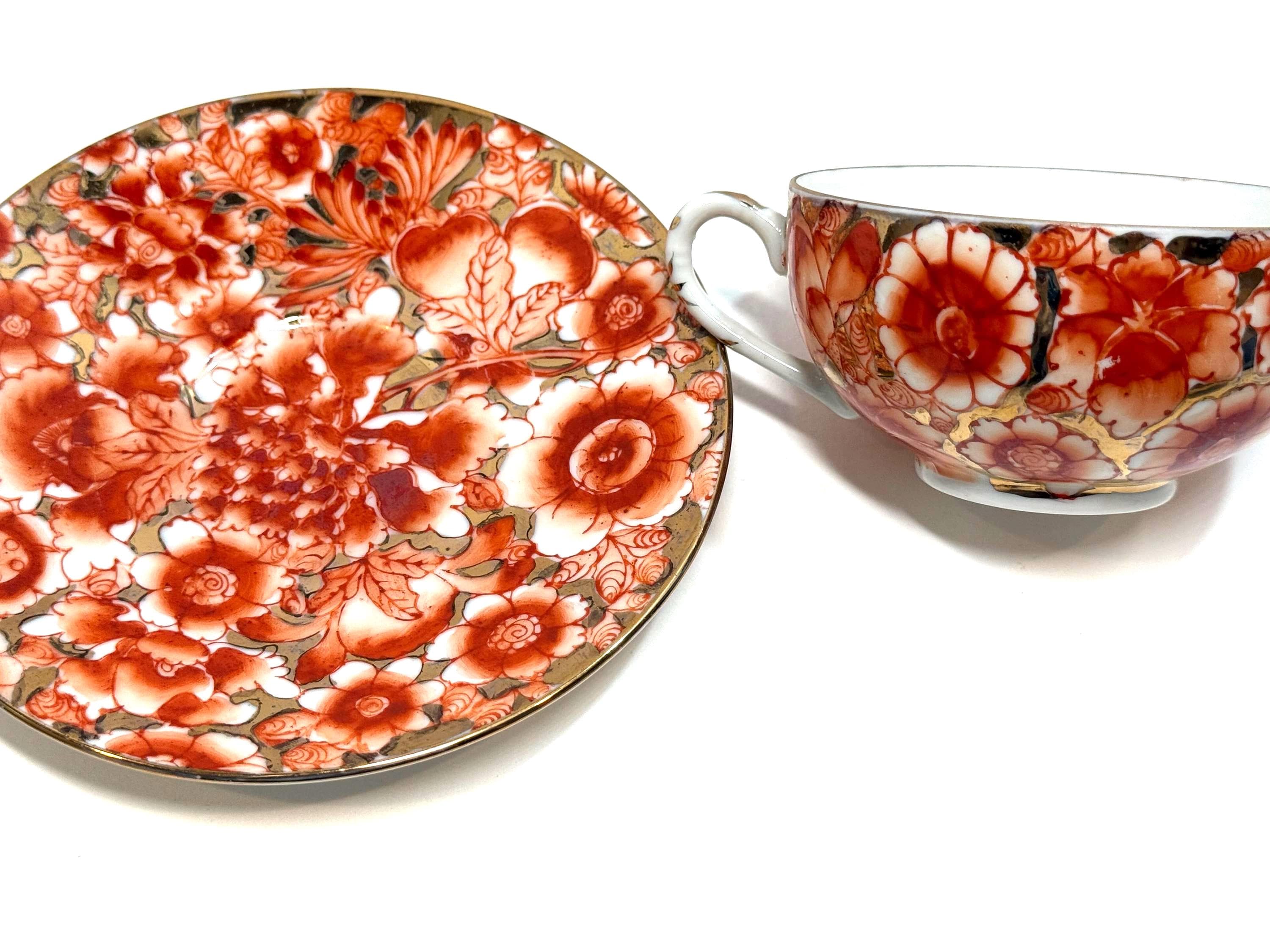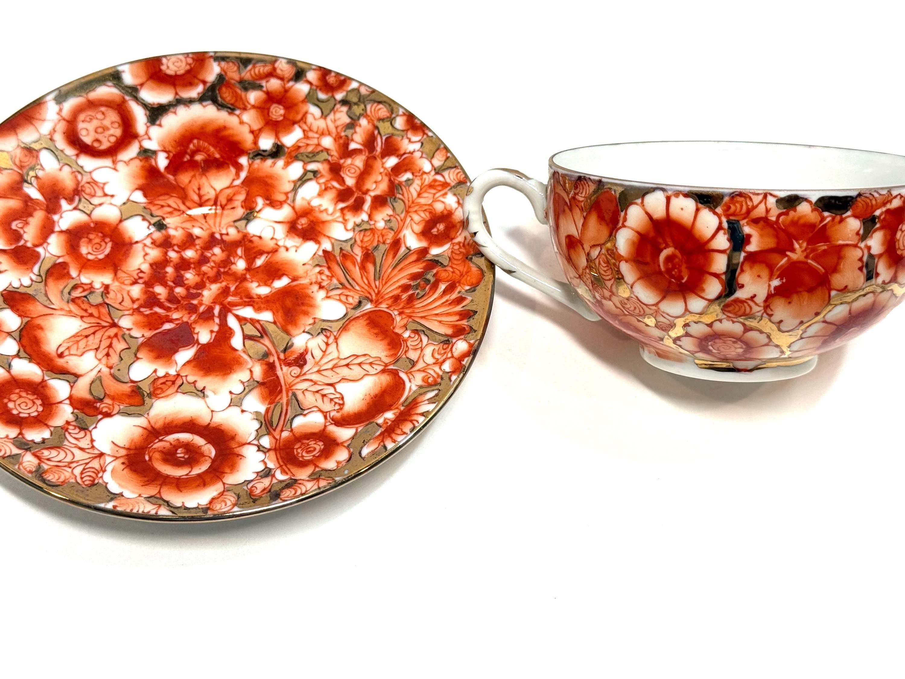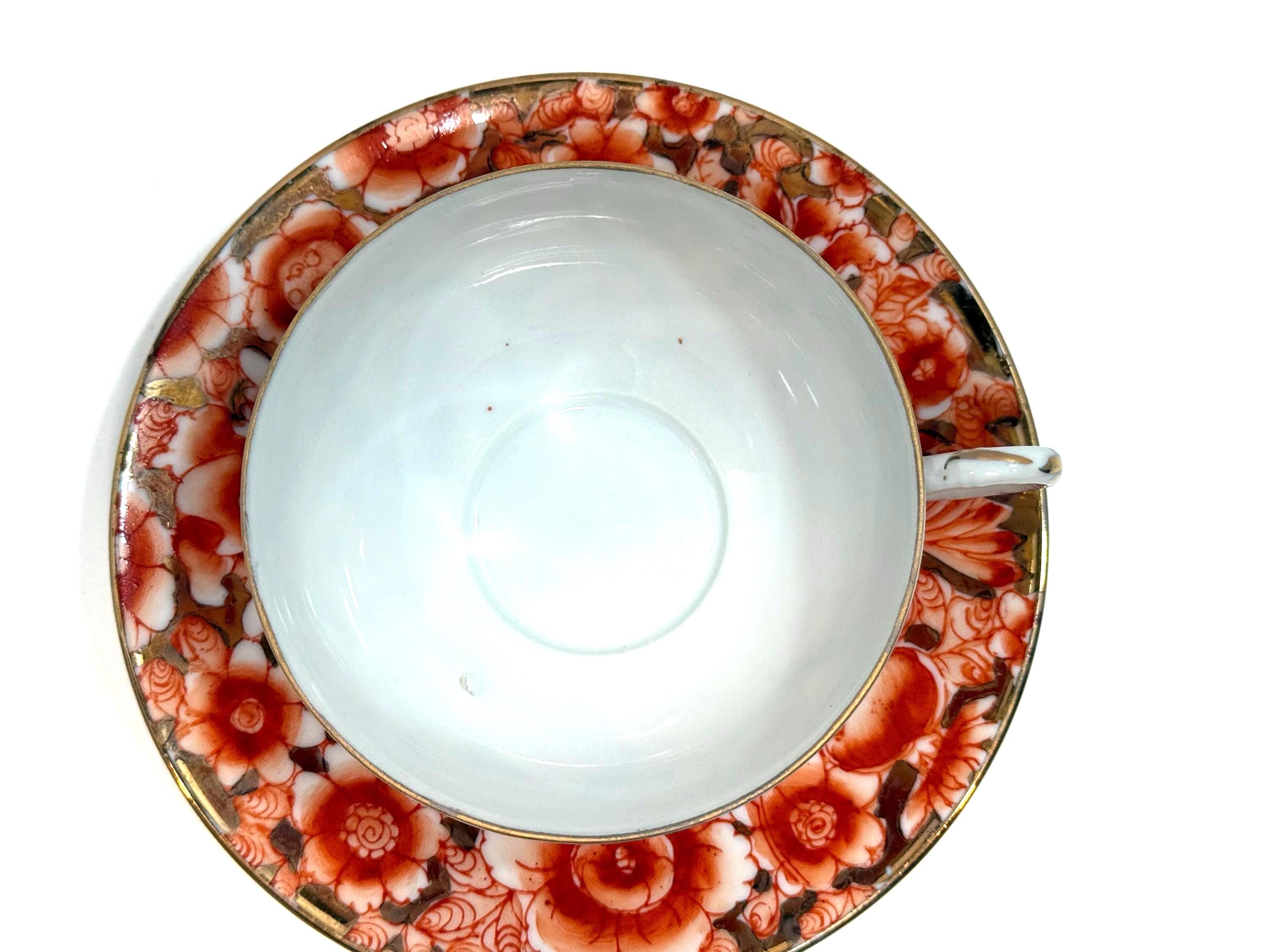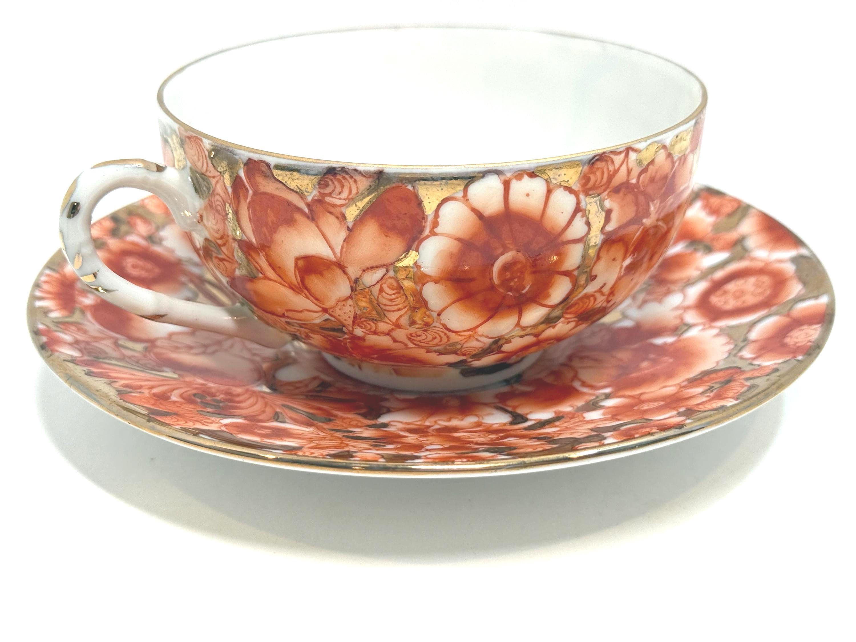 This wide-mouthed teacup and saucer, adorned in orange and gold, is beautifully hand-painted. Rare, highly collectible, and undeniably charming, it’s the perfect find.