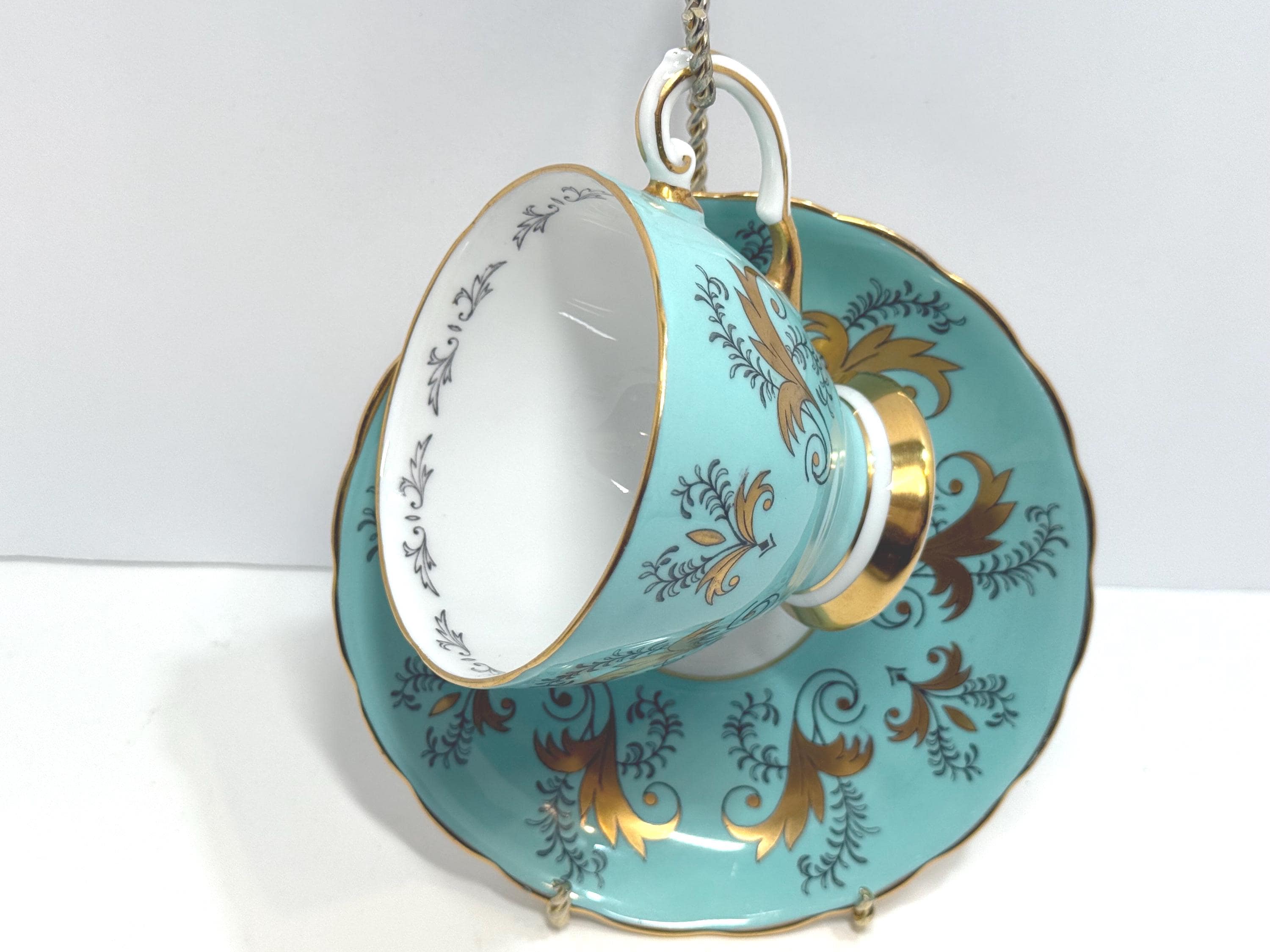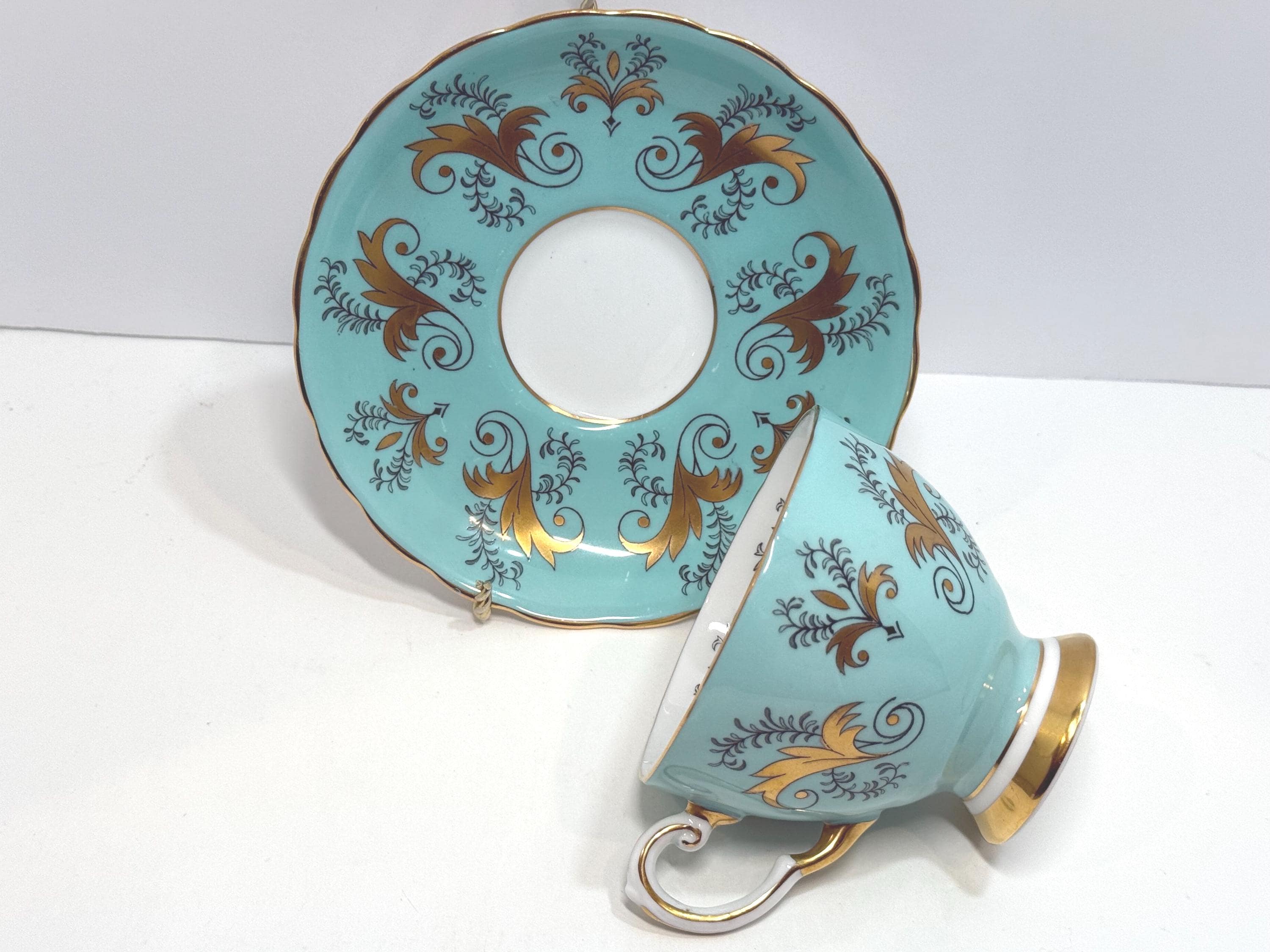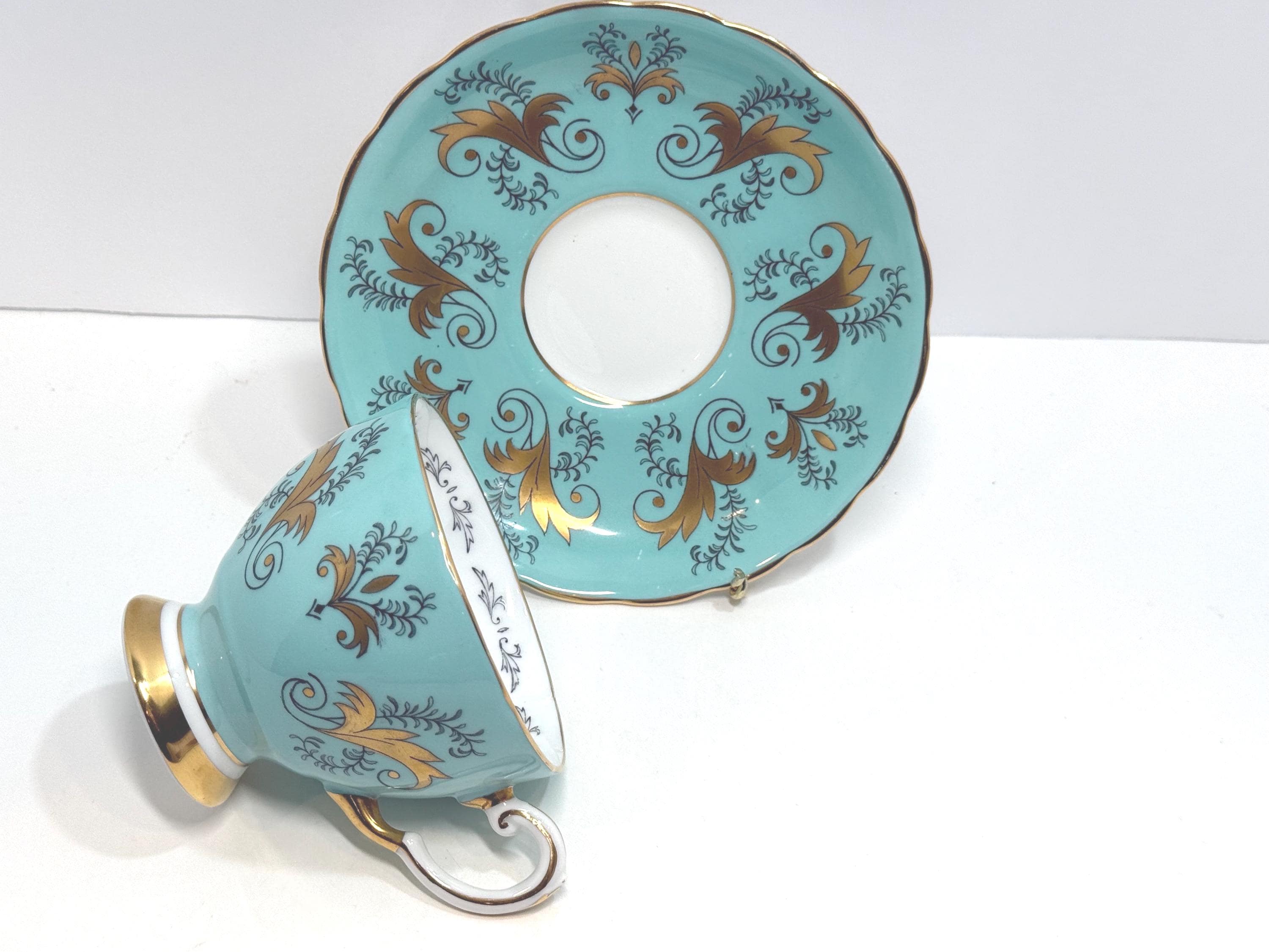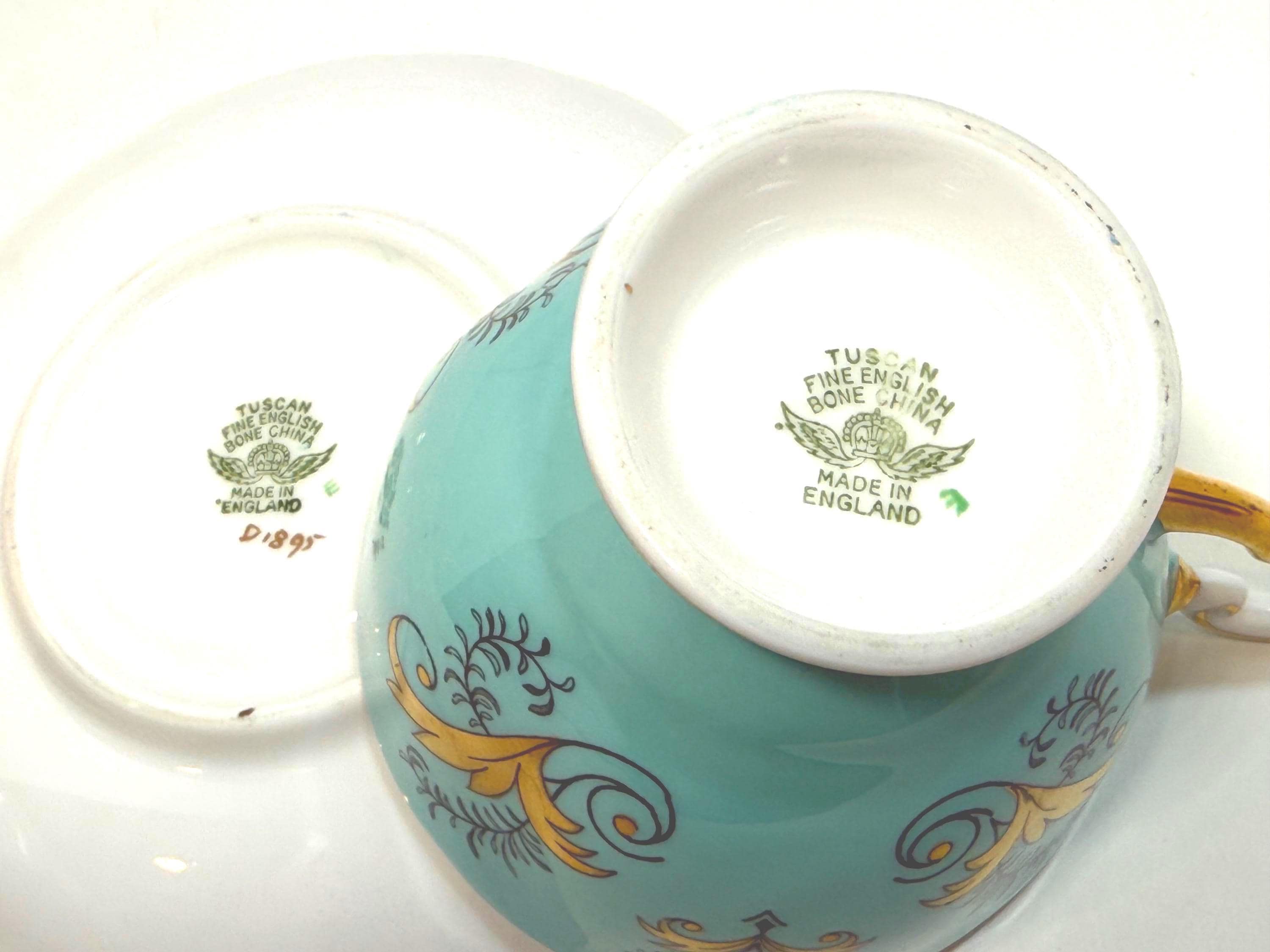 This bone china teacup and saucer was created by Tuscan Fine Bone China in England.
