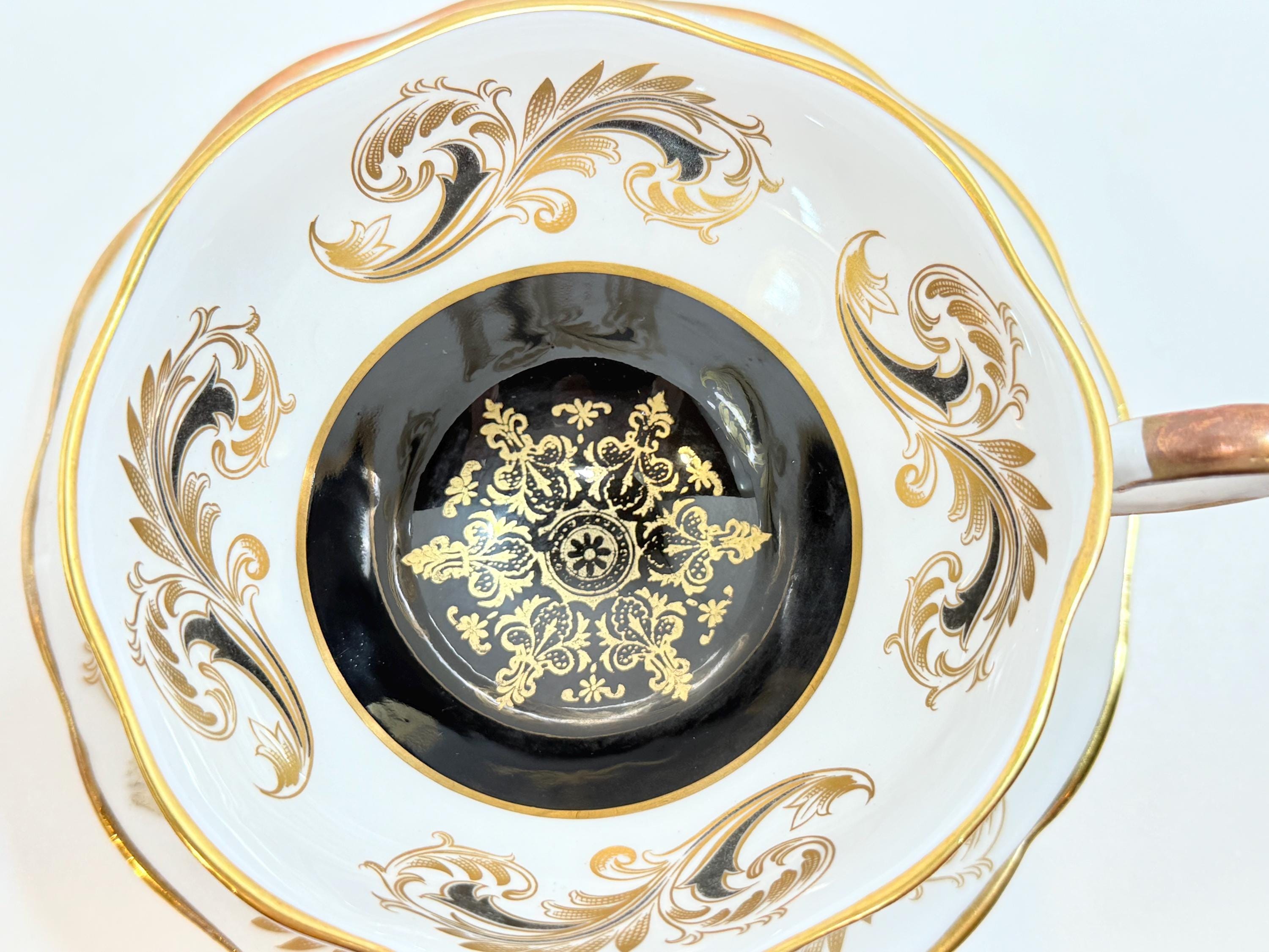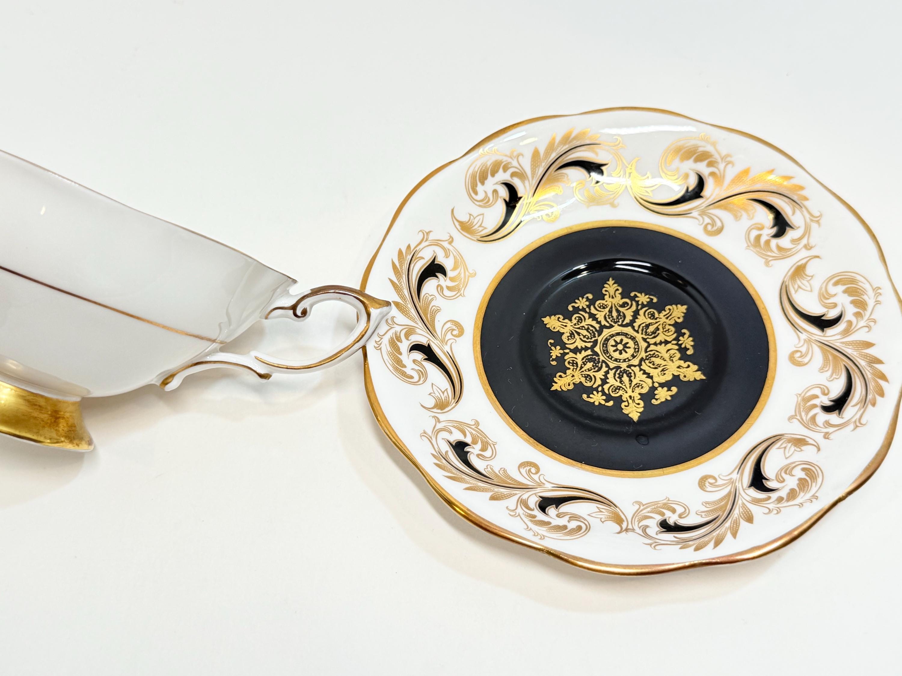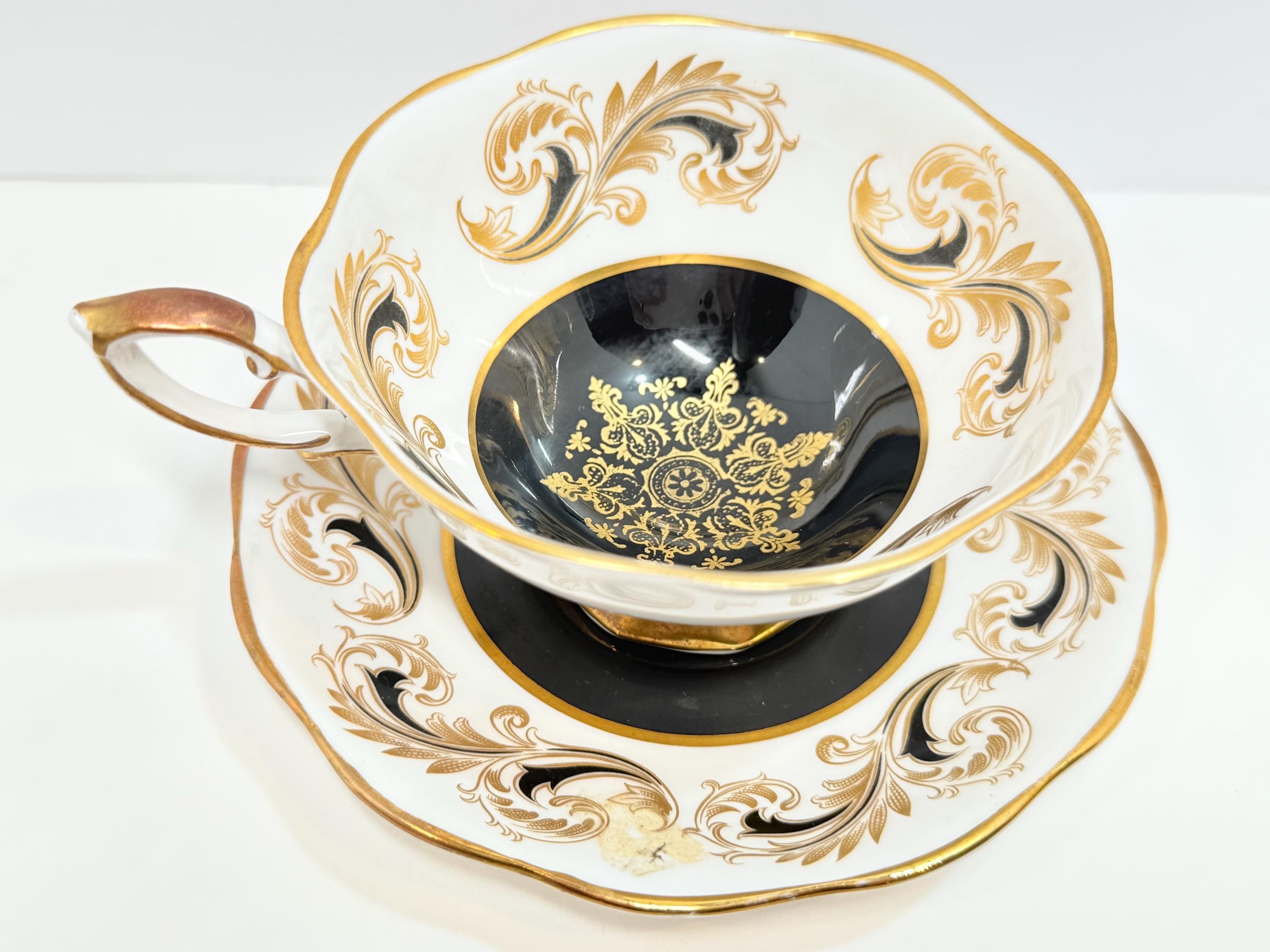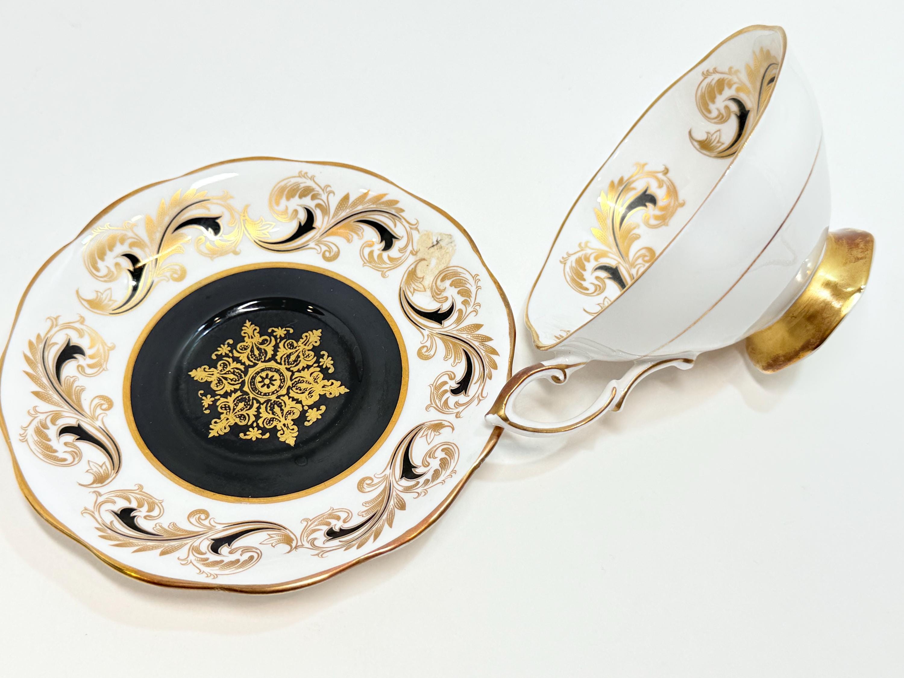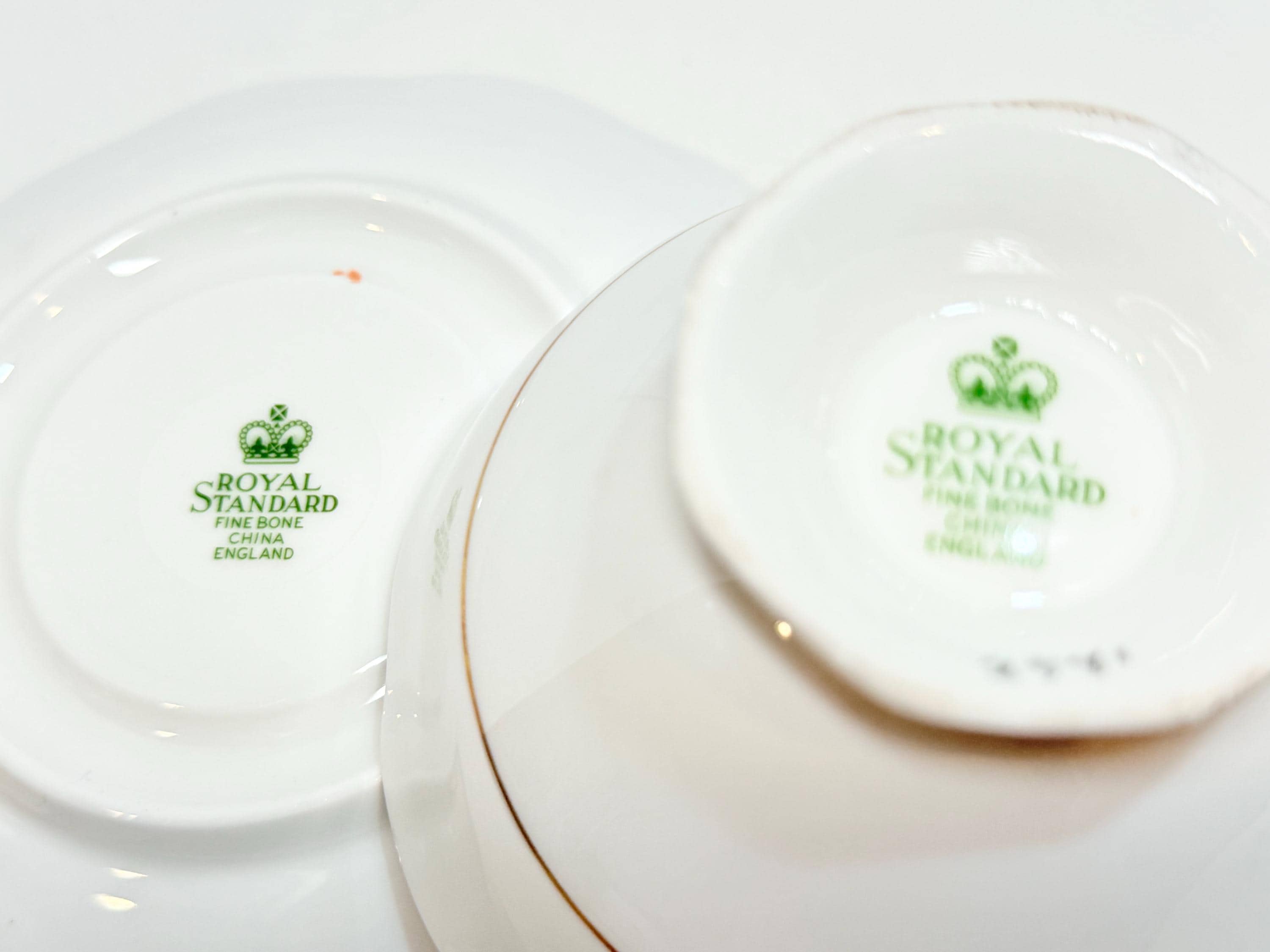 Pretty golden edges and handle perfectly highlight the softly scalloped shape of this stunning teacup and saucer. It has a wide rim to rim opening and lovely gold trim. This is a luxurious teacup and saucer by Royal Standard.