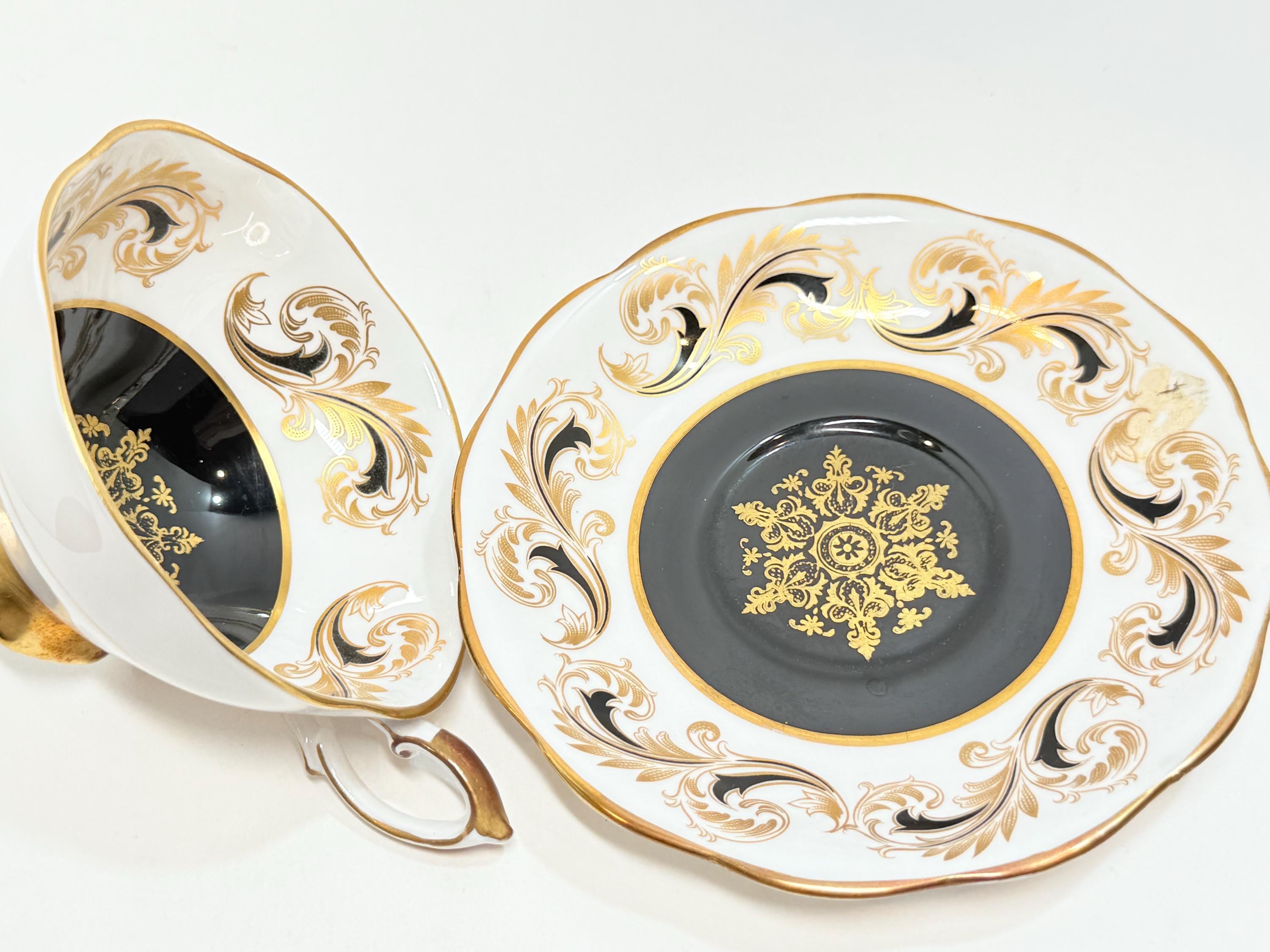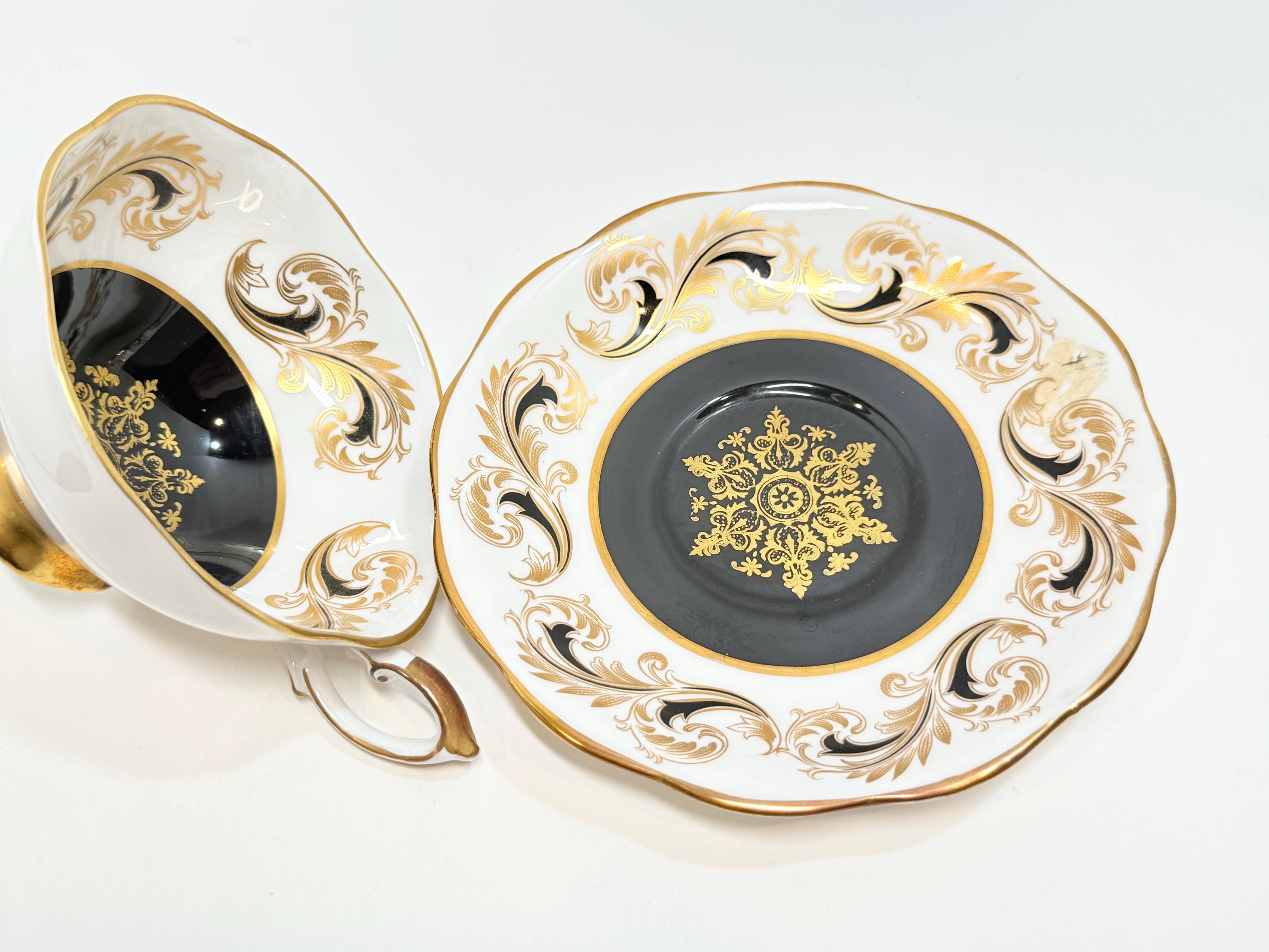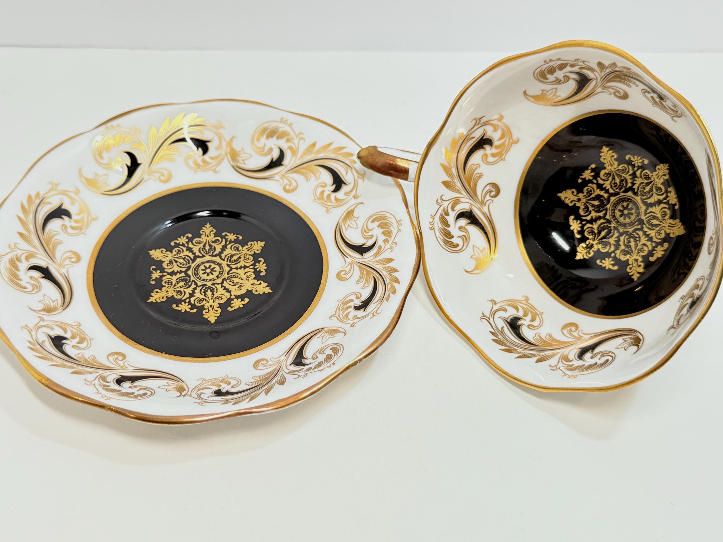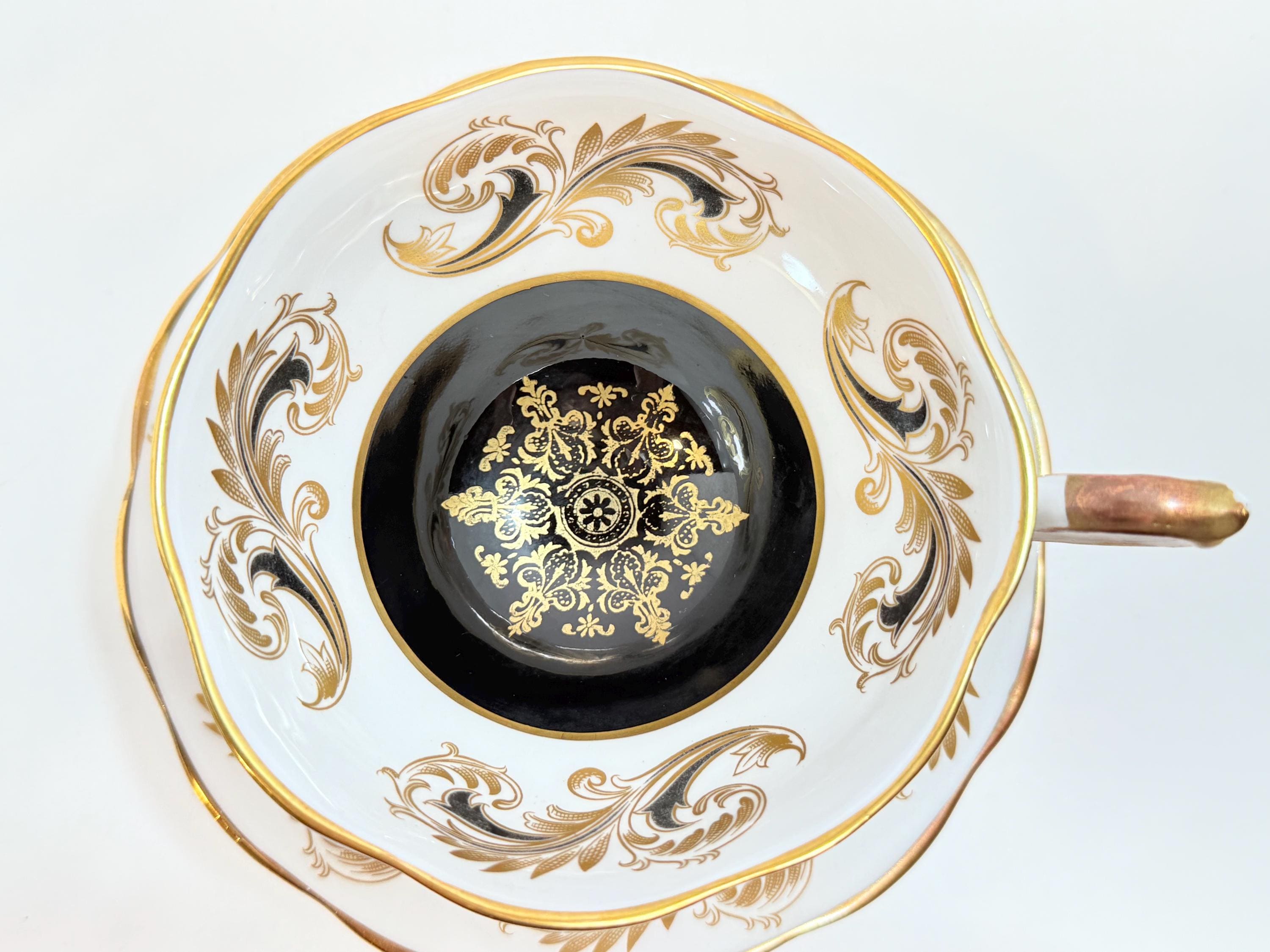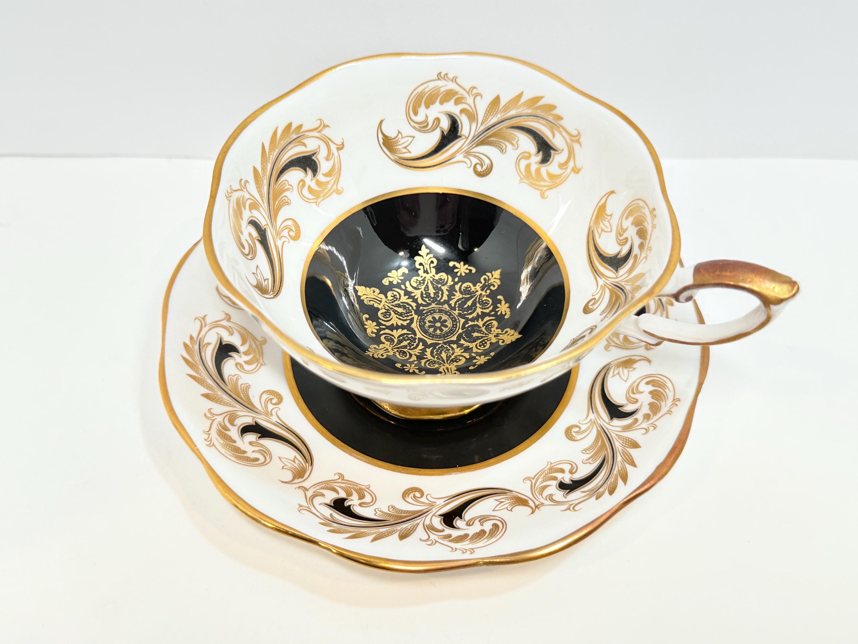 Pretty golden edges and handle perfectly highlight the softly scalloped shape of this stunning teacup and saucer. It has a wide rim to rim opening and lovely gold trim. This is a luxurious teacup and saucer by Royal Standard.