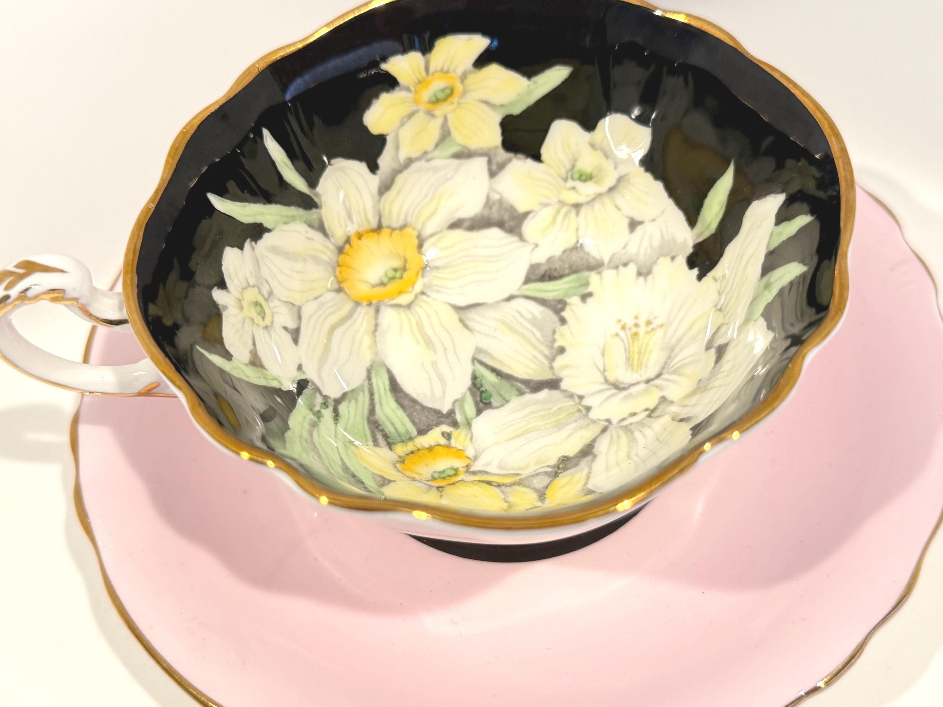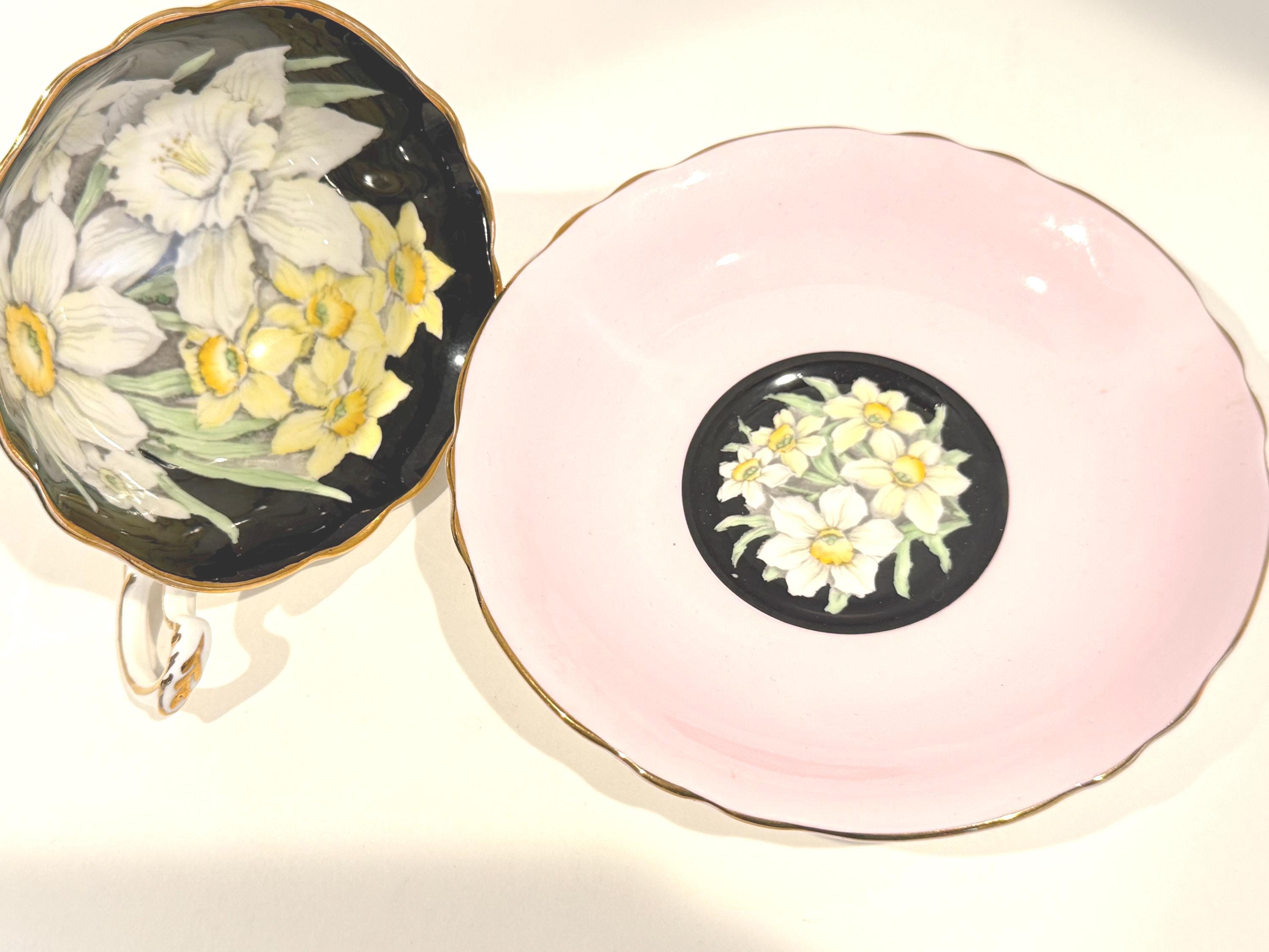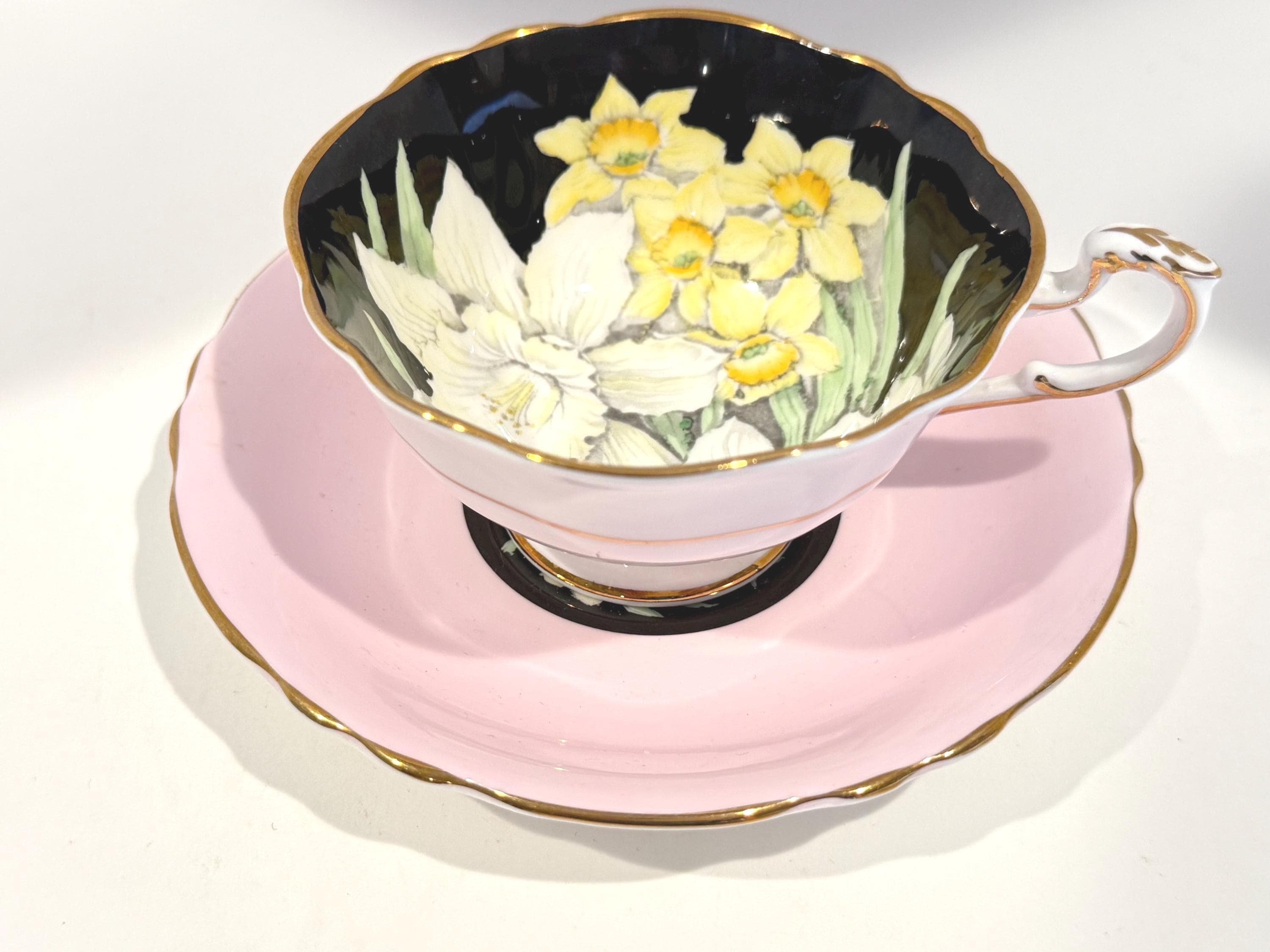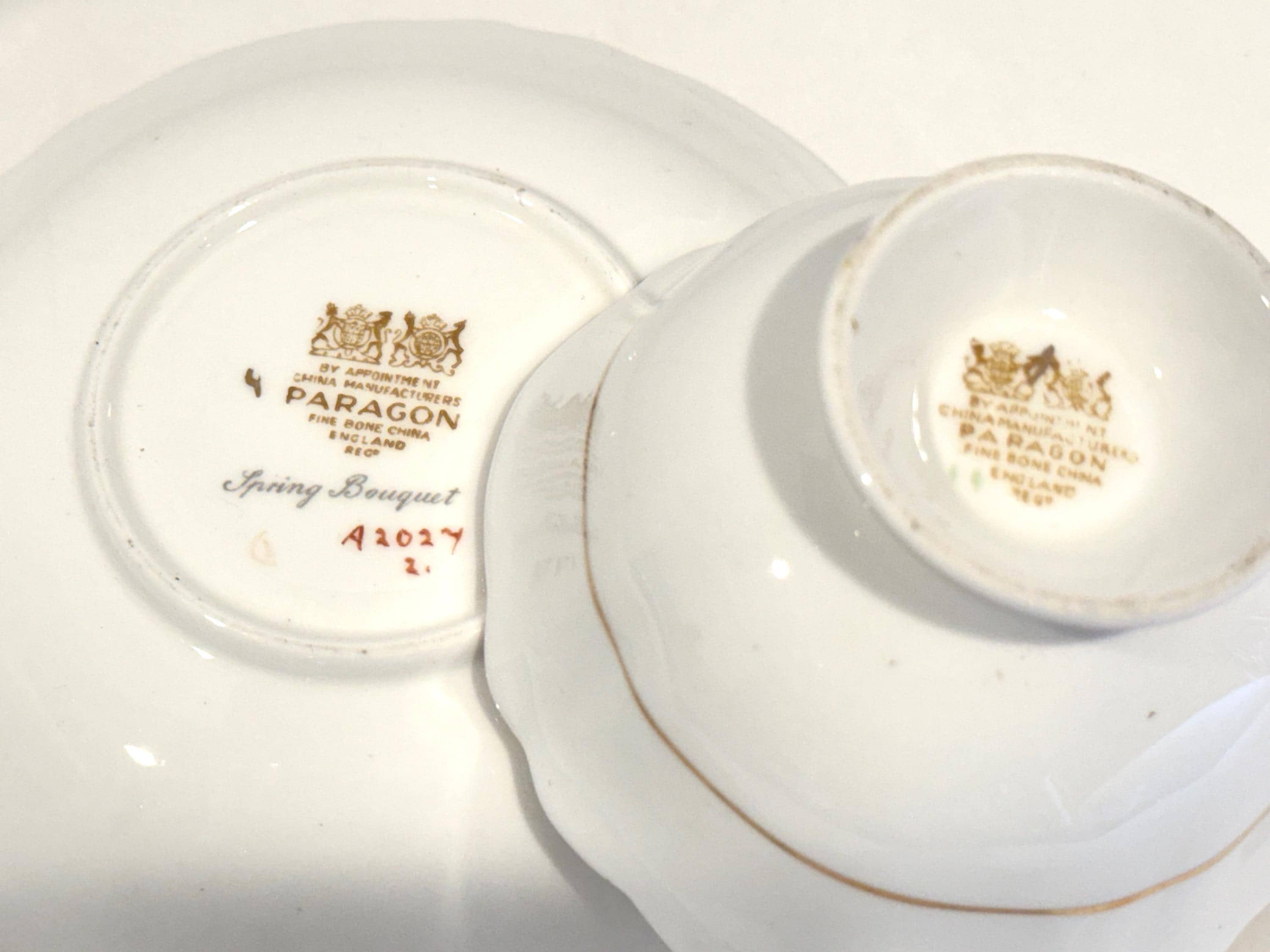 Paragon Bone China of England crafted this gorgeous floral teacup and saucer. It is hand painted and wears the double warrant given by the British Royal Family for the quality of the Paragon china and the company's service to the crown. There is a dot of white at the edge of the saucer well. It probably occurred during use over its 75 years or more.