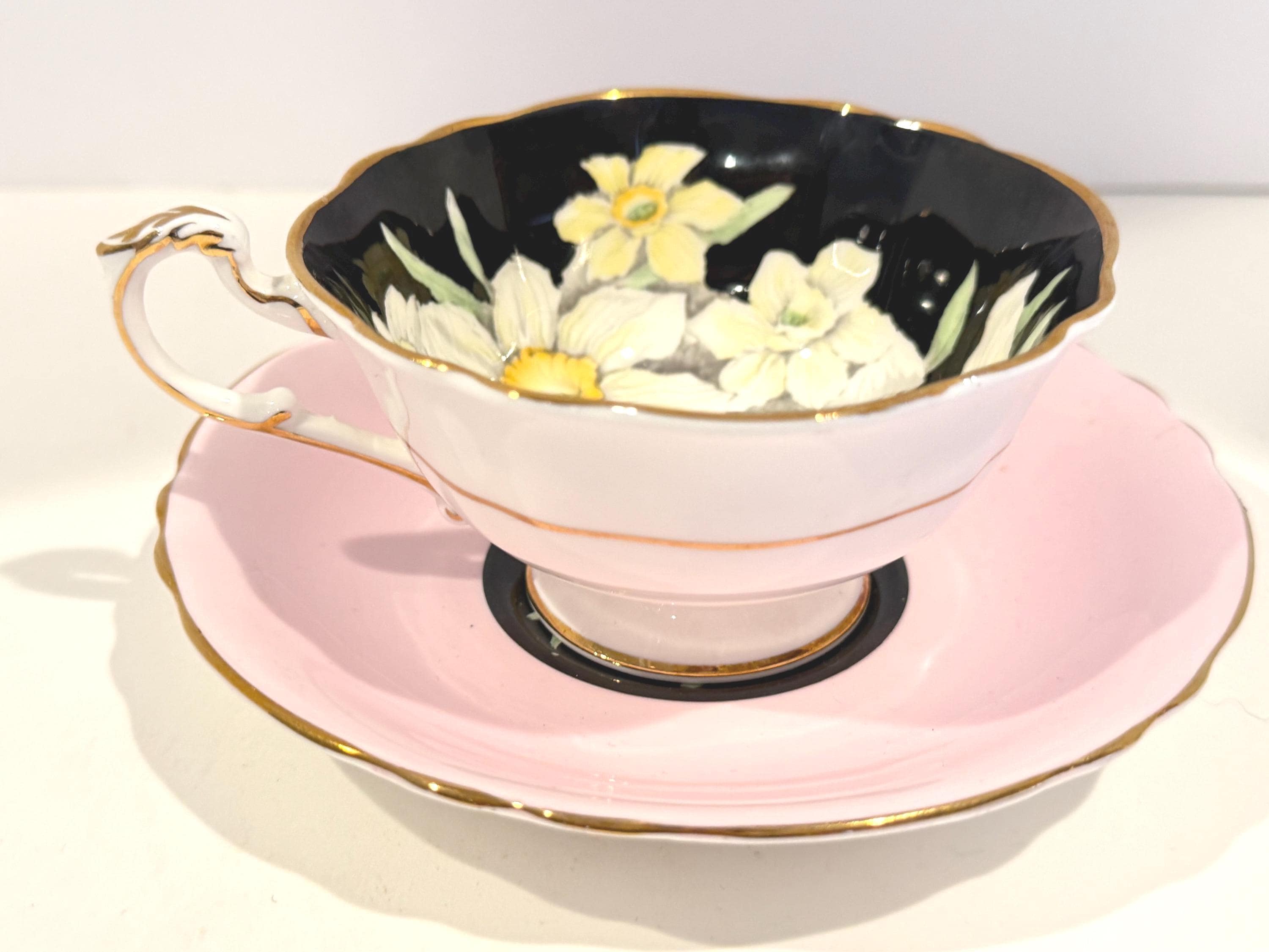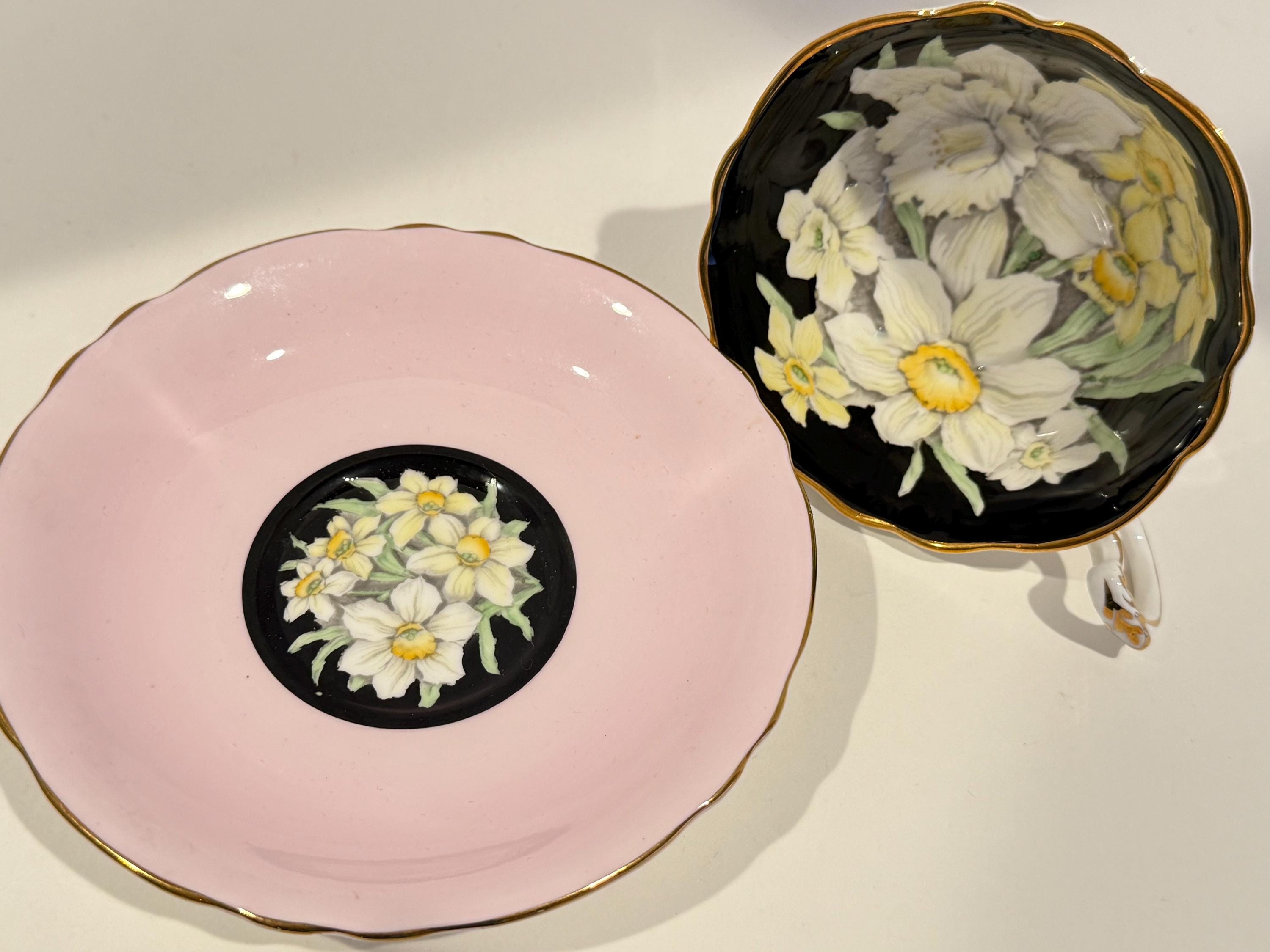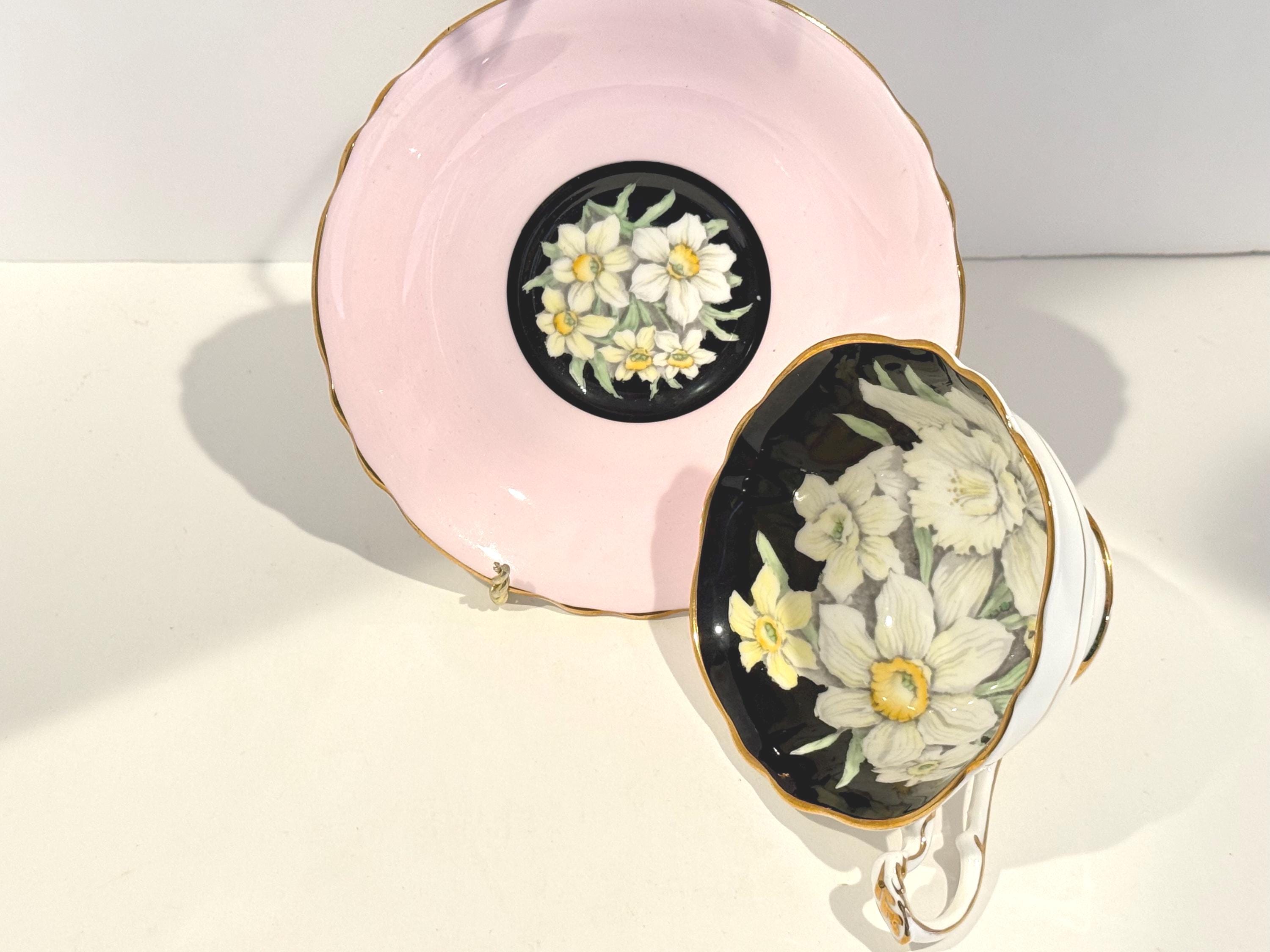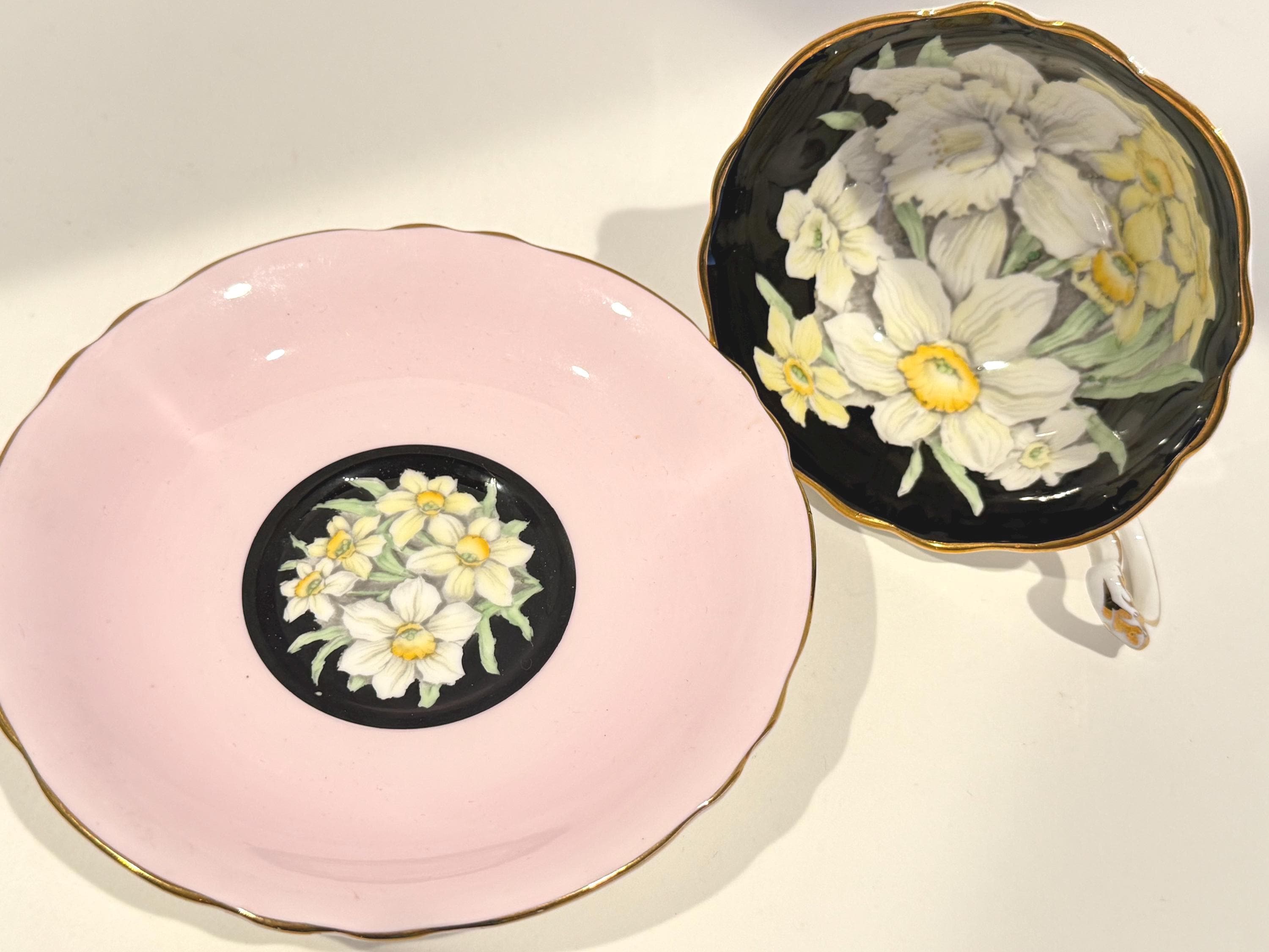 Paragon Bone China of England crafted this gorgeous floral teacup and saucer. It is hand painted and wears the double warrant given by the British Royal Family for the quality of the Paragon china and the company's service to the crown. There is a dot of white at the edge of the saucer well. It probably occurred during use over its 75 years or more.