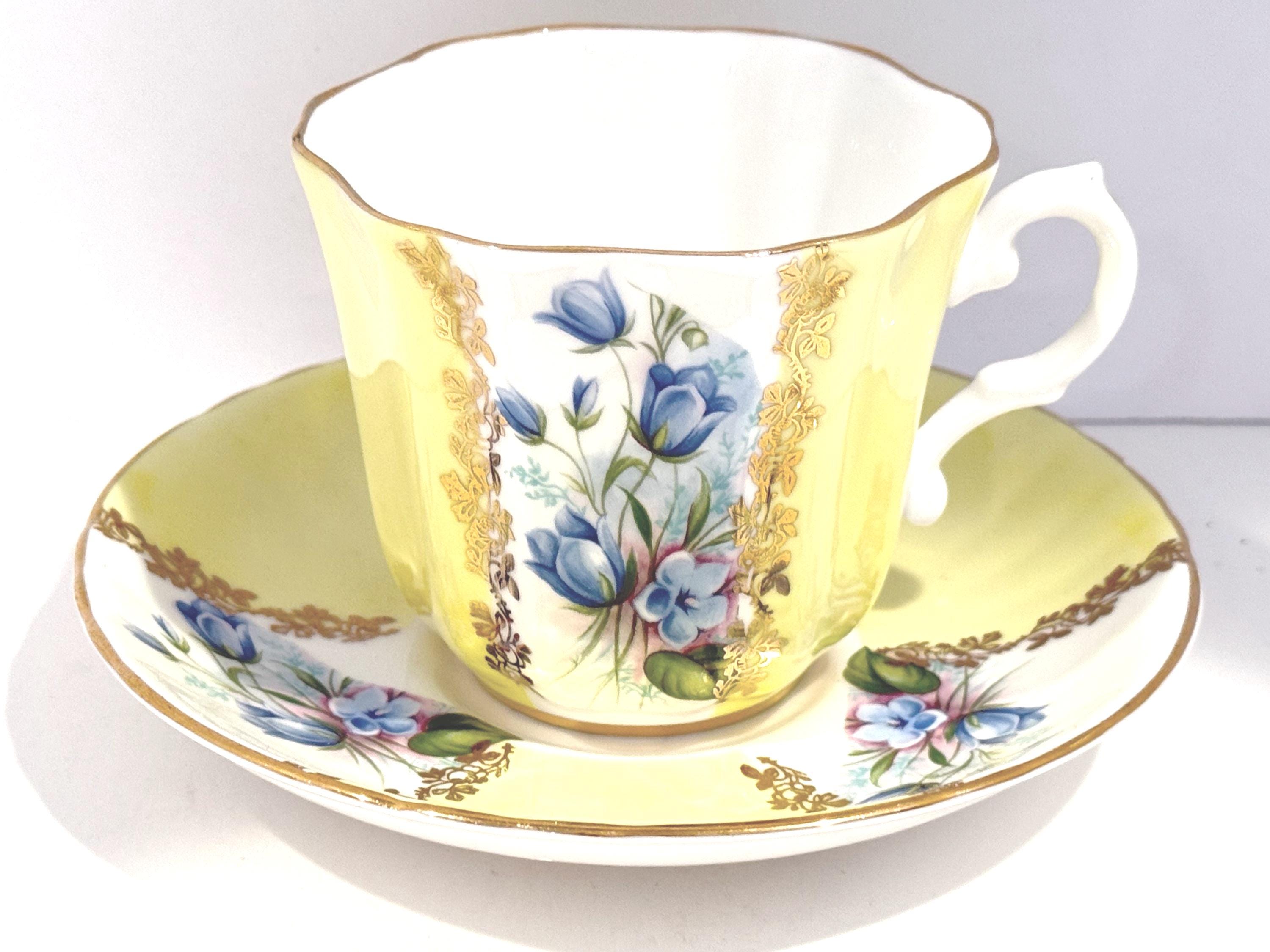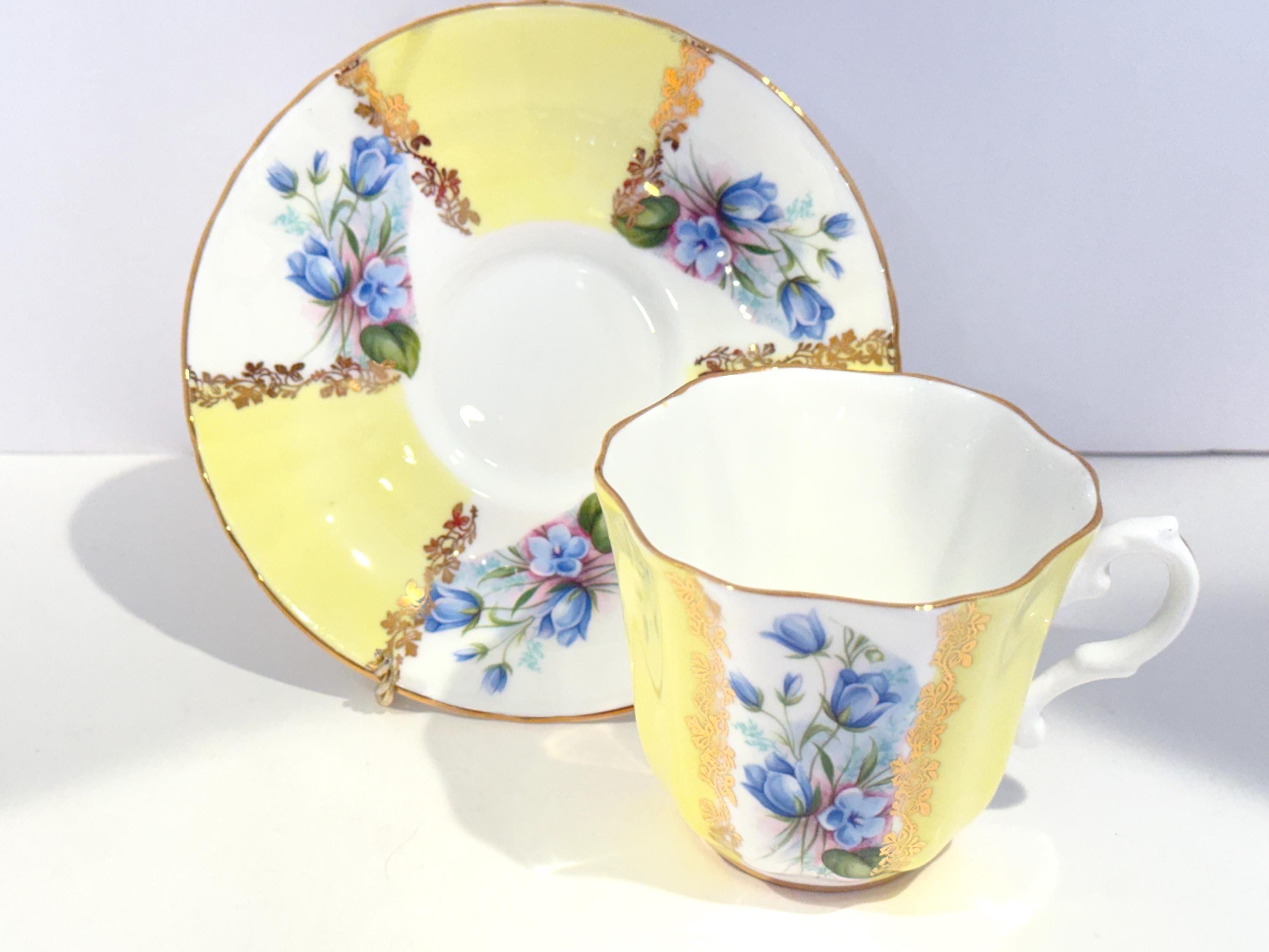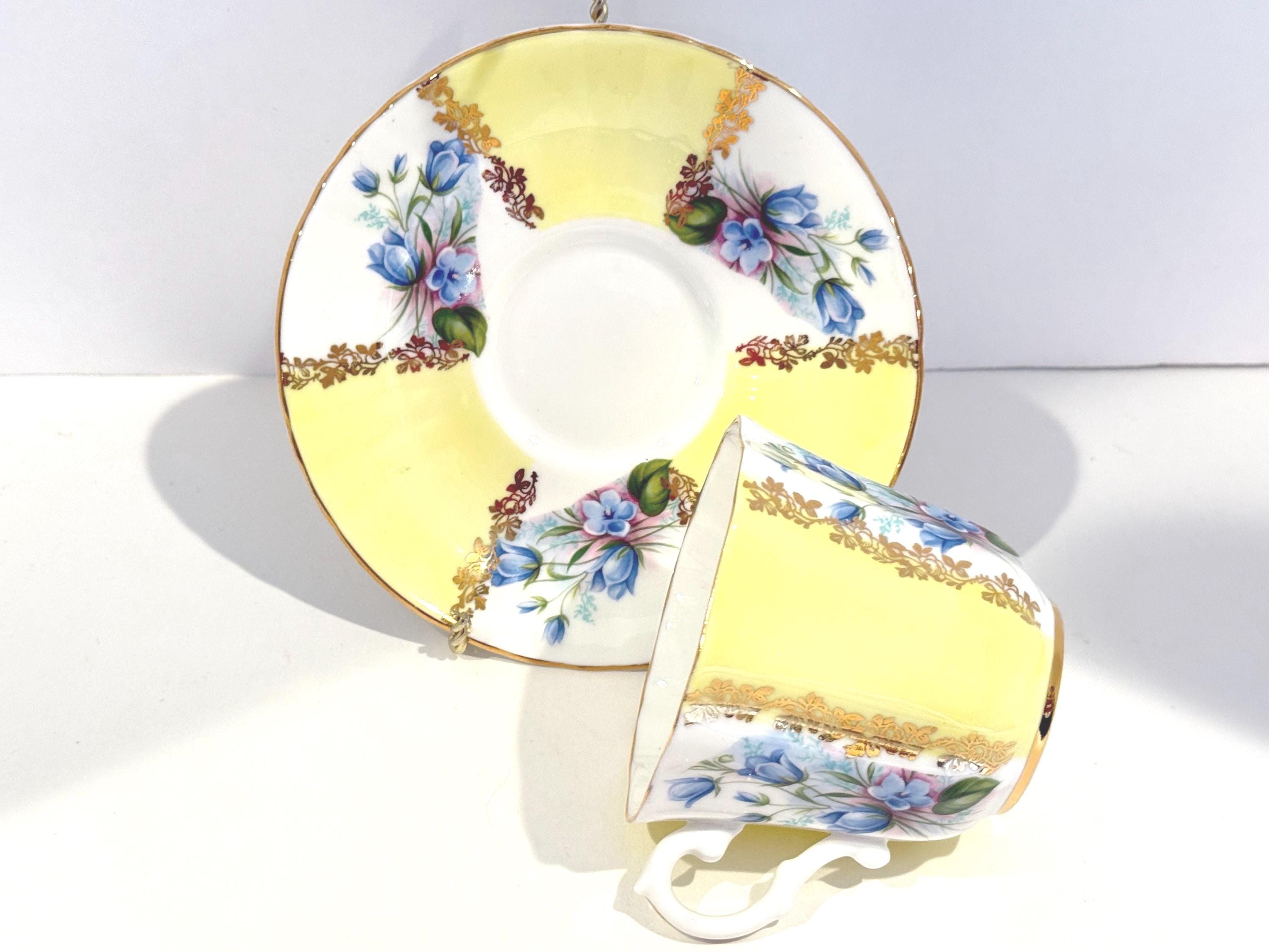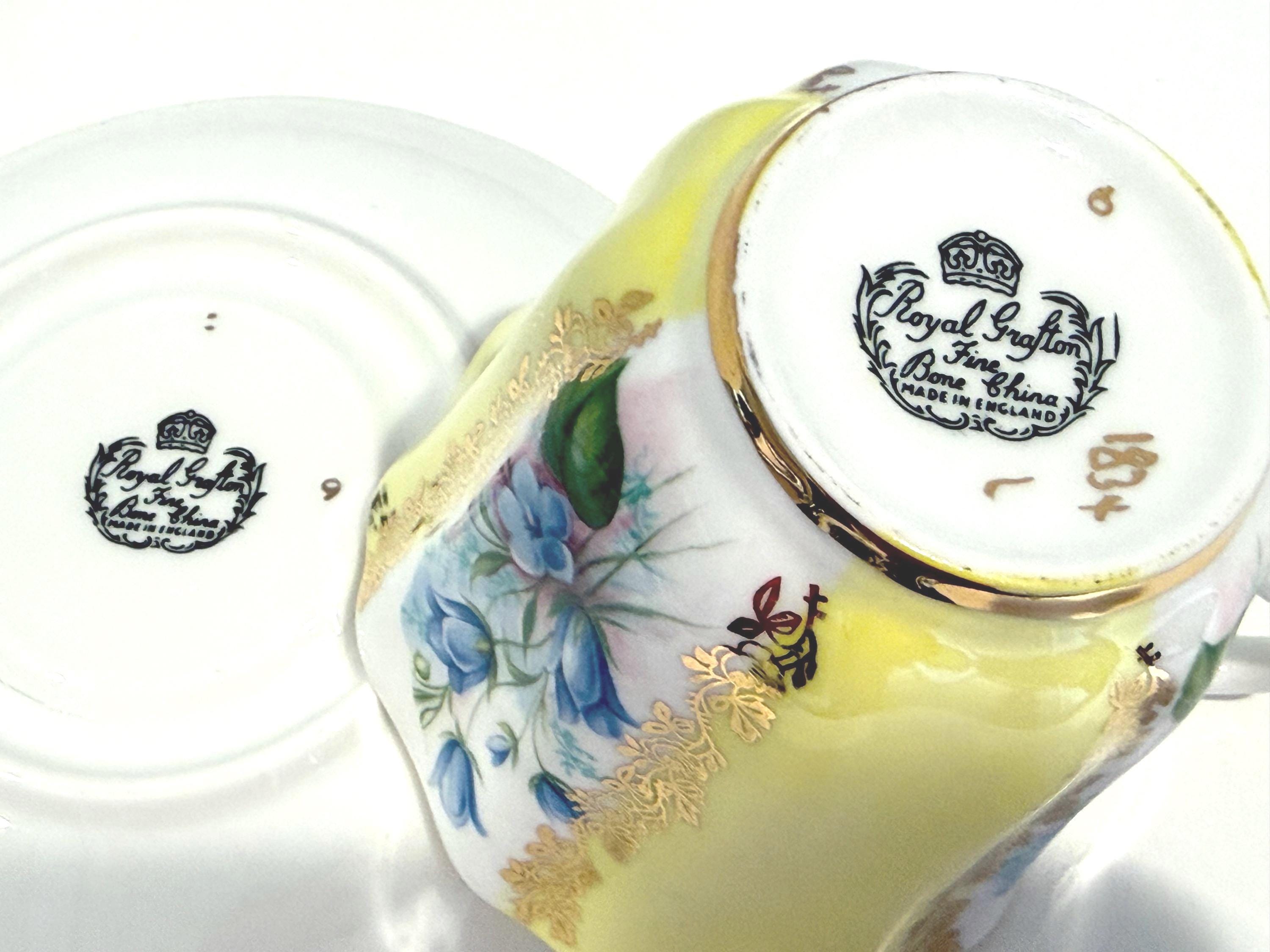 Enjoy afternoon tea in an antique Royal Grafton teacup and saucer from England. The yellow panels with lavish gold trim perfectly frame the hand-painted blue flowers, while the aristocratic handle and ruffled edges add to its charm. The backstamp, first issued in 1957, marks its heritage. Royal Grafton, owned by A. B. Jones, produced these fine wares in their Longton, England factory, earning a place among the renowned Staffordshire potteries.
