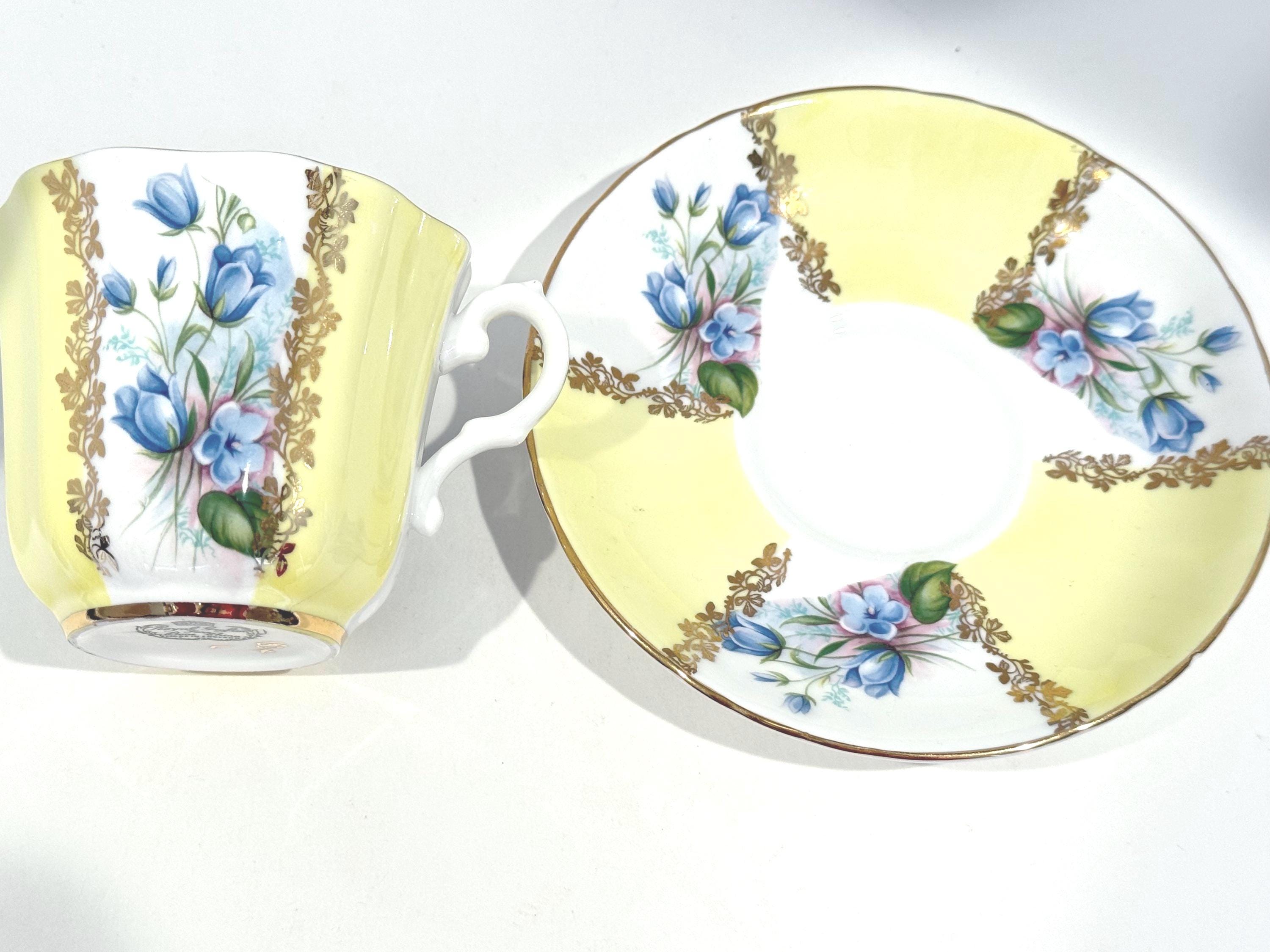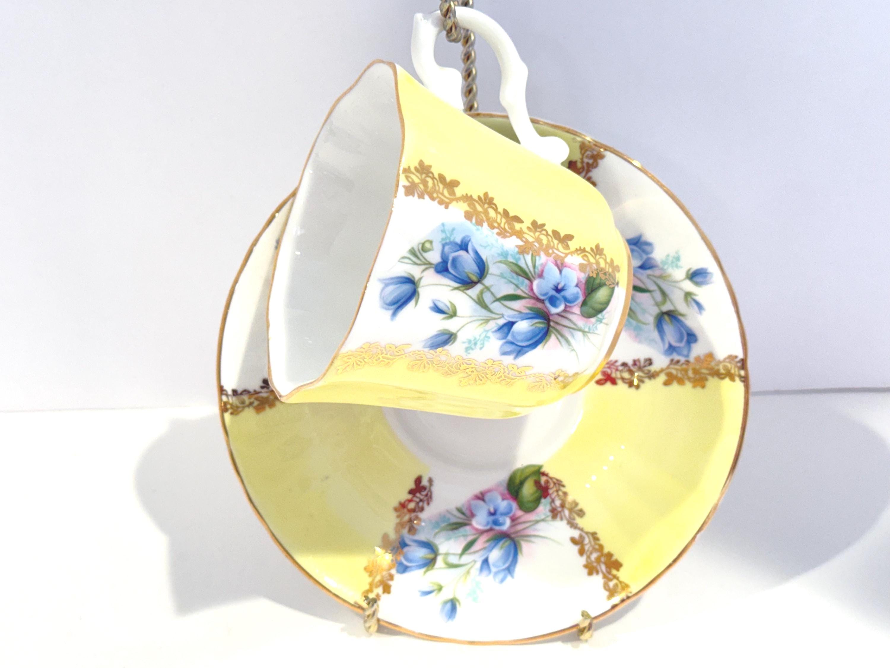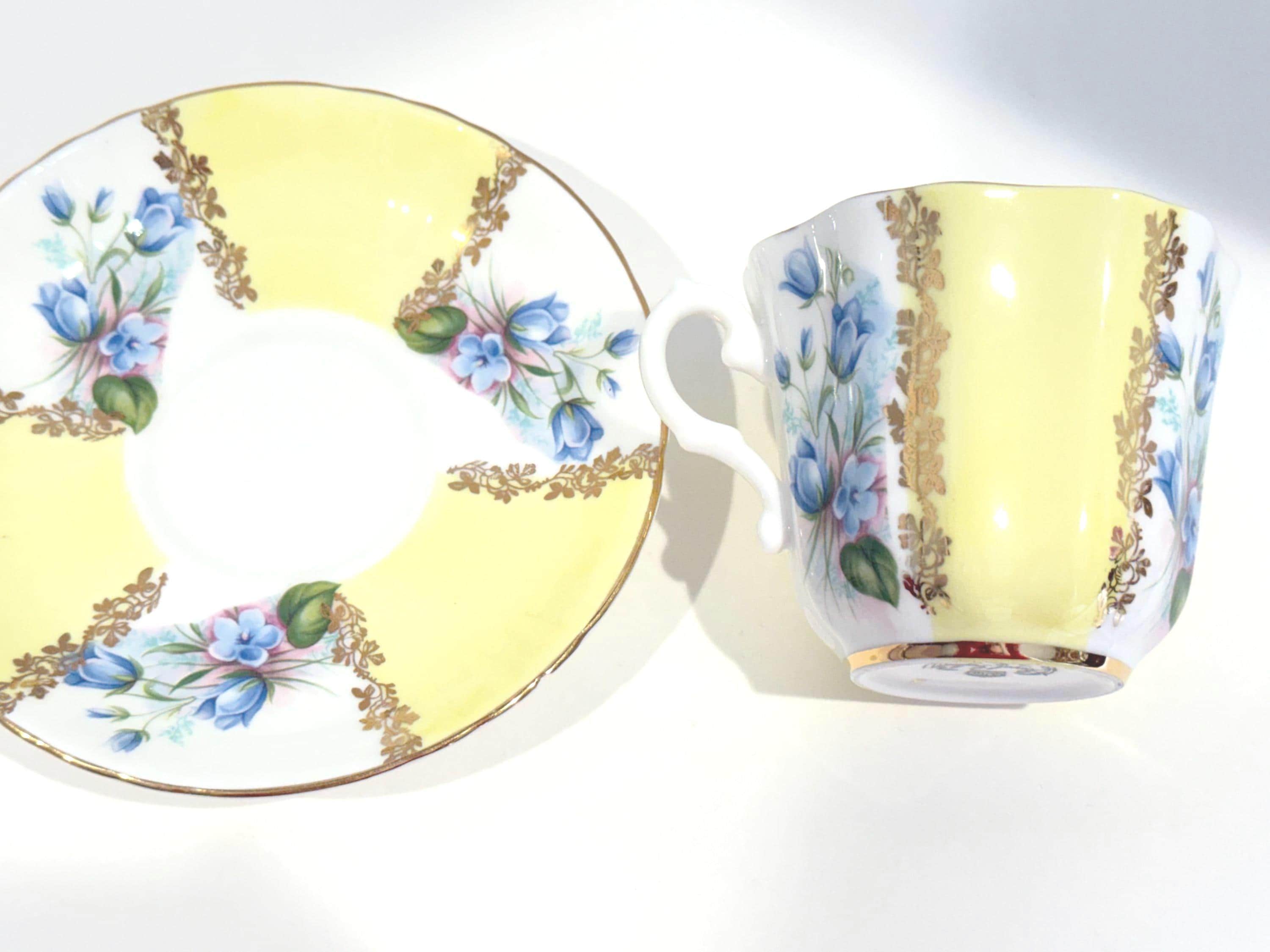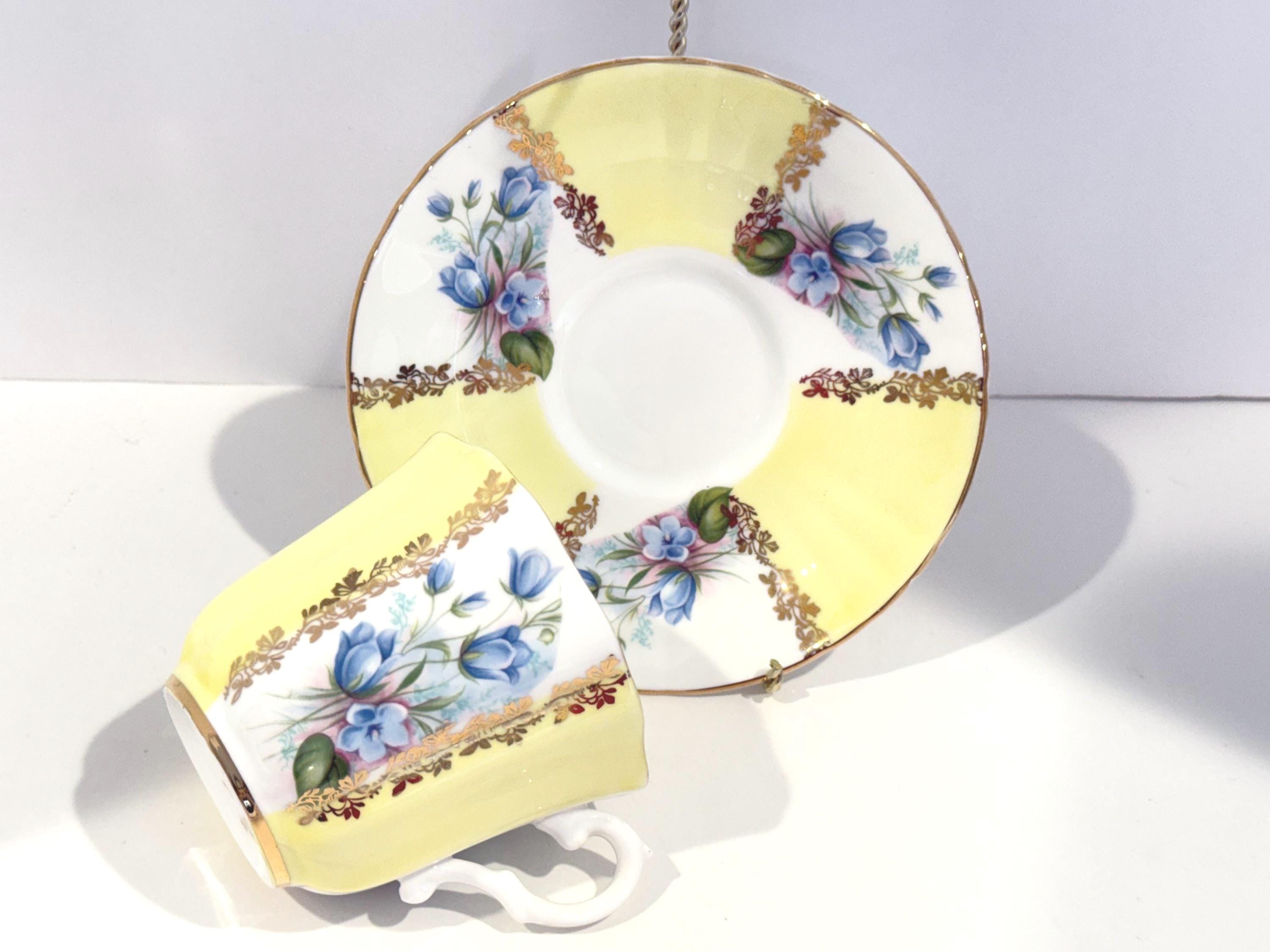 Enjoy afternoon tea in an antique Royal Grafton teacup and saucer from England. The yellow panels with lavish gold trim perfectly frame the hand-painted blue flowers, while the aristocratic handle and ruffled edges add to its charm. The backstamp, first issued in 1957, marks its heritage. Royal Grafton, owned by A. B. Jones, produced these fine wares in their Longton, England factory, earning a place among the renowned Staffordshire potteries.
