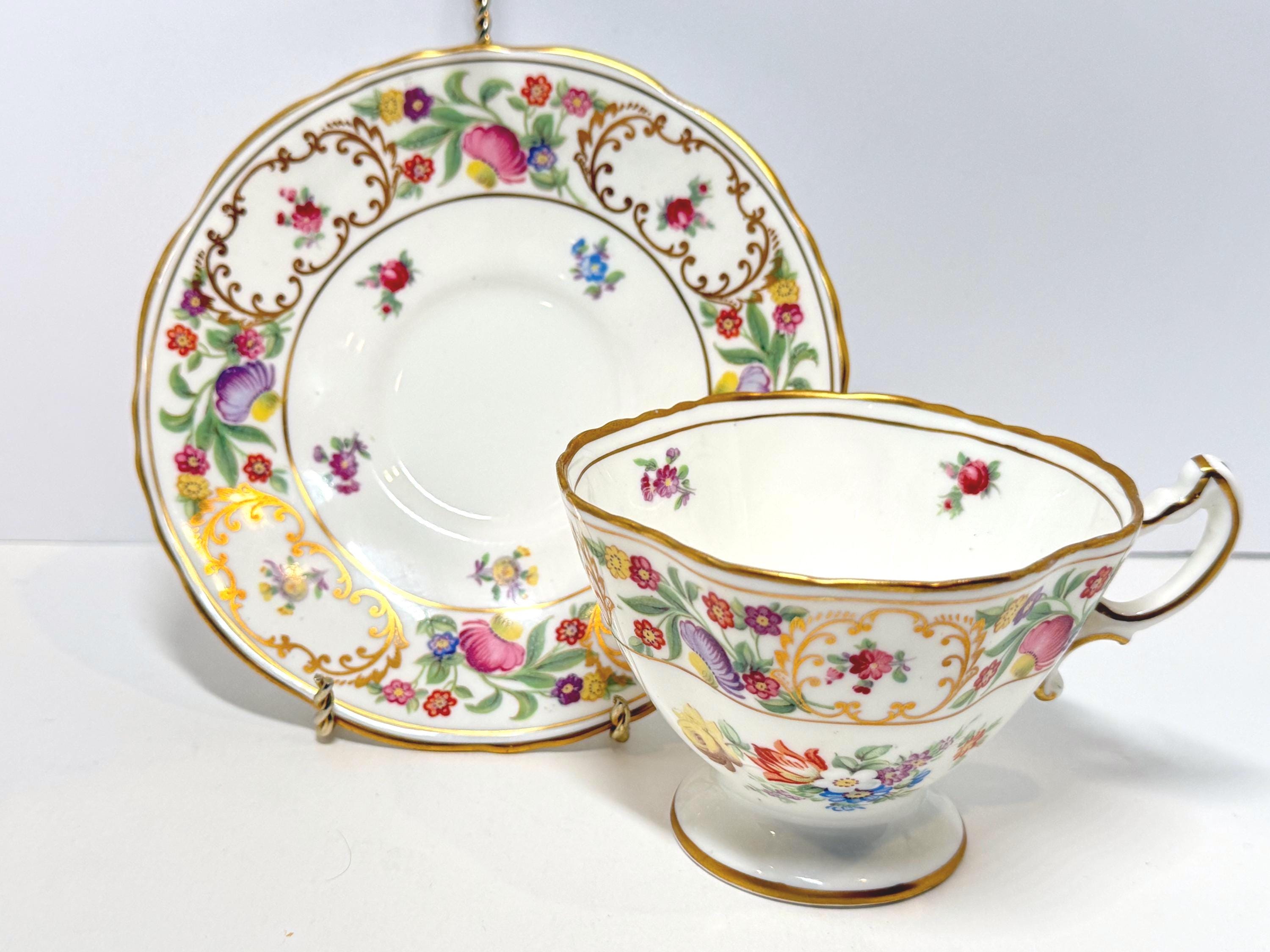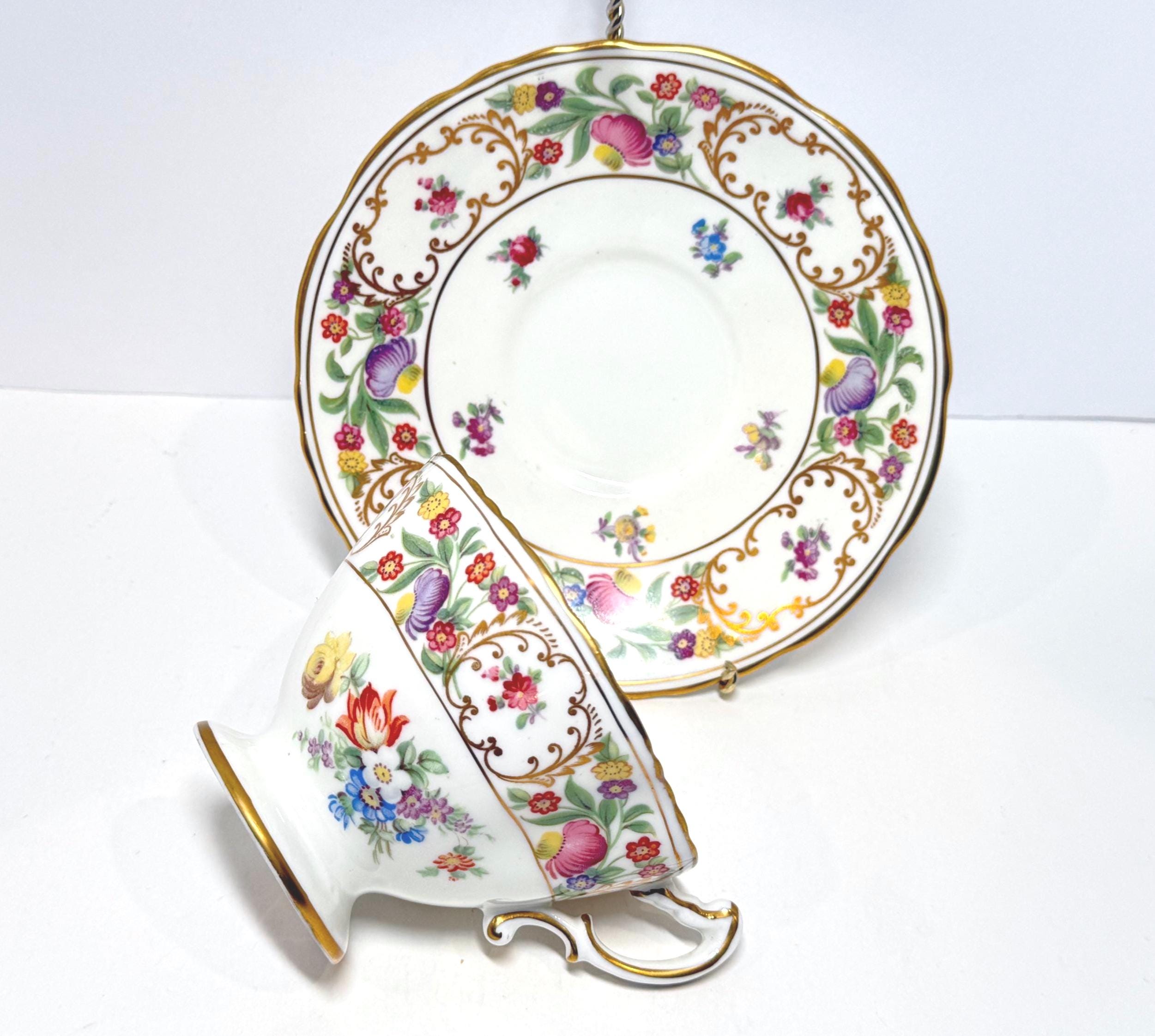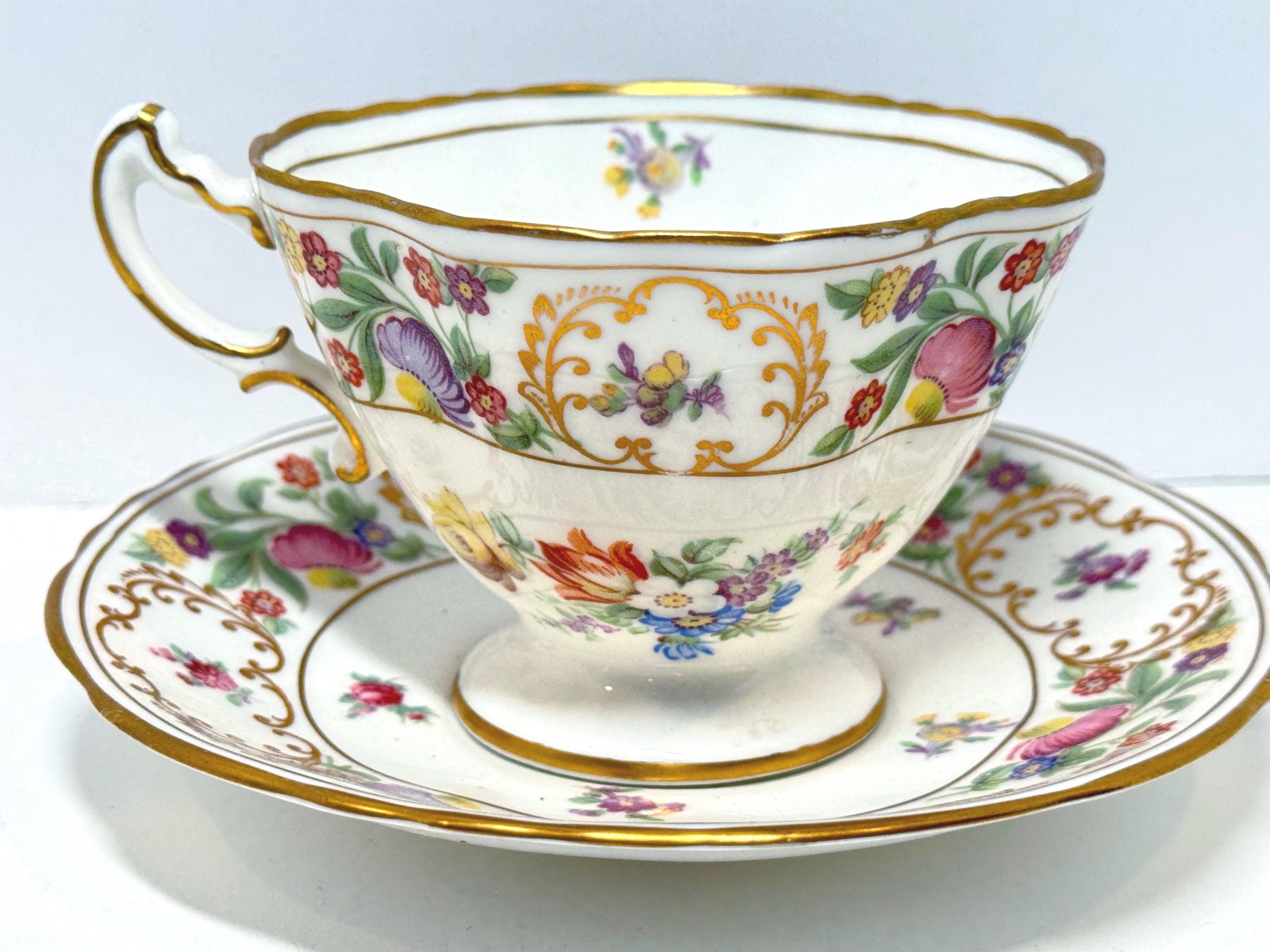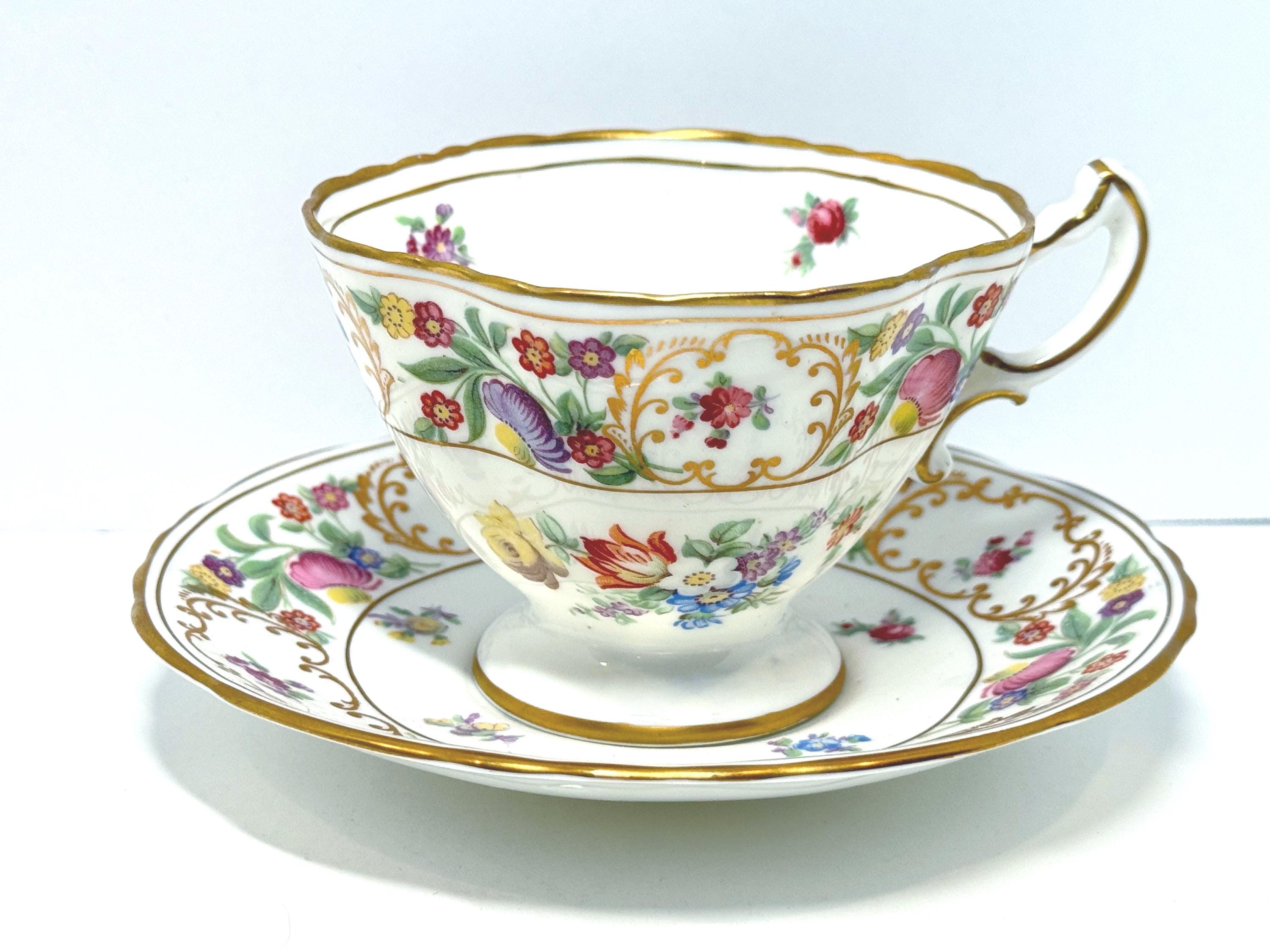 This charming Hammersley teacup and saucer evokes the feeling of a leisurely garden stroll. The pattern, called Dresden Sprays, is now discontinued. Hammersley was part of Hammersley and Asbury, from the Prince of Wales Pottery in Longton, England—one of the many distinguished factories that formed the Staffordshire potteries. The company was founded in 1872.