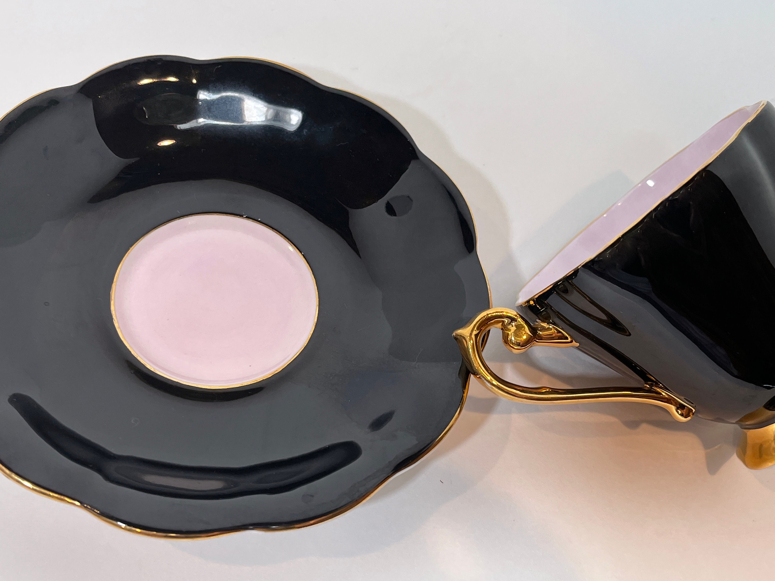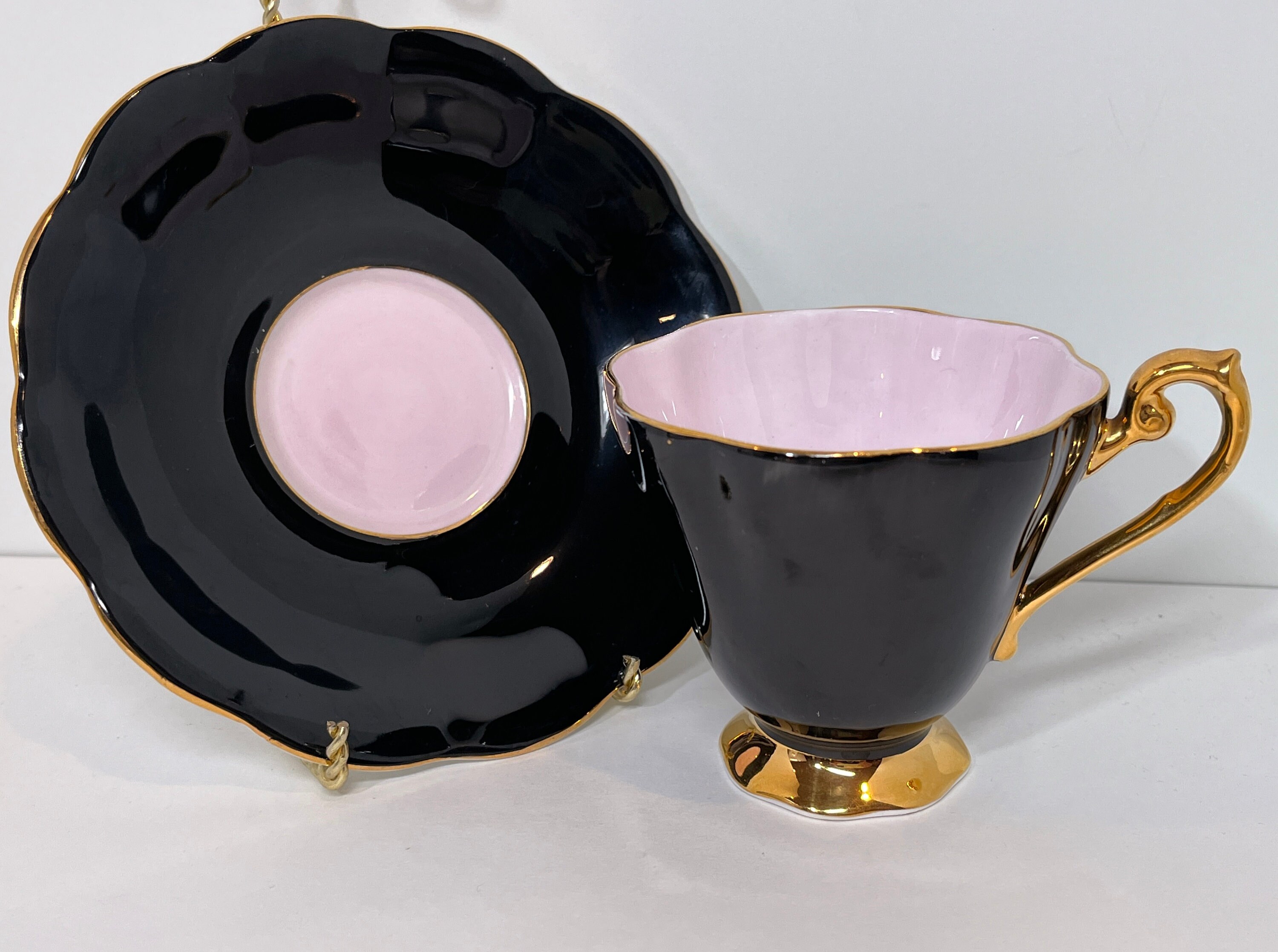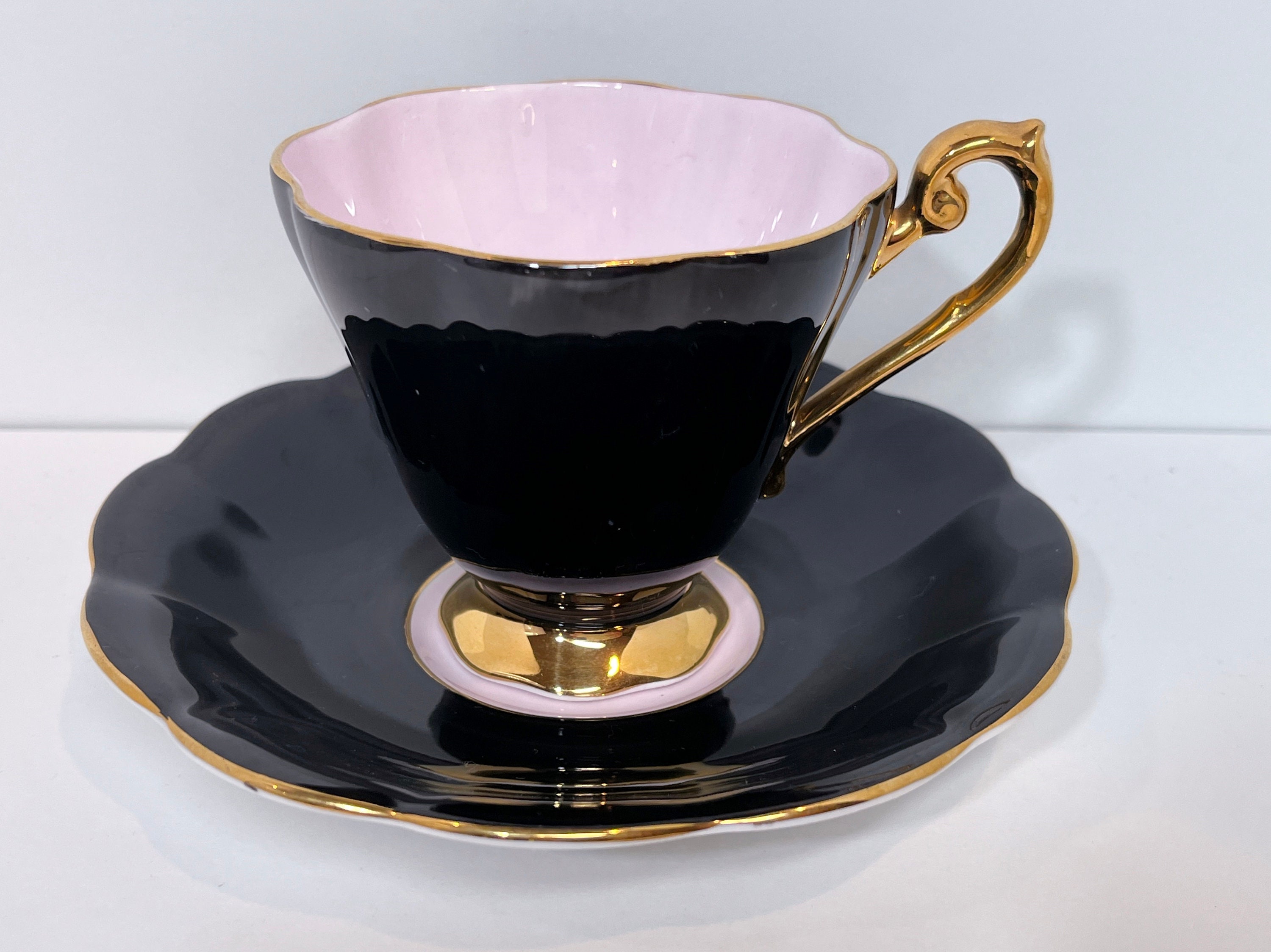This exquisite bone china teacup has everything we adore. It is black which makes it stunning. It is filled with a soft pink which creates drama along with hand applied gold gilt trim on the scalloped saucer and pedestal cup.