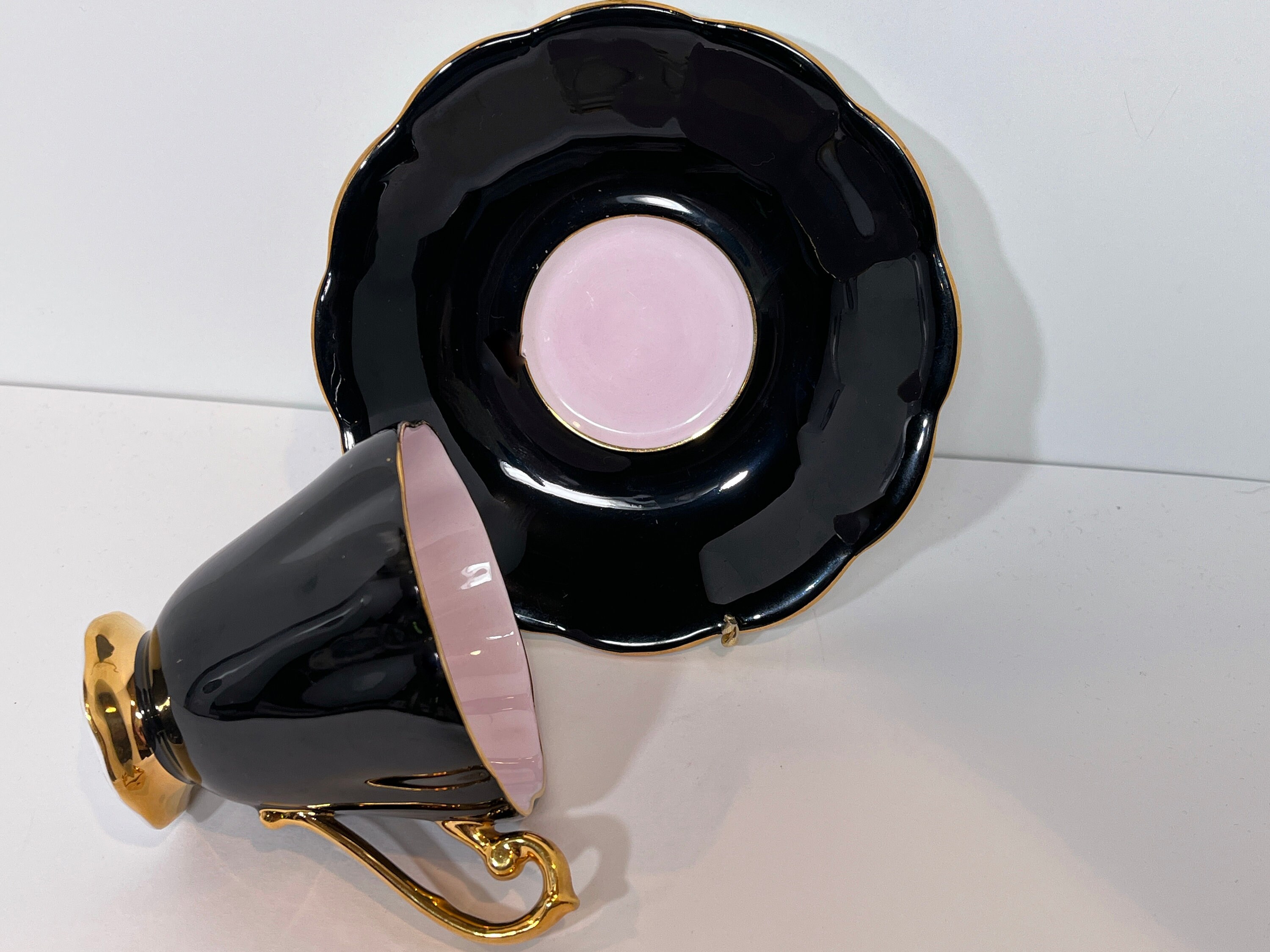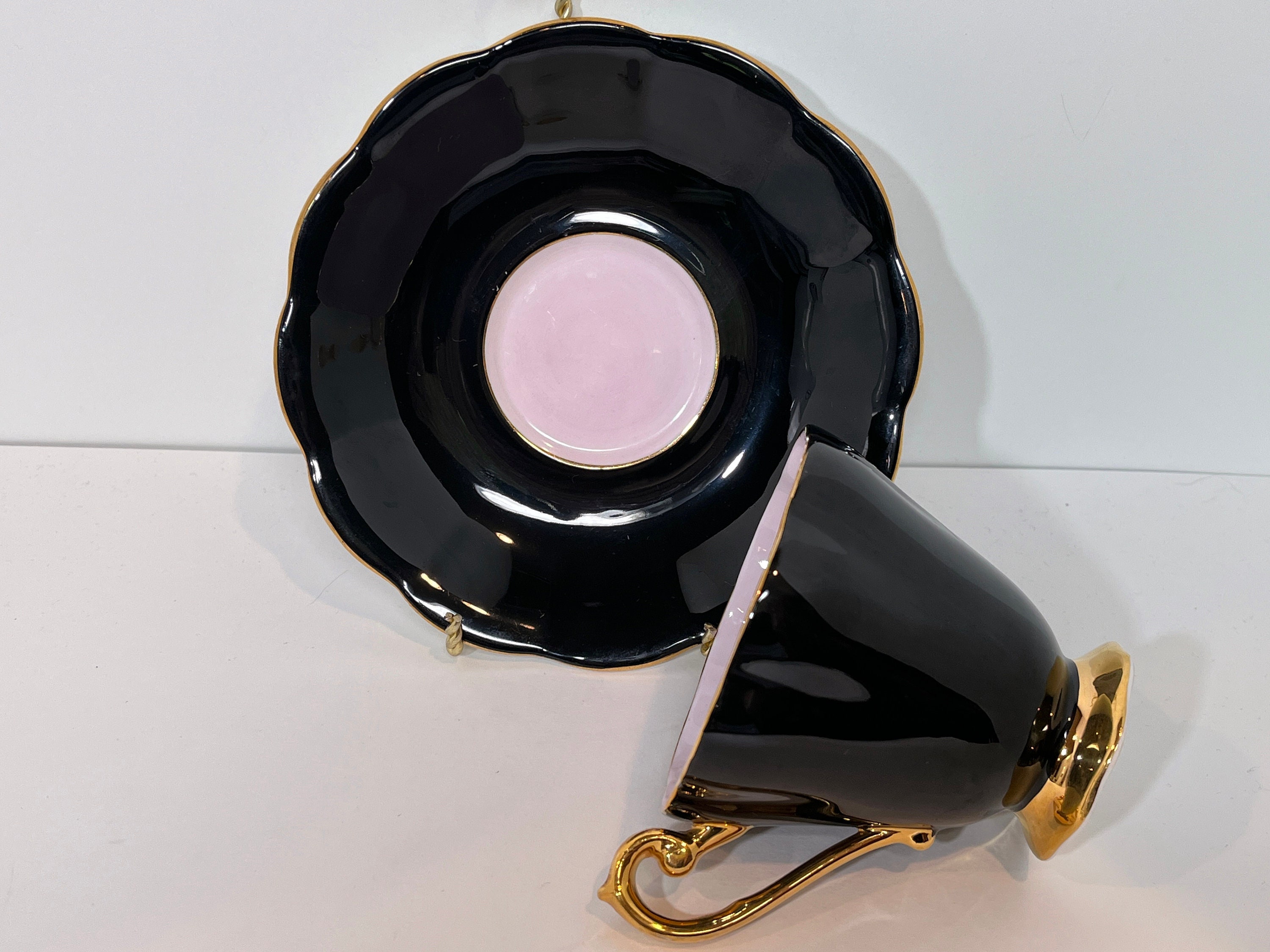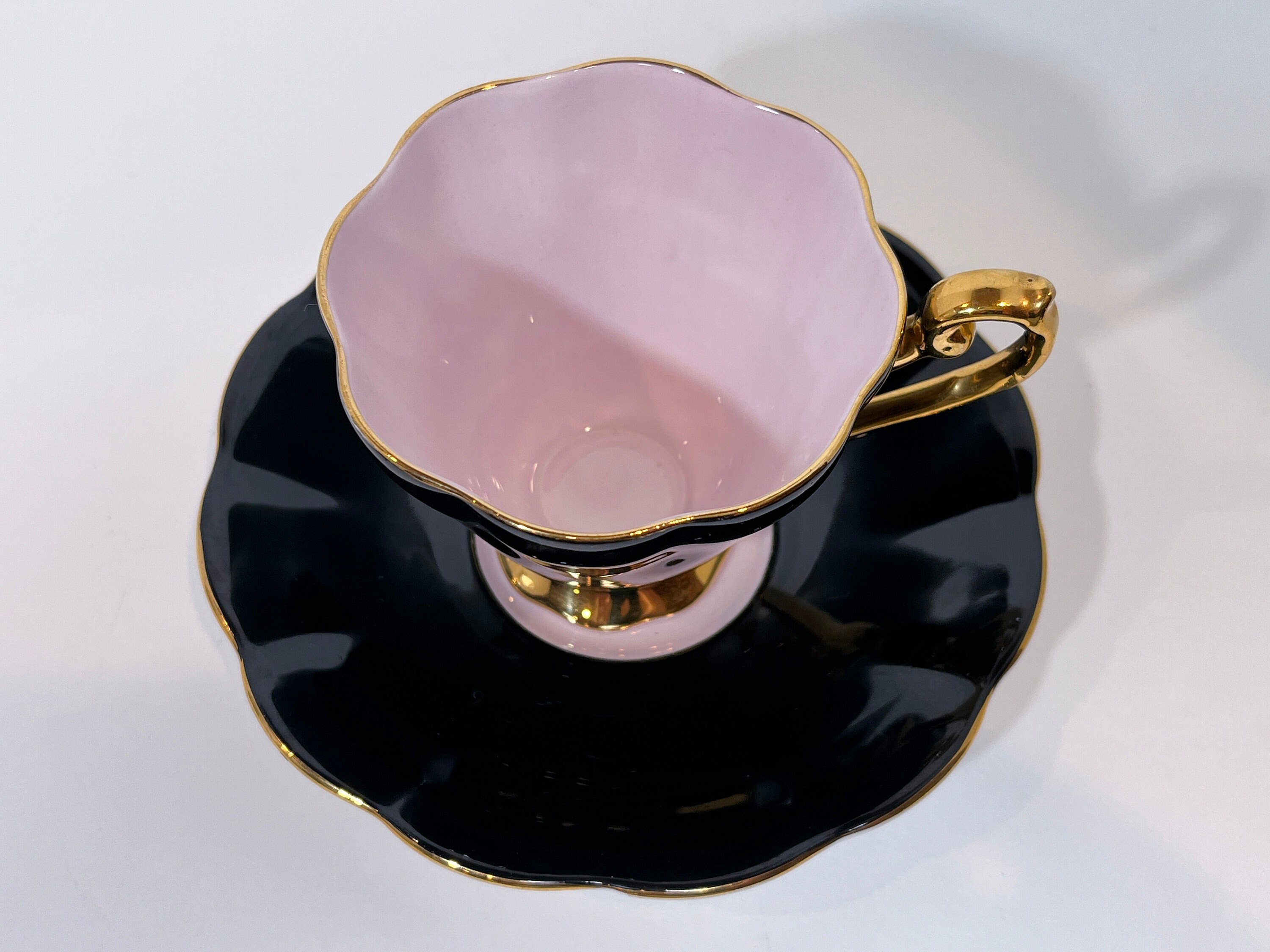 This exquisite bone china teacup has everything we adore. It is black which makes it stunning. It is filled with a soft pink which creates drama along with hand applied gold gilt trim on the scalloped saucer and pedestal cup.
