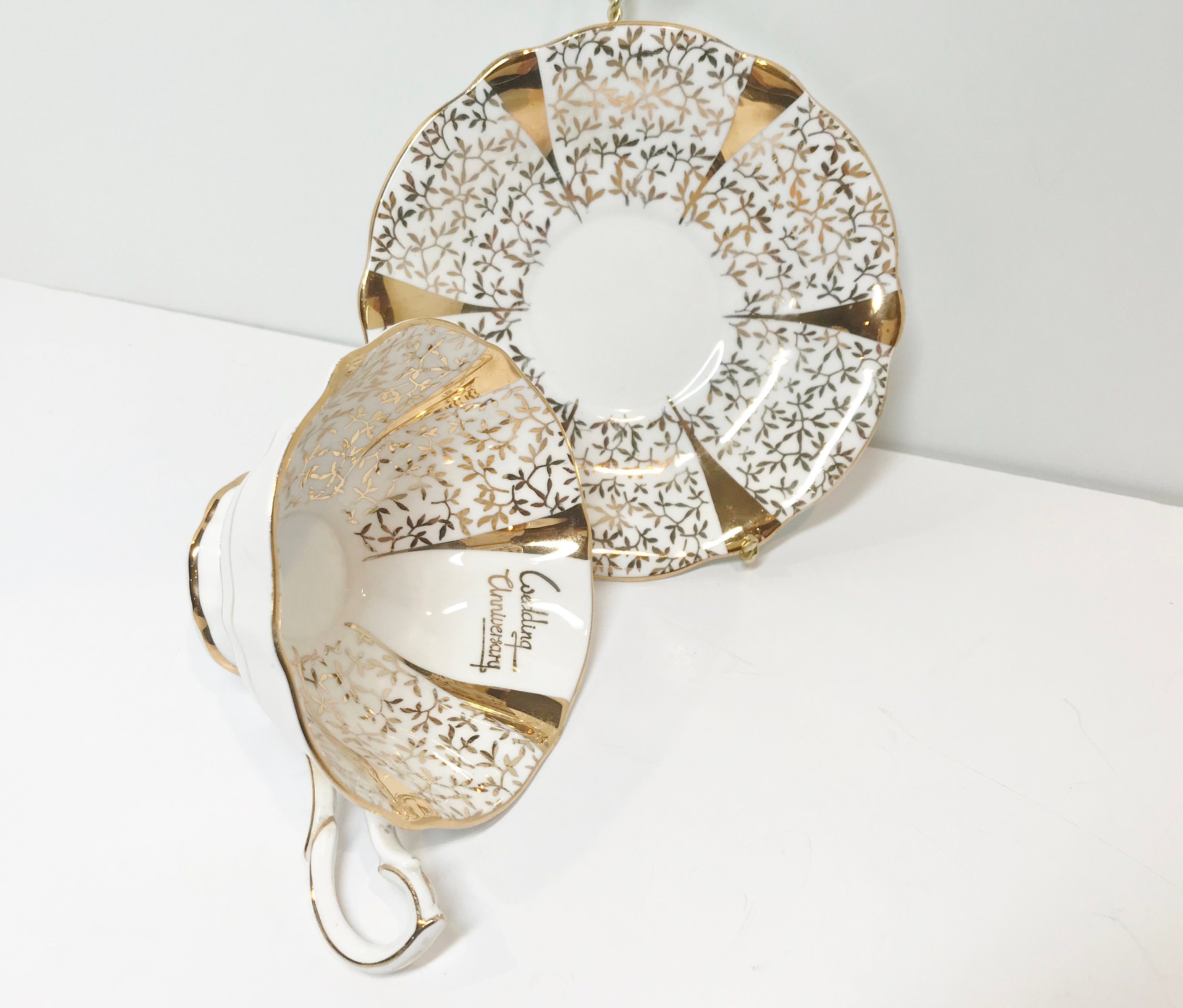 The gold glistens on the cloud of white bone china with the words, "Happy Anniversary."