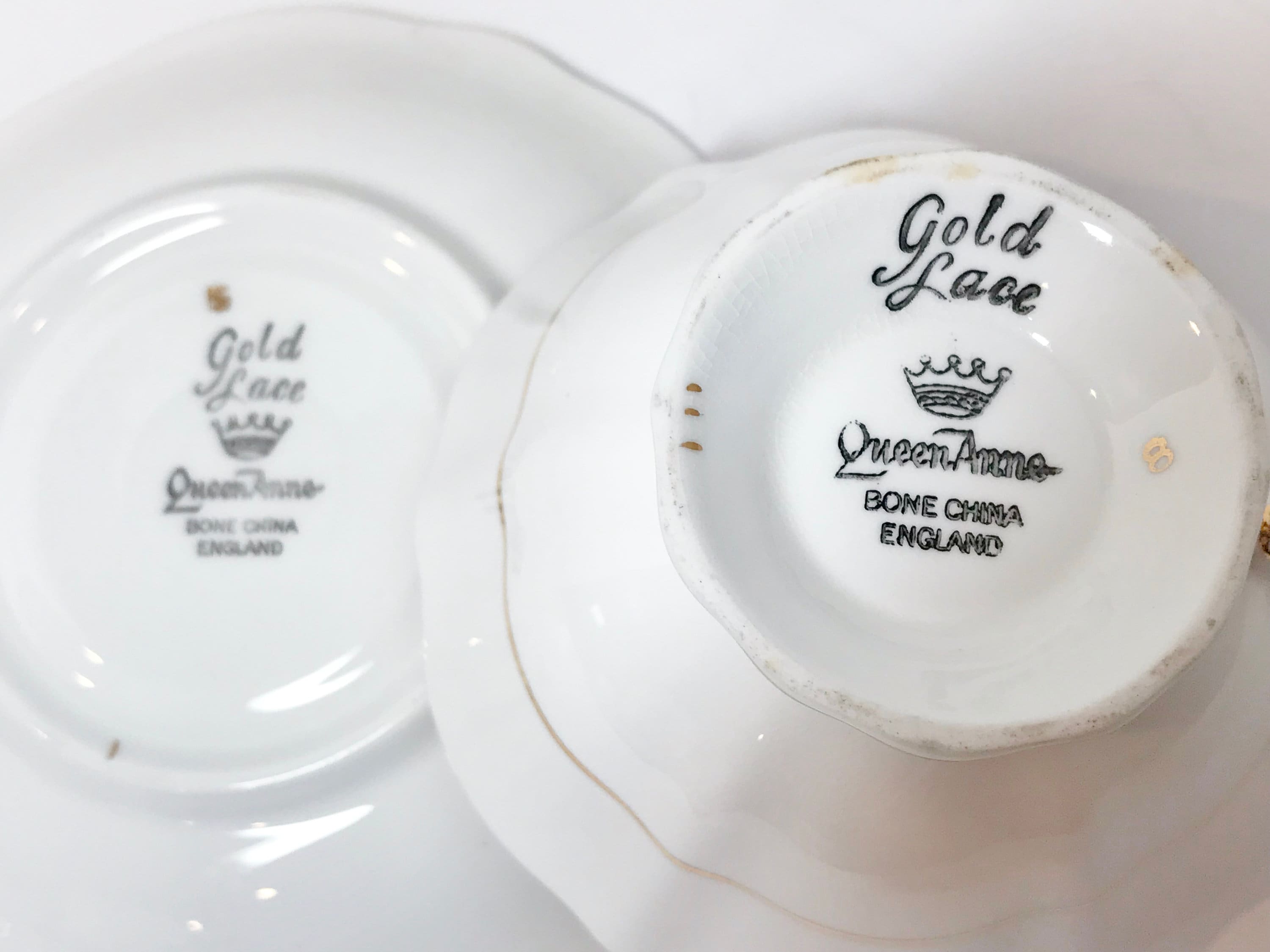 Queen Anne Bone China of England crafted this majestic, charming tea cup and saucer. Queen Anne teacups are noted for their taller, paneled design. They were produced by the Shore and Coggins company on High Street and Edensor Works in Longton, England. They are another Staffordshire Pottery, founded in 1911.