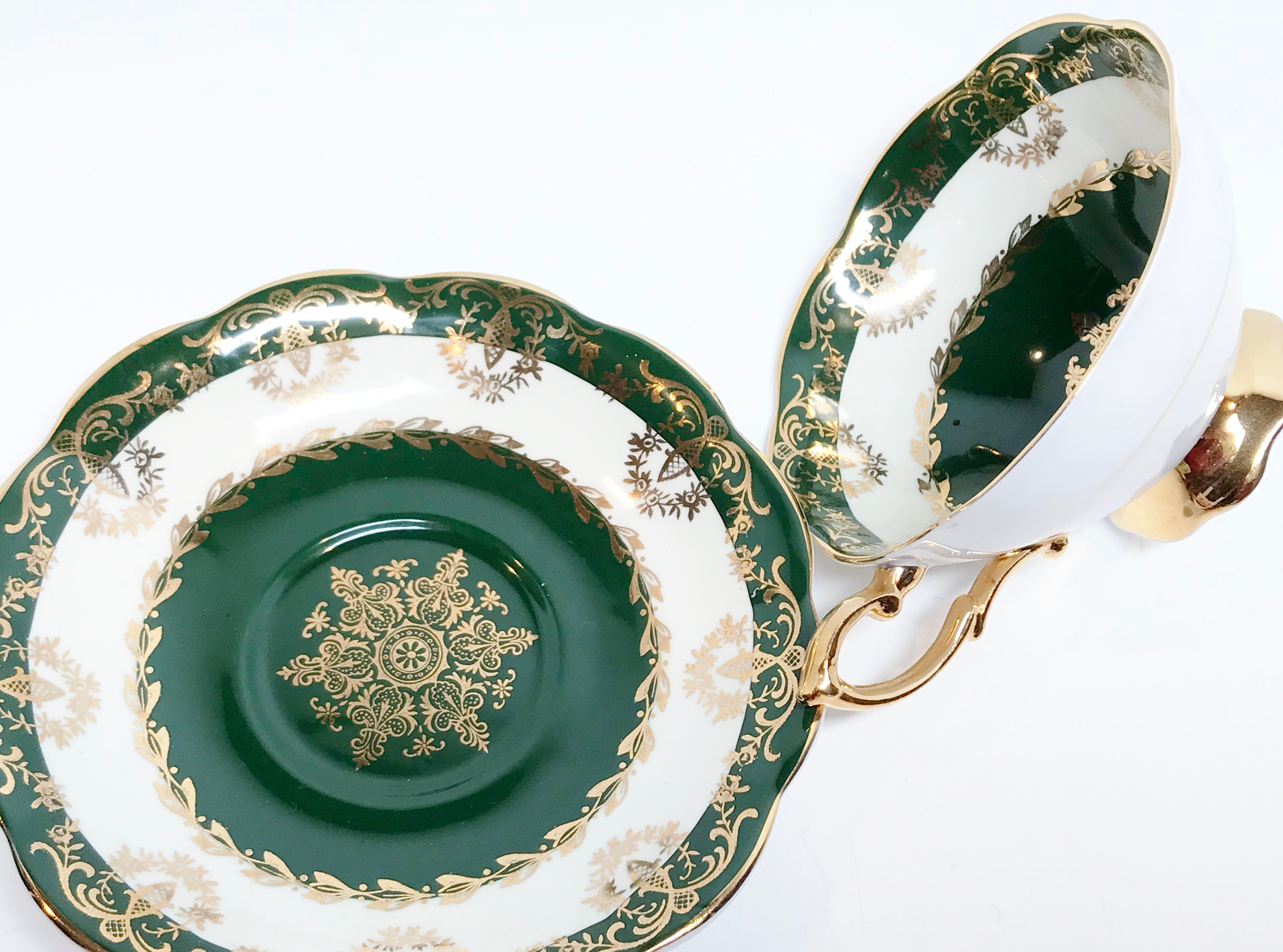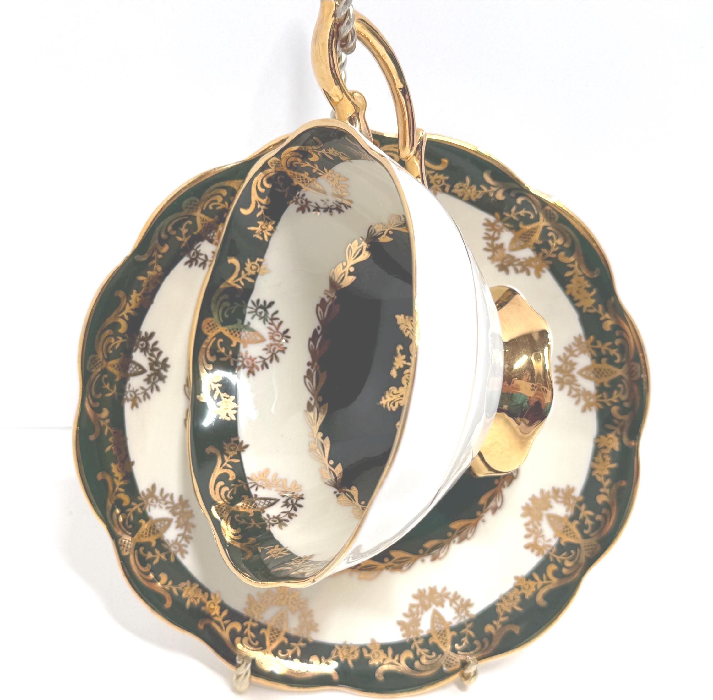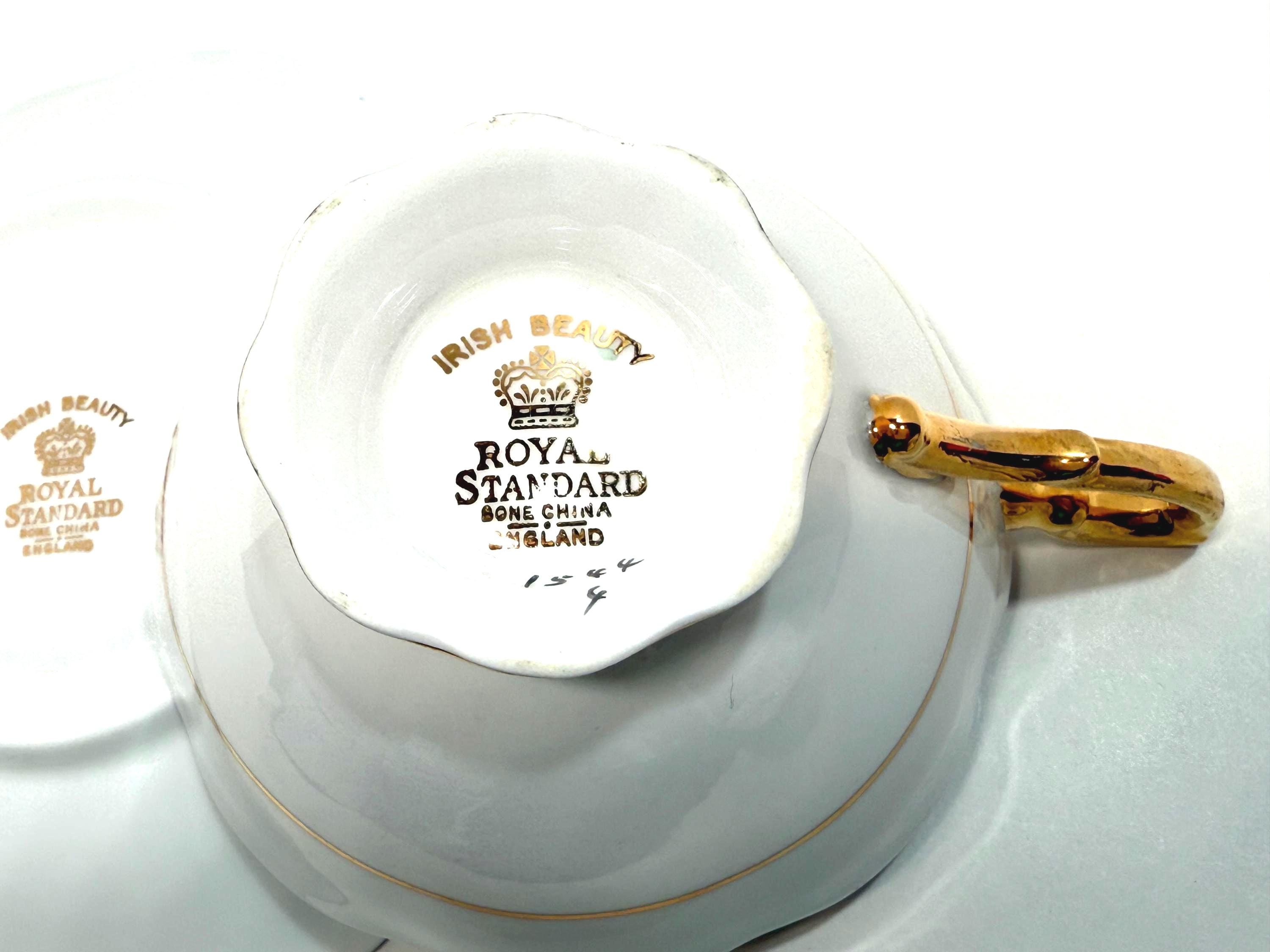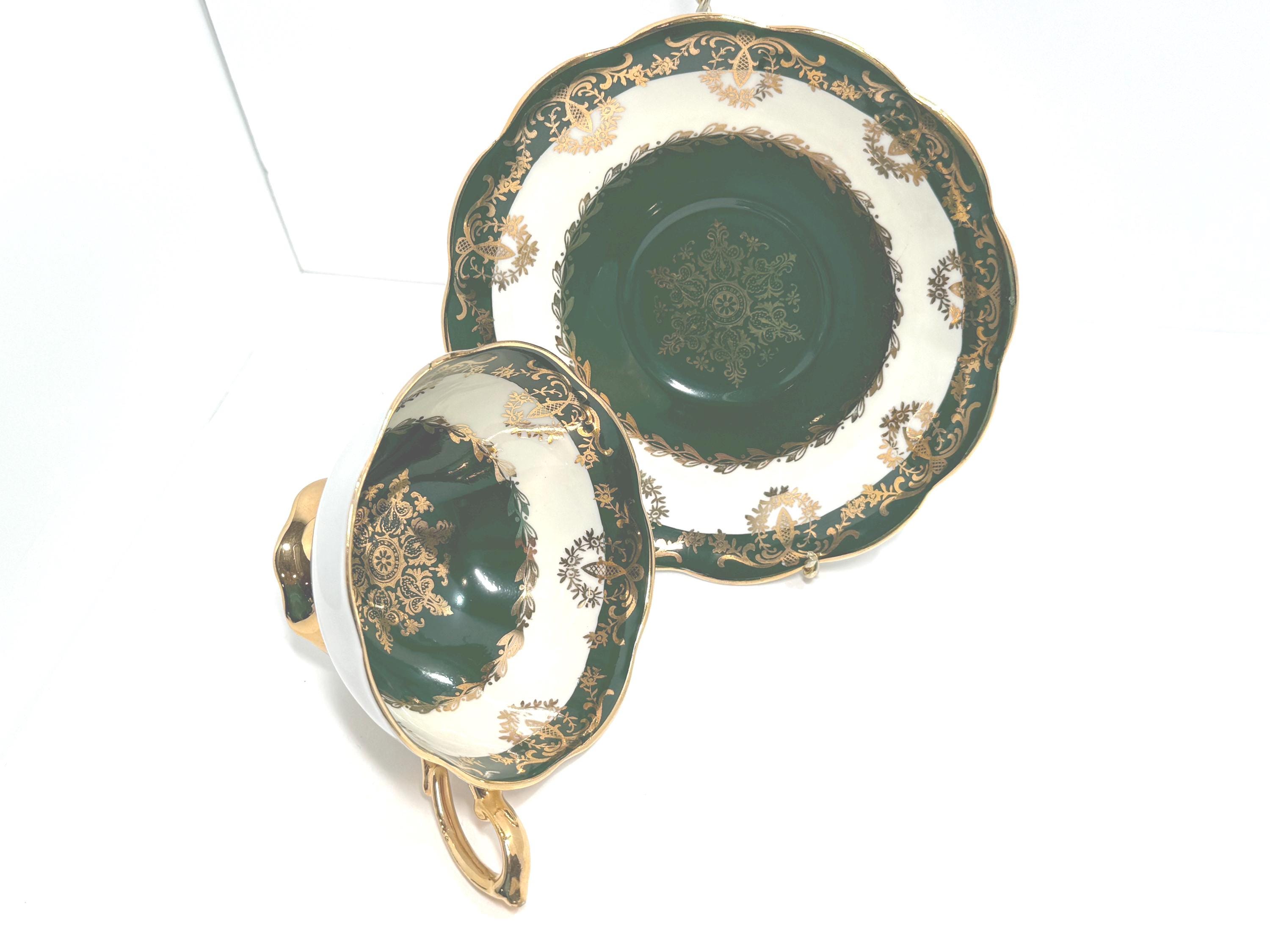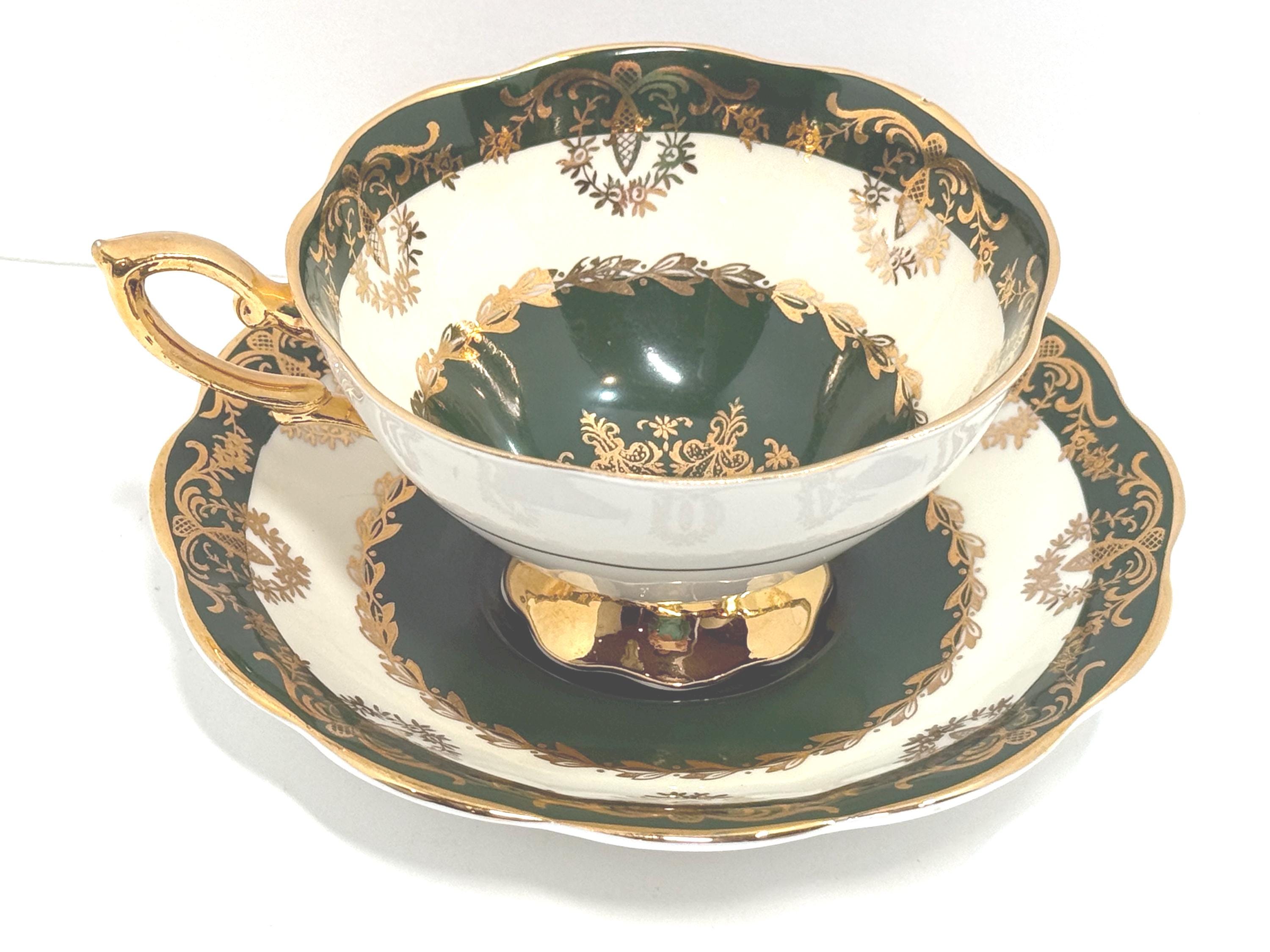 This elegant tea cup and saucer, crafted by Royal Standard Fine Bone China of England, is a true delight. With shimmering gold framing a rich green, it’s aptly named Irish Beauty. Whether you’re evoking the charm of the Irish countryside or simply savoring a warm drink at day’s end, this English tea cup and saucer is a perfect choice.