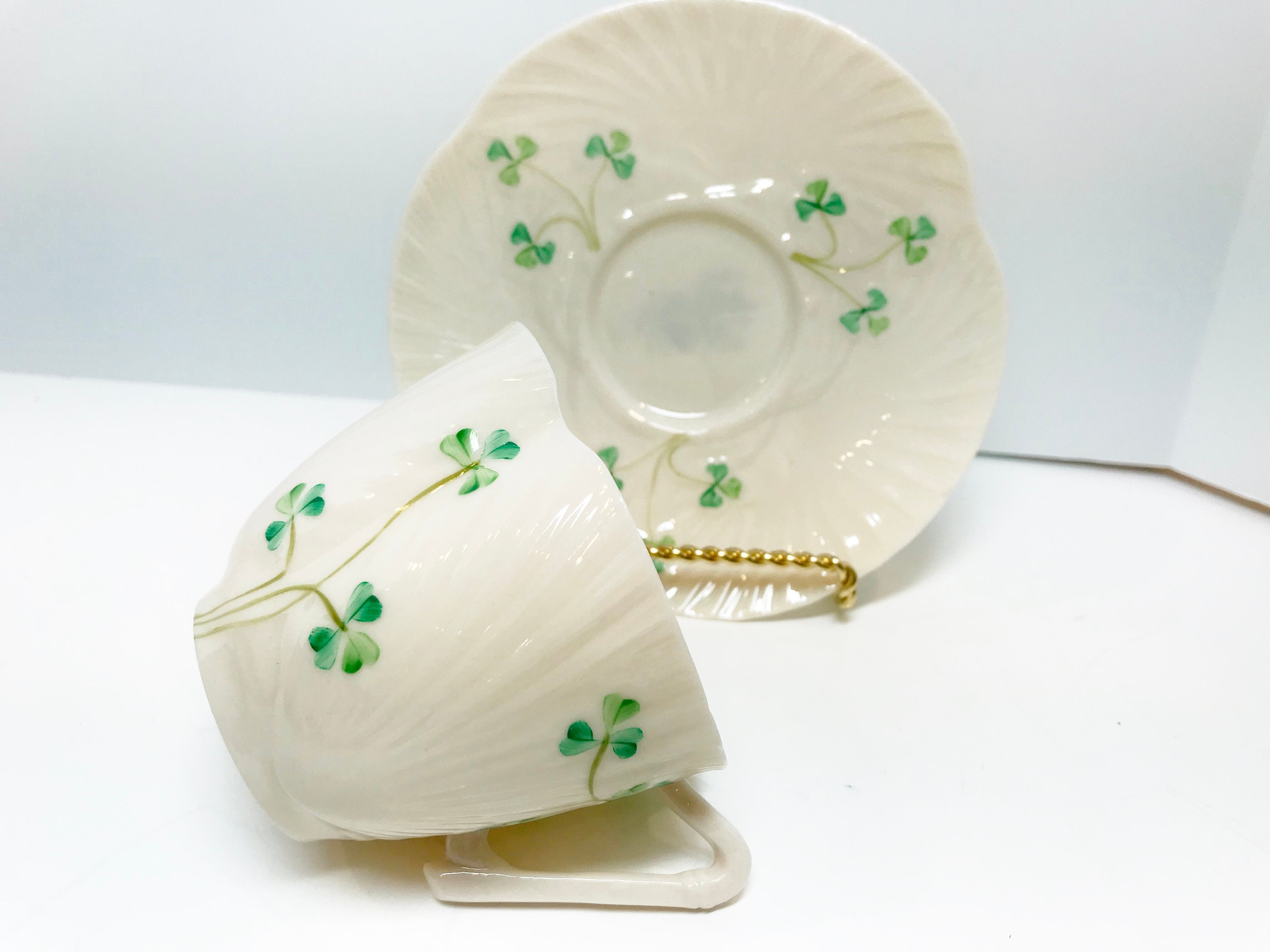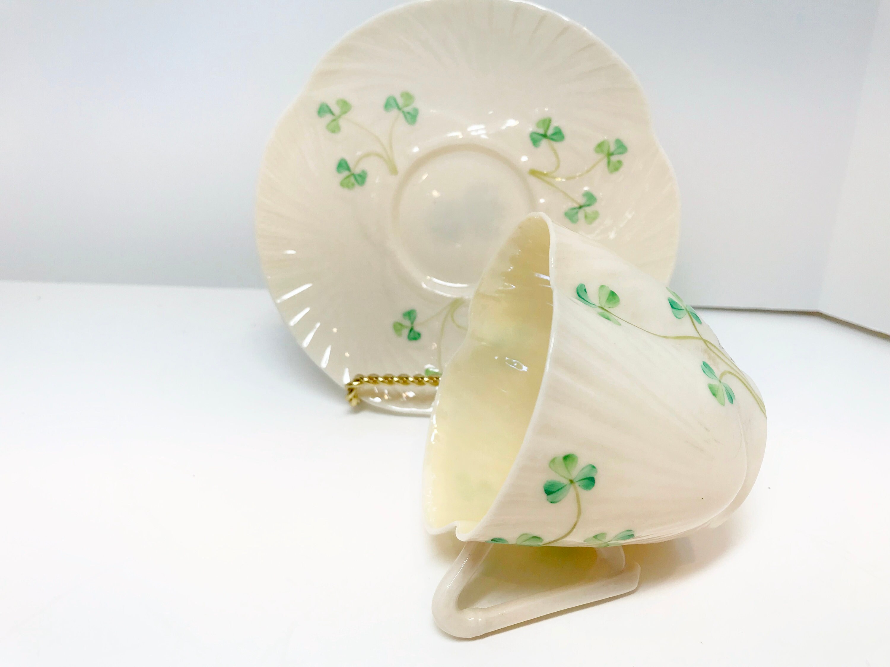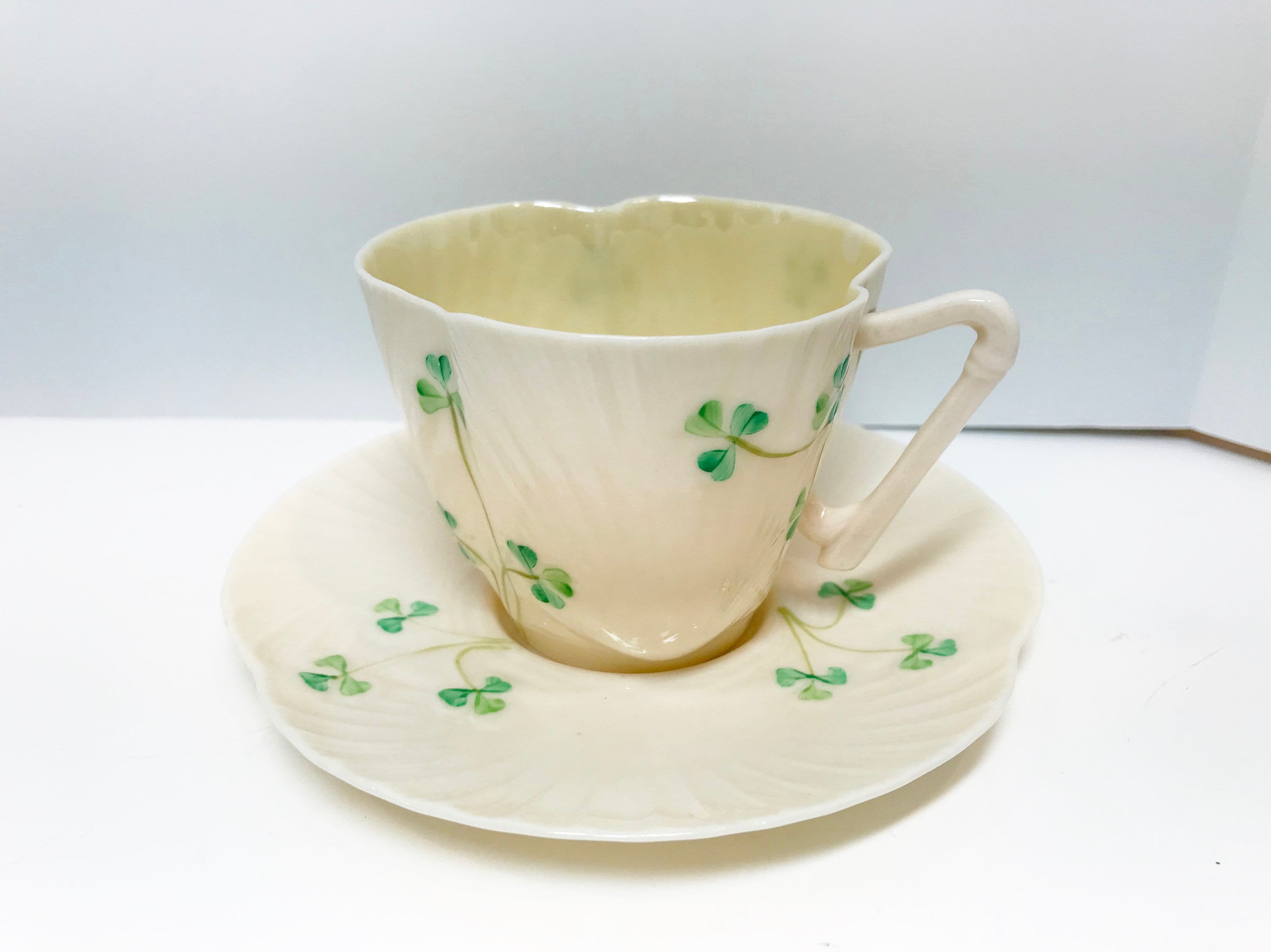 Irish shamrocks swirl beautifully across the shapely Belleek tea cup and saucer. Notice the handle is a harp shape. No wonder this is called Harp Shamrock Ware.