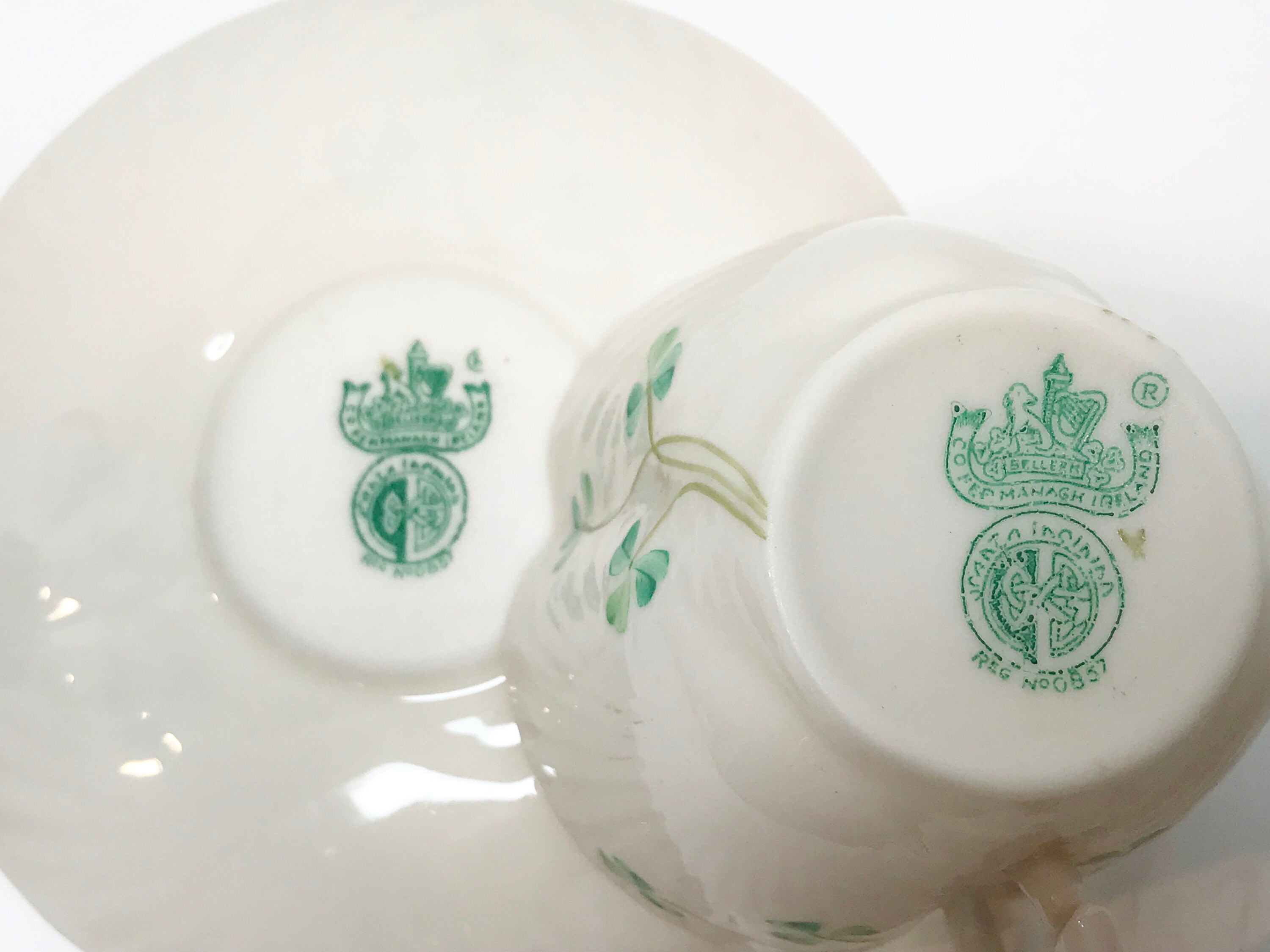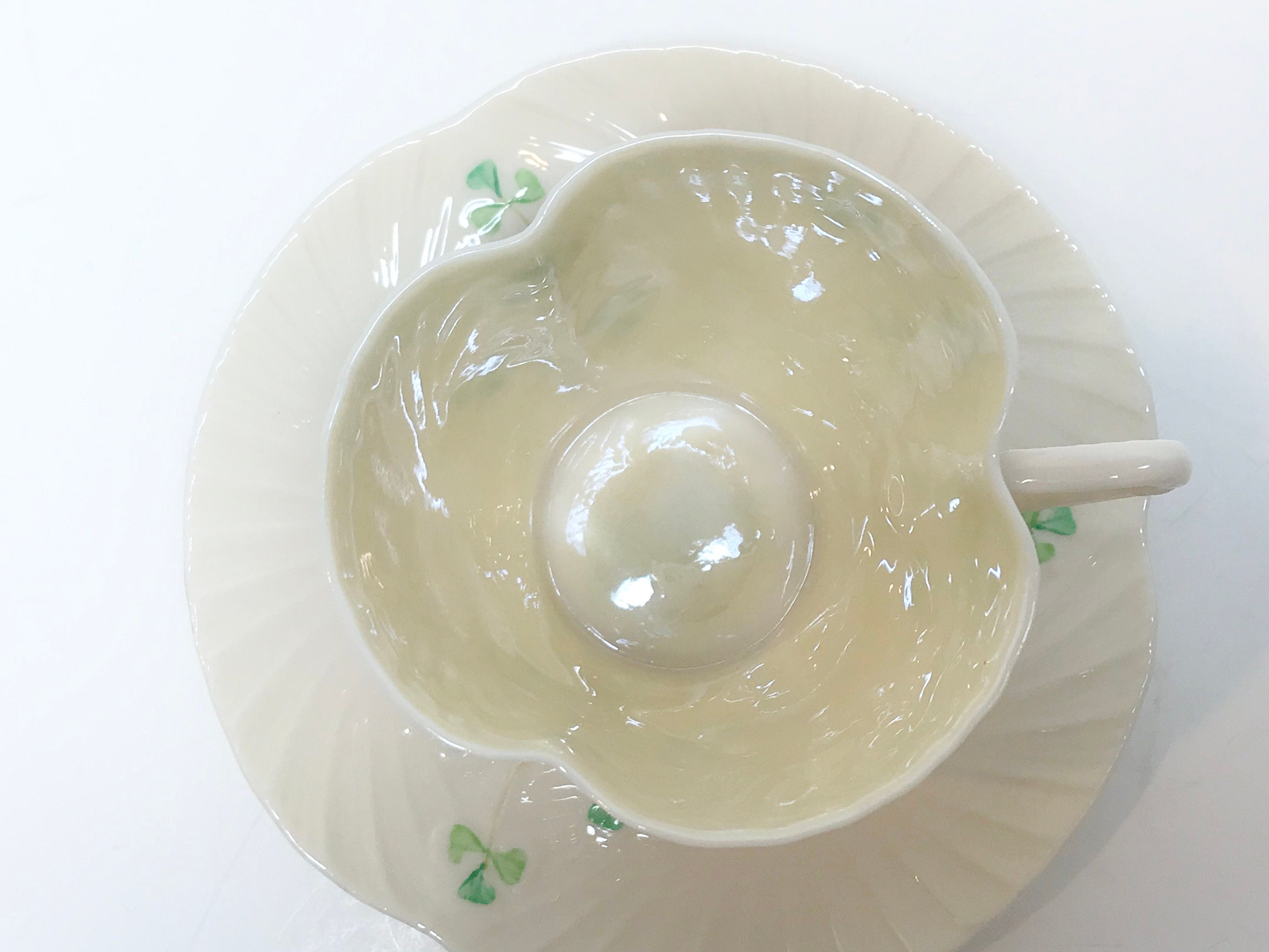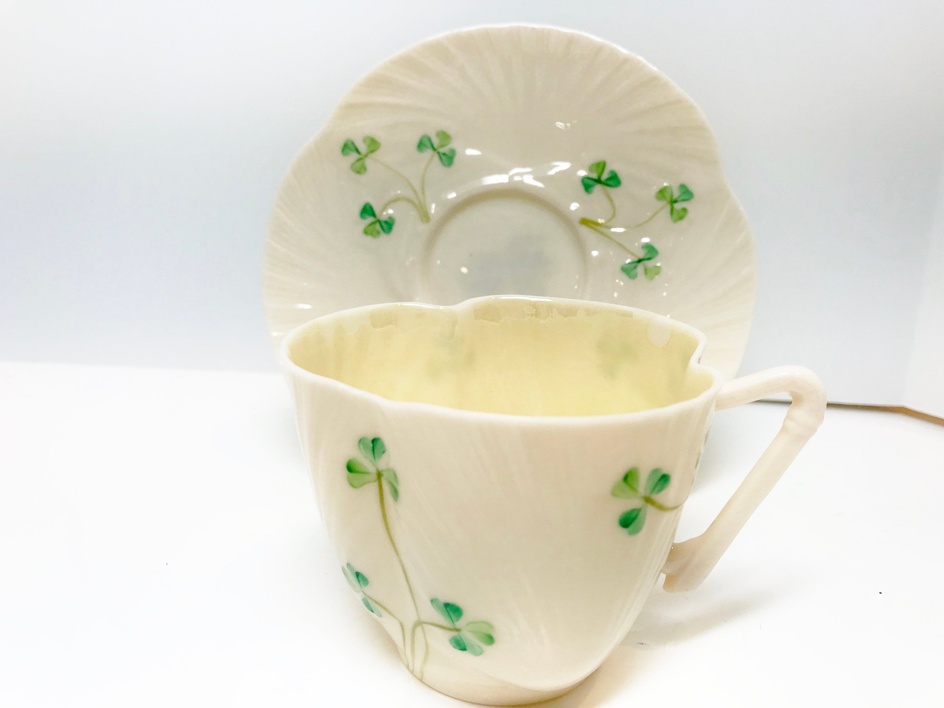 Irish shamrocks swirl beautifully across the shapely Belleek tea cup and saucer. Notice the handle is a harp shape. No wonder this is called Harp Shamrock Ware.